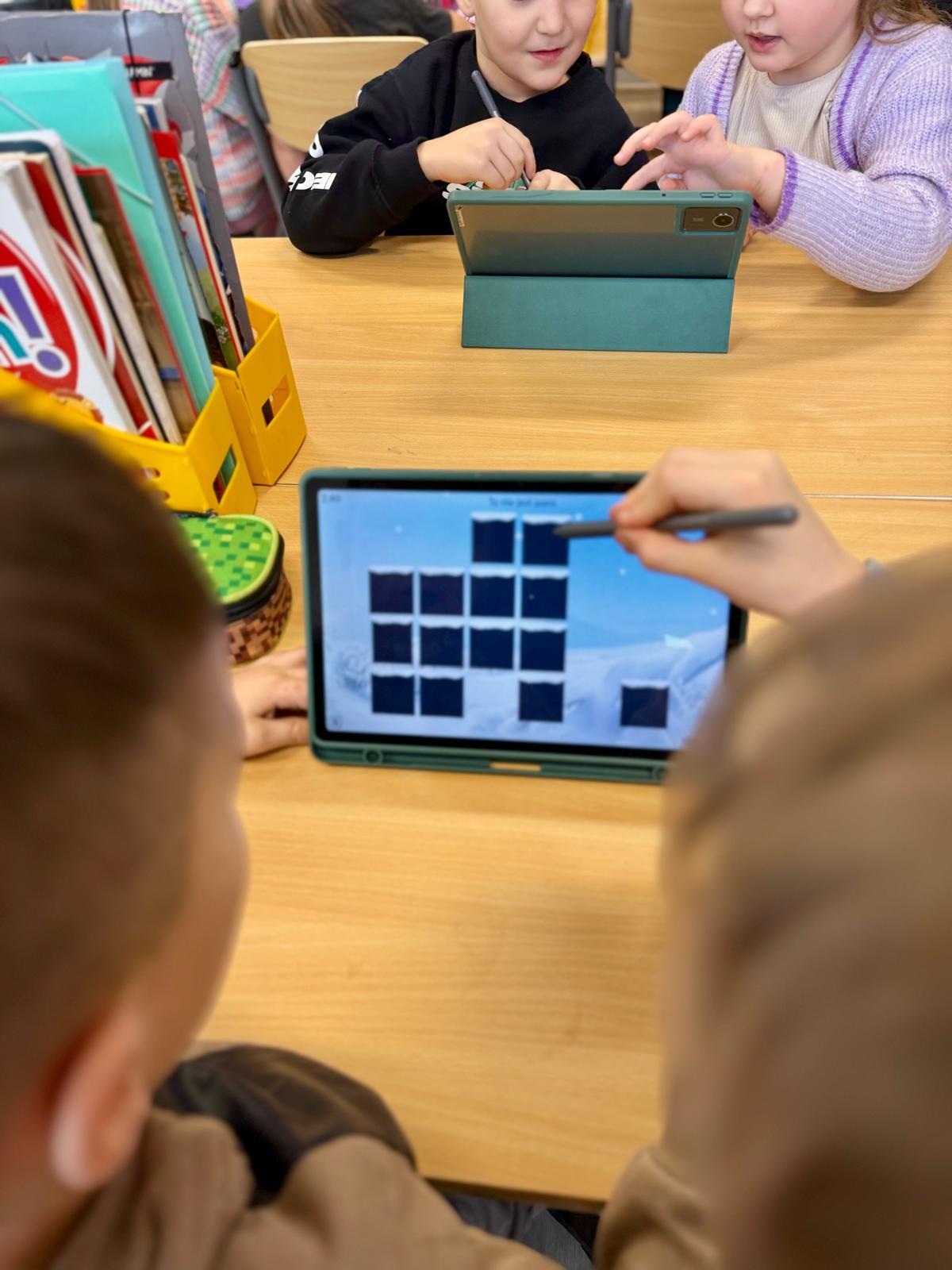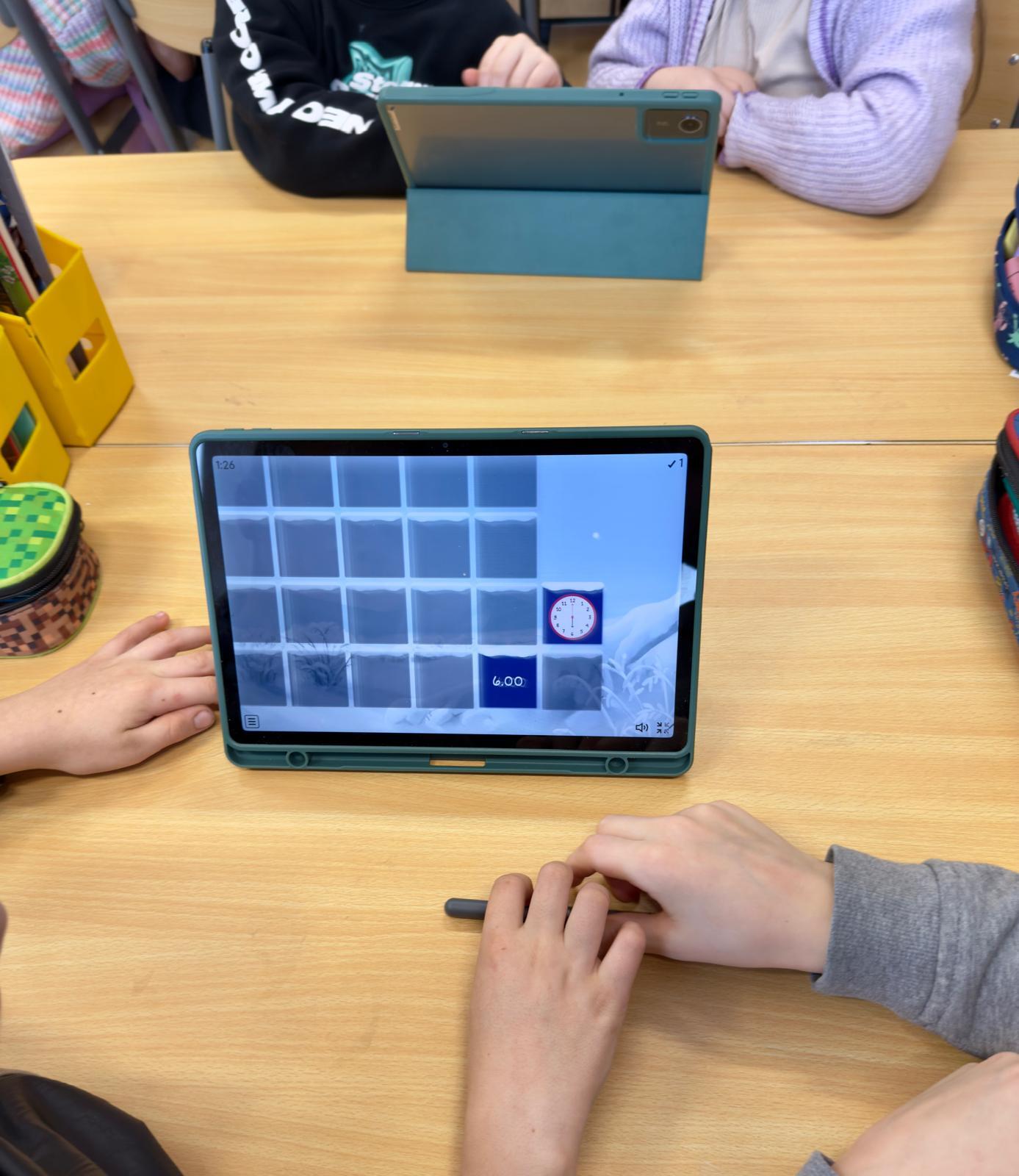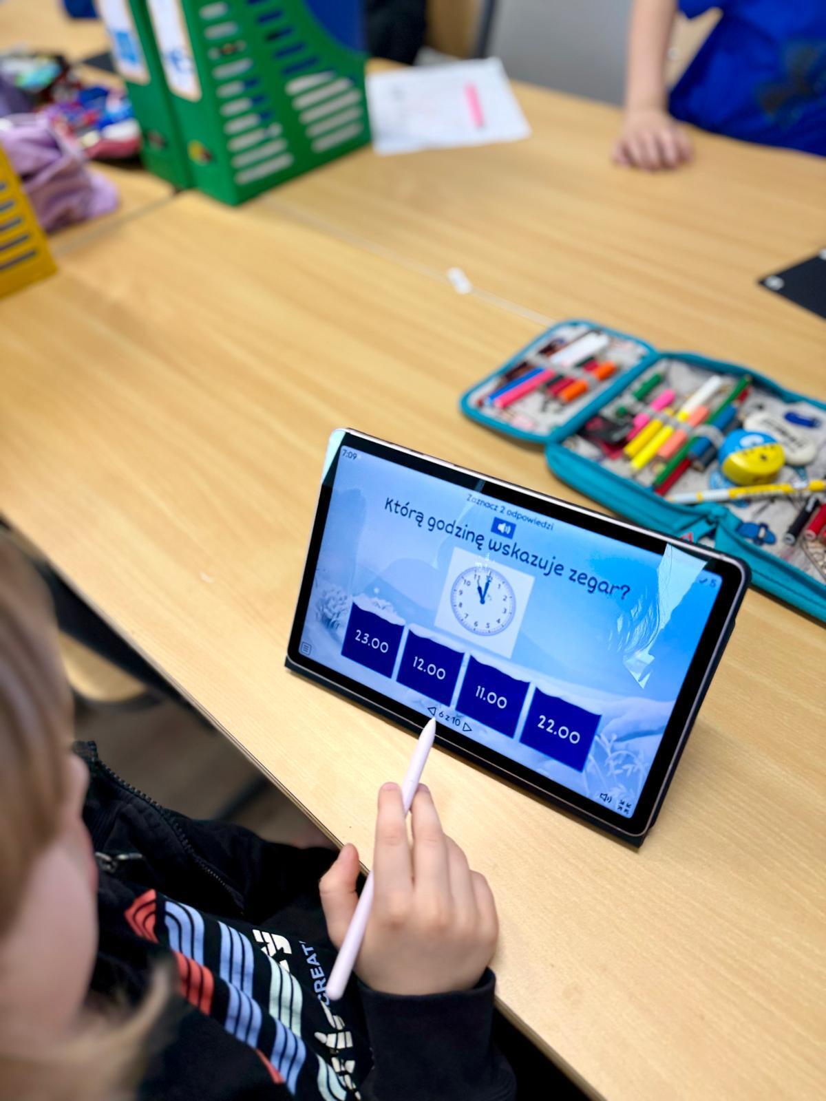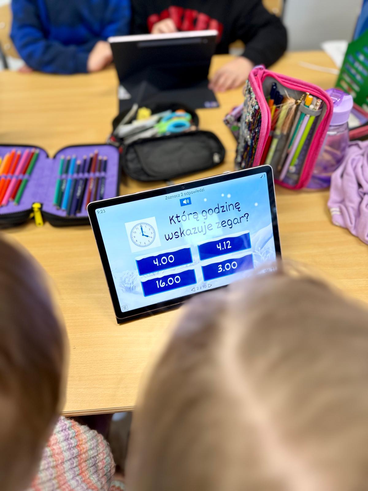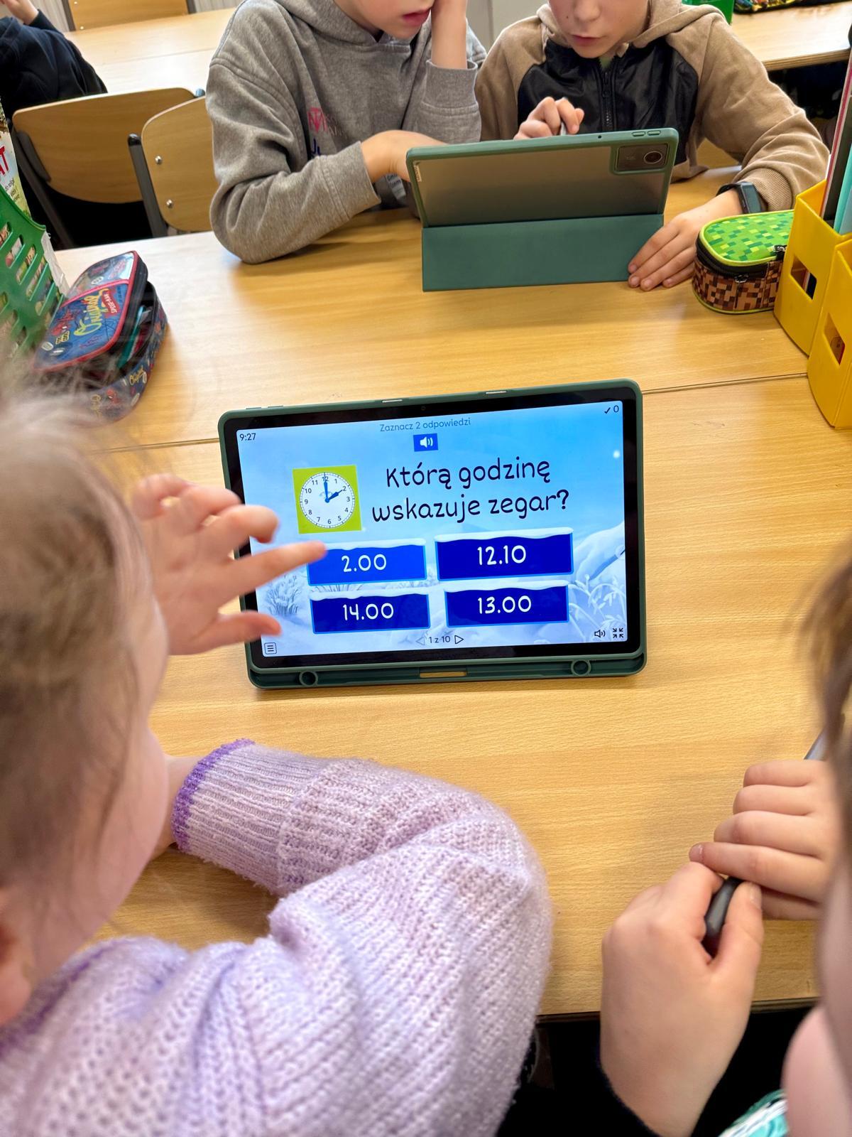 Podczas ostatnich zajęć dzieci pracowały na tabletach, wykonując interaktywne ćwiczenia na Wordwall. Była gra memory, zaznaczanie odpowiedniej godziny na zegarze oraz utrwalanie znaków rzymskich. Każde zadanie miało swój cel i było częścią większej całości.