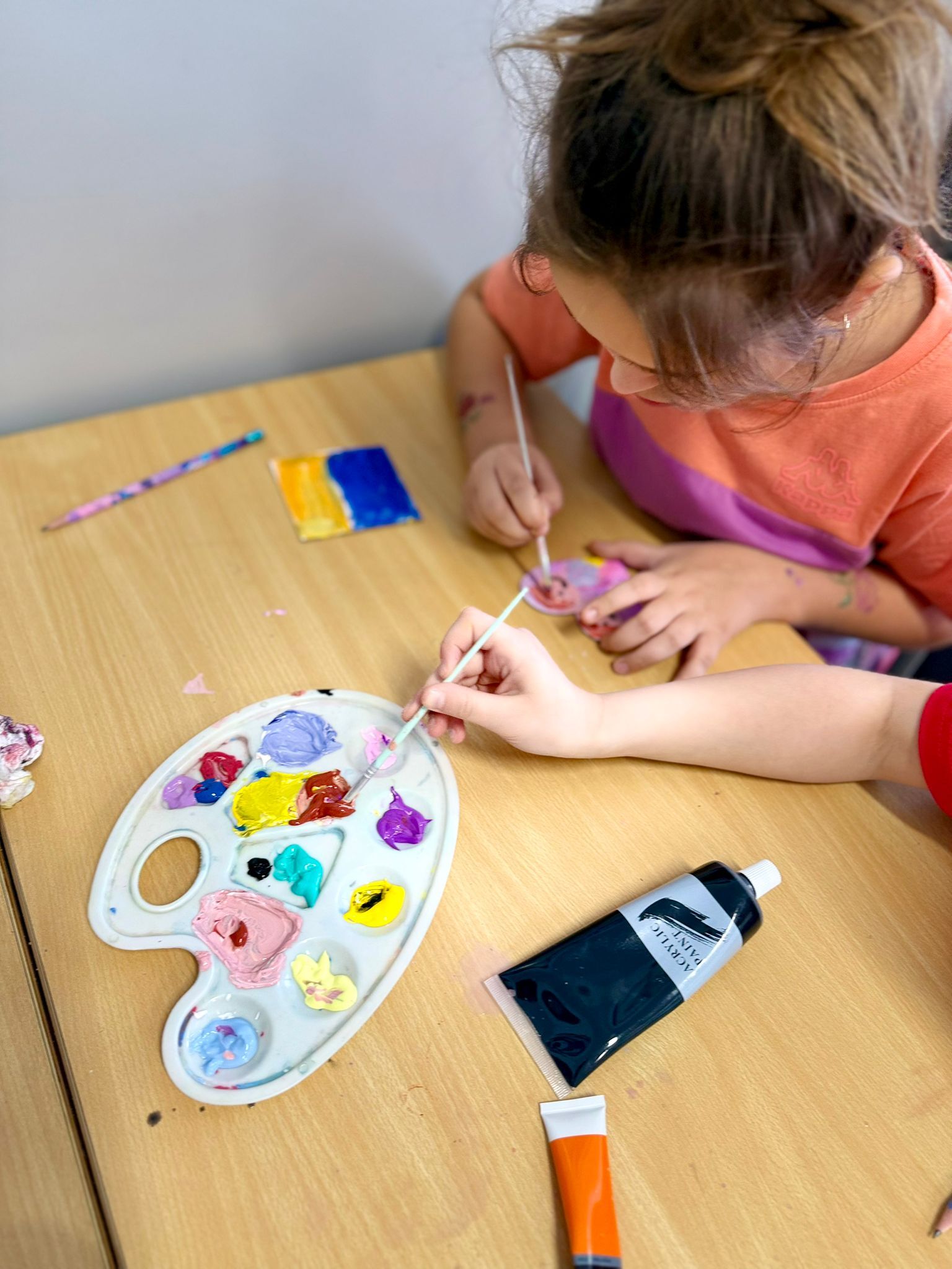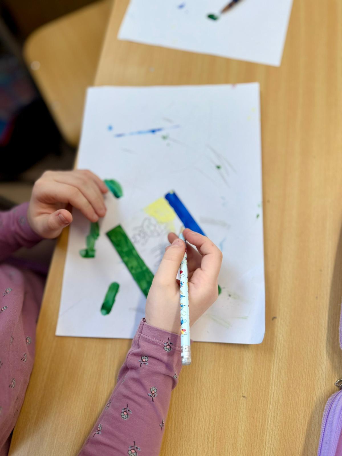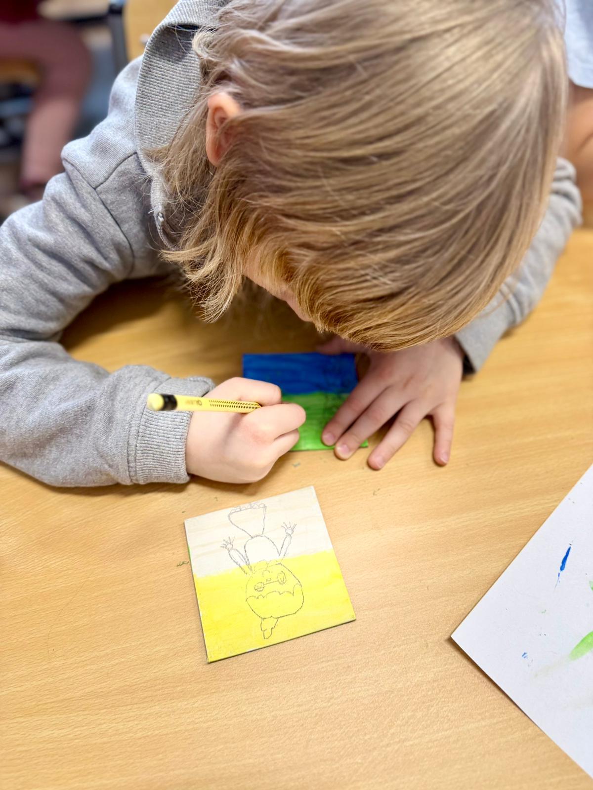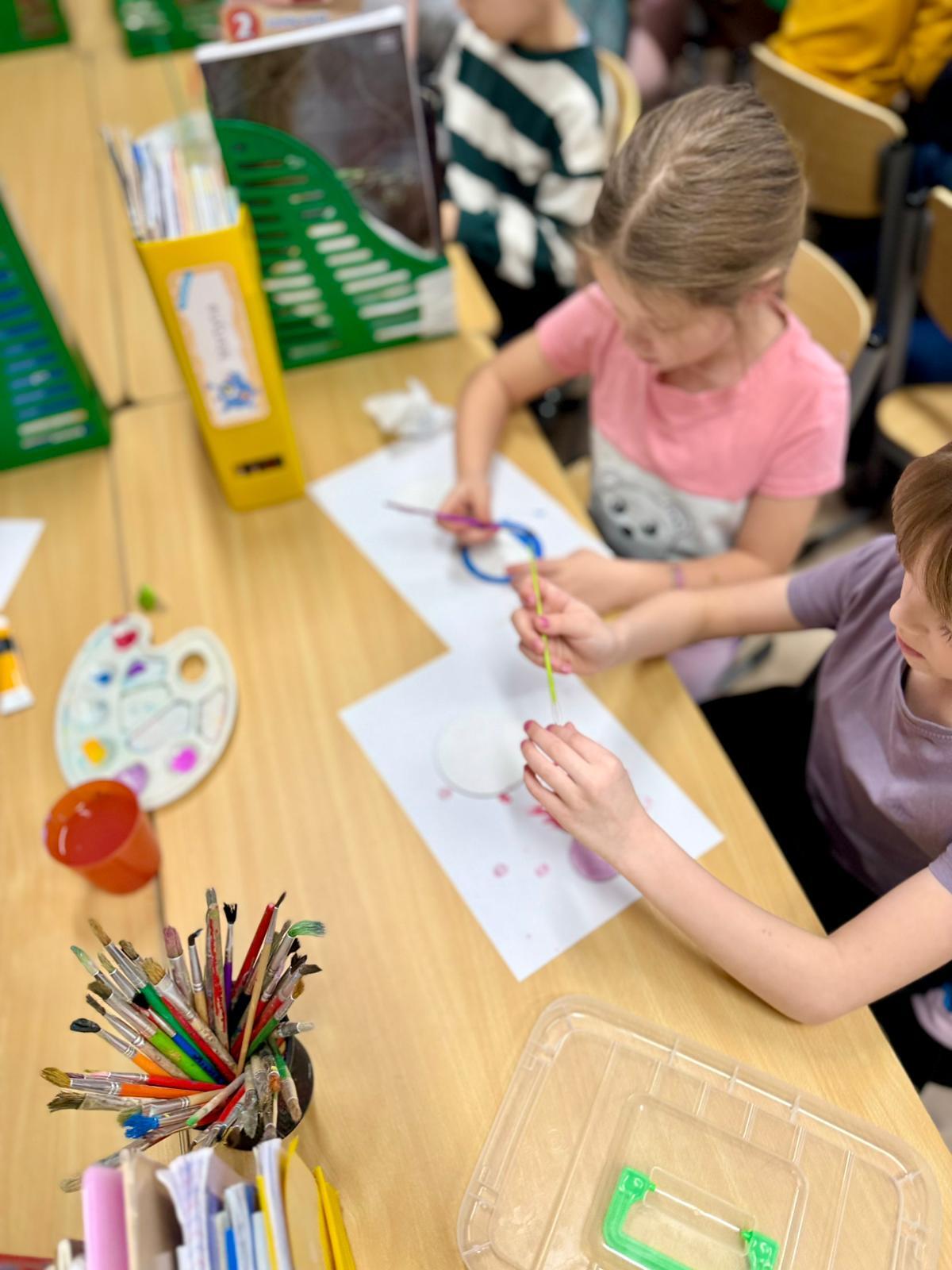 Pracę rozpoczęliśmy od tworzenia tła, wykorzystując farby akrylowe. Był to etap, na którym dzieci mogły swobodnie eksperymentować z kolorami, jednocześnie ucząc się cierpliwości i organizacji pracy – po zakończeniu tej części konieczne było odczekanie, aż farba wyschnie.