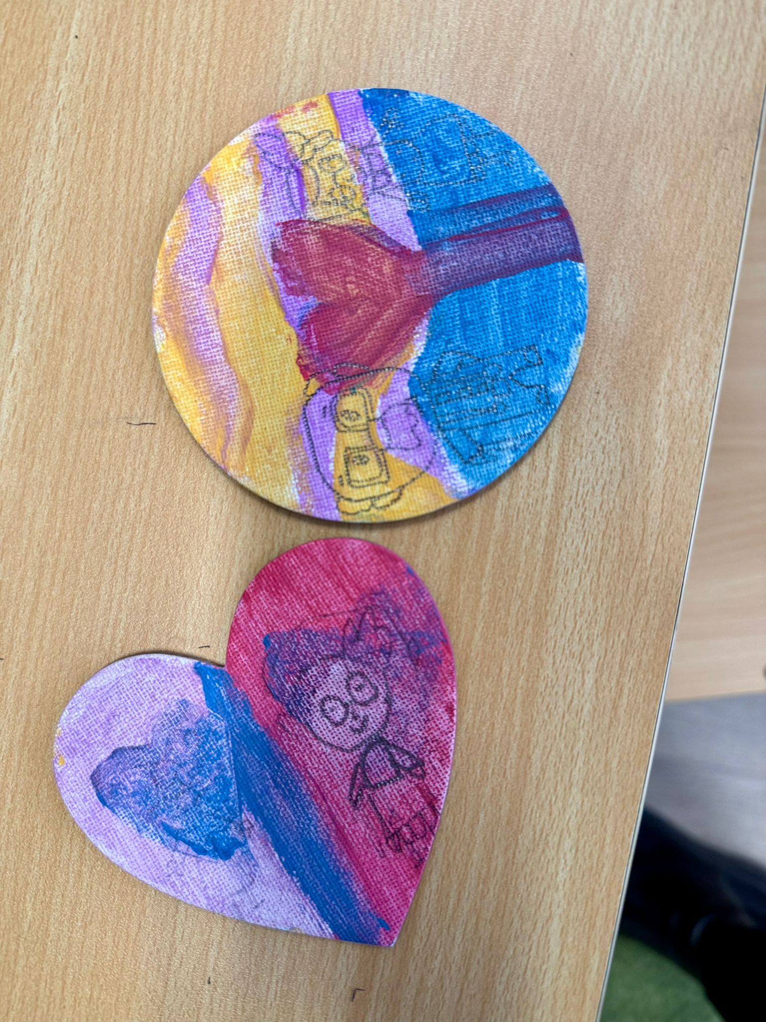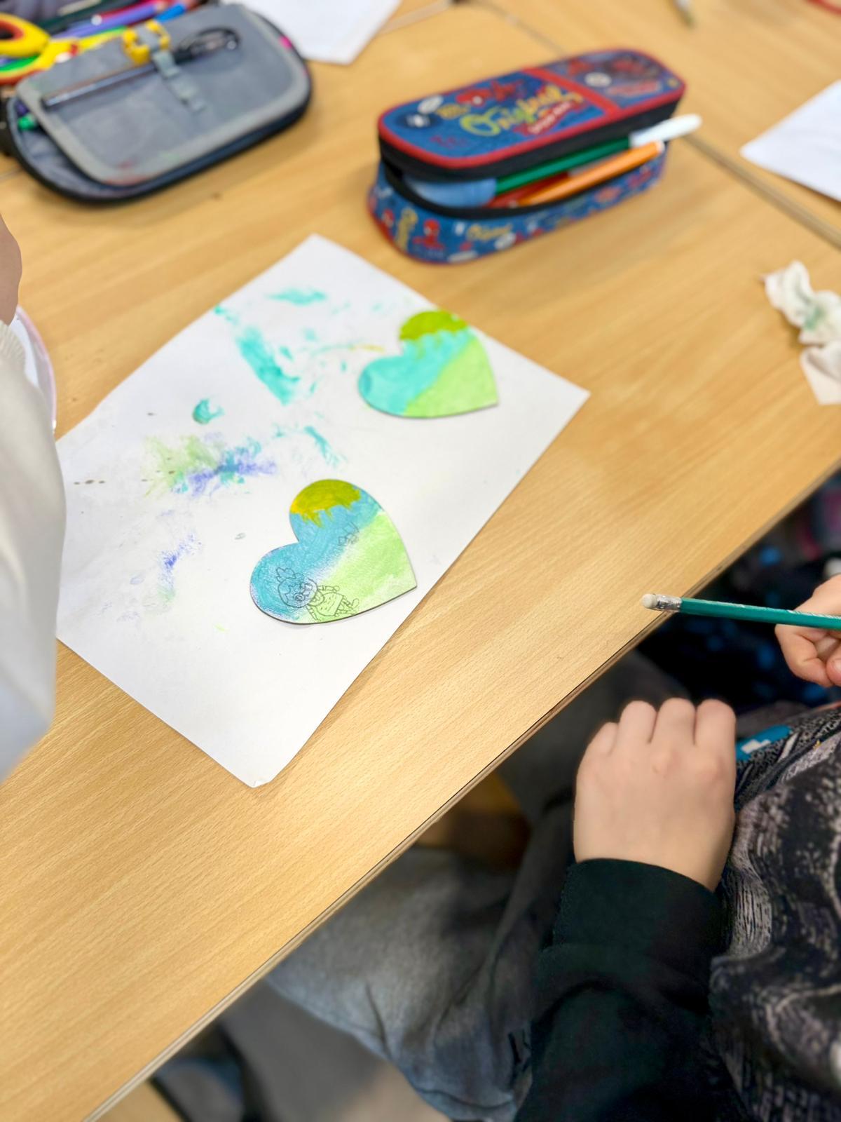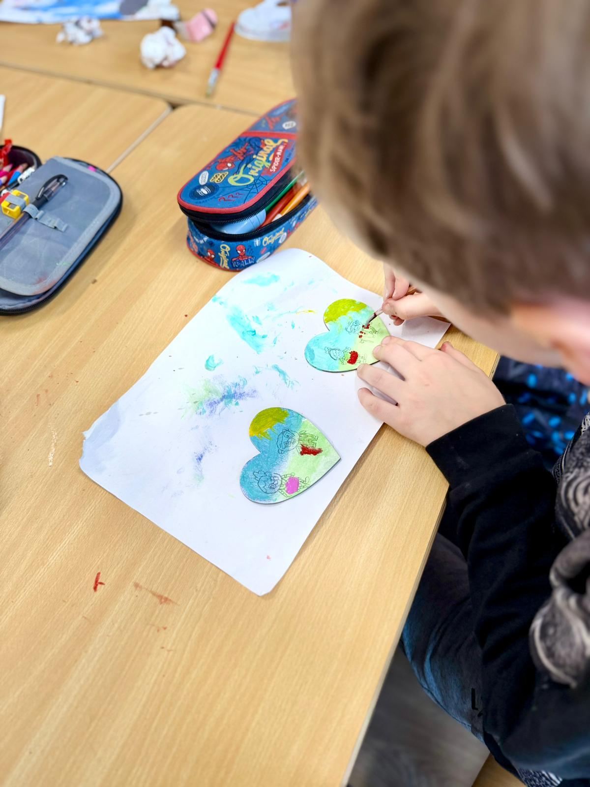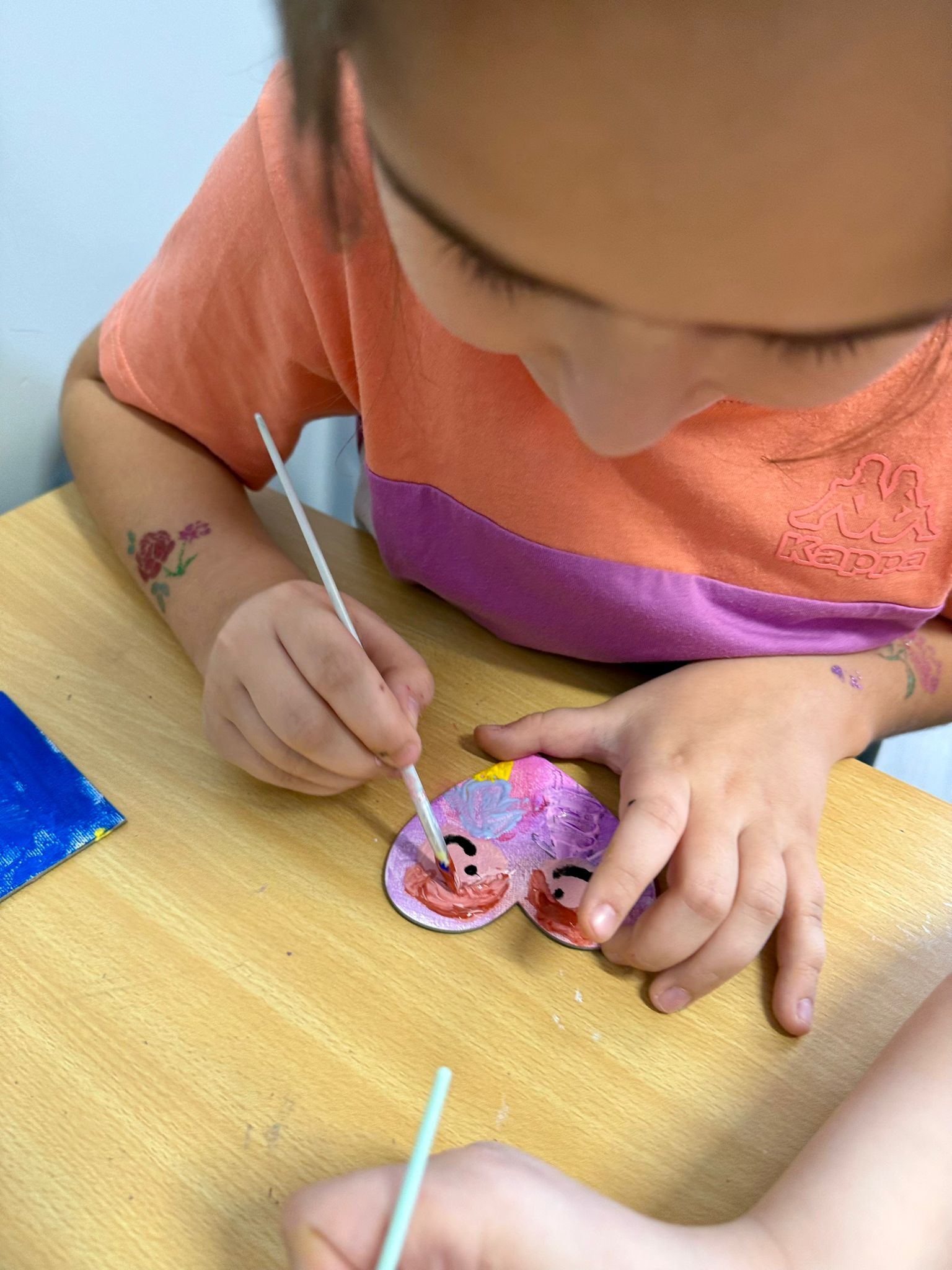 Pracę rozpoczęliśmy od tworzenia tła, wykorzystując farby akrylowe. Był to etap, na którym dzieci mogły swobodnie eksperymentować z kolorami, jednocześnie ucząc się cierpliwości i organizacji pracy – po zakończeniu tej części konieczne było odczekanie, aż farba wyschnie.