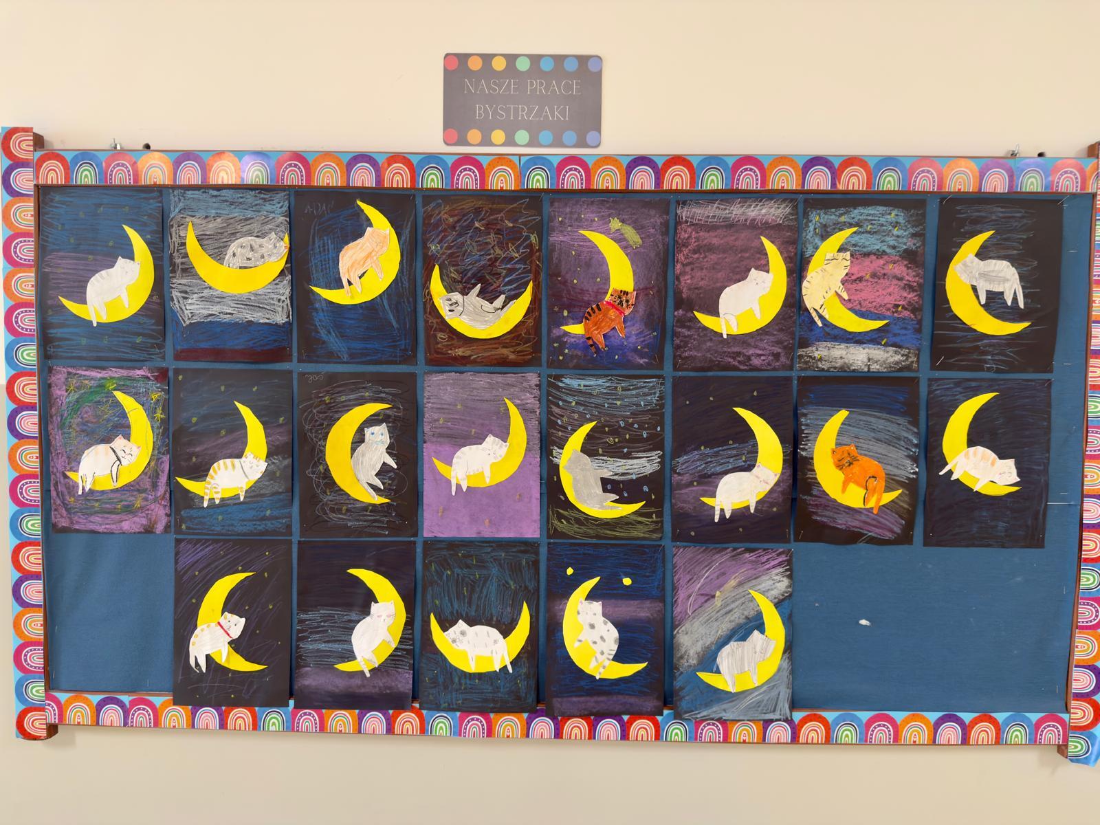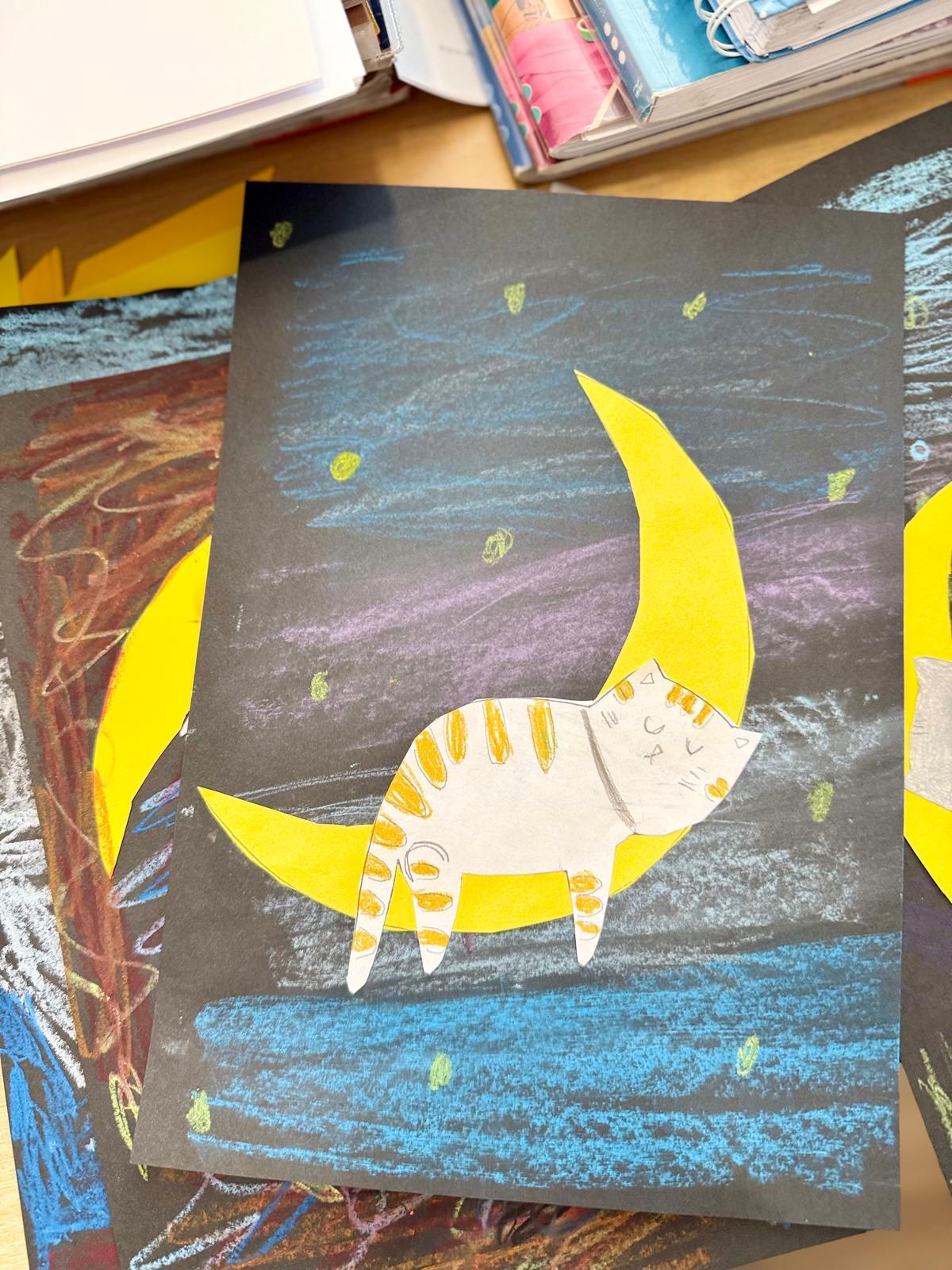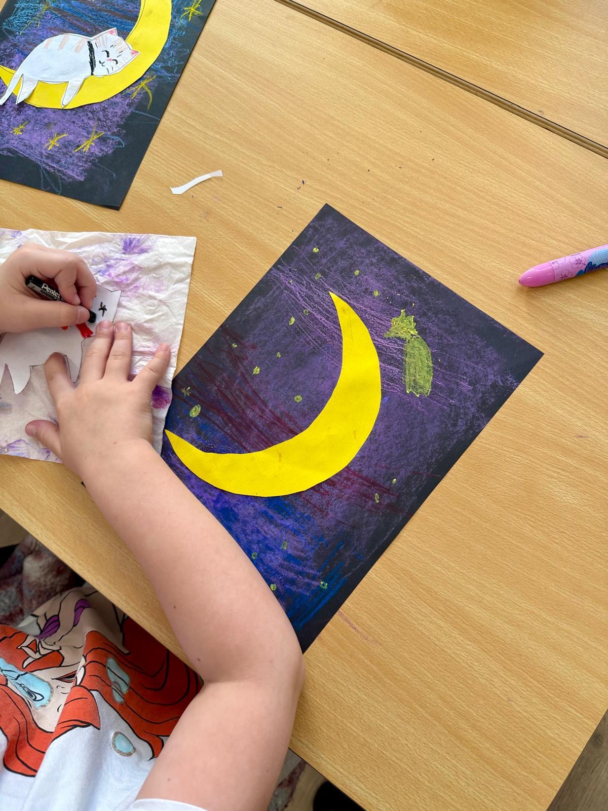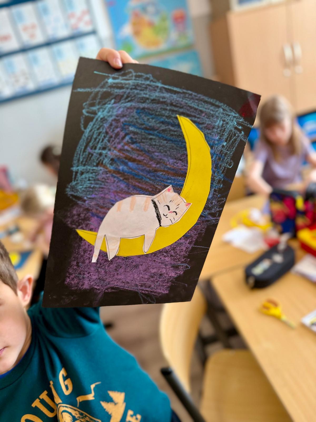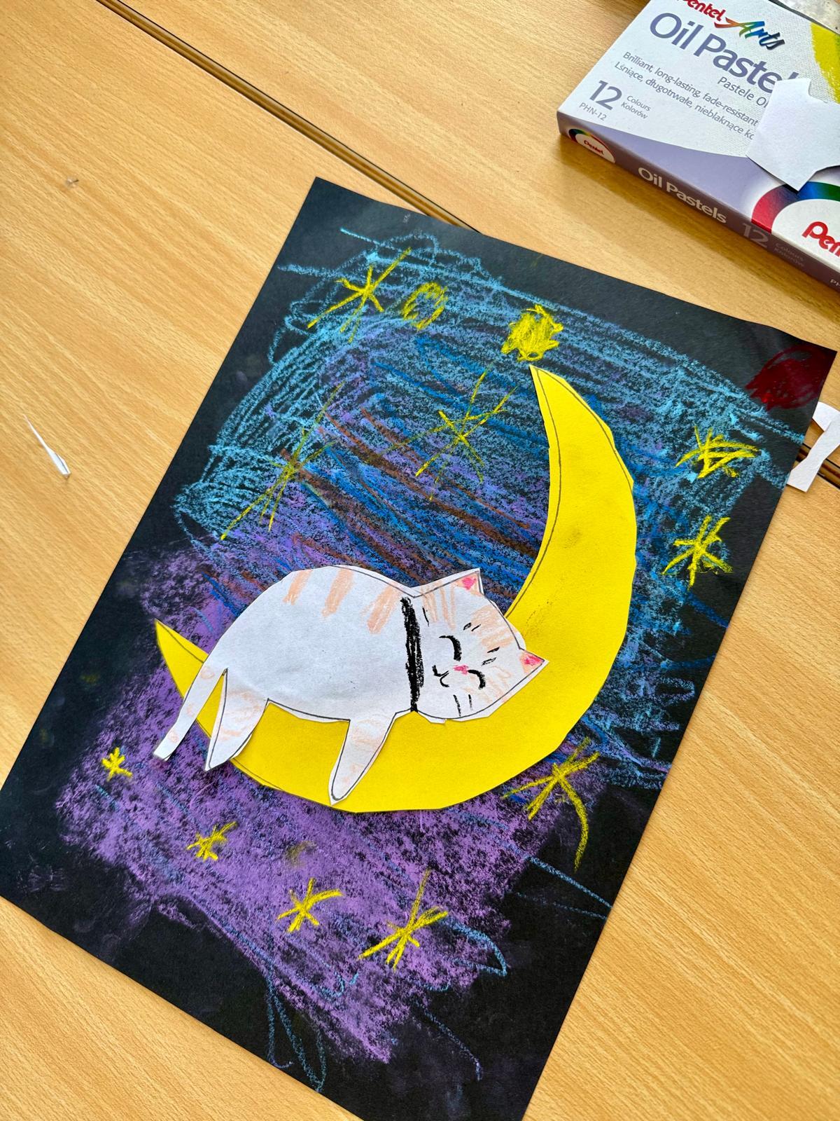 Z okazji Dnia Kota Bystrzaki stworzyły prace plastyczne. Tło wykonaliśmy pastelami olejnymi na czarnej kartce – dzieci odkrywały, jak mocno trzeba docisnąć kolor, jak budować nocne niebo i jak rozświetlić je gwiazdami.
