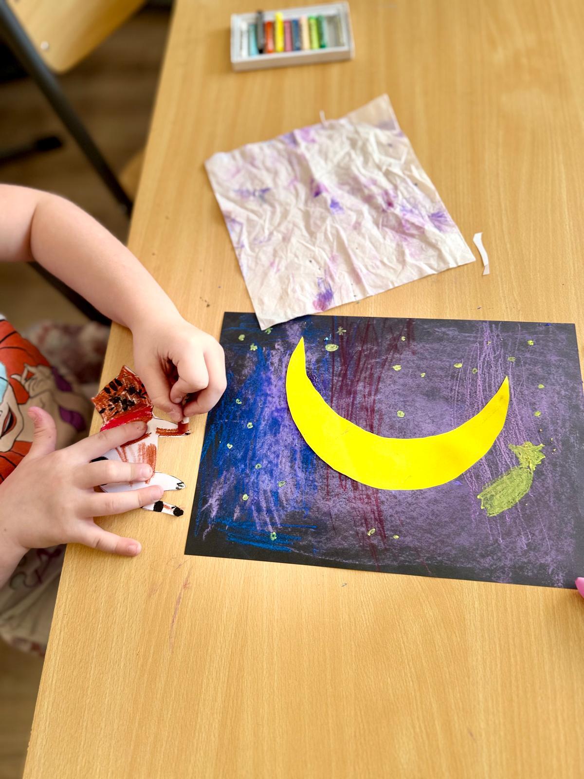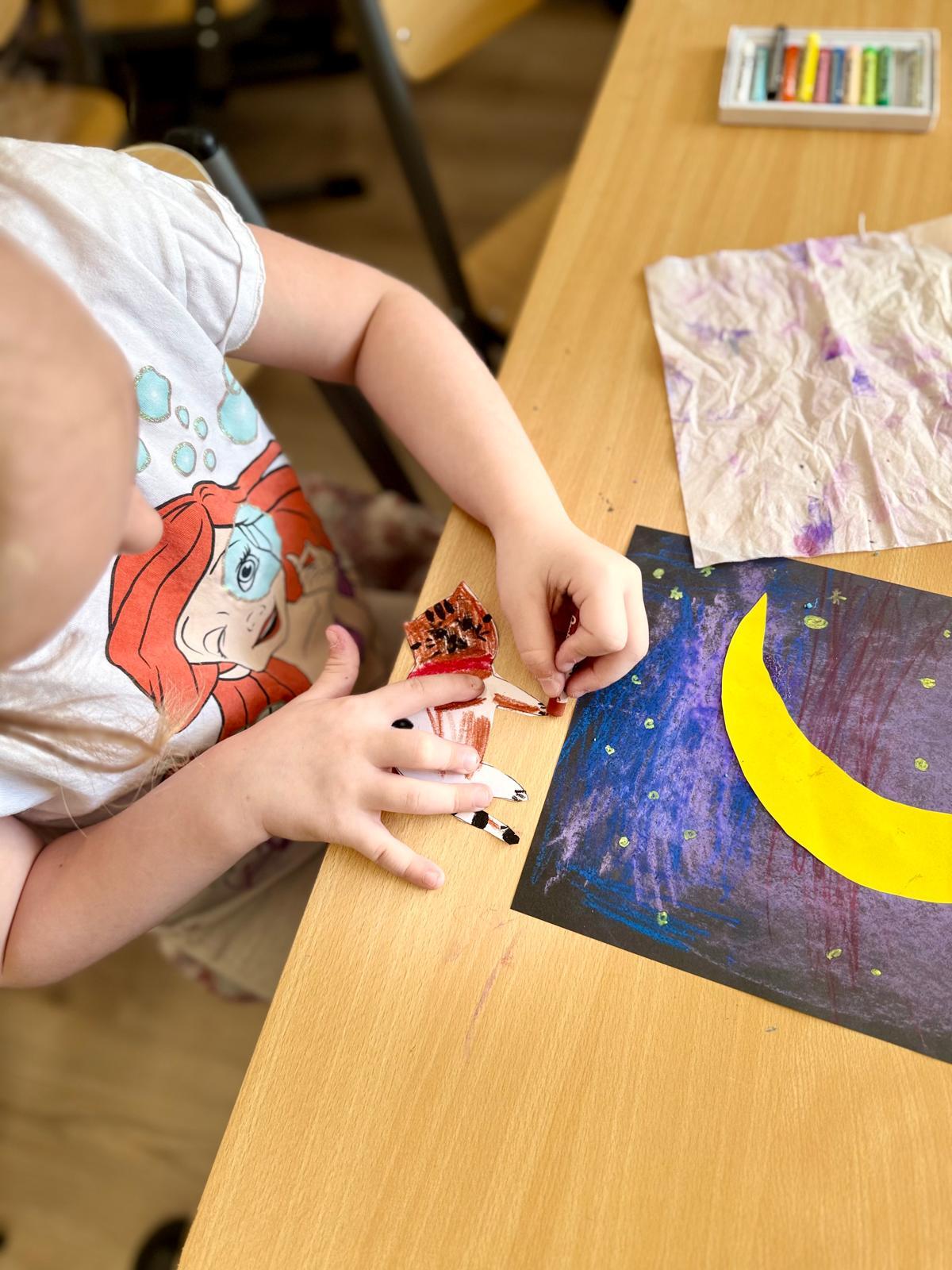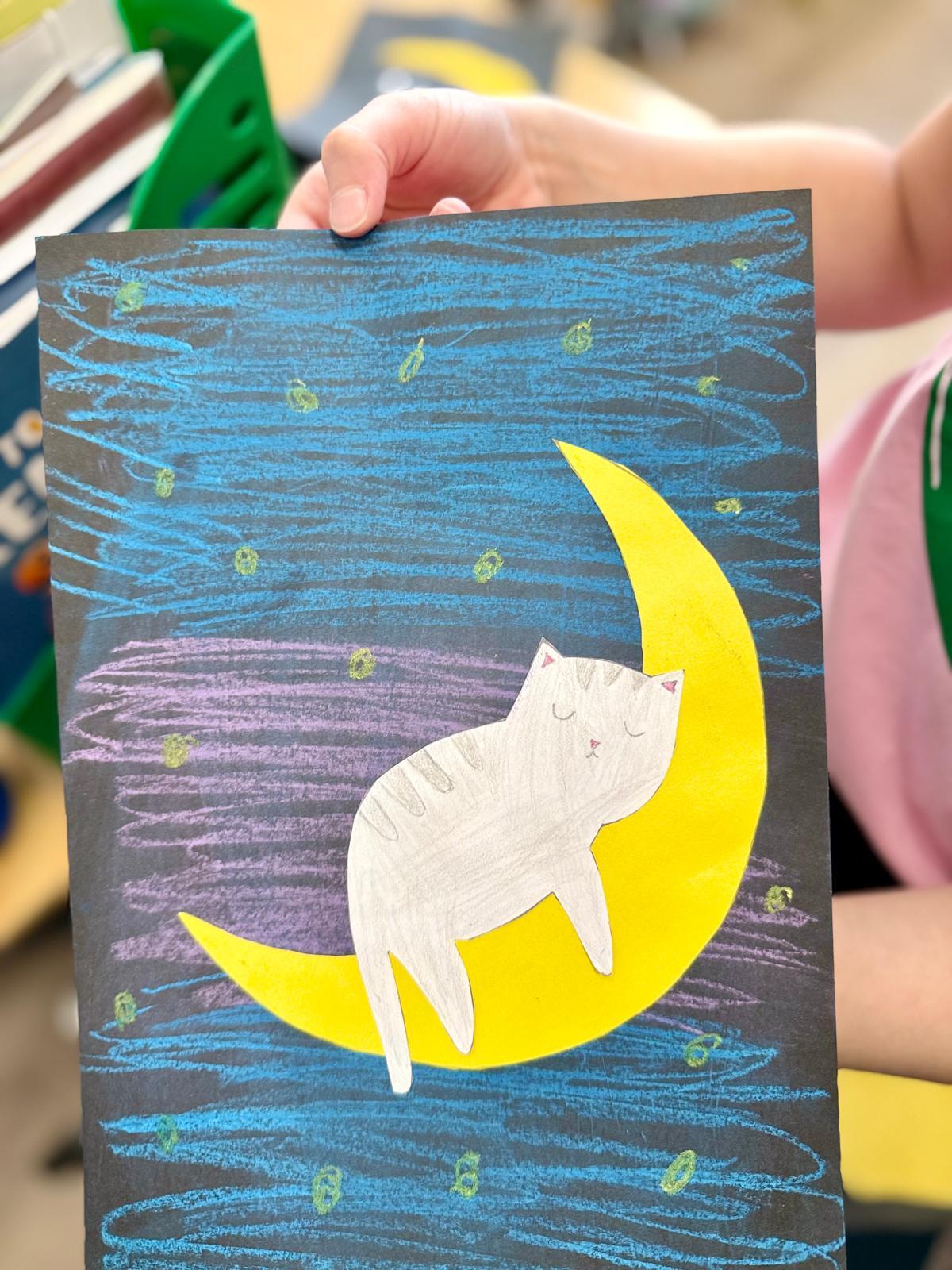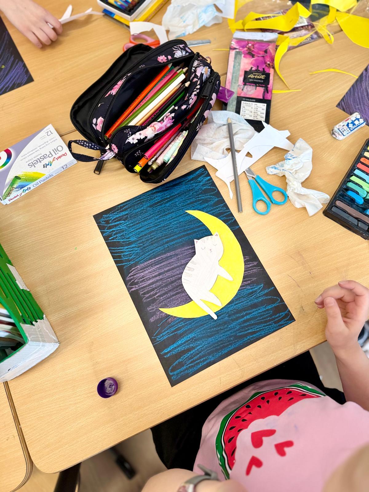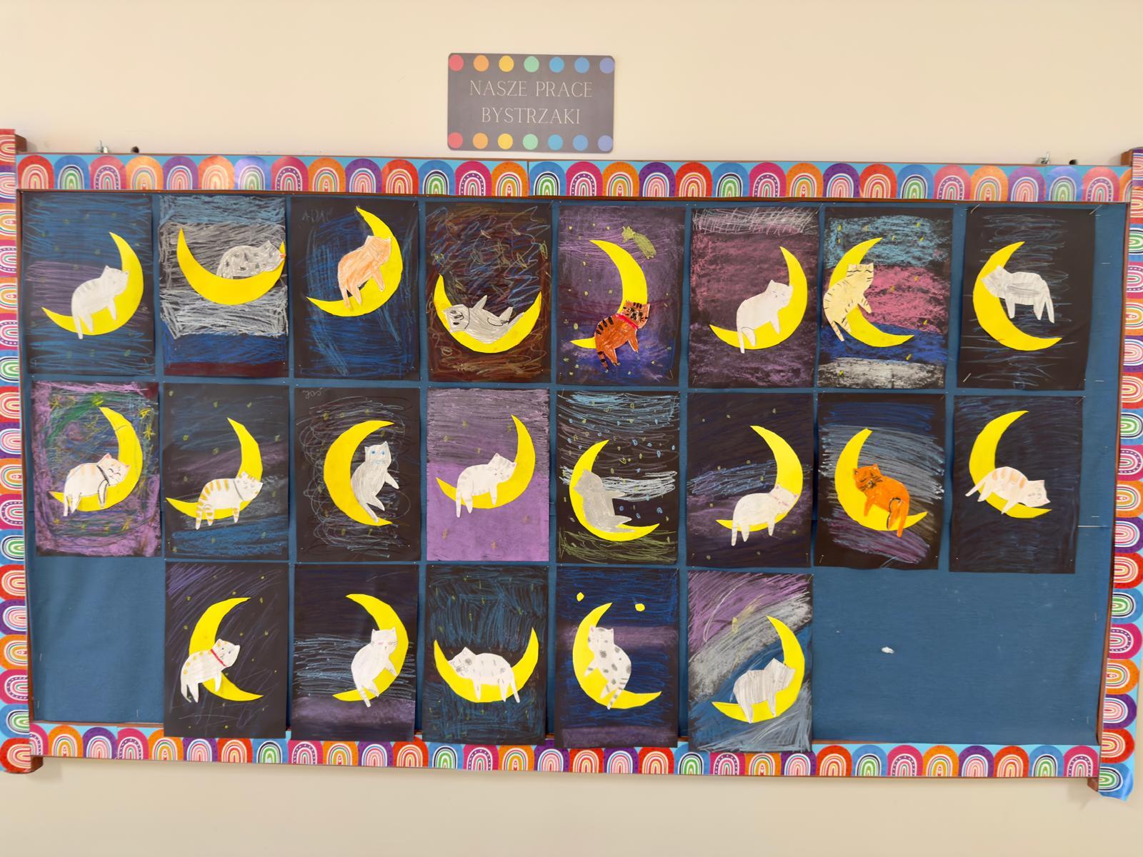 Z okazji Dnia Kota Bystrzaki stworzyły prace plastyczne. Tło wykonaliśmy pastelami olejnymi na czarnej kartce – dzieci odkrywały, jak mocno trzeba docisnąć kolor, jak budować nocne niebo i jak rozświetlić je gwiazdami.