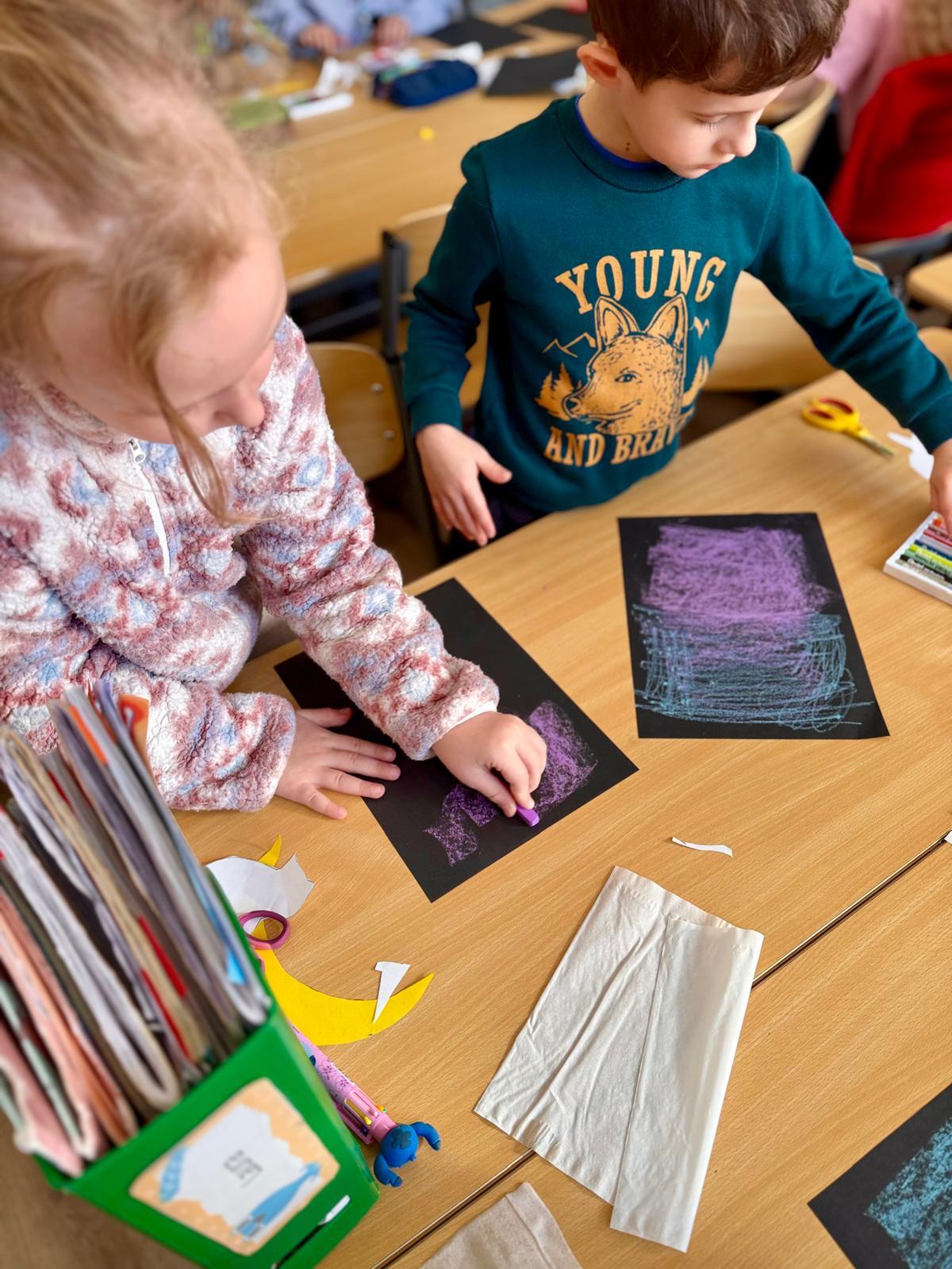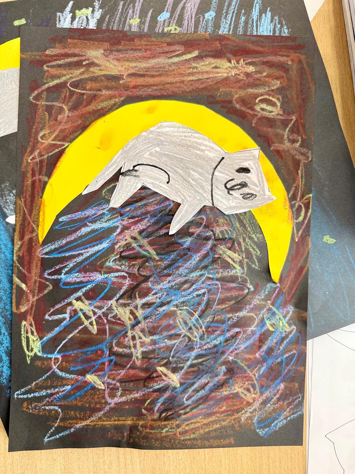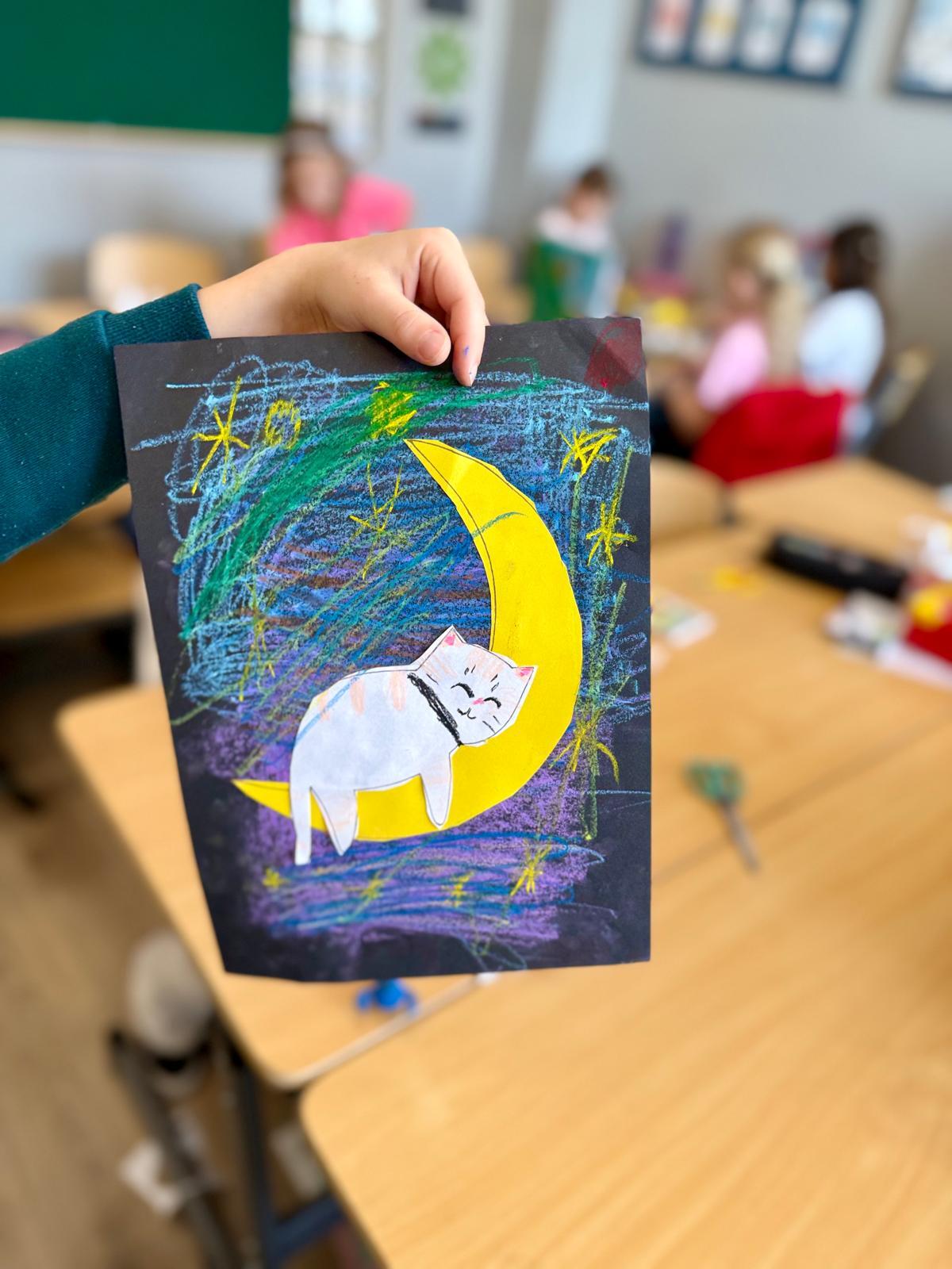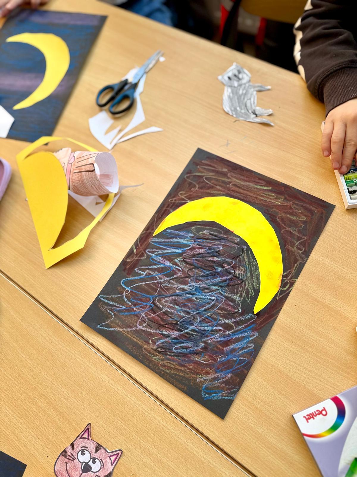 Z okazji Dnia Kota Bystrzaki stworzyły prace plastyczne. Tło wykonaliśmy pastelami olejnymi na czarnej kartce – dzieci odkrywały, jak mocno trzeba docisnąć kolor, jak budować nocne niebo i jak rozświetlić je gwiazdami.