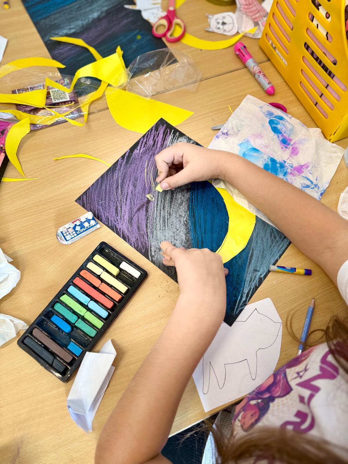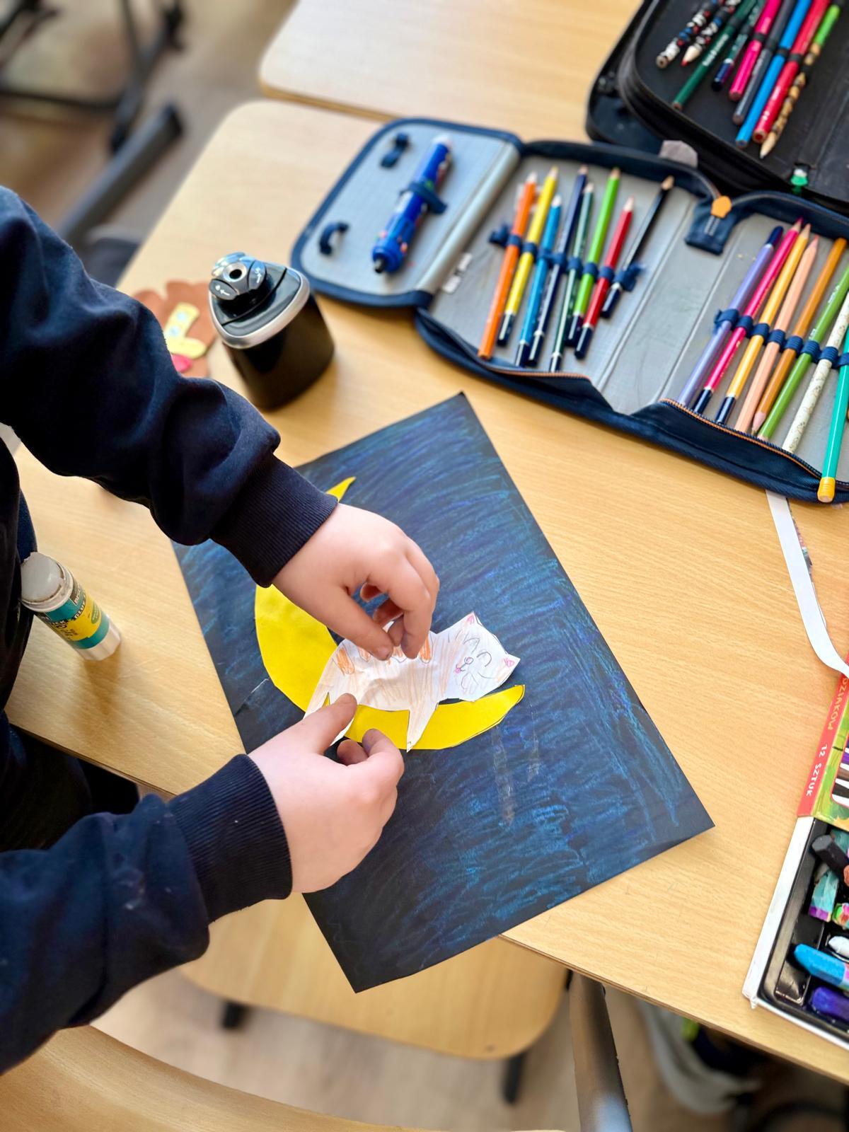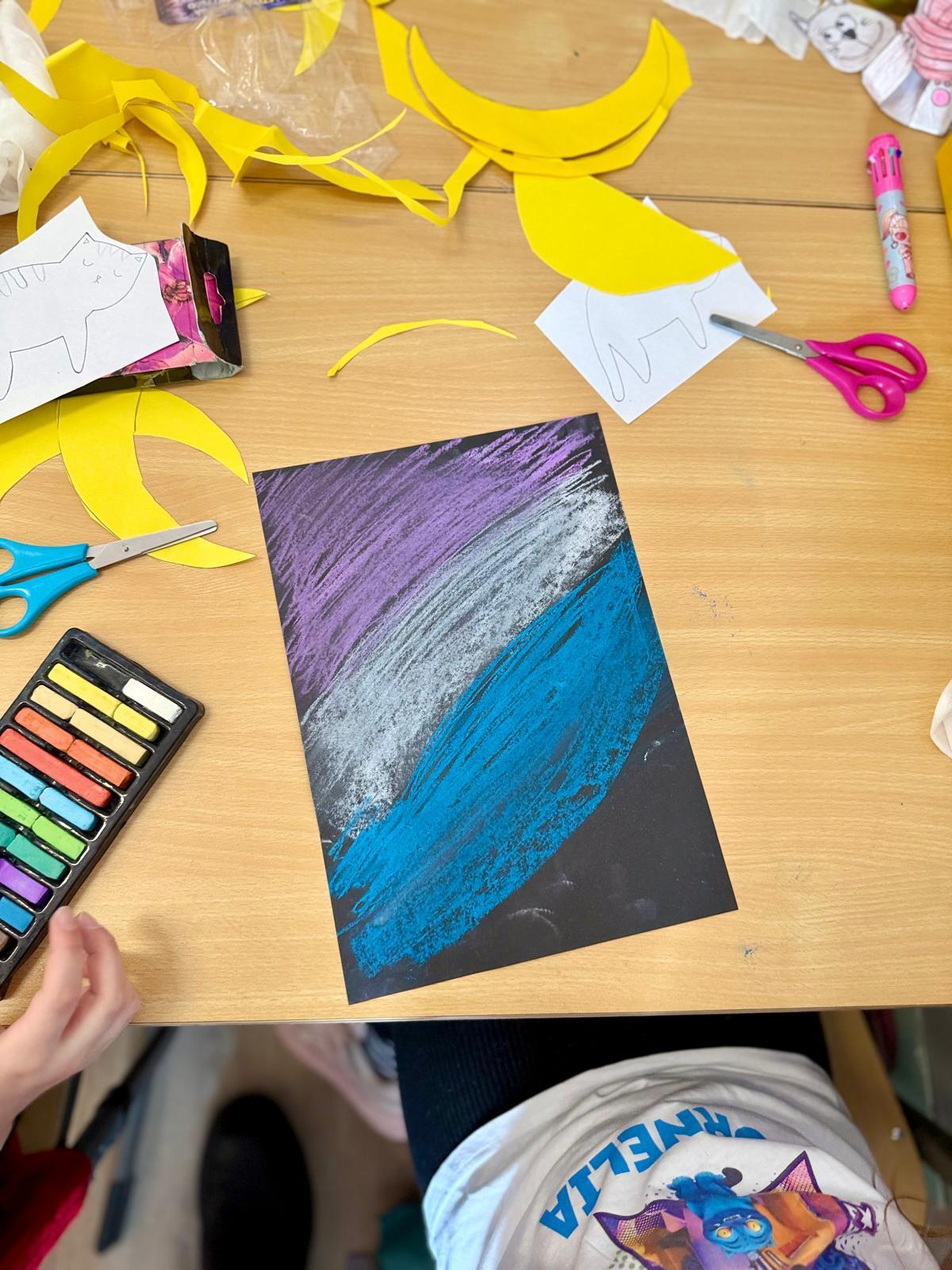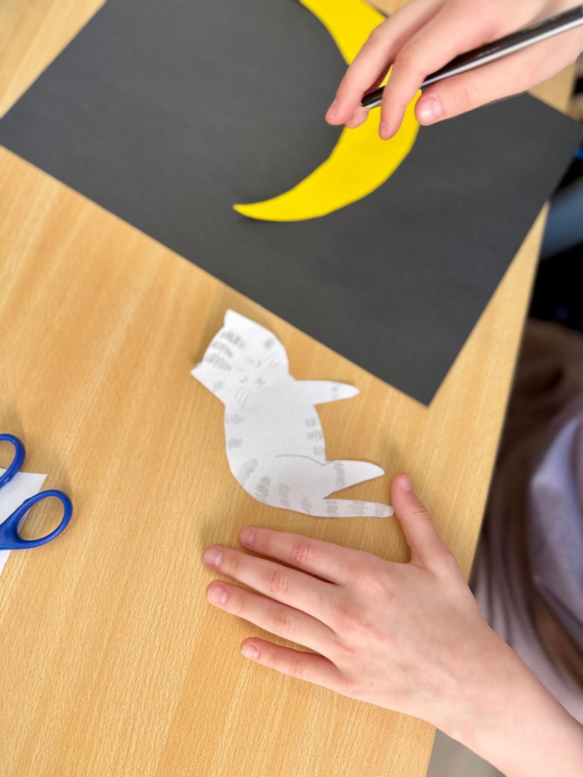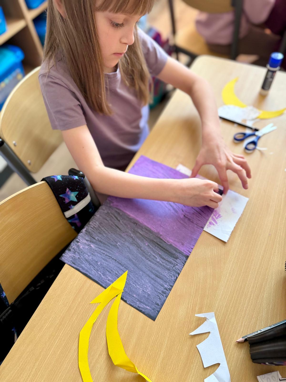 Z okazji Dnia Kota Bystrzaki stworzyły prace plastyczne. Tło wykonaliśmy pastelami olejnymi na czarnej kartce – dzieci odkrywały, jak mocno trzeba docisnąć kolor, jak budować nocne niebo i jak rozświetlić je gwiazdami.
