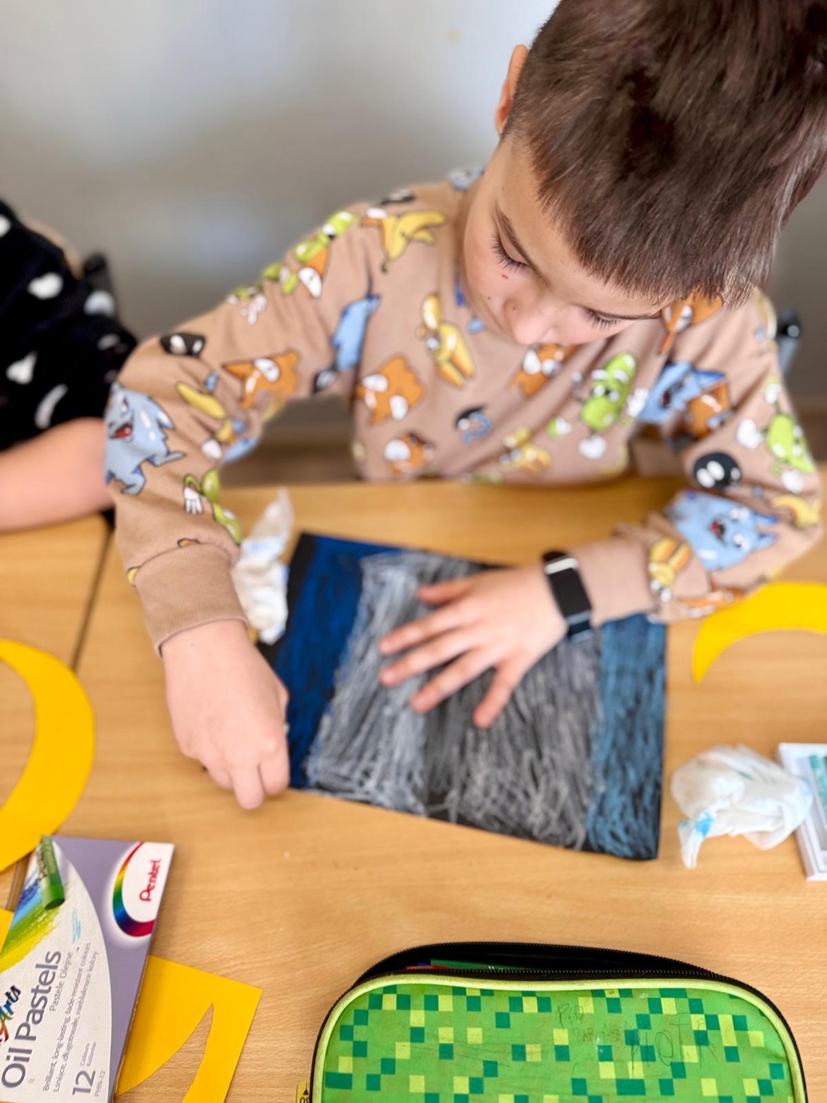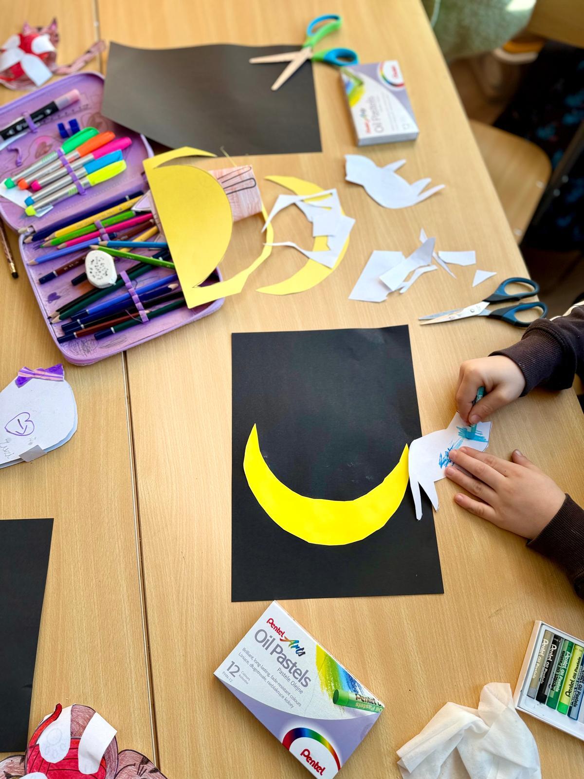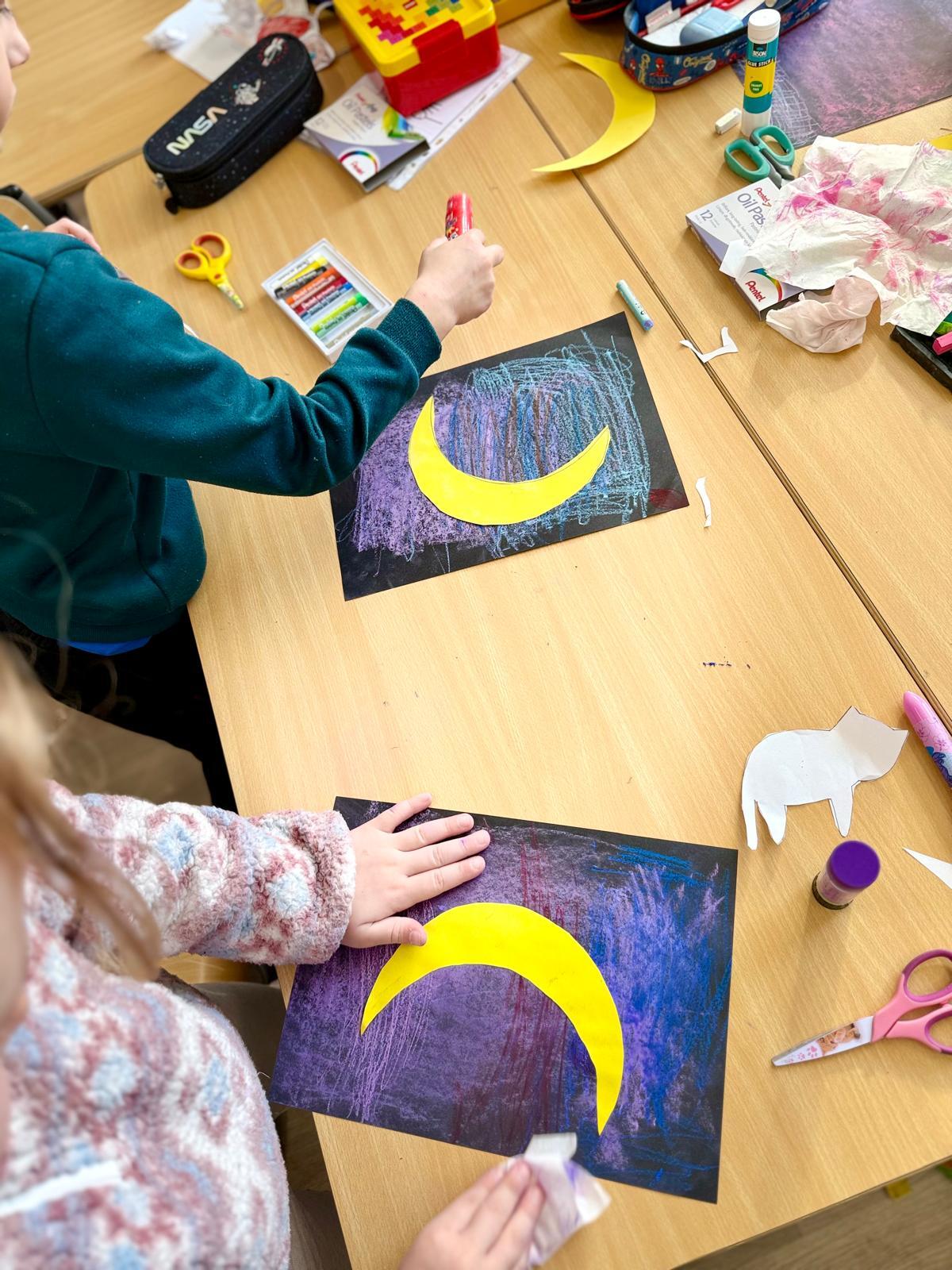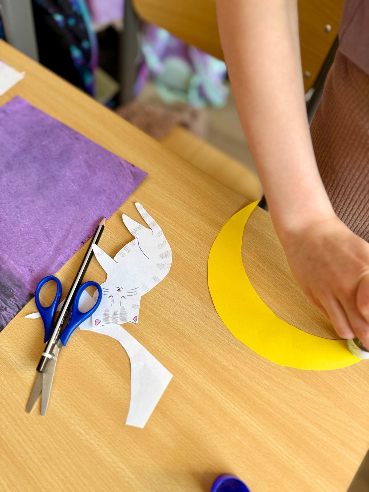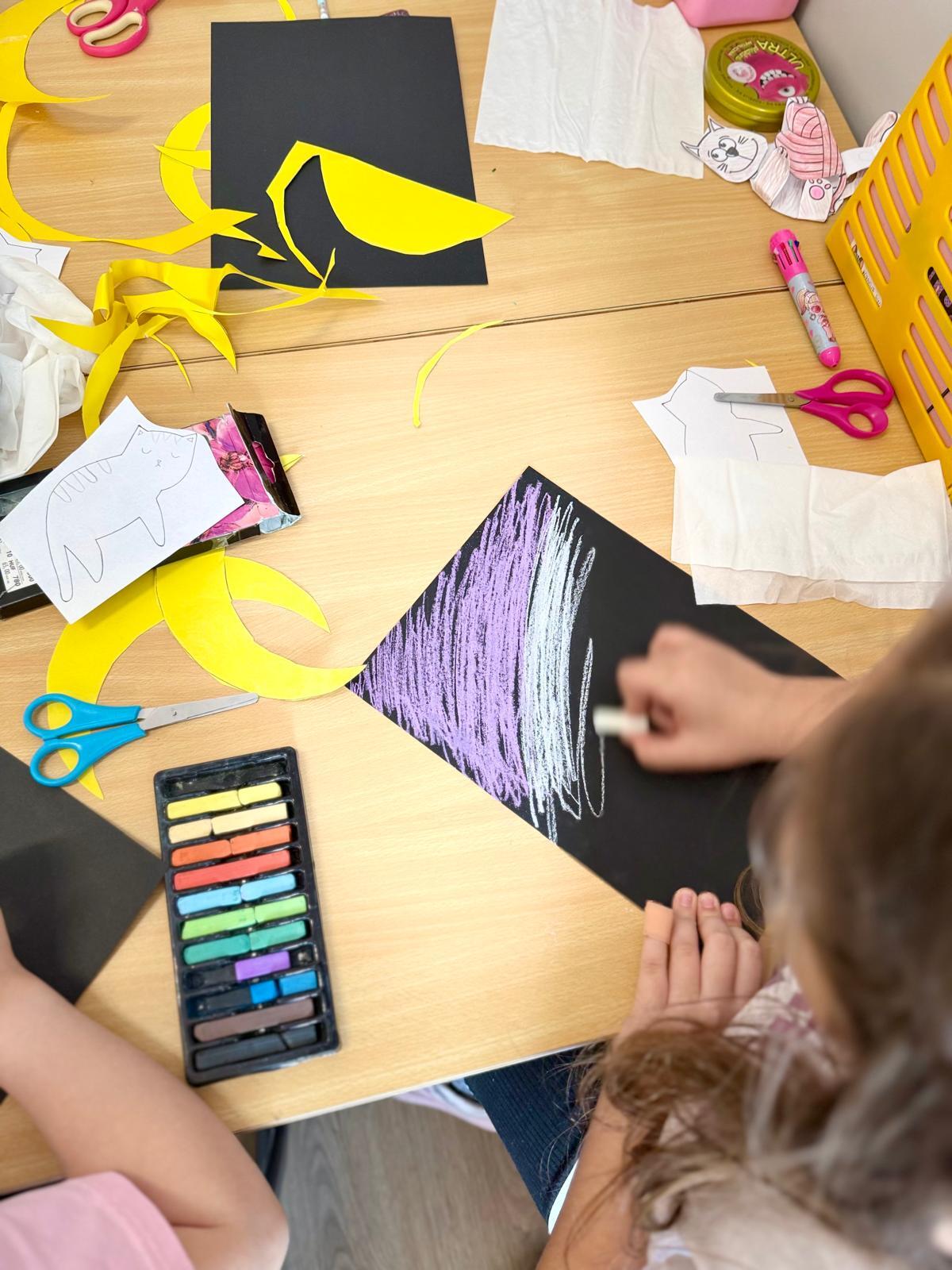 Z okazji Dnia Kota Bystrzaki stworzyły prace plastyczne. Tło wykonaliśmy pastelami olejnymi na czarnej kartce – dzieci odkrywały, jak mocno trzeba docisnąć kolor, jak budować nocne niebo i jak rozświetlić je gwiazdami.