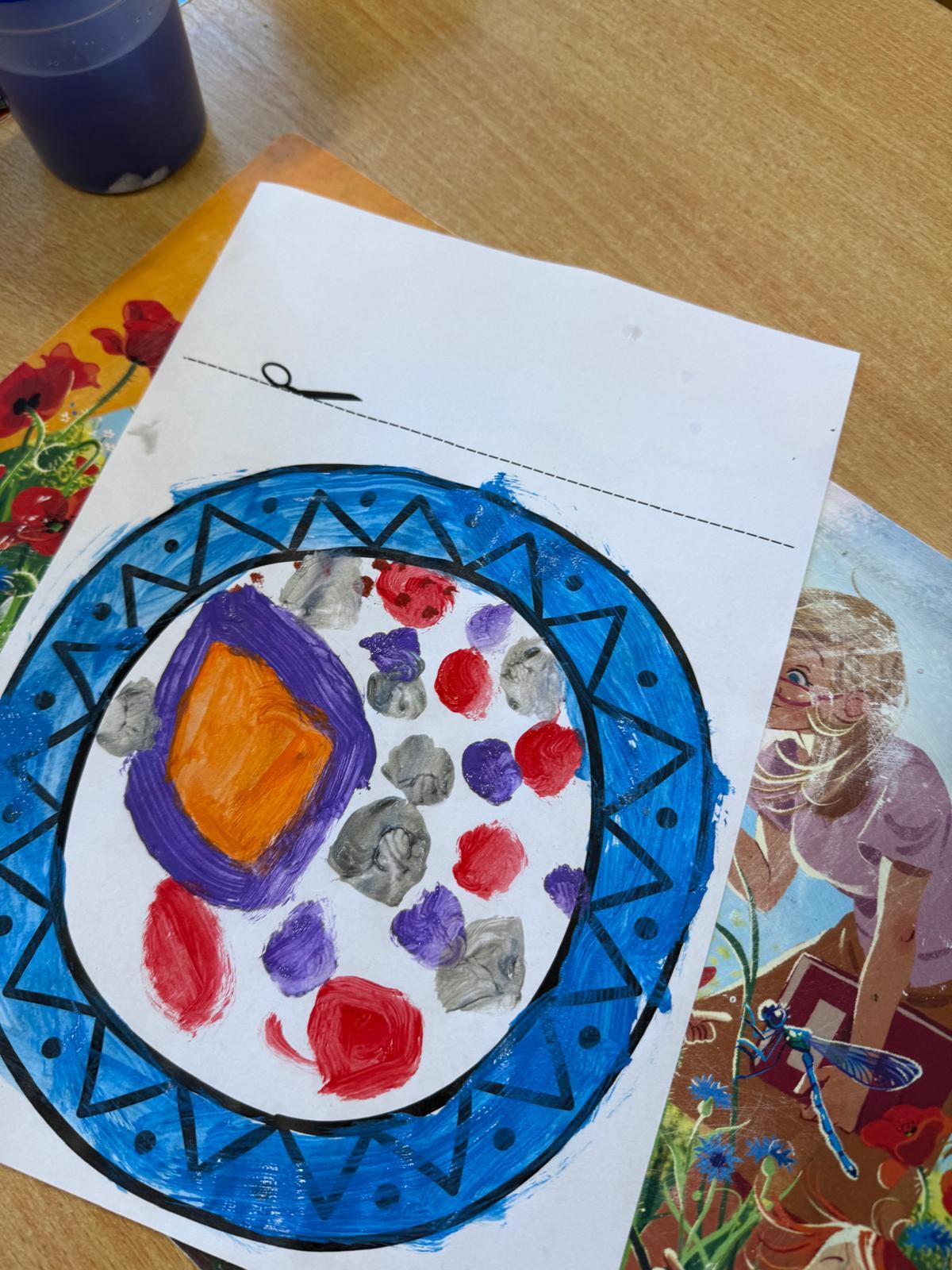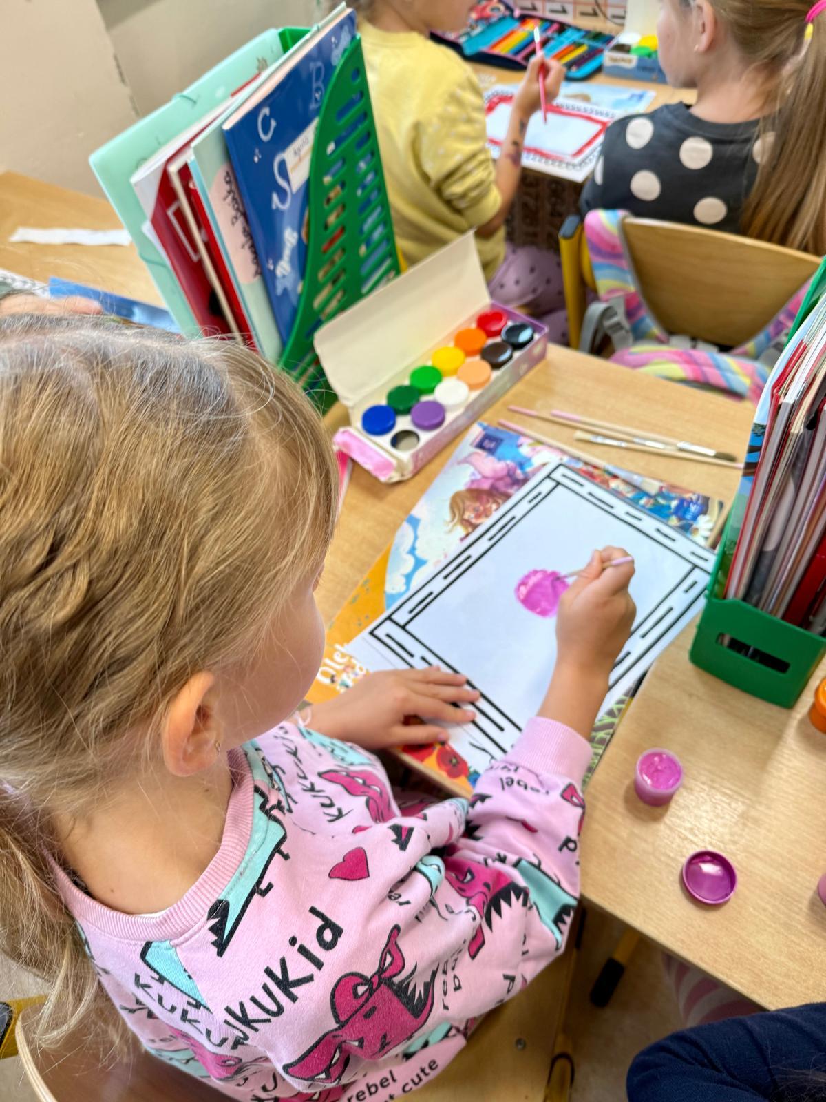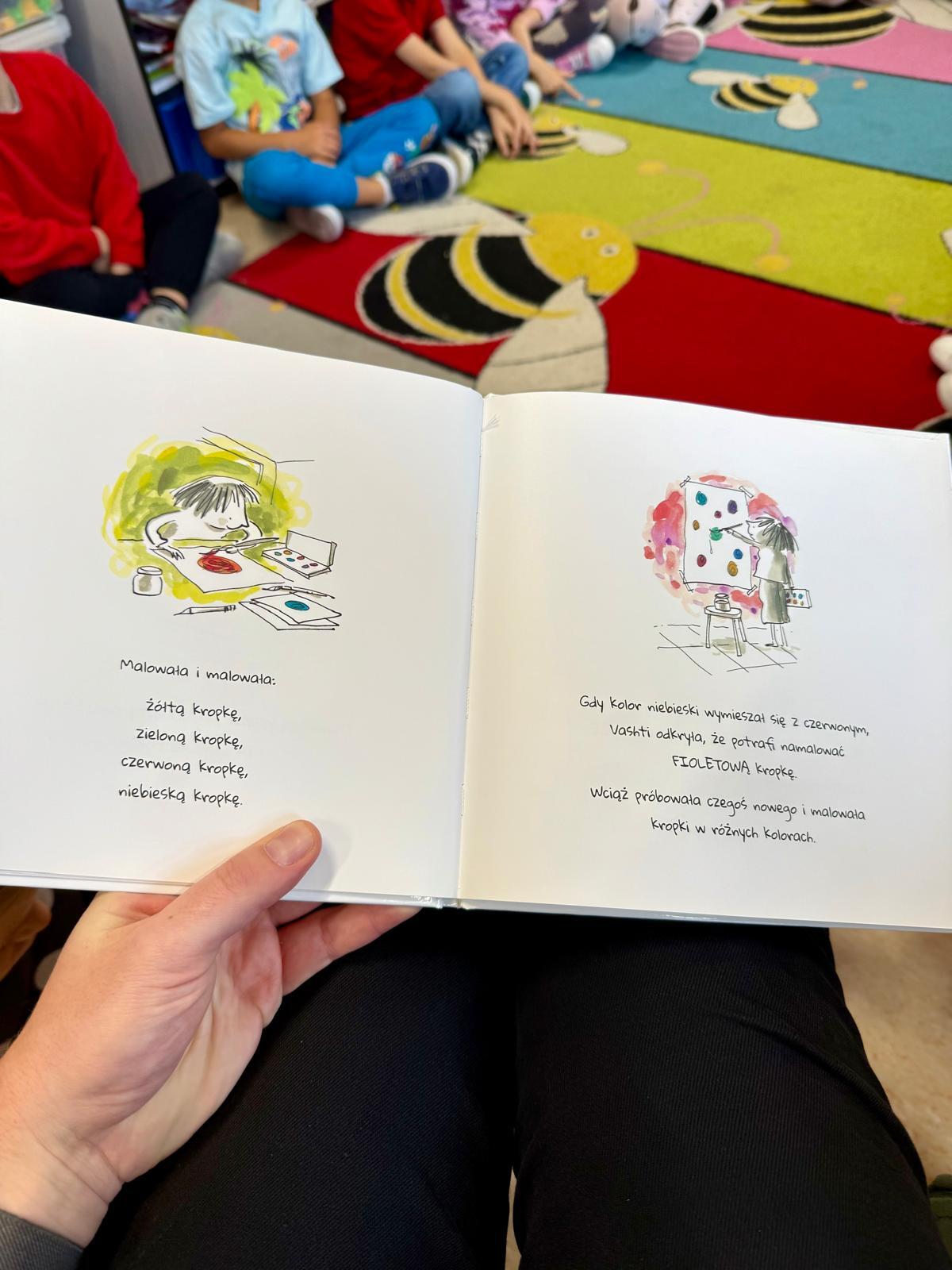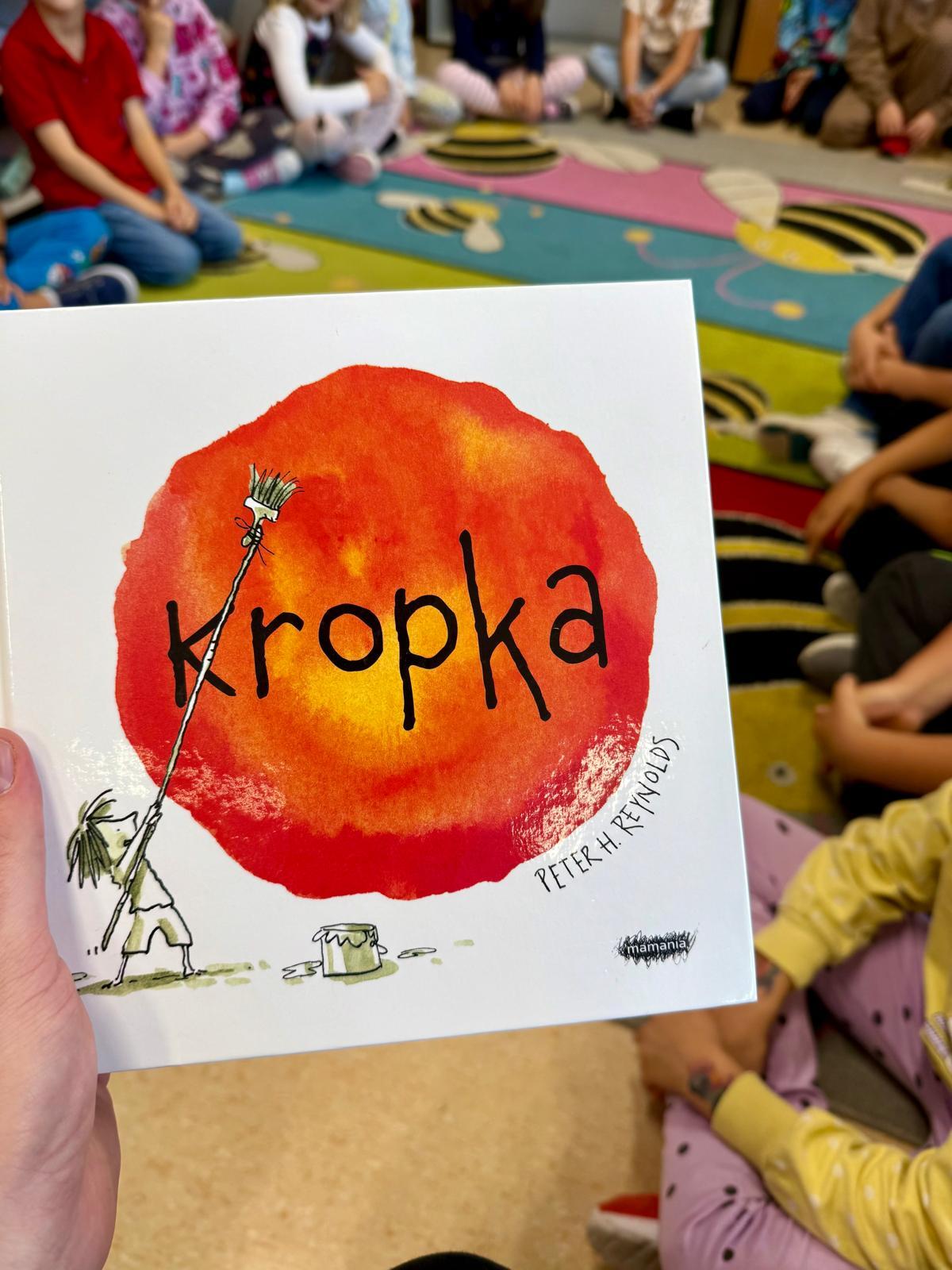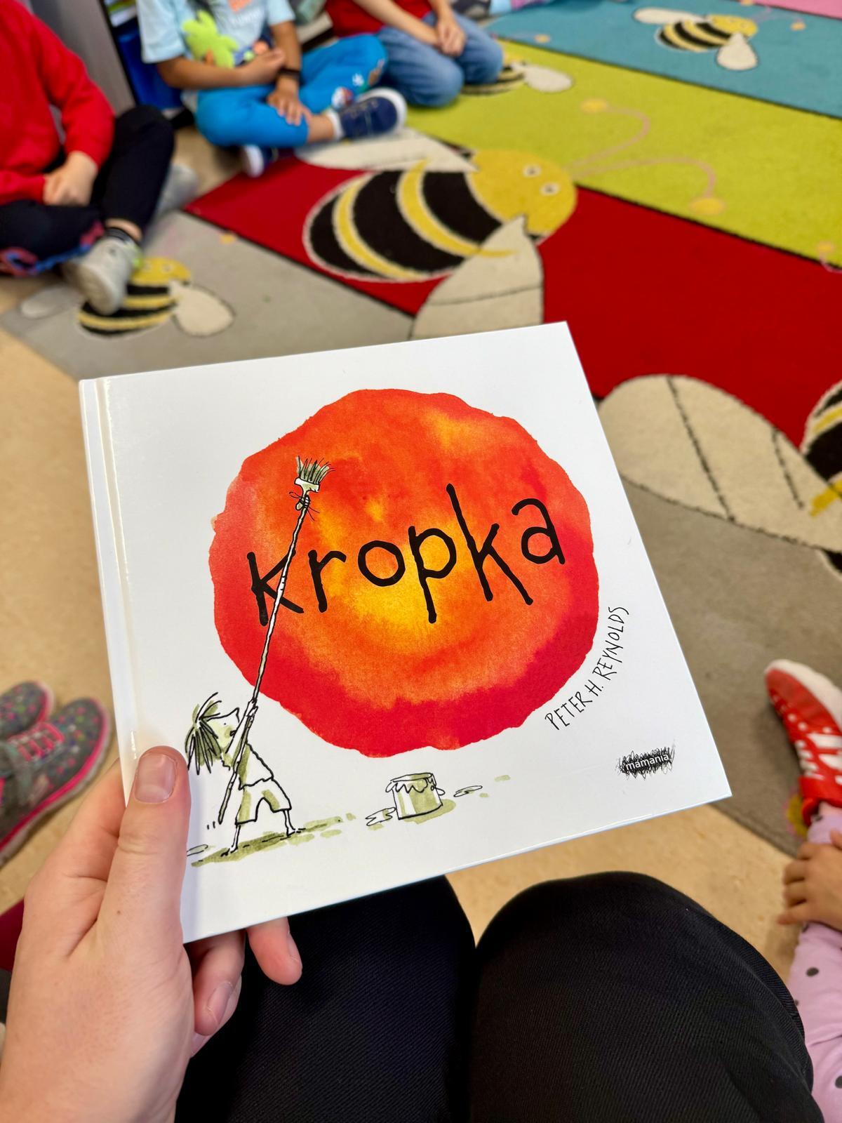 Na naszych zajęciach wspólnie przeczytaliśmy książkę „Kropka” autorstwa Petera H. Reynoldsa. To piękna, prosta, a zarazem bardzo mądra historia o dziewczynce o imieniu Vashti, która była przekonana, że nie potrafi rysować. Jej nauczycielka zachęciła ją, aby po prostu „zostawiła swój ślad” – i tak powstała pierwsza kropka. Okazało się, że ta mała kropka stała się początkiem niezwykłej podróży odkrywania własnego talentu i wiary w siebie.
