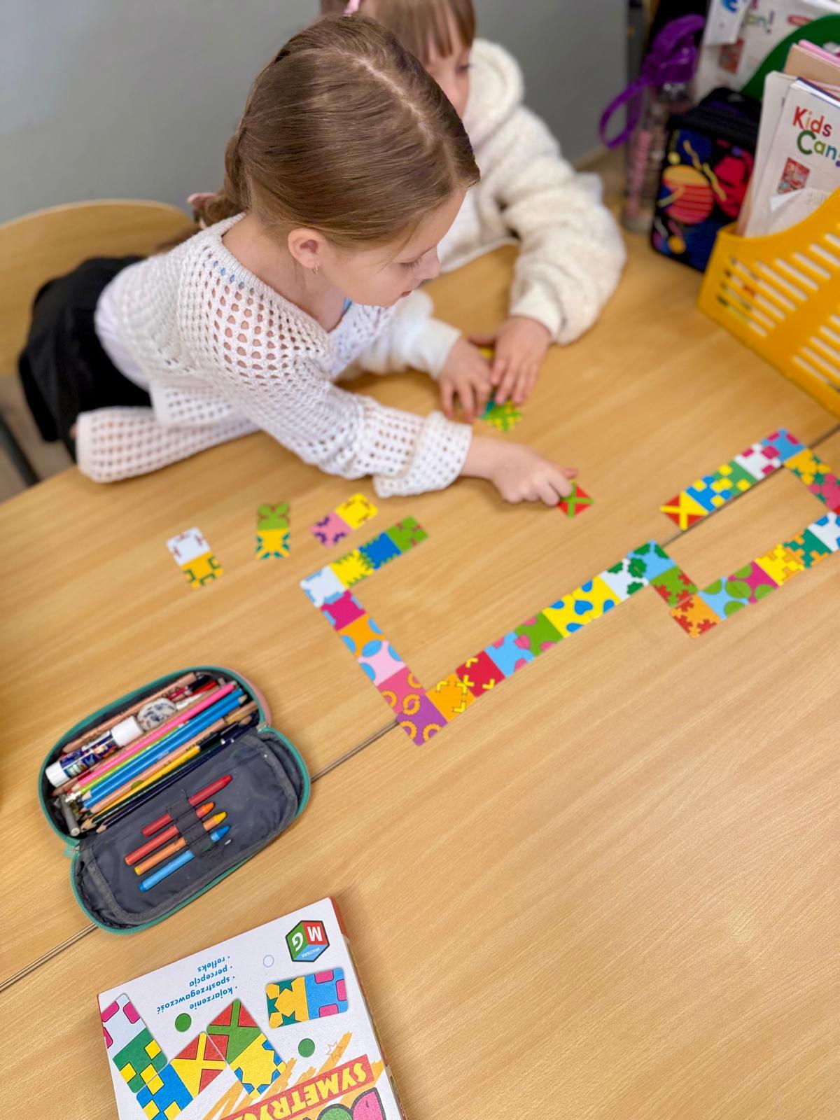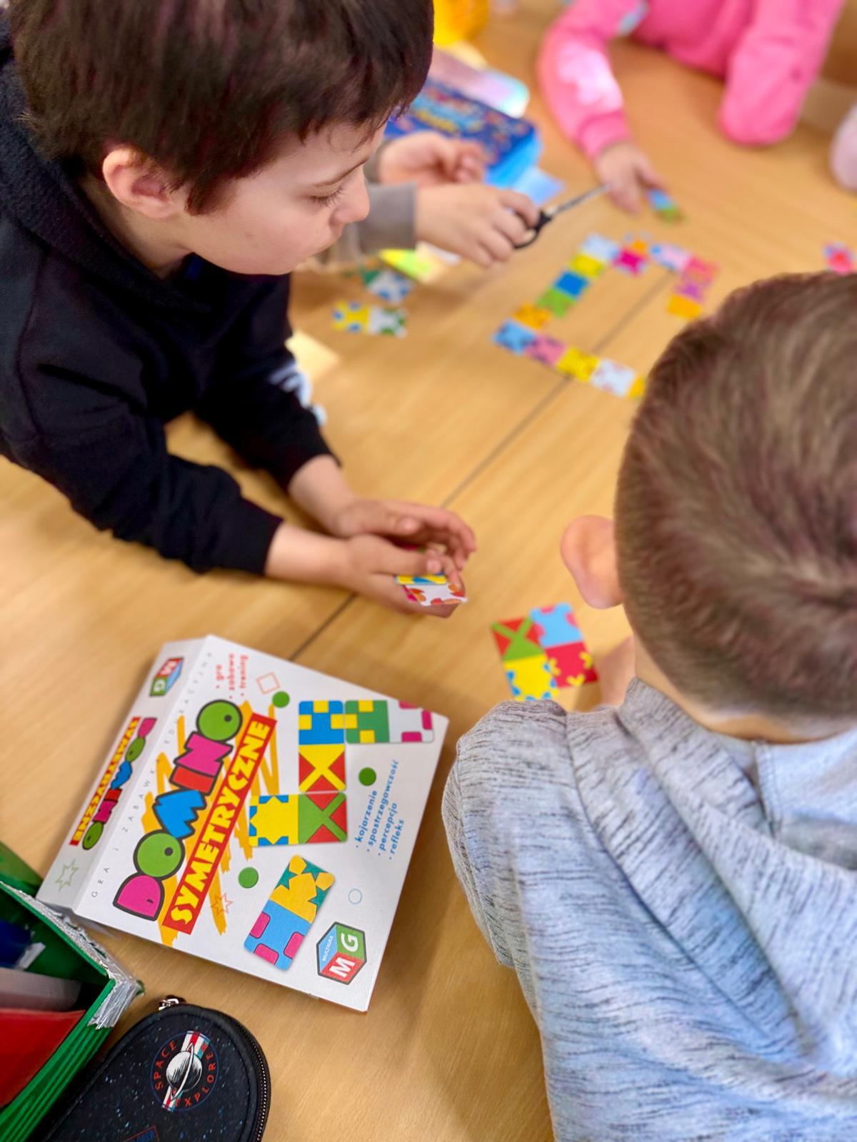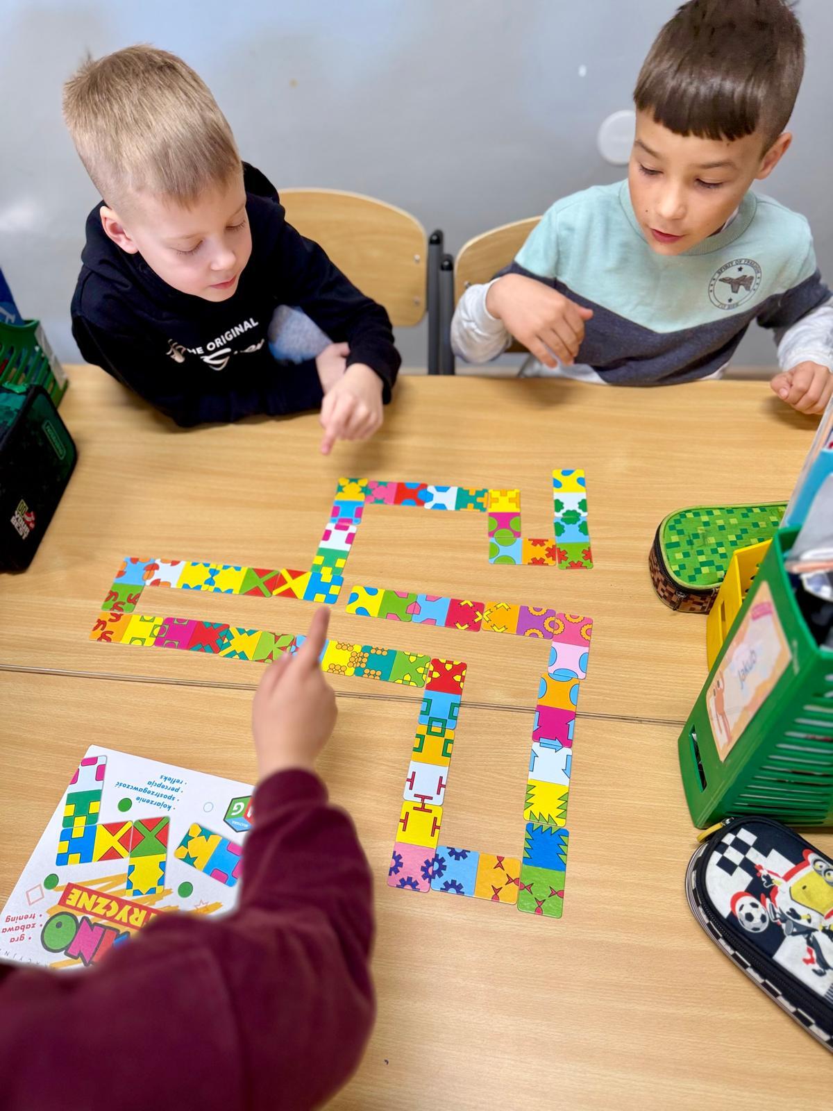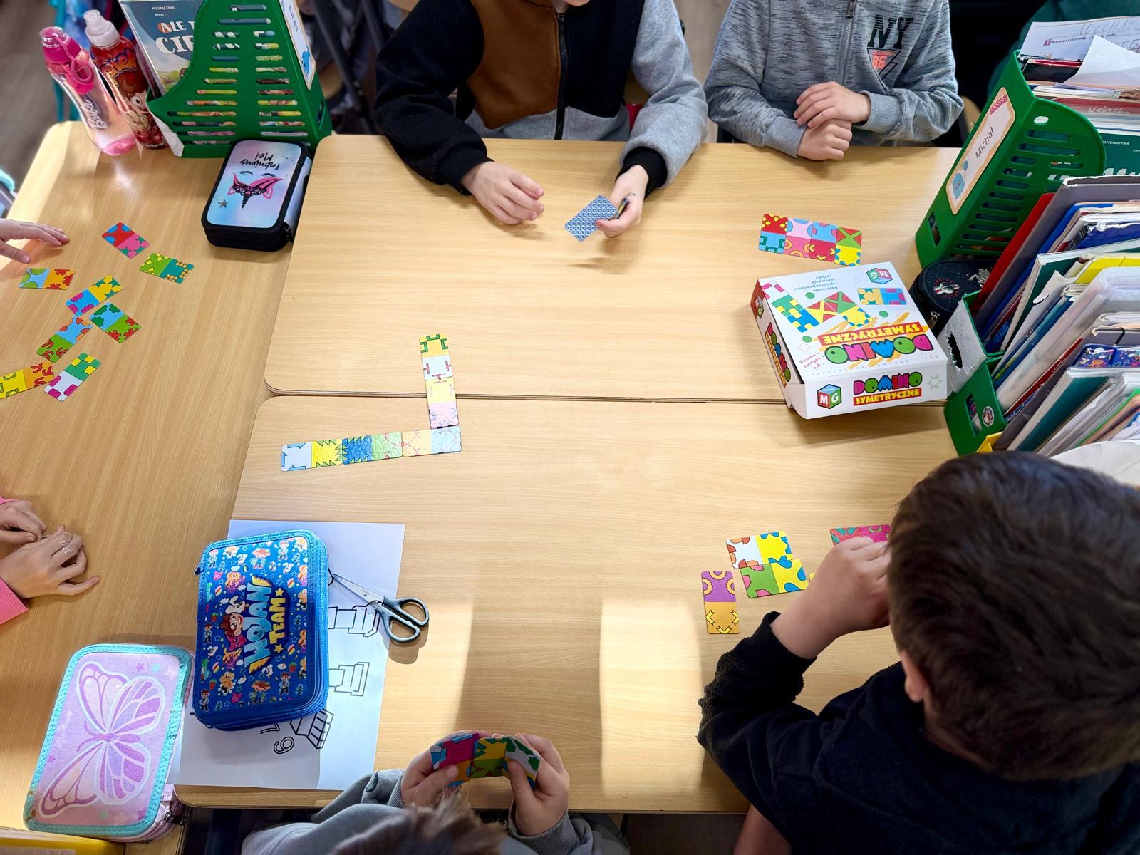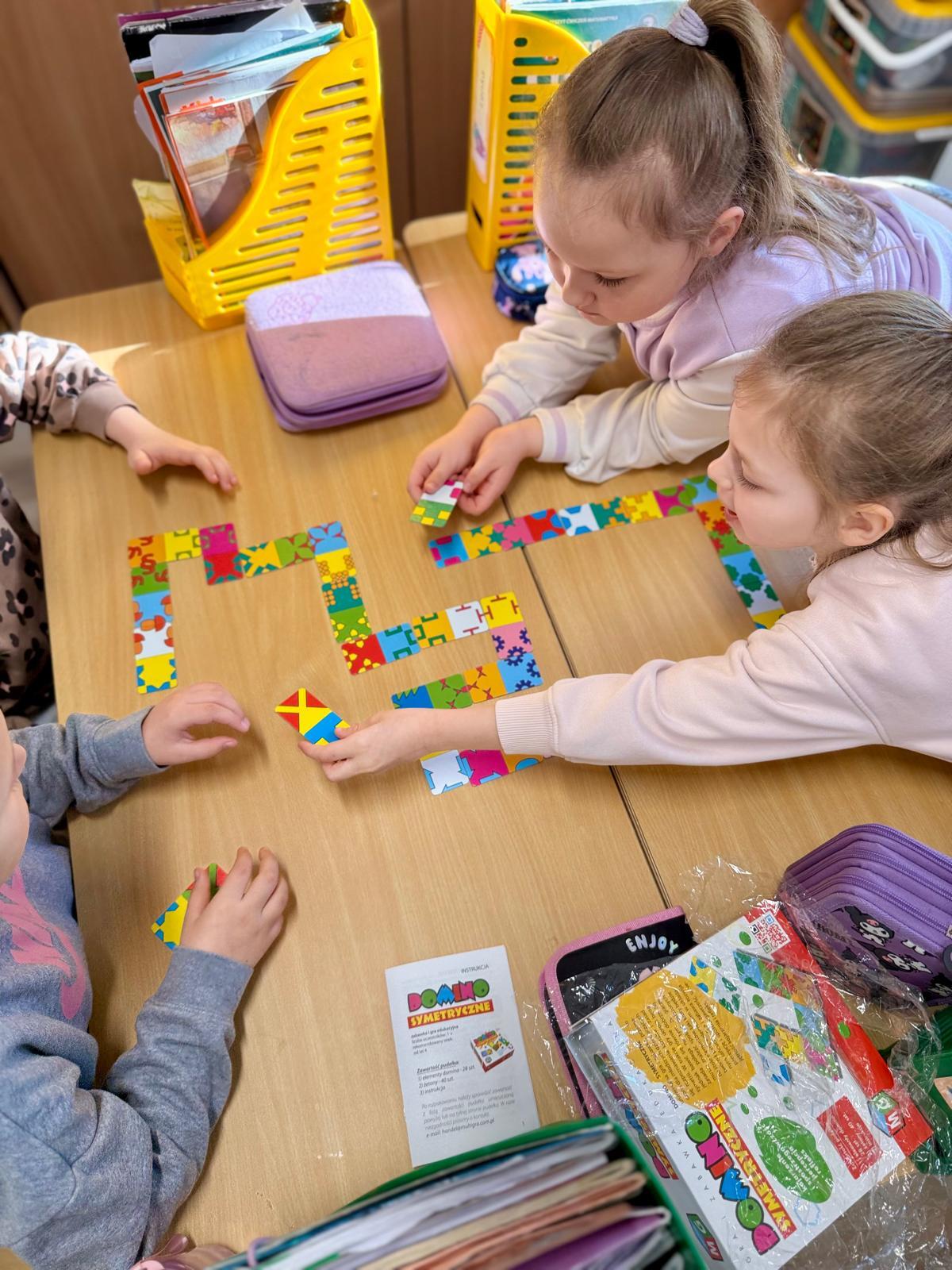 Dzieci pracowały w grupach, wspólnie analizując dostępne elementy i szukając tych, które tworzą symetryczne pary z już ułożonymi częściami łańcucha. Pojawiły się dyskusje, próby, pomyłki i poprawki, a więc wszystko to, co w procesie uczenia się najcenniejsze.