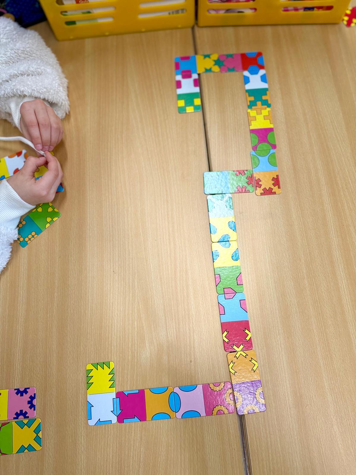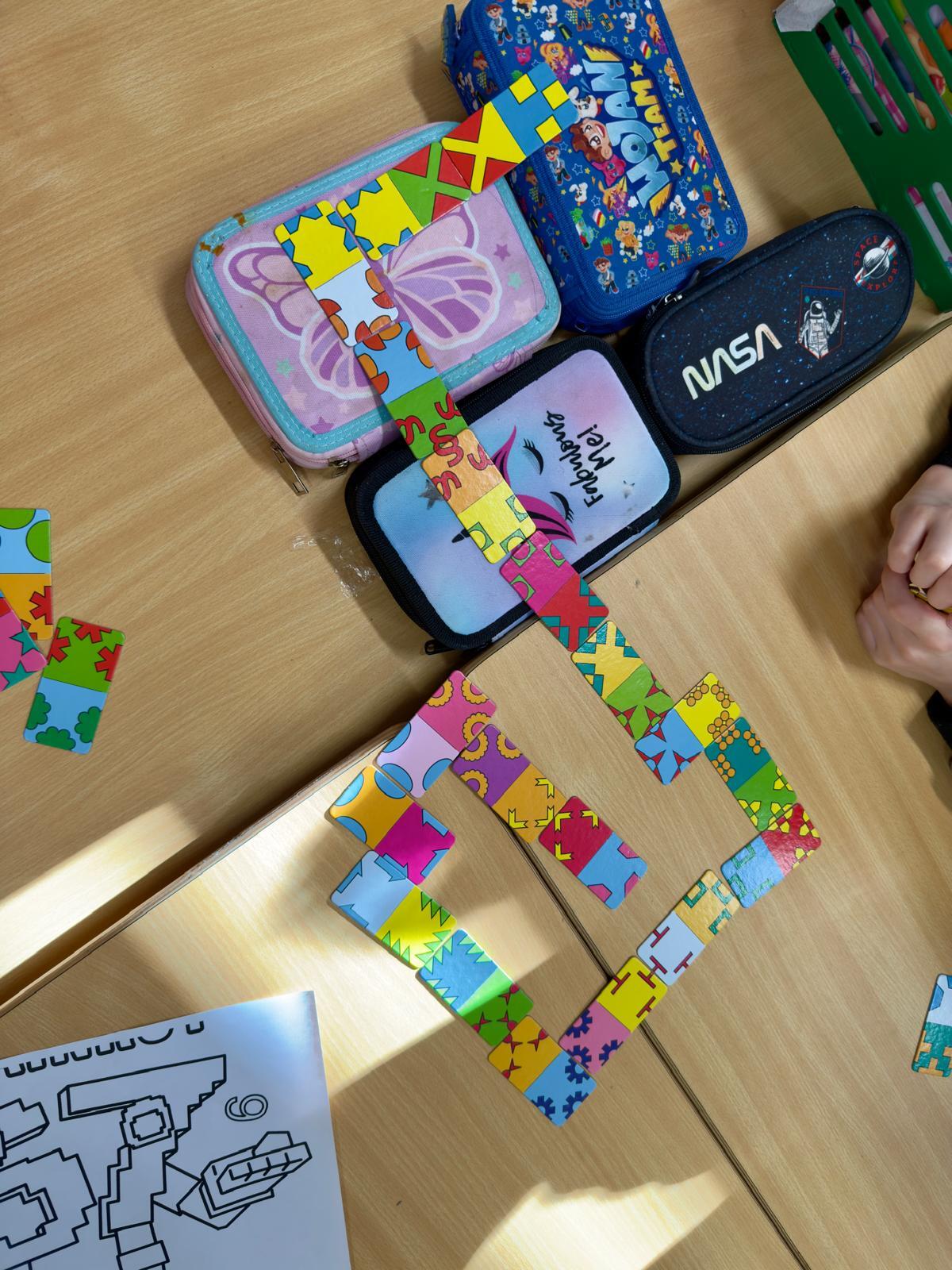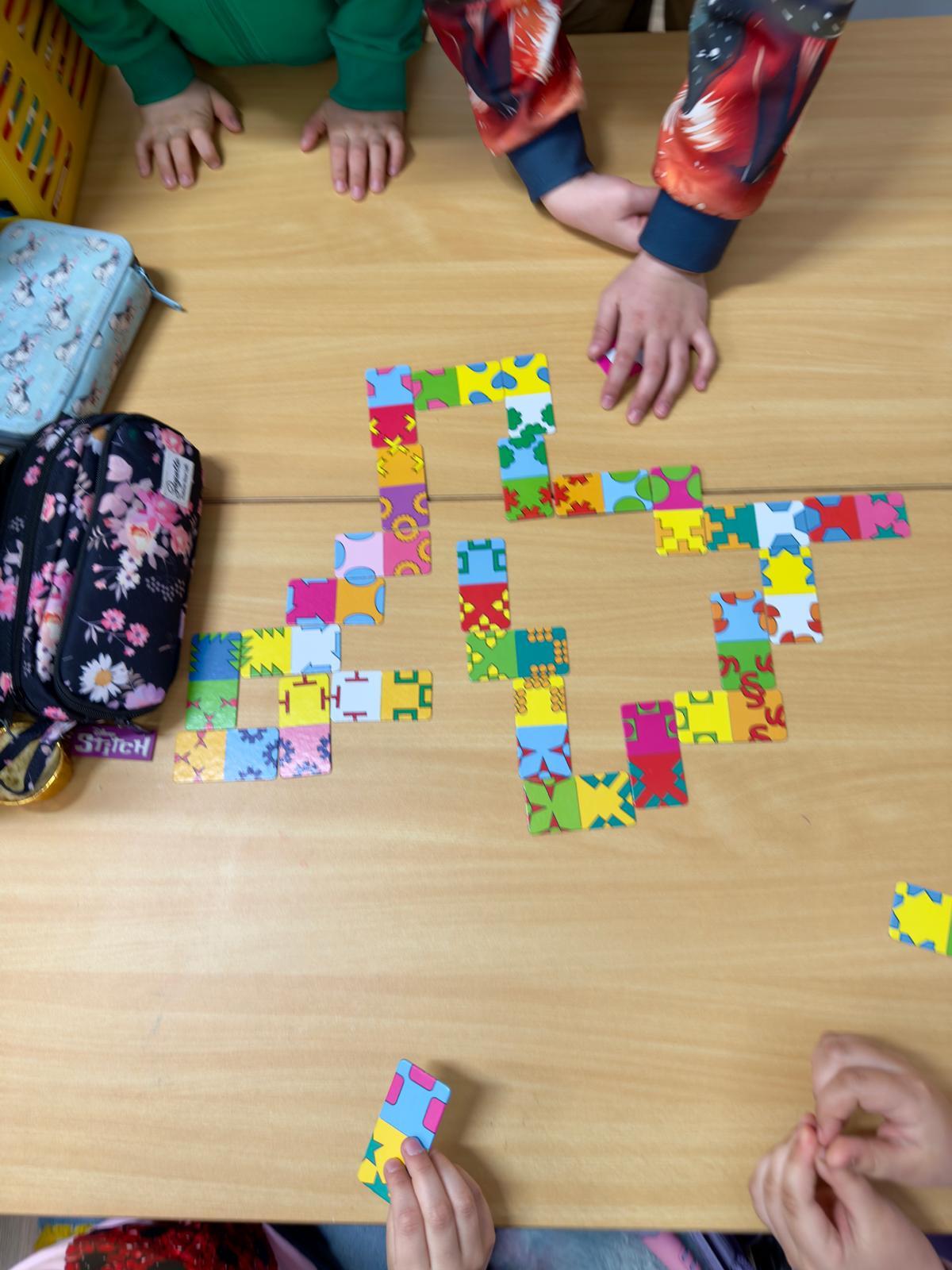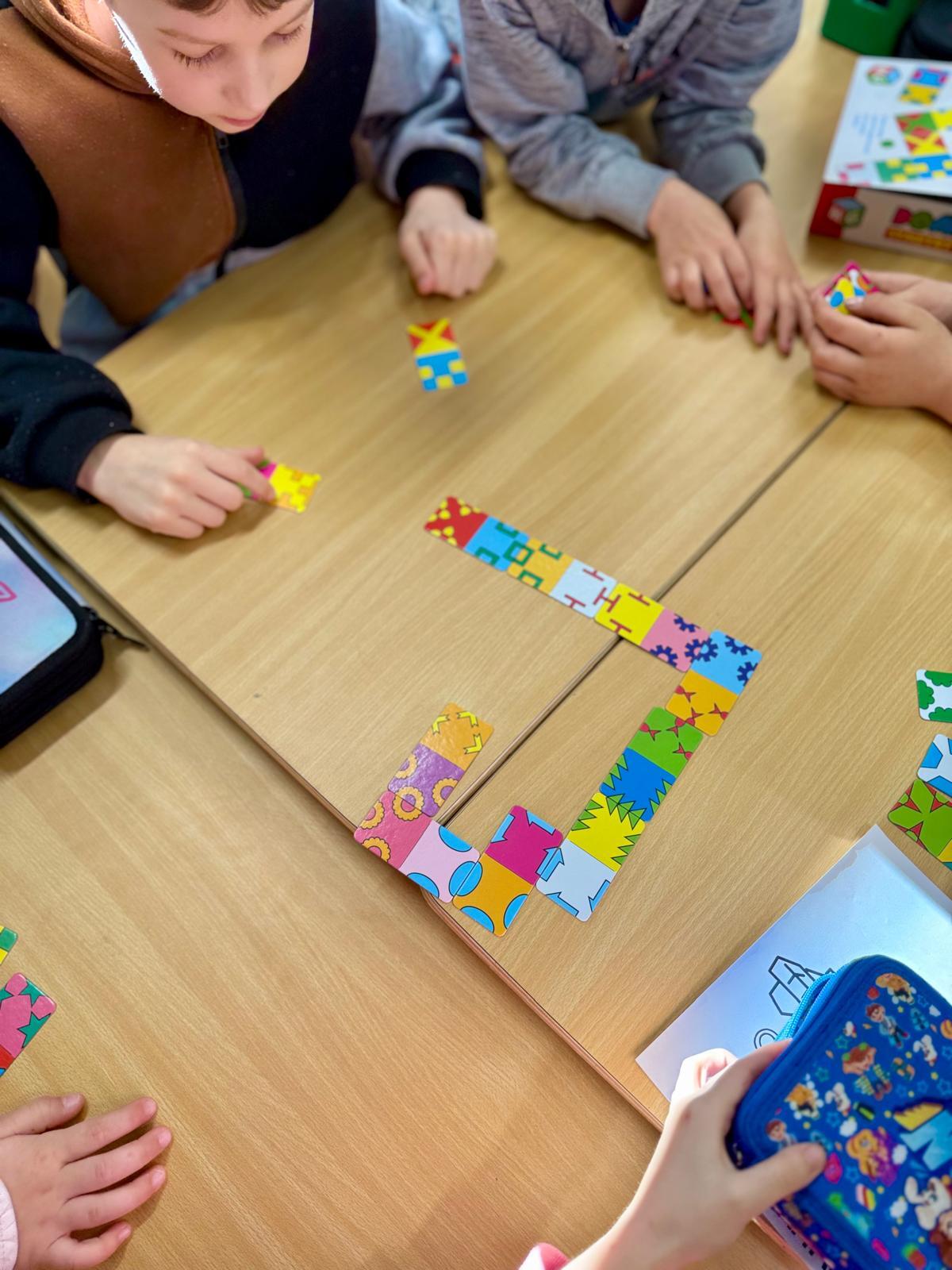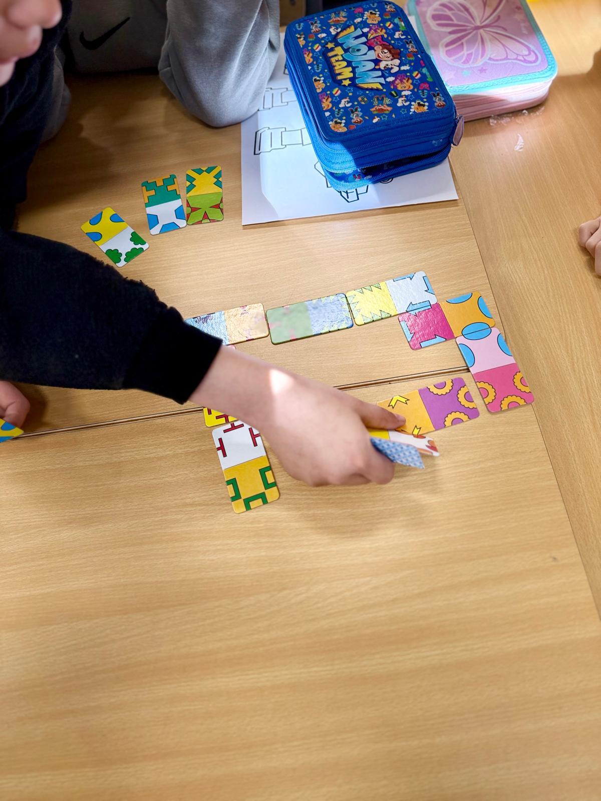 Dzieci pracowały w grupach, wspólnie analizując dostępne elementy i szukając tych, które tworzą symetryczne pary z już ułożonymi częściami łańcucha. Pojawiły się dyskusje, próby, pomyłki i poprawki, a więc wszystko to, co w procesie uczenia się najcenniejsze.