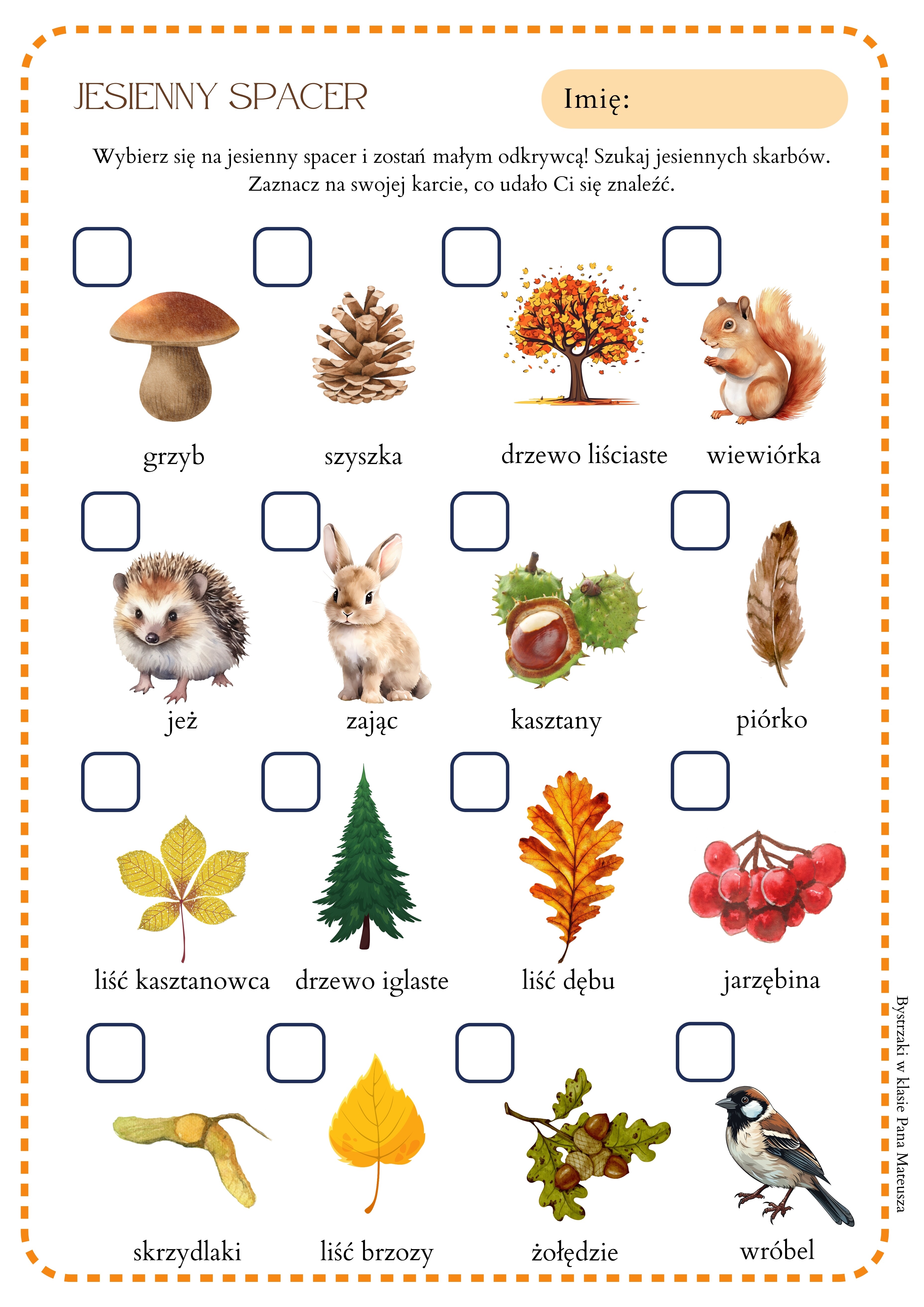 Jesień to niezwykła pora roku – pełna barw, zapachów i małych cudów natury. Jutro wybieram się z moją klasą na jesienny spacer. Razem będziemy szukać jesiennych skarbów: kolorowych liści, kasztanów, żołędzi, skrzydełek klonu czy śladów zwierząt. Wszystko to zaznaczymy na specjalnie przygotowanej karcie pracy, by później podzielić się swoimi odkryciami i wrażeniami.