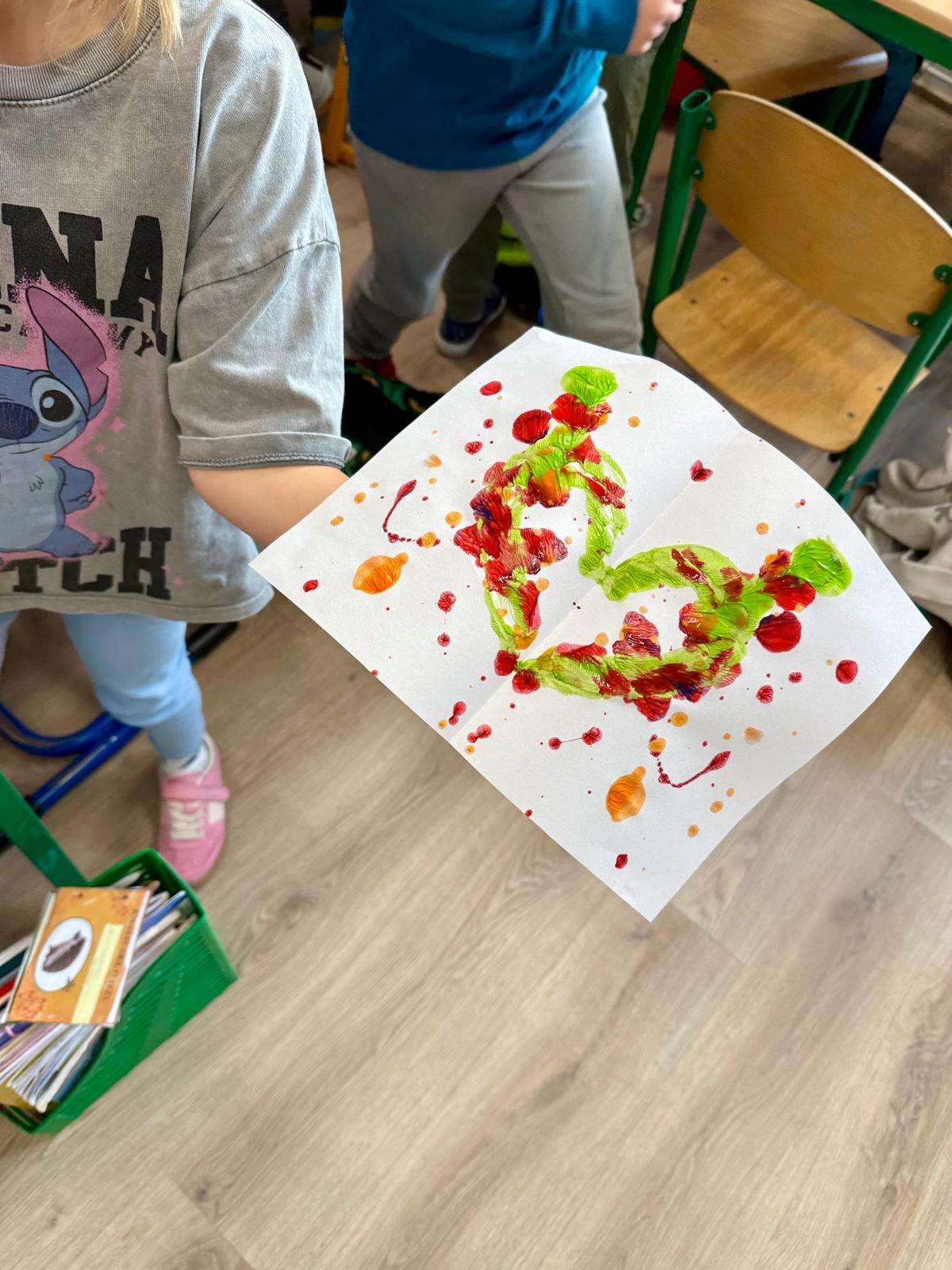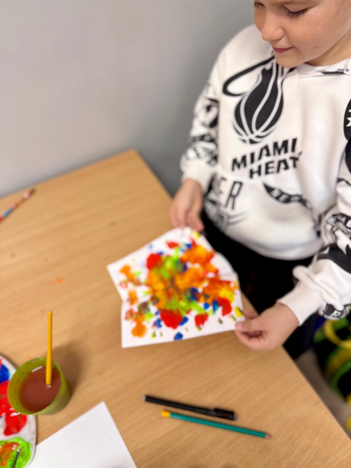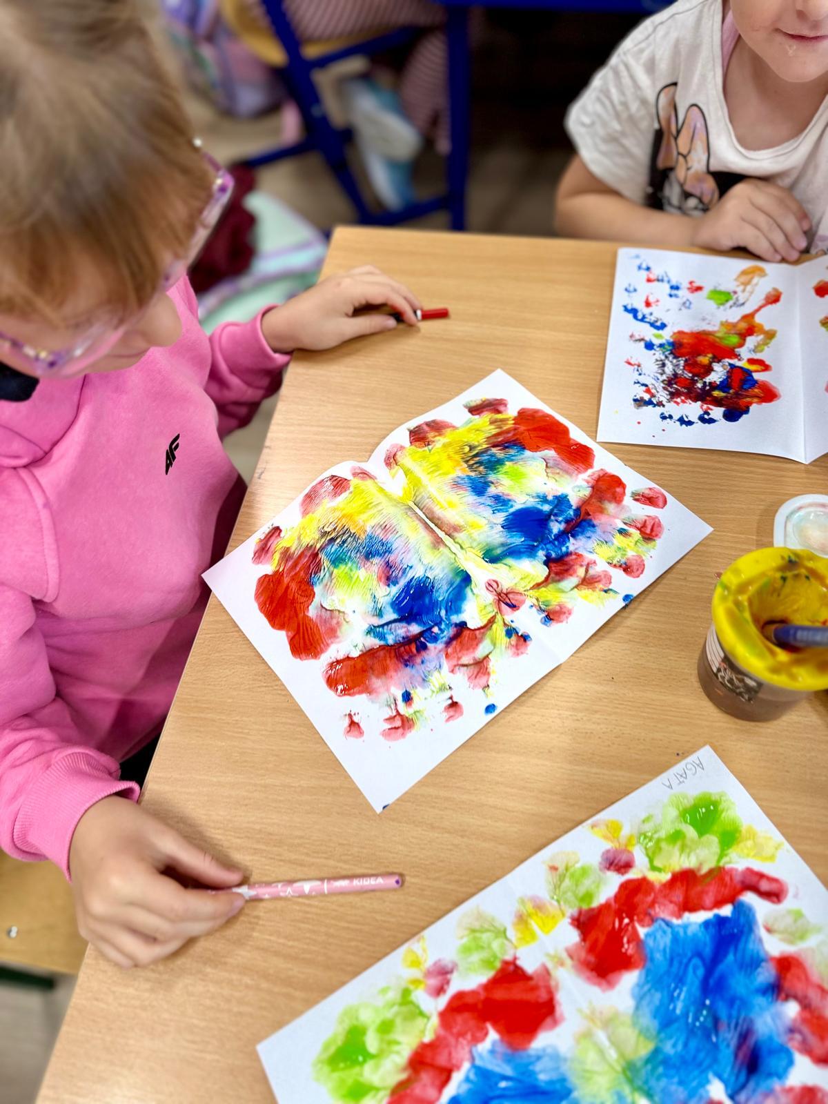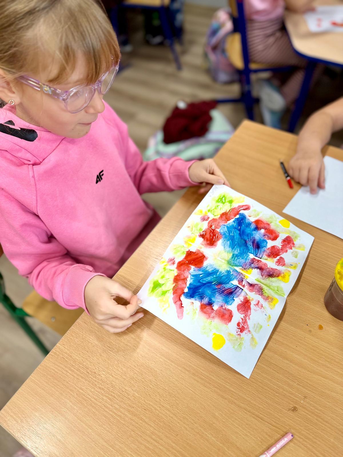 Przy okazji tej artystycznej zabawy wprowadziłem pojęcie osi symetrii. Dzieci same odkryły, że gdy kartkę złoży się na pół, powstaje odbicie lustrzane – dwa identyczne kształty. W ten sposób przekonały się, że matematyka i sztuka mogą się pięknie uzupełniać, a nauka może przyjść naturalnie – bez presji i w pełni radości.