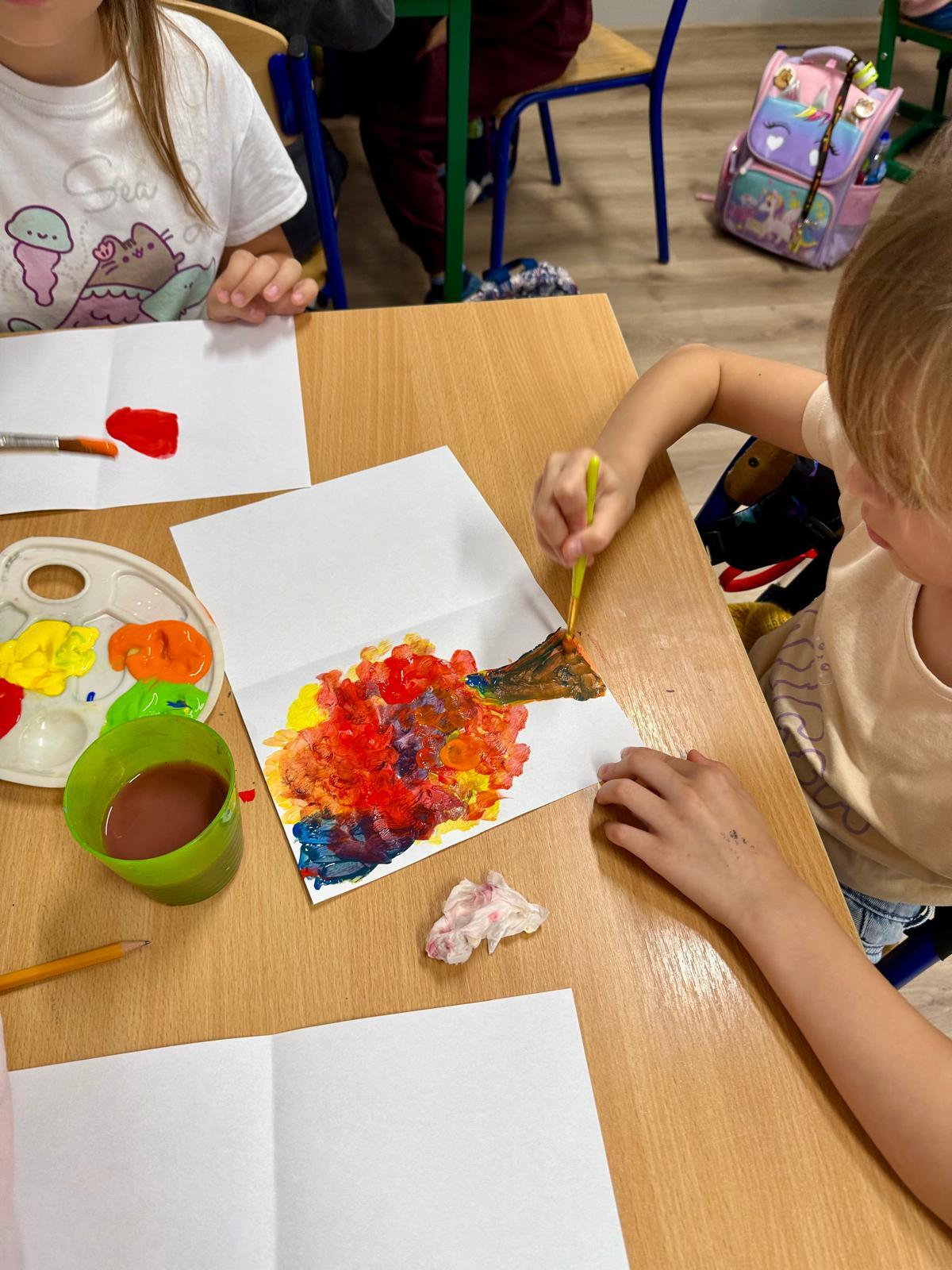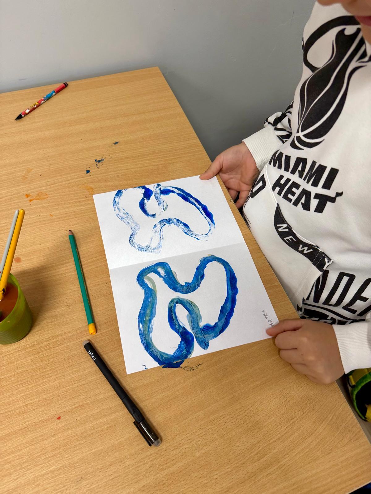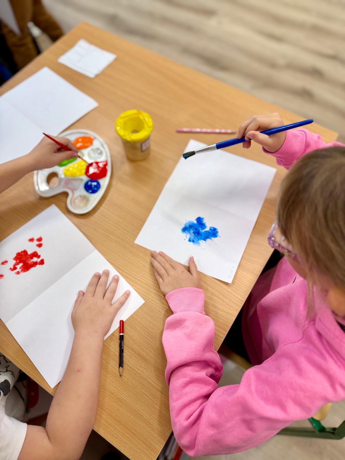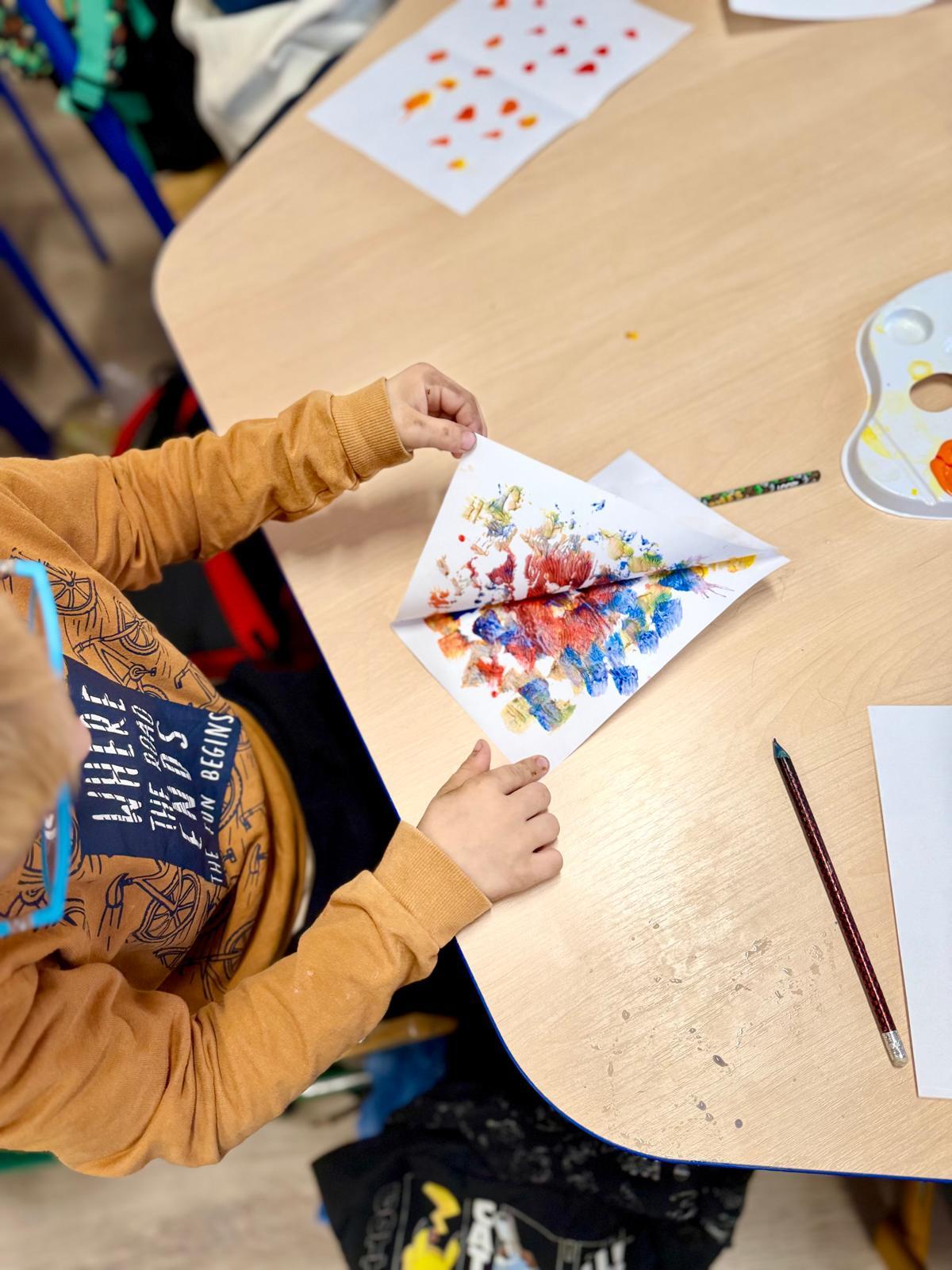 Przy okazji tej artystycznej zabawy wprowadziłem pojęcie osi symetrii. Dzieci same odkryły, że gdy kartkę złoży się na pół, powstaje odbicie lustrzane – dwa identyczne kształty. W ten sposób przekonały się, że matematyka i sztuka mogą się pięknie uzupełniać, a nauka może przyjść naturalnie – bez presji i w pełni radości.