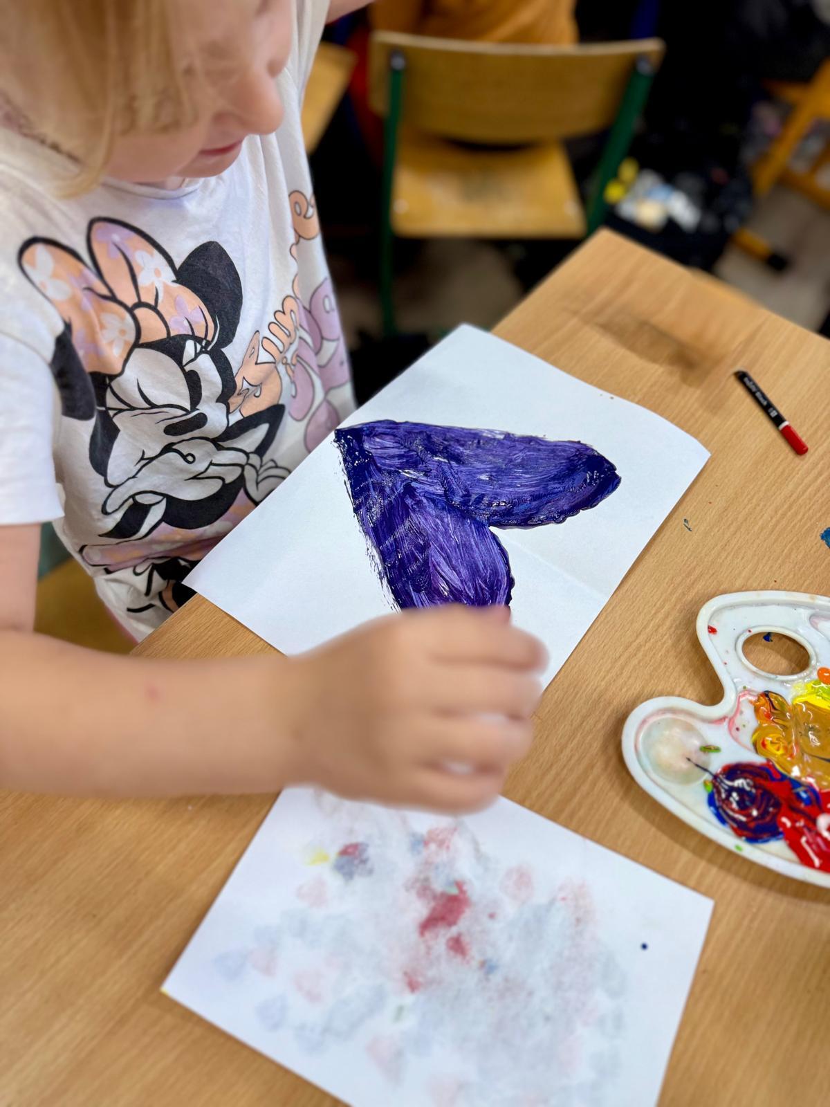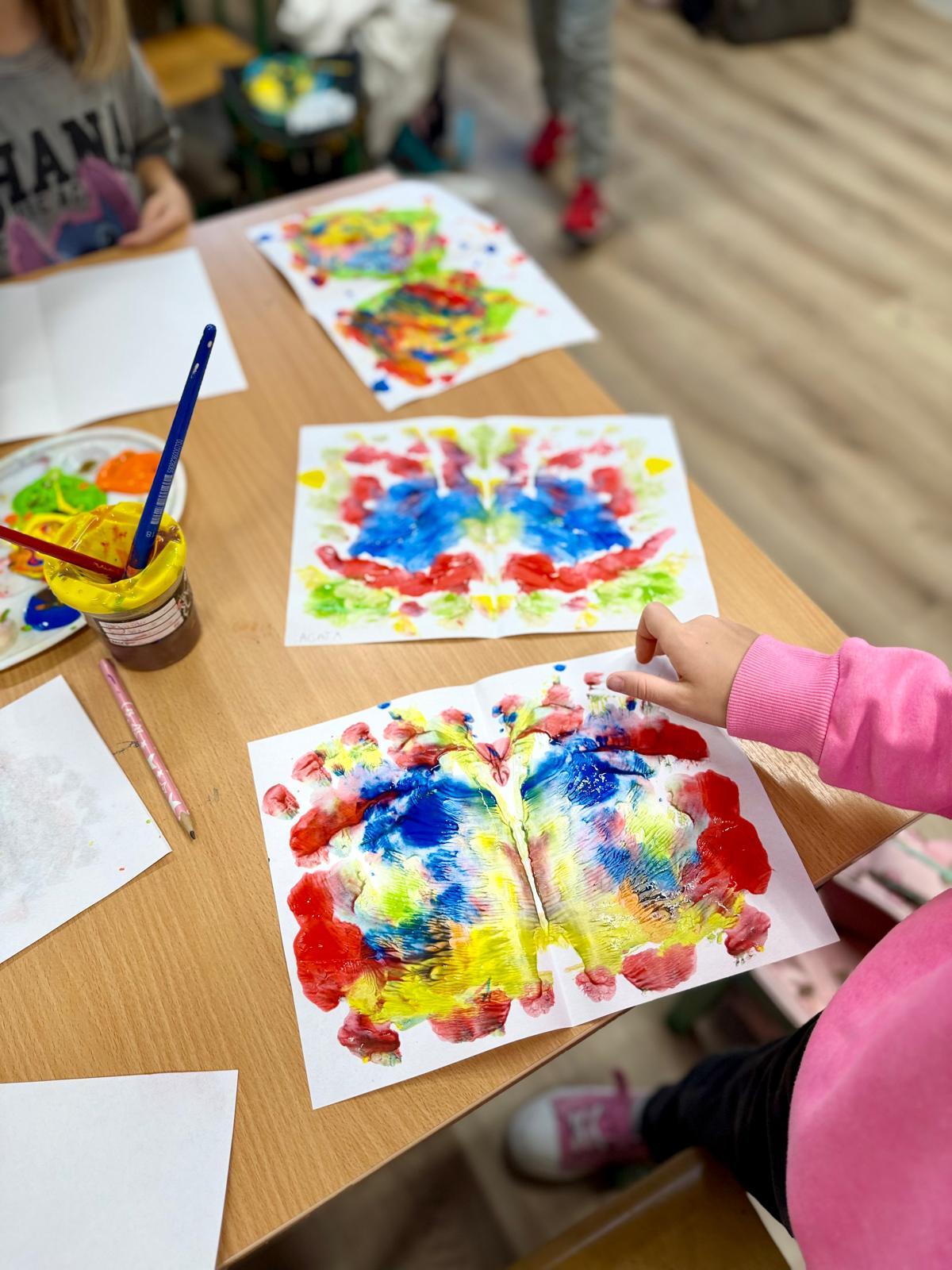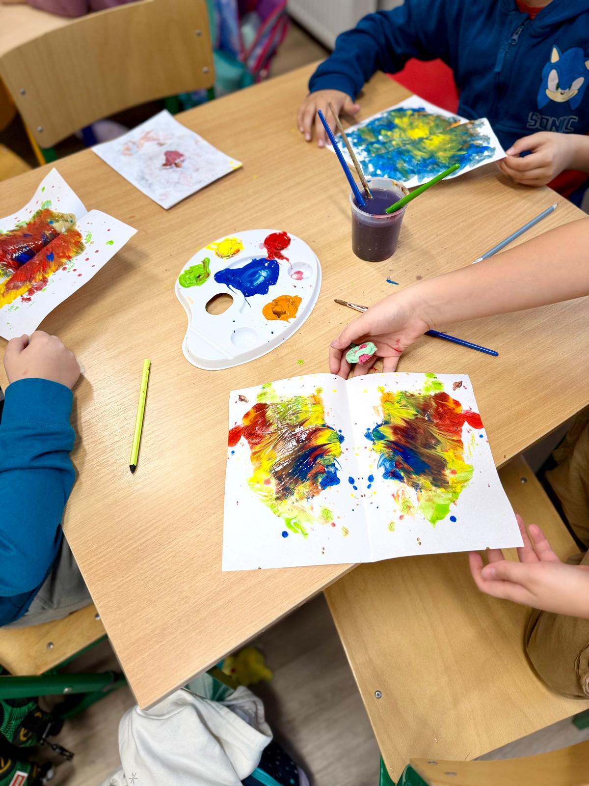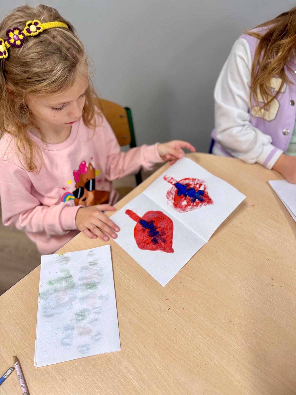 Zamiast obawiać się plam z atramentu, potraktowaliśmy je jak okazję do zabawy i odkrywania. Każde dziecko zrobiło swój własny kleks, złożyło kartkę na pół i z zachwytem obserwowało, co ukaże się po jej rozłożeniu. Z prostych plam powstawały motyle, drzewa.