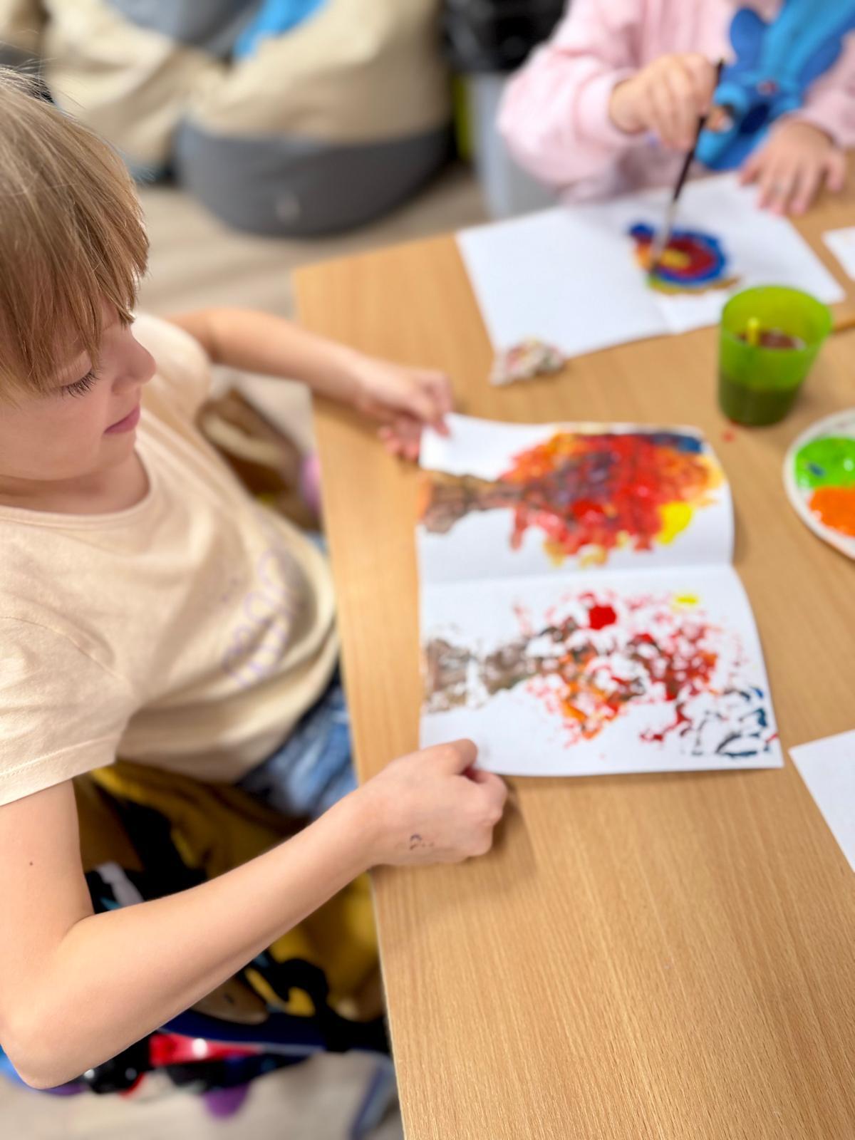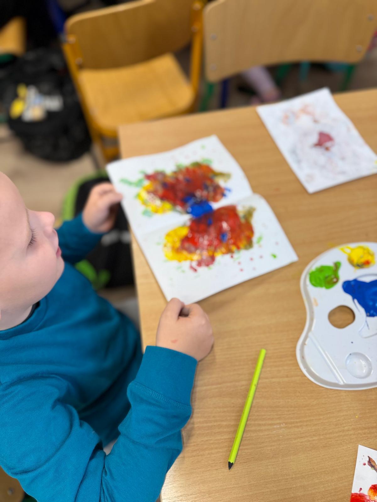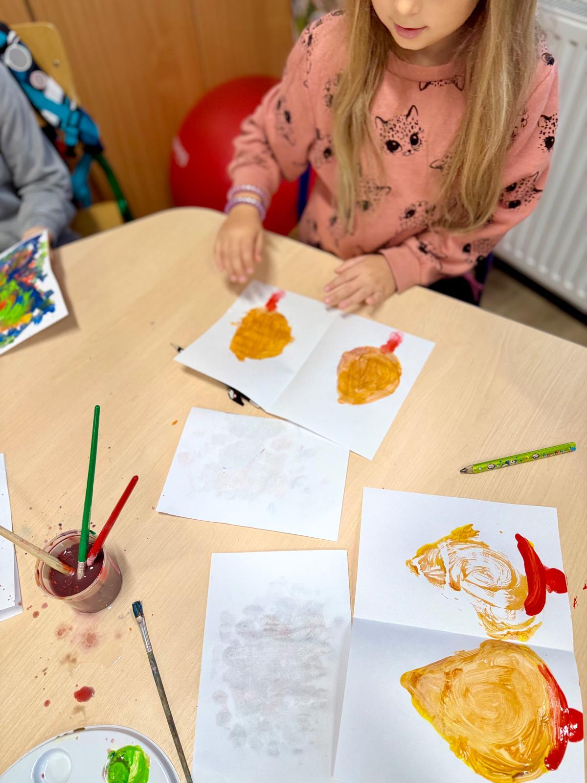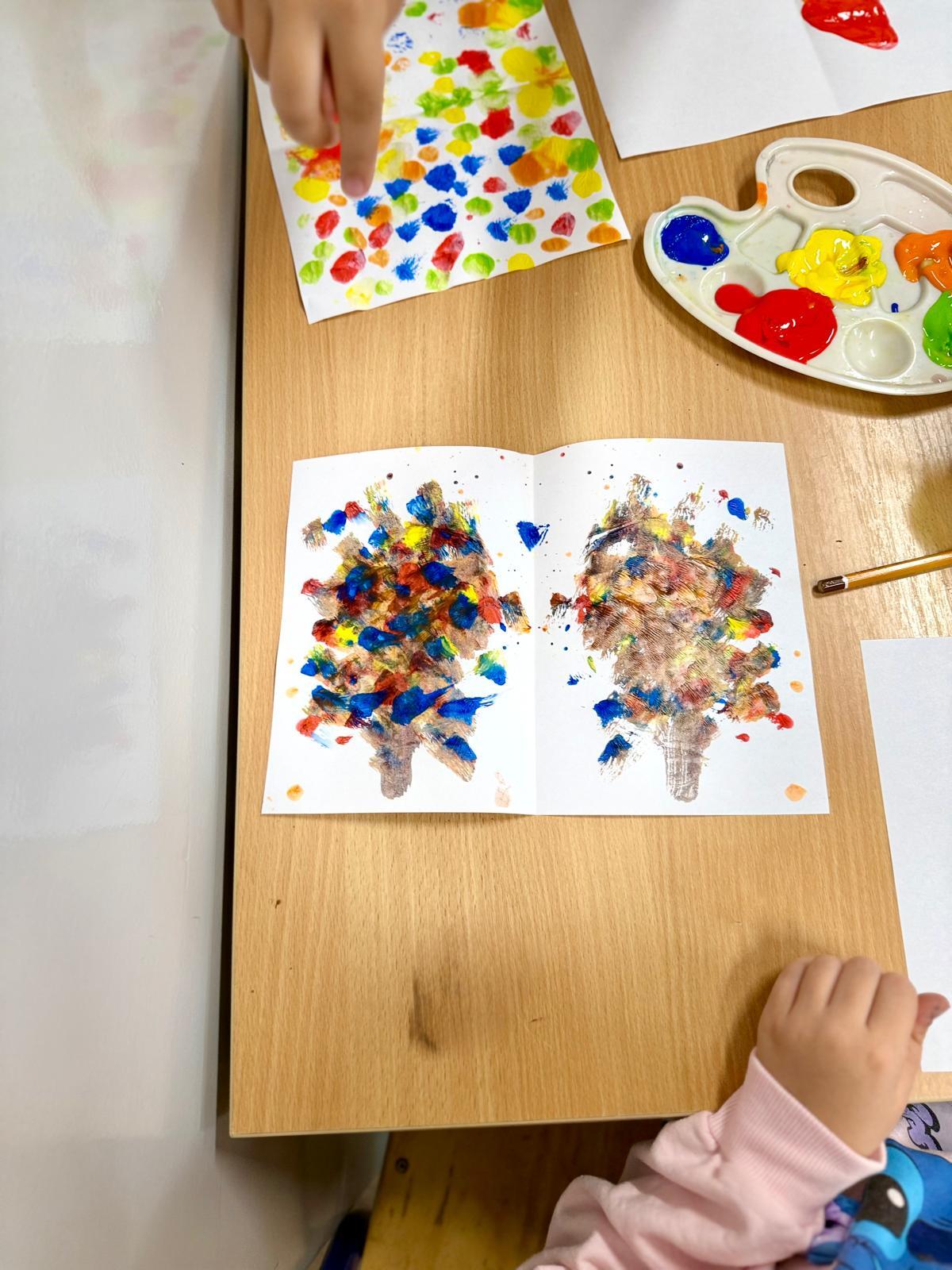 Zamiast obawiać się plam z atramentu, potraktowaliśmy je jak okazję do zabawy i odkrywania. Każde dziecko zrobiło swój własny kleks, złożyło kartkę na pół i z zachwytem obserwowało, co ukaże się po jej rozłożeniu. Z prostych plam powstawały motyle, drzewa.