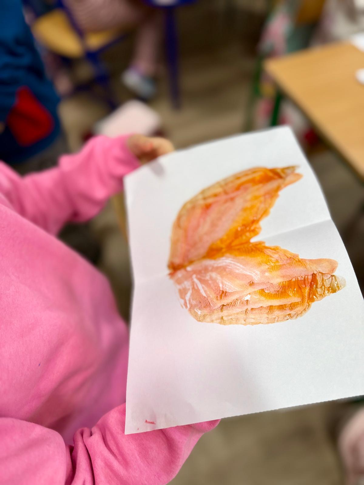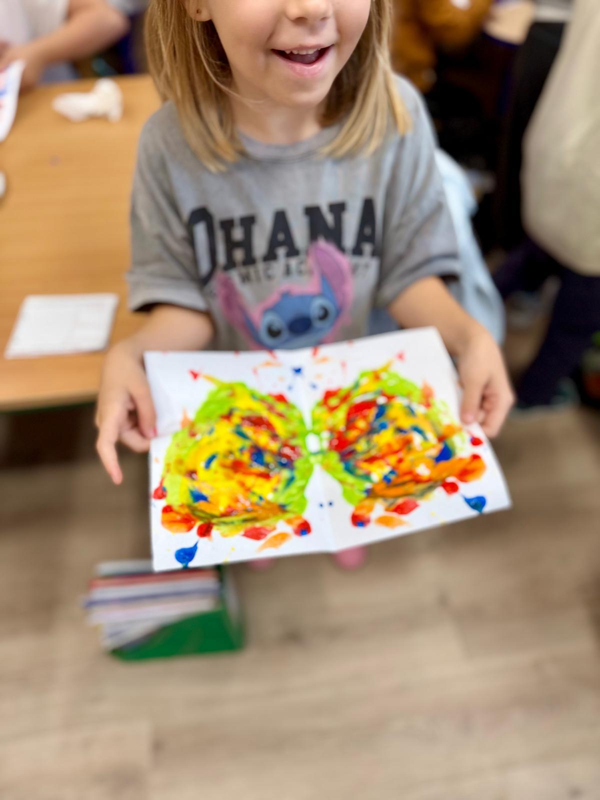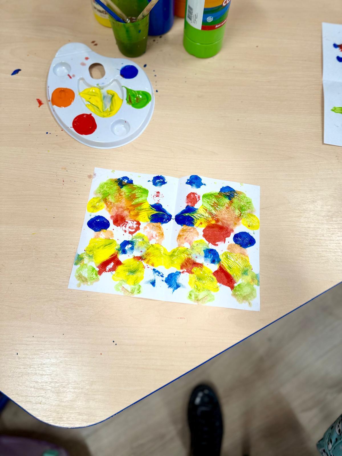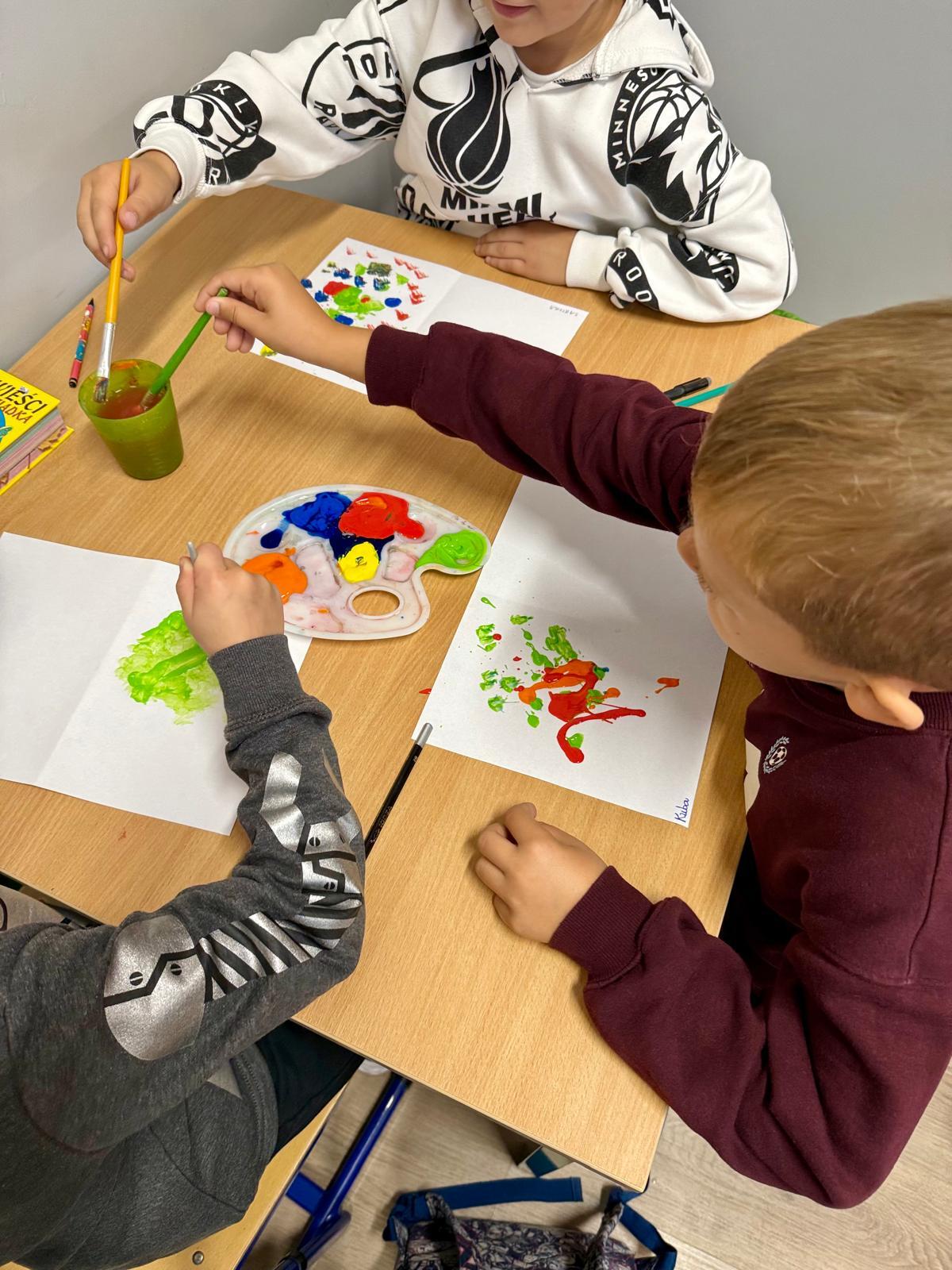 Zamiast obawiać się plam z atramentu, potraktowaliśmy je jak okazję do zabawy i odkrywania. Każde dziecko zrobiło swój własny kleks, złożyło kartkę na pół i z zachwytem obserwowało, co ukaże się po jej rozłożeniu. Z prostych plam powstawały motyle, drzewa.