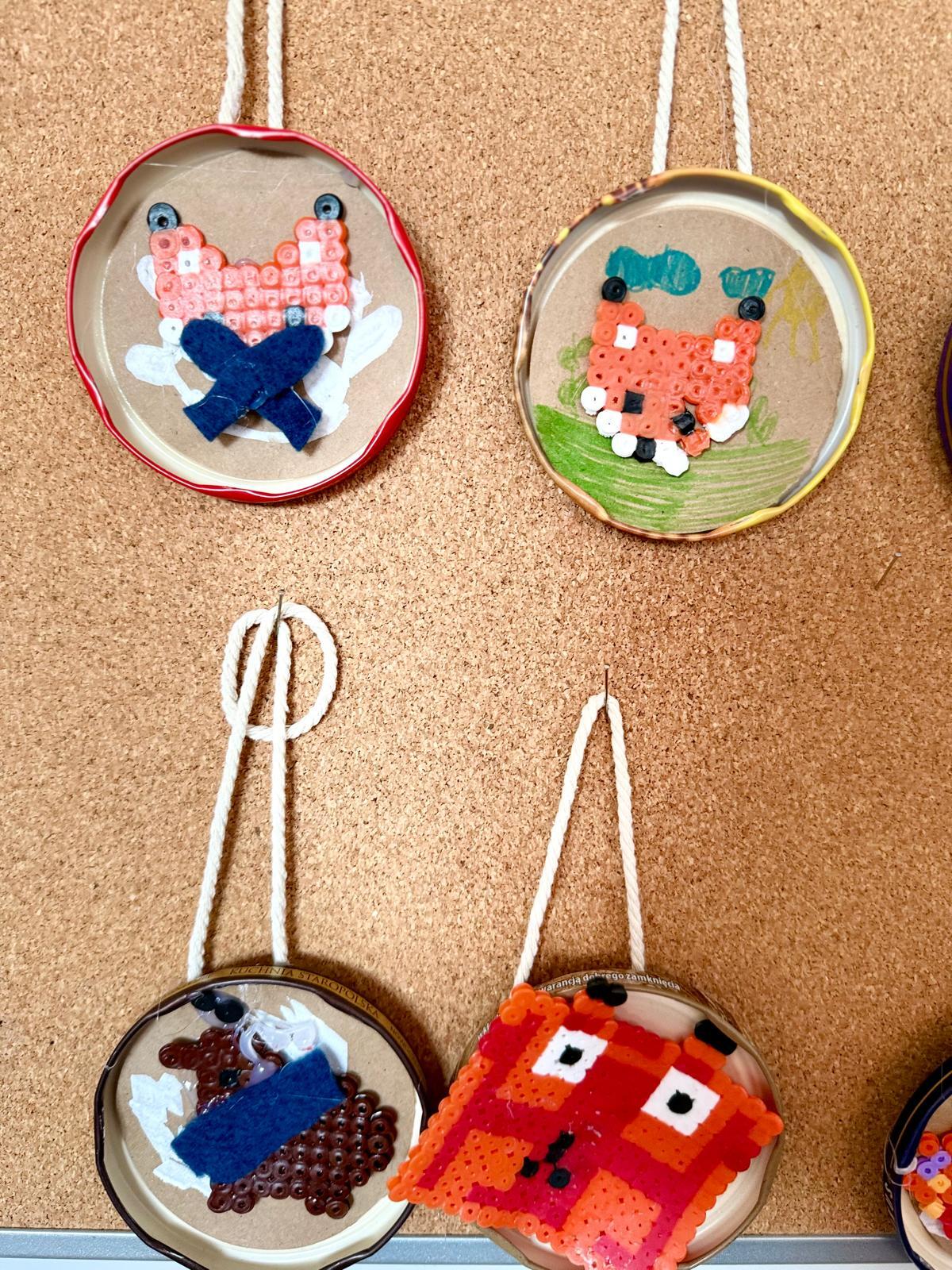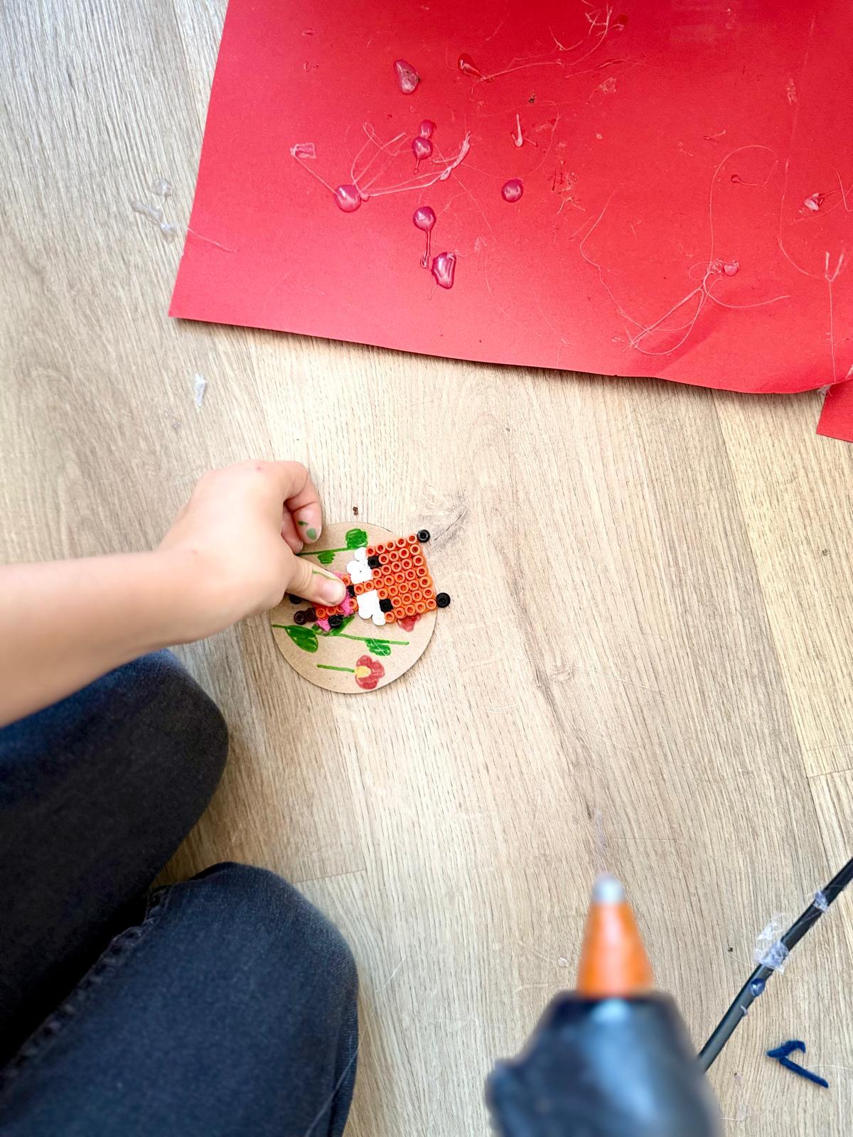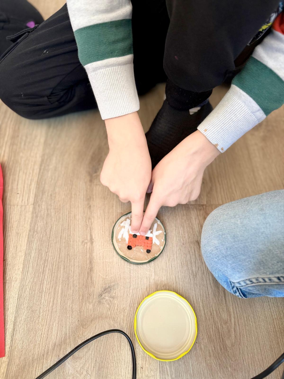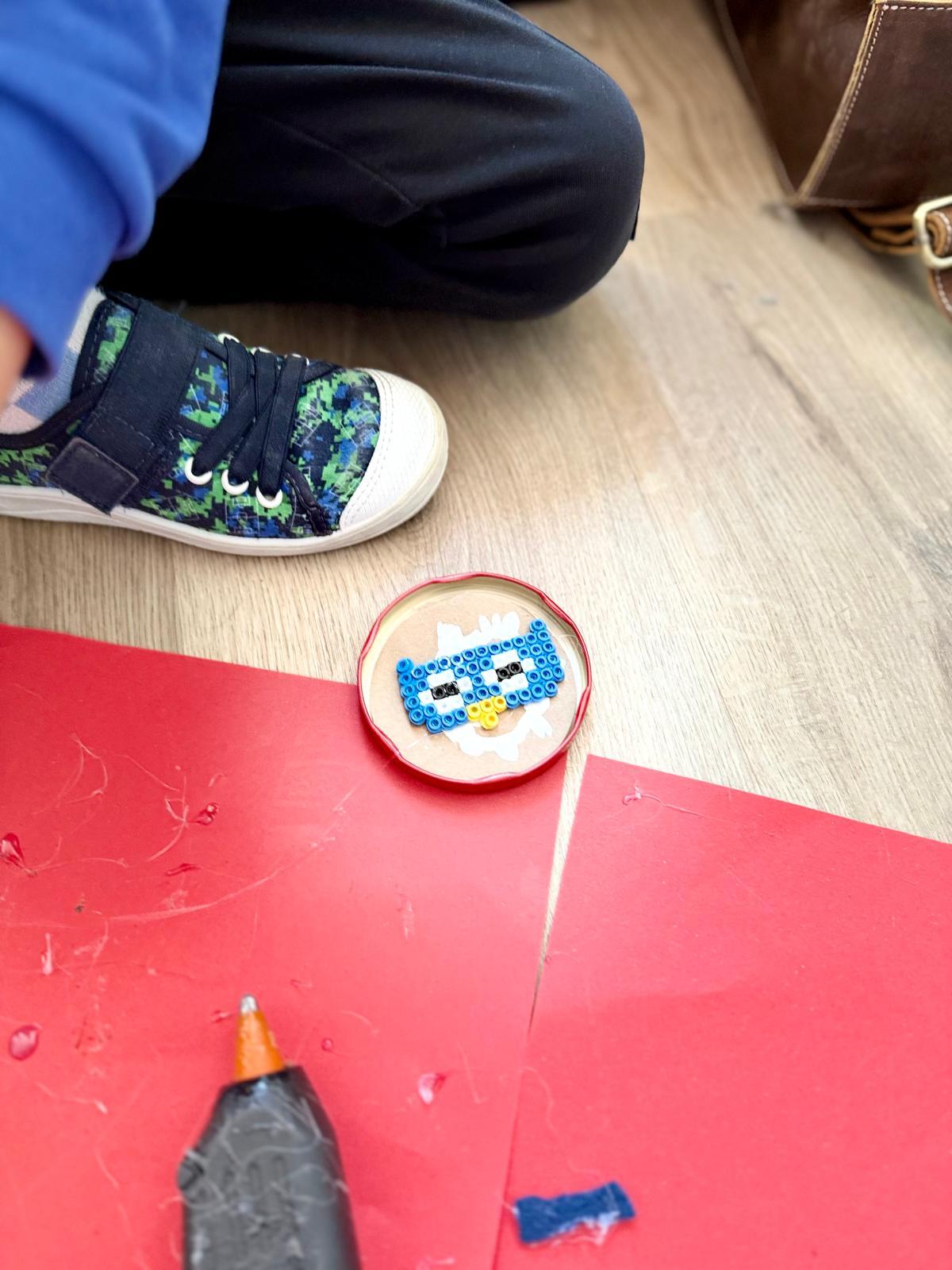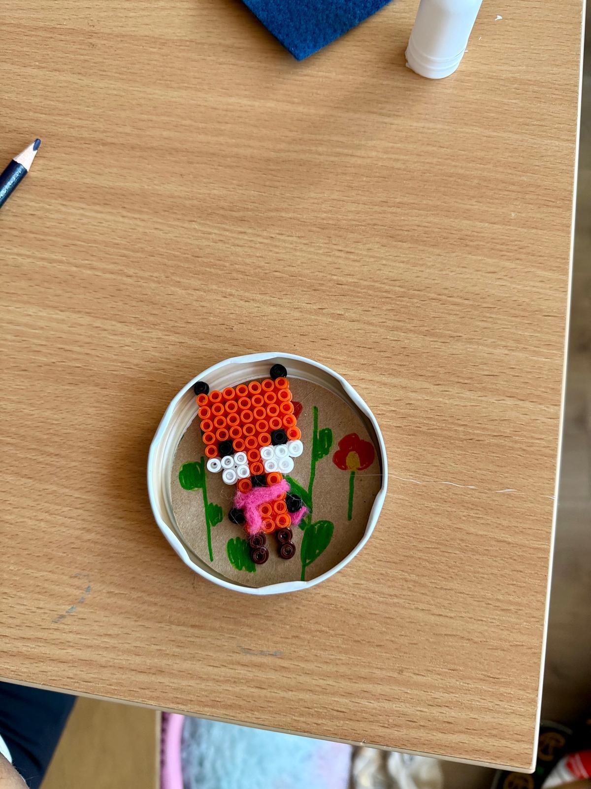 Podczas gdy ja prasowałem koralikowe figurki, dzieci zajęły się ozdabianiem koła wyciętego z szarego papieru. Białym pisakiem tworzyły na nim wzory i faktury, rozwijając koordynację wzrokowo-ruchową oraz poczucie estetyki i kompozycji. Następnie gotowe koła zostały przyklejone do nakrętek od słoików, a do nich trafiły małe koralikowe zwierzątka.