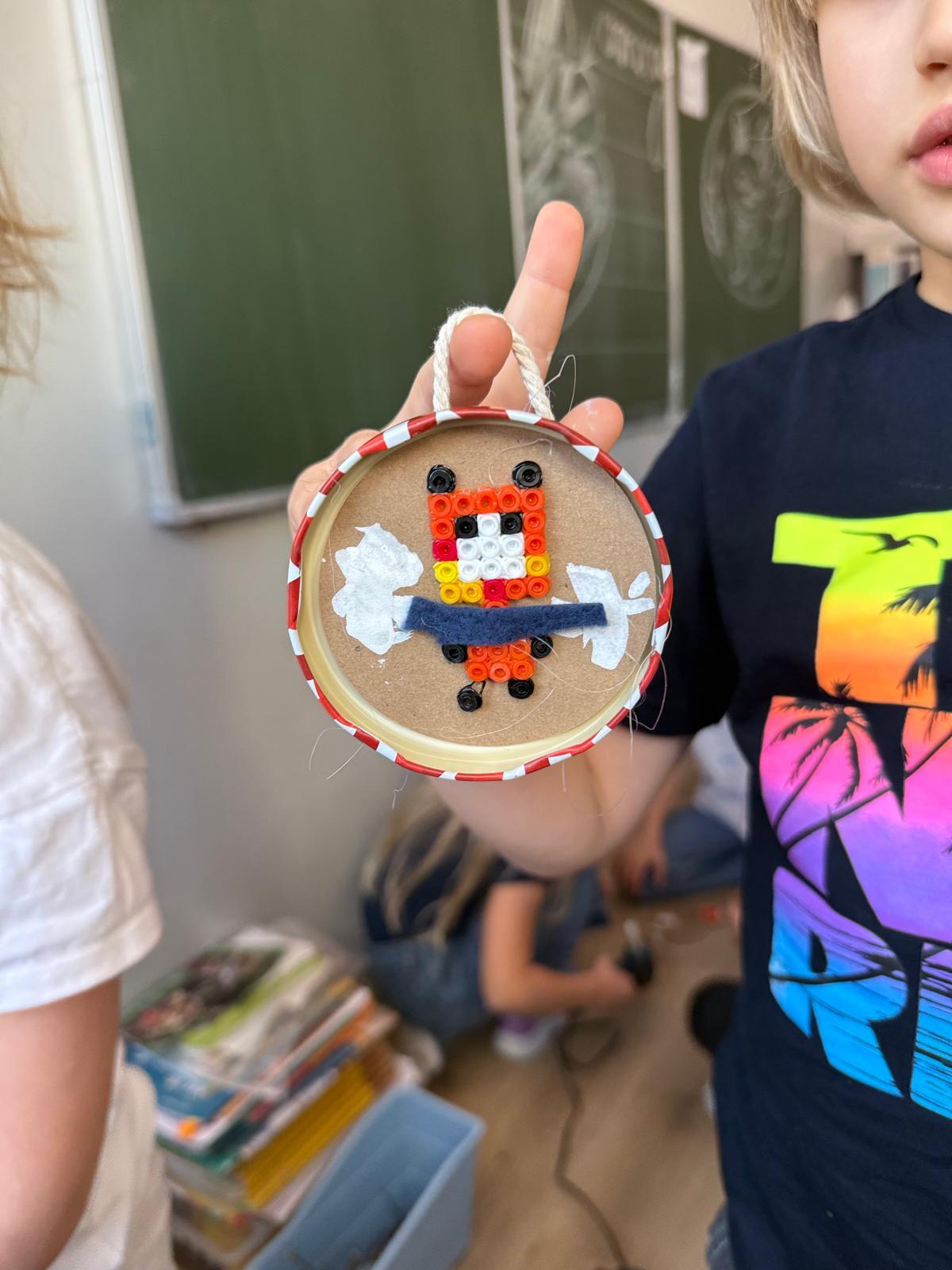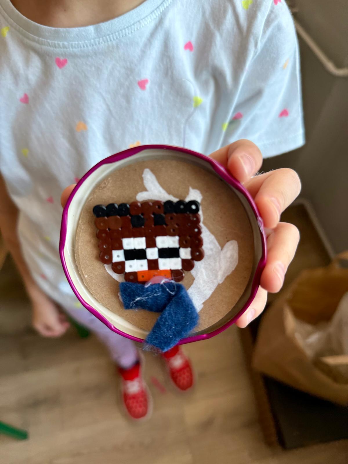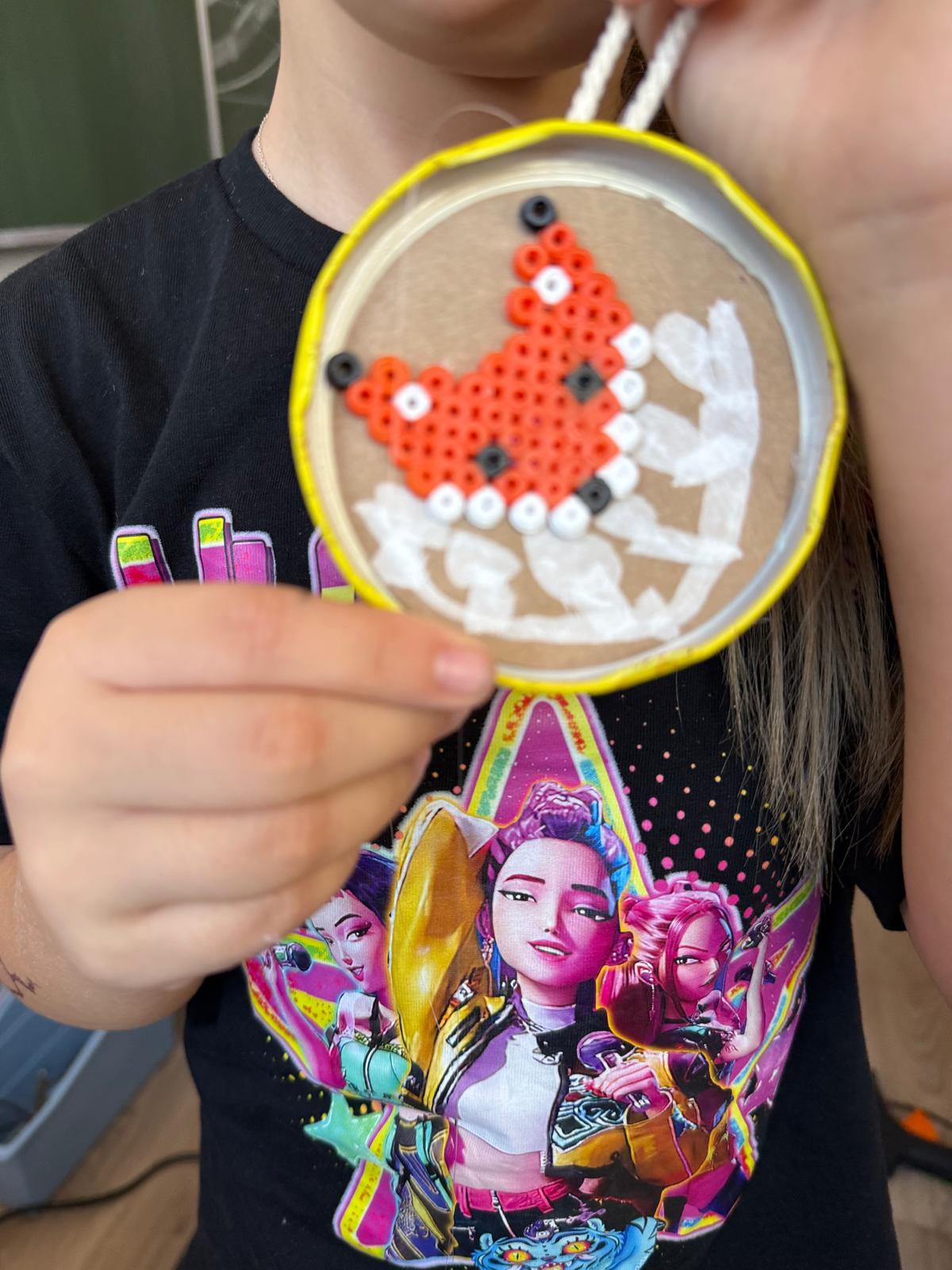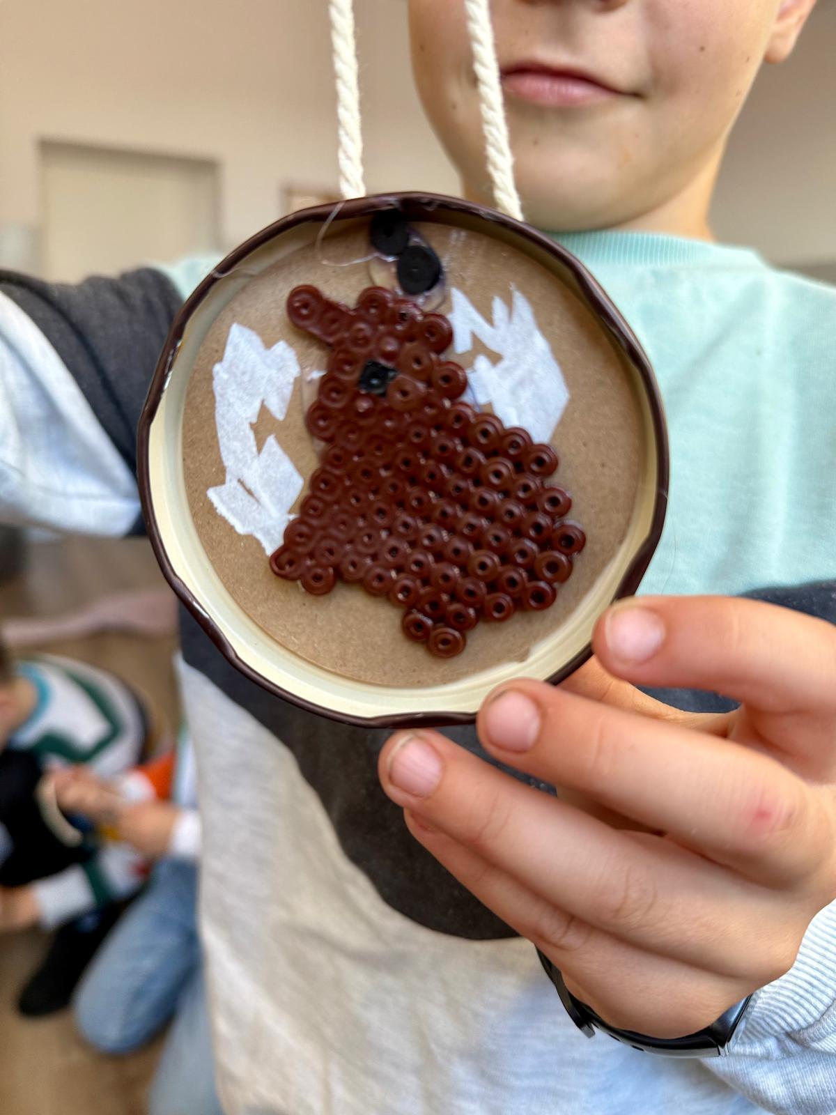 Podczas gdy ja prasowałem koralikowe figurki, dzieci zajęły się ozdabianiem koła wyciętego z szarego papieru. Białym pisakiem tworzyły na nim wzory i faktury, rozwijając koordynację wzrokowo-ruchową oraz poczucie estetyki i kompozycji. Następnie gotowe koła zostały przyklejone do nakrętek od słoików, a do nich trafiły małe koralikowe zwierzątka.