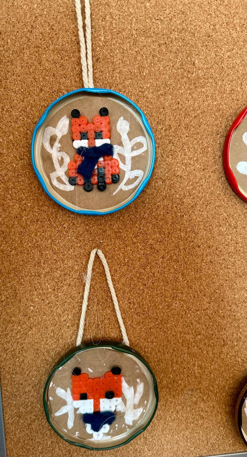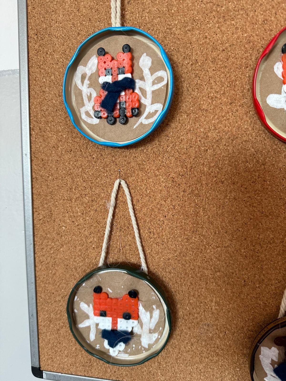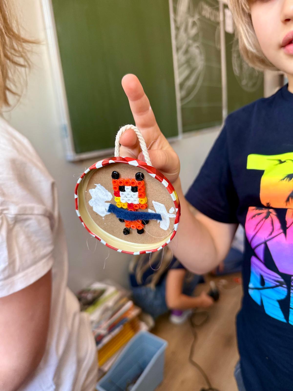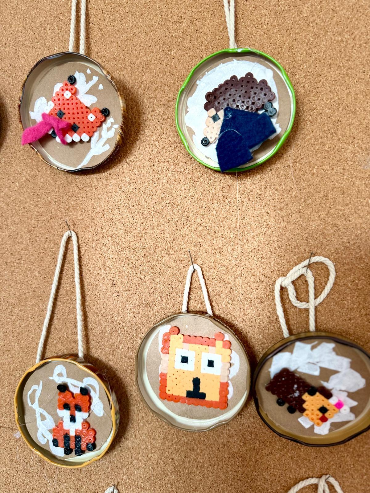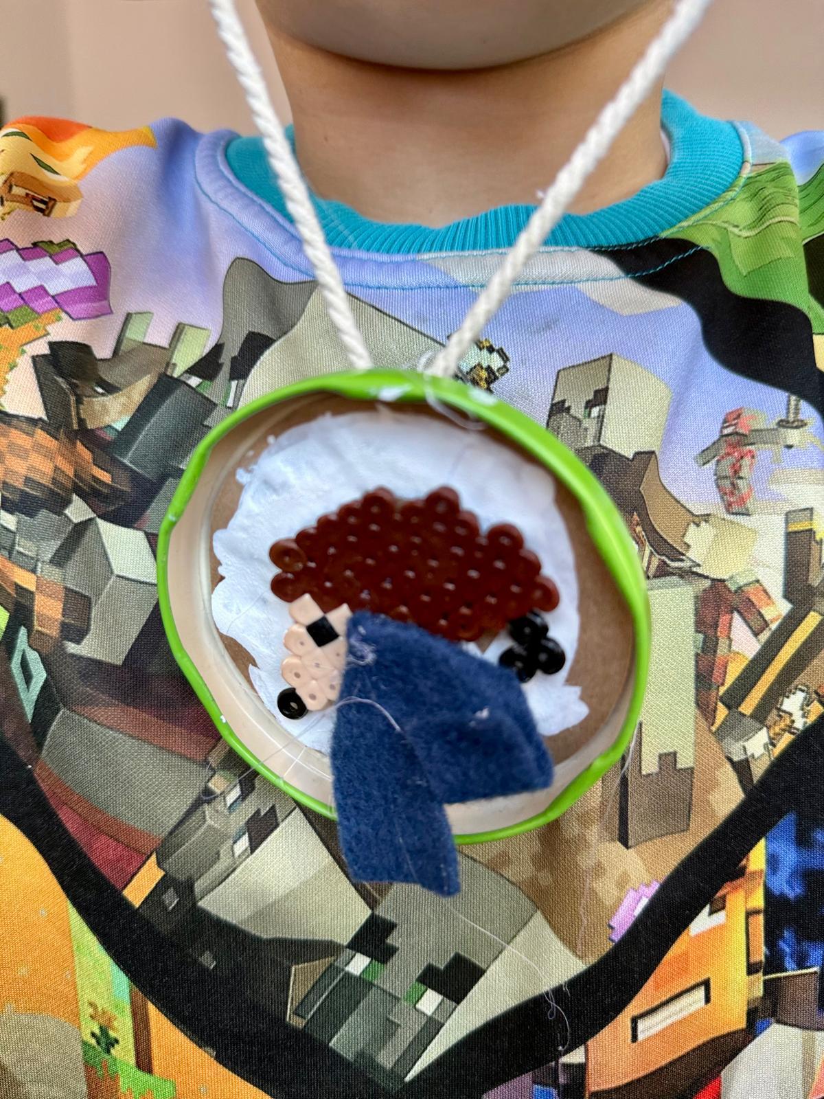 Podczas gdy ja prasowałem koralikowe figurki, dzieci zajęły się ozdabianiem koła wyciętego z szarego papieru. Białym pisakiem tworzyły na nim wzory i faktury, rozwijając koordynację wzrokowo-ruchową oraz poczucie estetyki i kompozycji. Następnie gotowe koła zostały przyklejone do nakrętek od słoików, a do nich trafiły małe koralikowe zwierzątka.