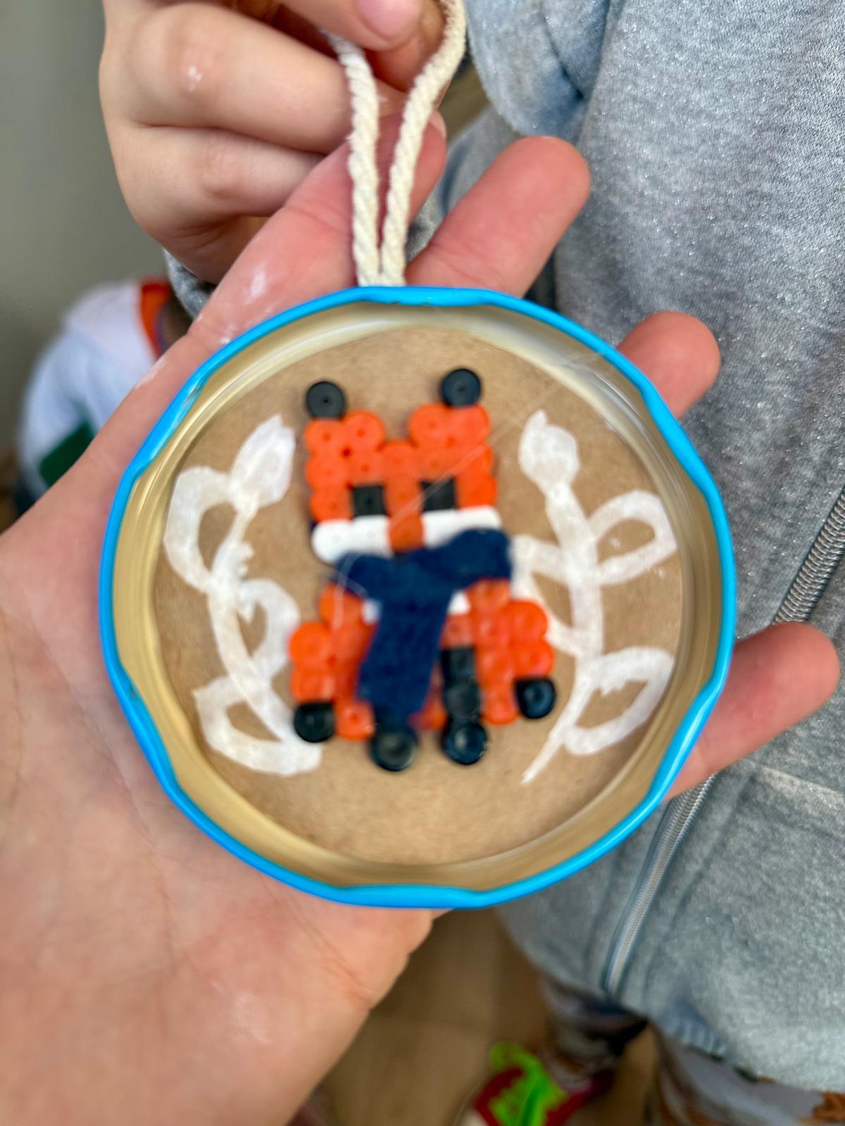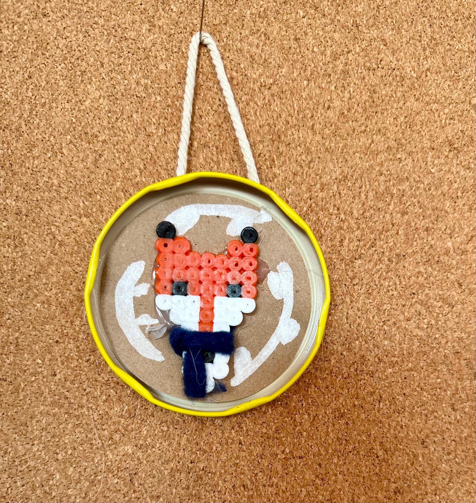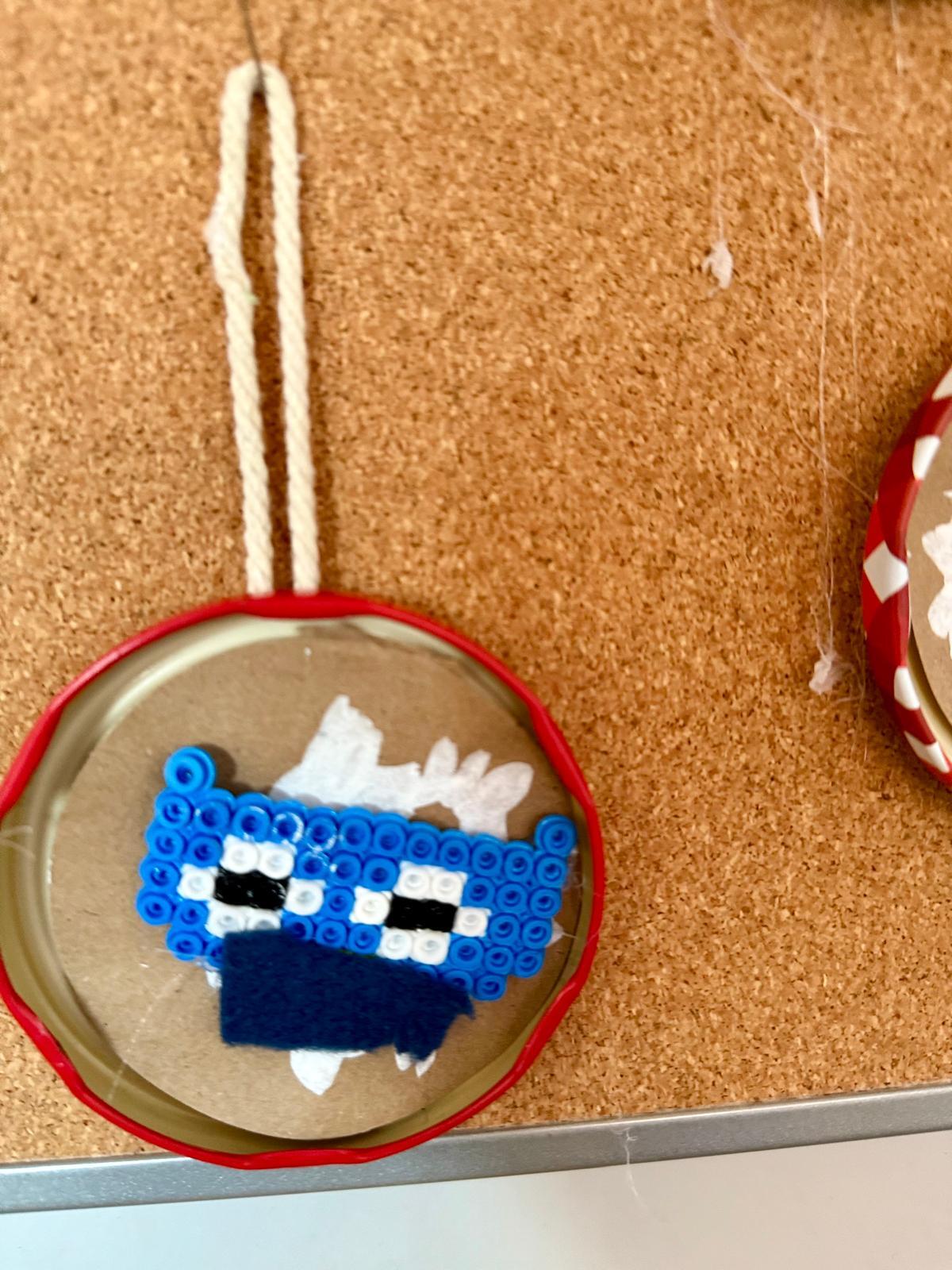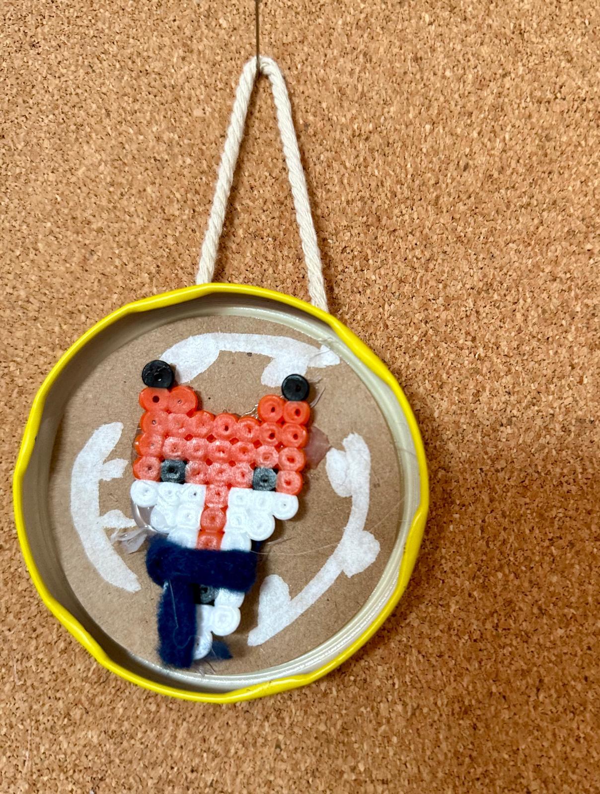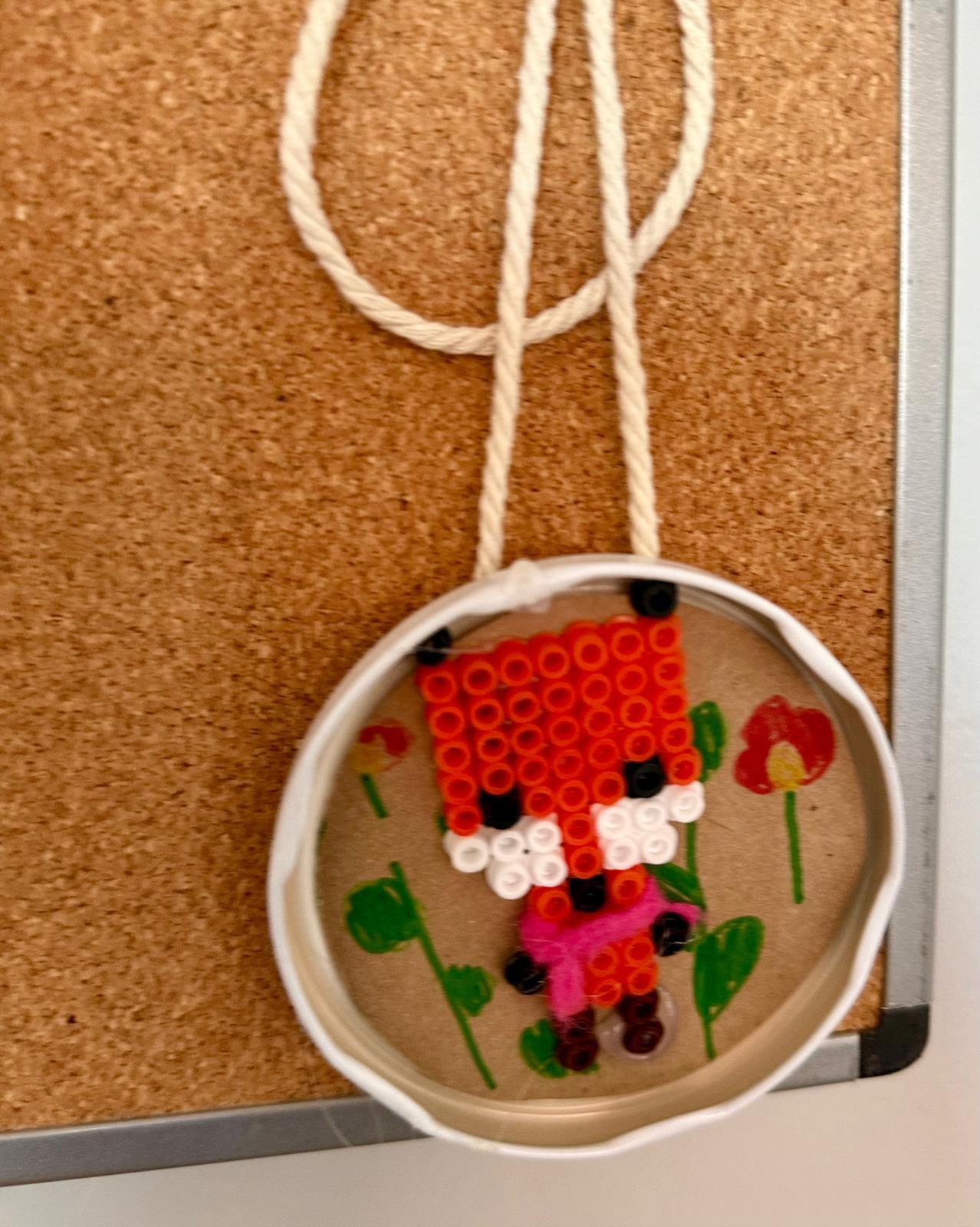Podczas gdy ja prasowałem koralikowe figurki, dzieci zajęły się ozdabianiem koła wyciętego z szarego papieru. Białym pisakiem tworzyły na nim wzory i faktury, rozwijając koordynację wzrokowo-ruchową oraz poczucie estetyki i kompozycji. Następnie gotowe koła zostały przyklejone do nakrętek od słoików, a do nich trafiły małe koralikowe zwierzątka.
