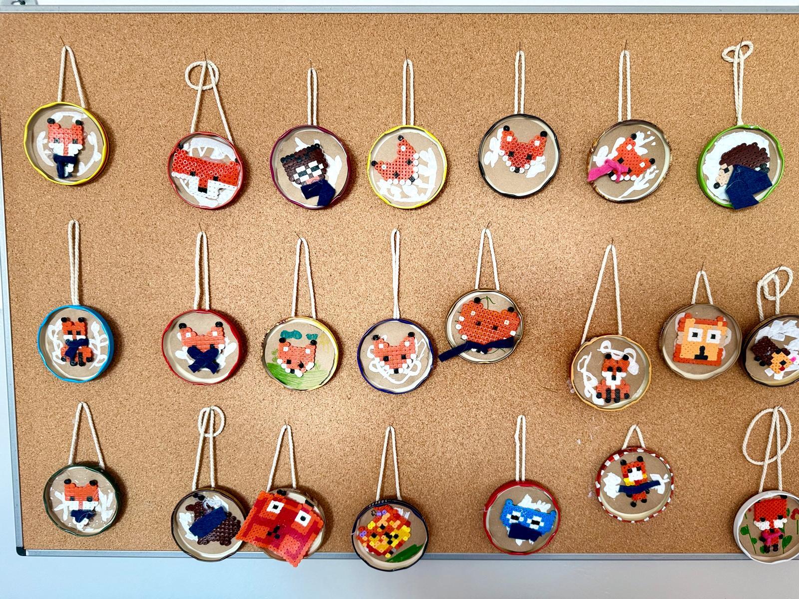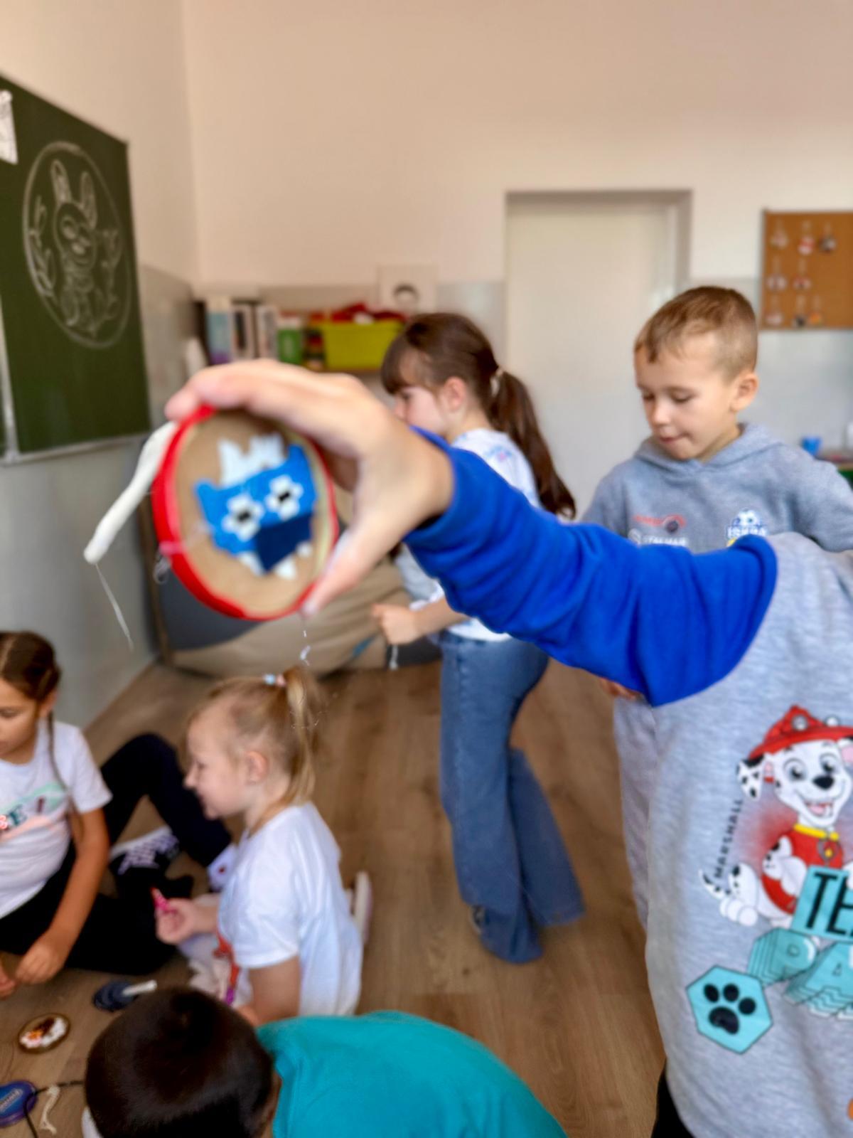 To jednak nie koniec! Dzieci wykonały także szaliki i sznurki do zawieszenia swoich prac – dzięki temu każdy lis, jeż czy sowa mógł dumnie zawisnąć jako mała, artystyczna ozdoba. 🧶