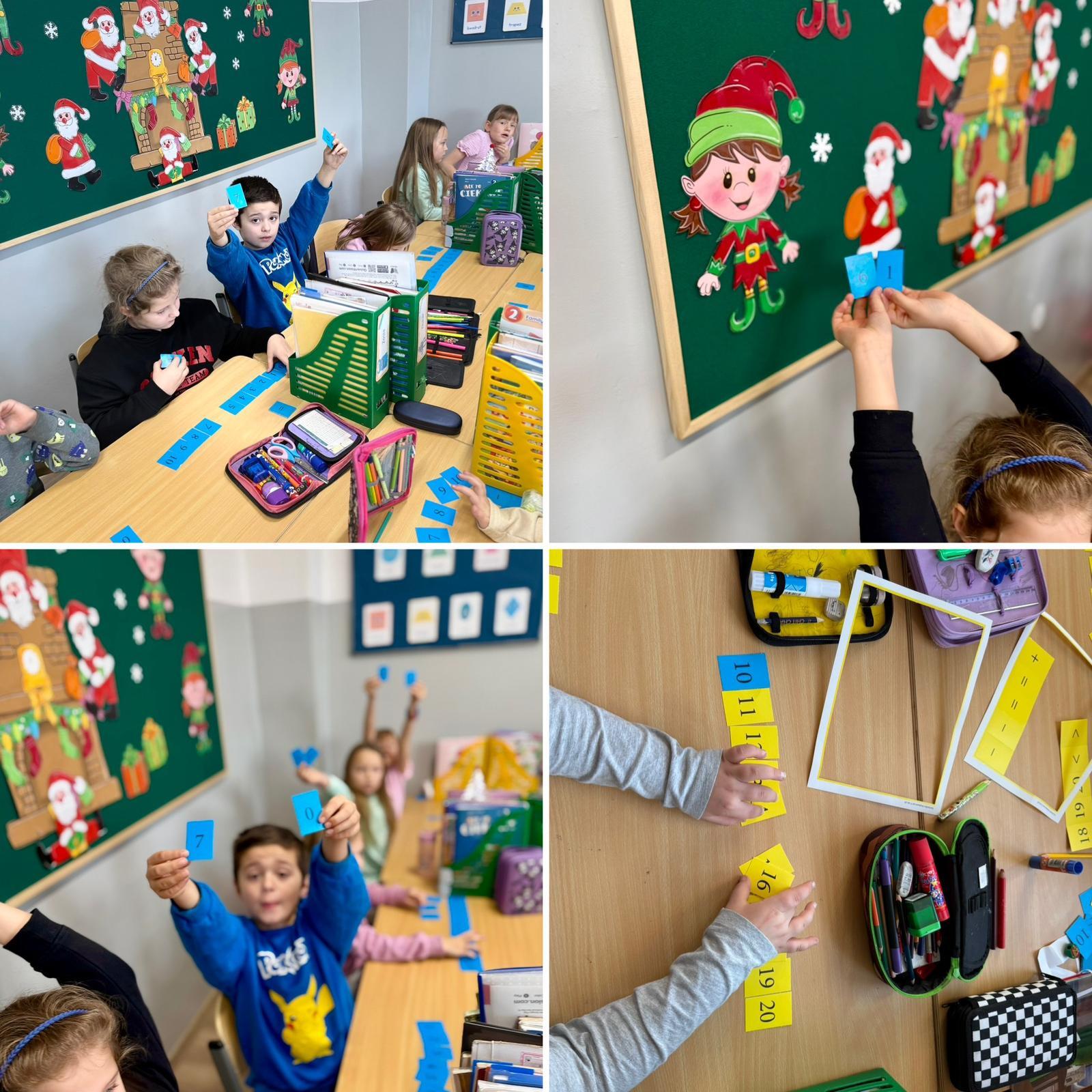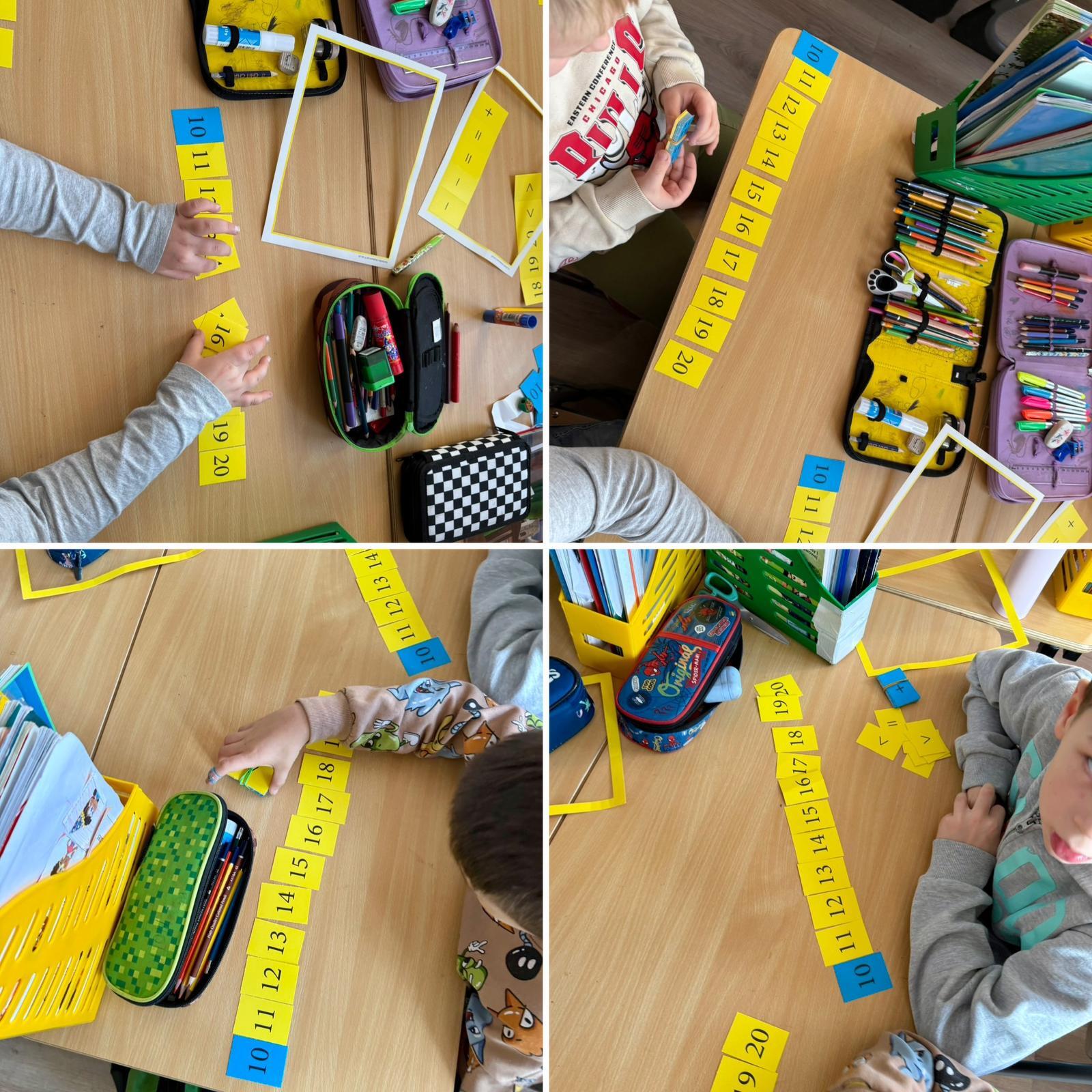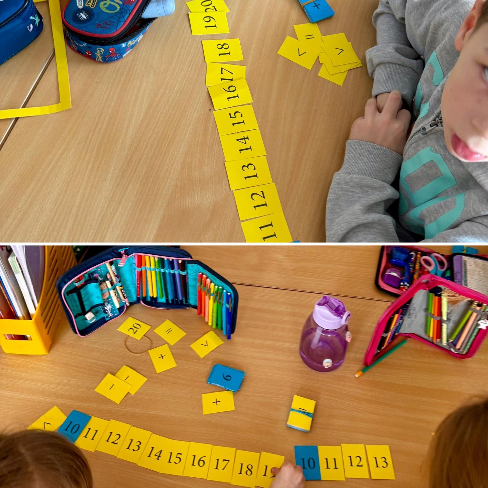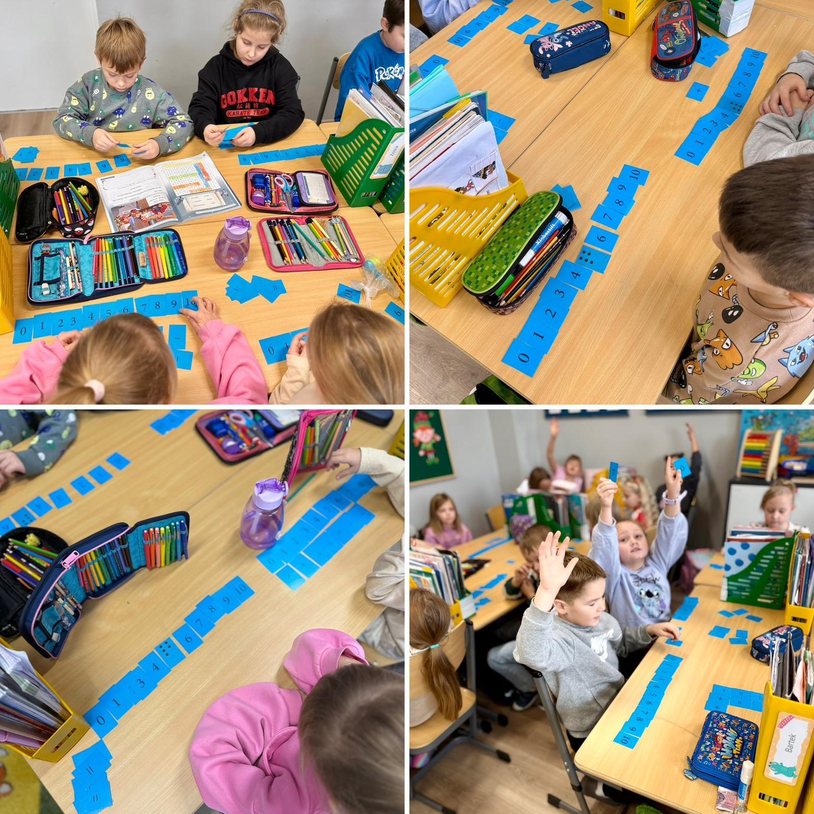 Na początku dzieci pracowały z kartonikami z zapisanymi liczbami w zakresie 10. Każdy uczeń miał je ułożone na ławce w widocznym miejscu. Podawałem krótkie działania, np. 7 − 2, 3 + 4, a zadaniem dzieci było odwrócenie kartonika z prawidłowym wynikiem. Ćwiczenie miało charakter dynamiczny i angażujący – liczyliśmy tak długo, aż wszystkie kartoniki zostały odwrócone.