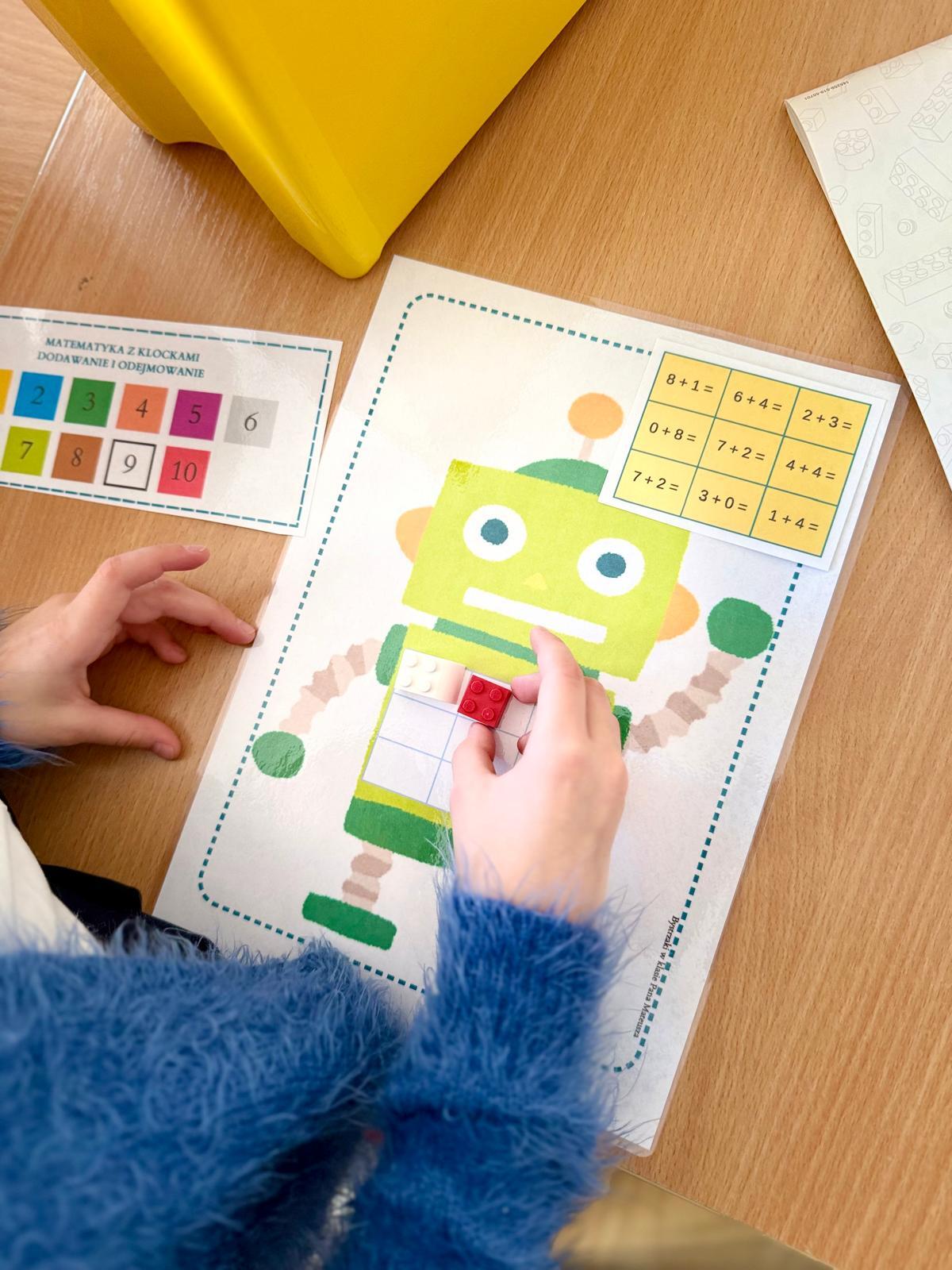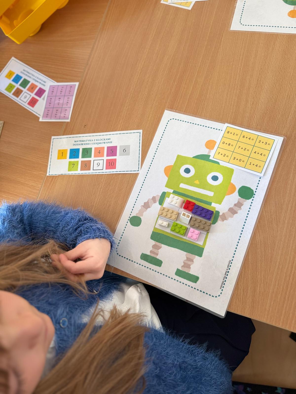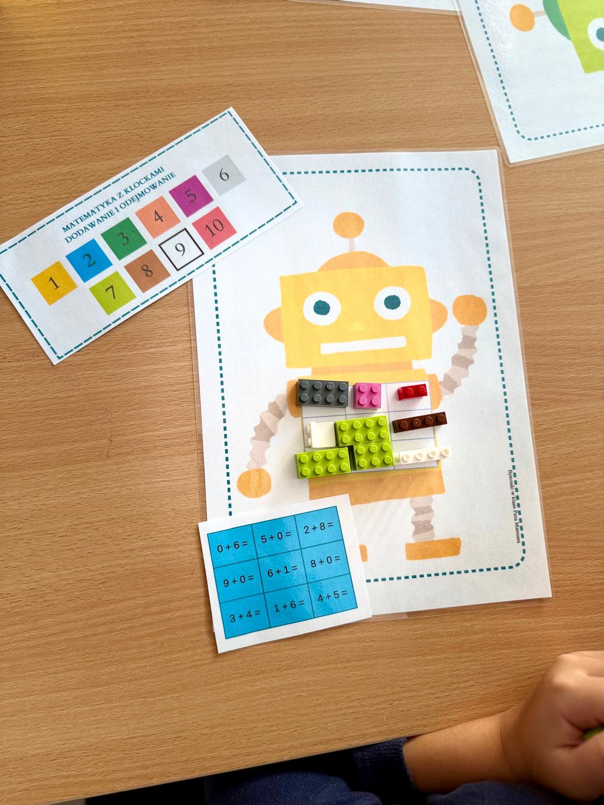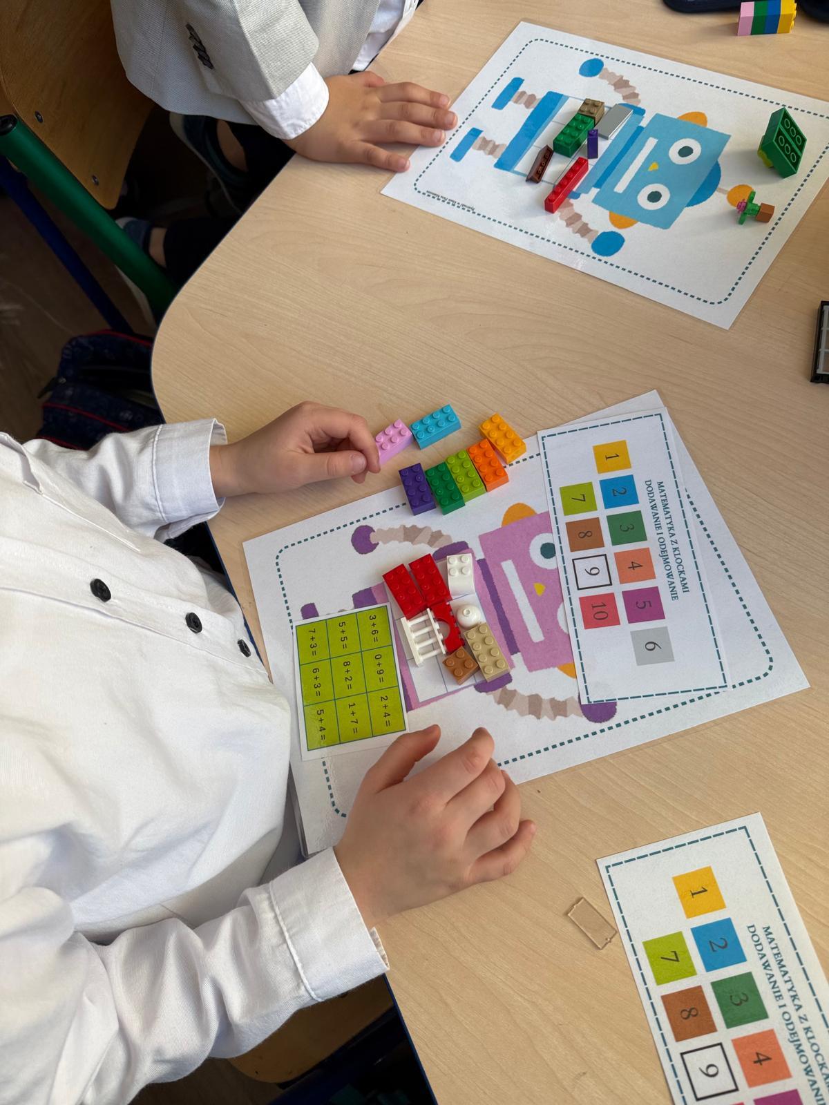 Na zajęciach matematycznych sięgnęliśmy po klocki LEGO. Dzieci rozwiązywały działania na dodawanie w zakresie 10, a każdy wynik był zakodowany odpowiednim kolorem klocka. Następnie uczniowie wyszukiwali właściwy klocek i umieszczali go w odpowiednim miejscu na robocie.