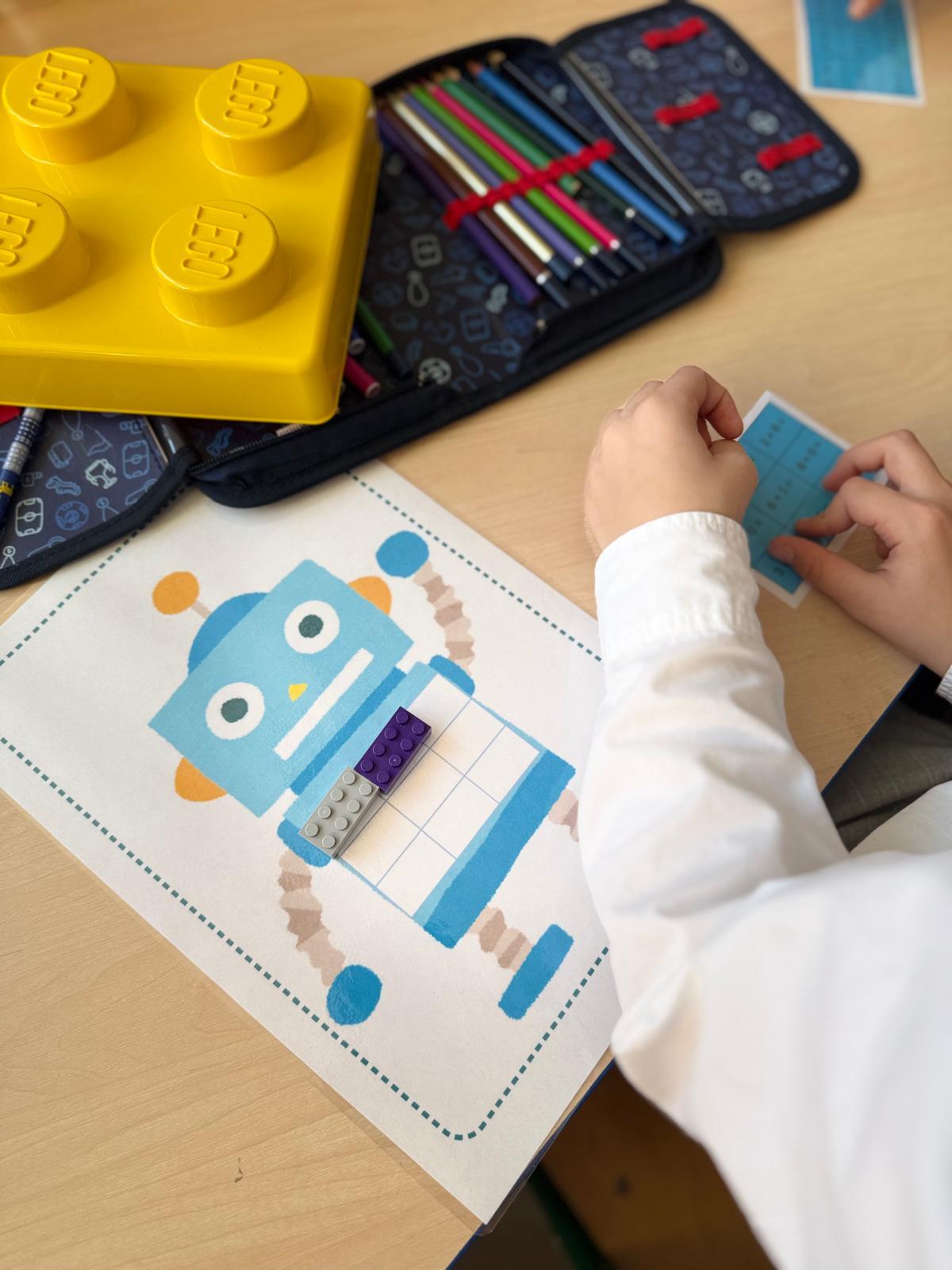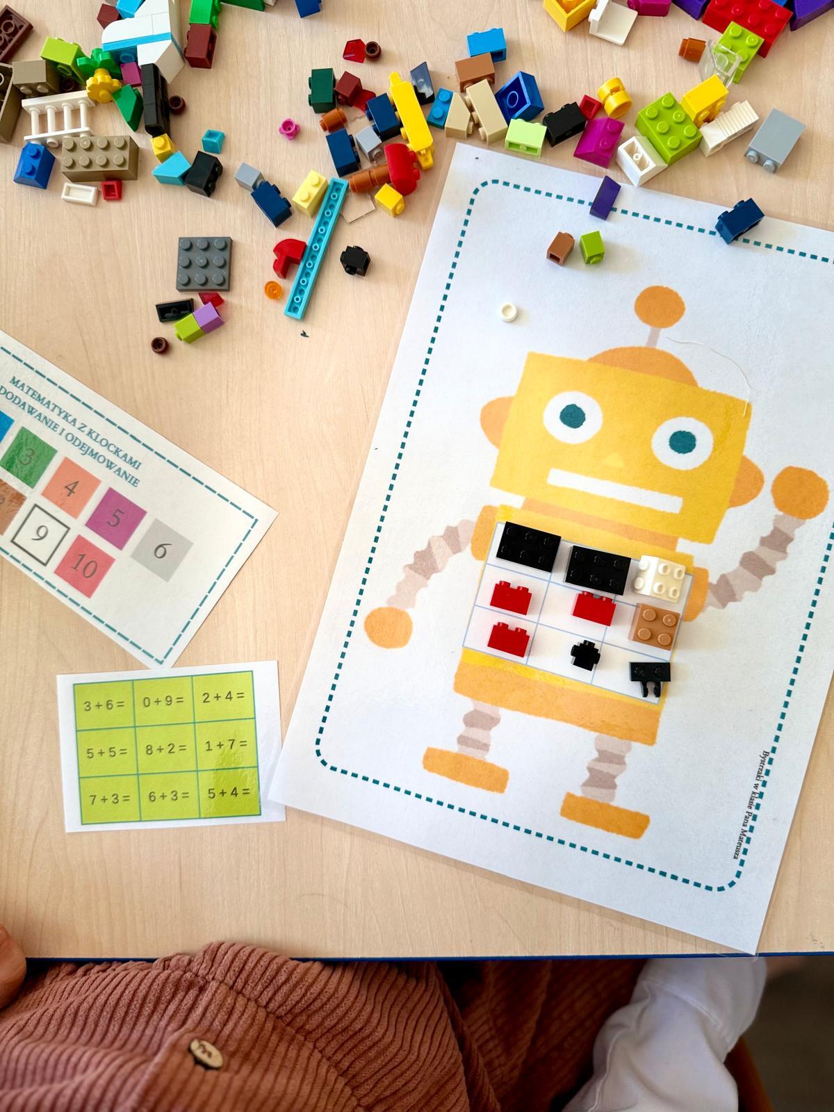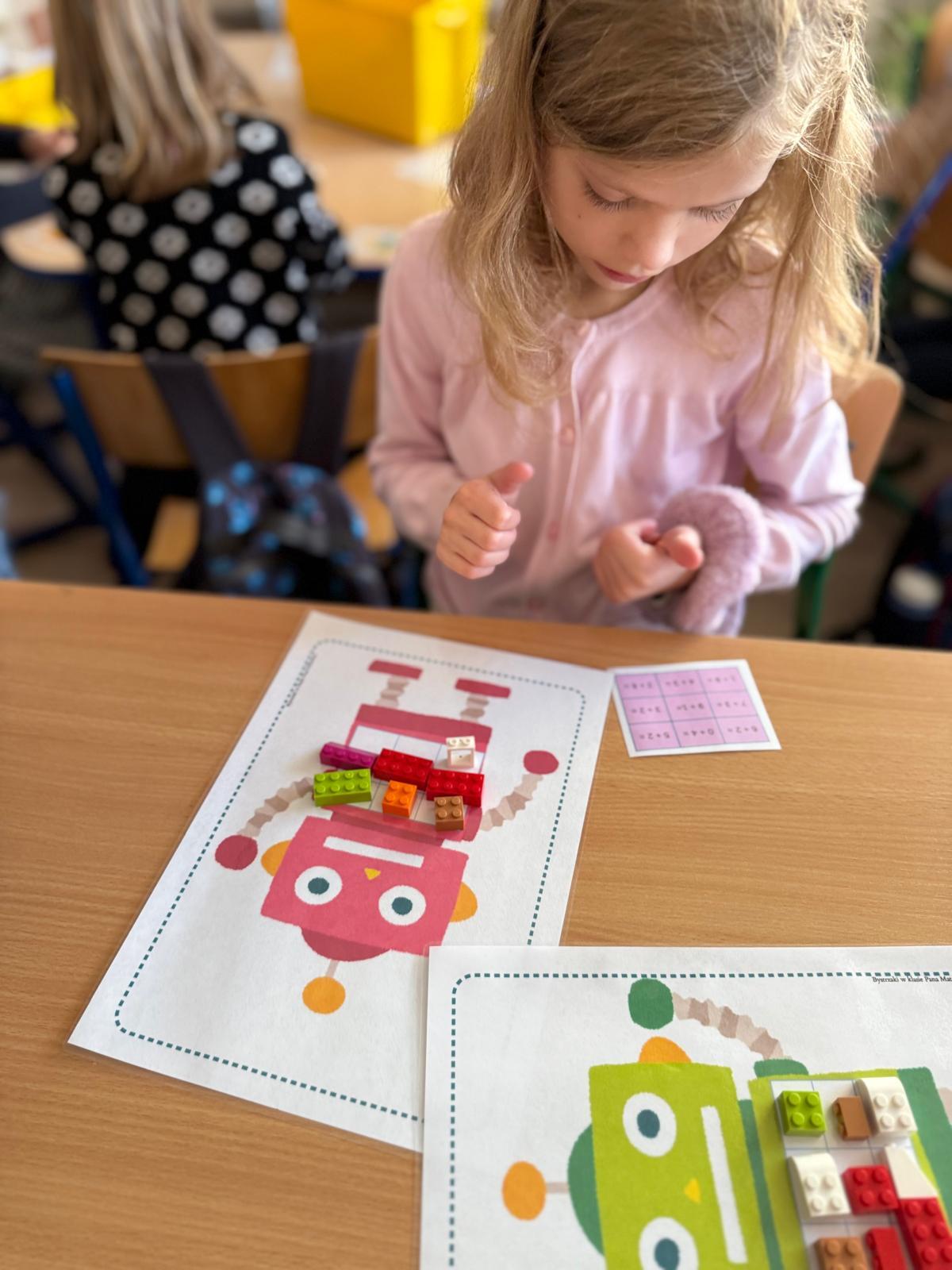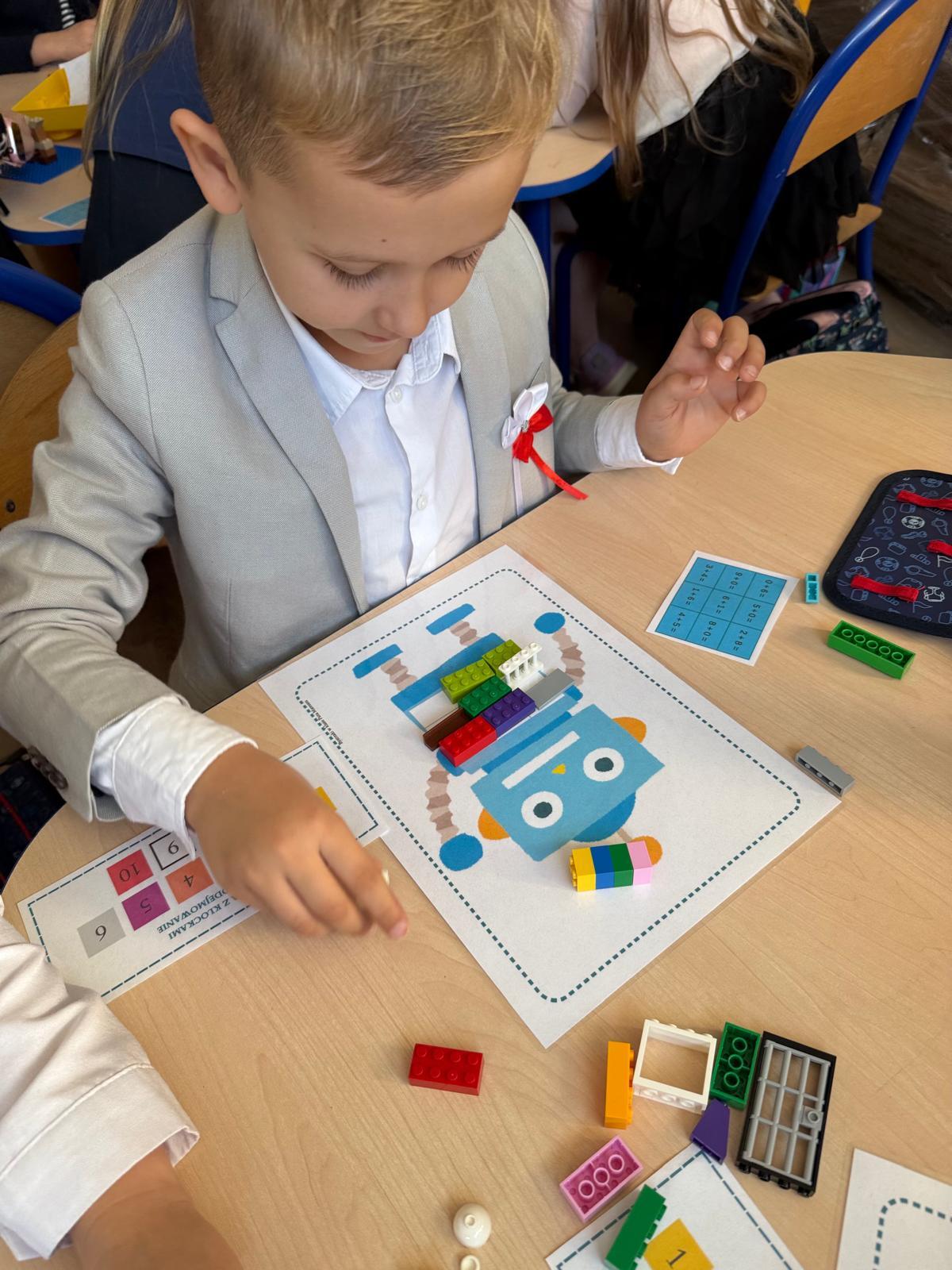 Na zajęciach matematycznych sięgnęliśmy po klocki LEGO. Dzieci rozwiązywały działania na dodawanie w zakresie 10, a każdy wynik był zakodowany odpowiednim kolorem klocka. Następnie uczniowie wyszukiwali właściwy klocek i umieszczali go w odpowiednim miejscu na robocie.