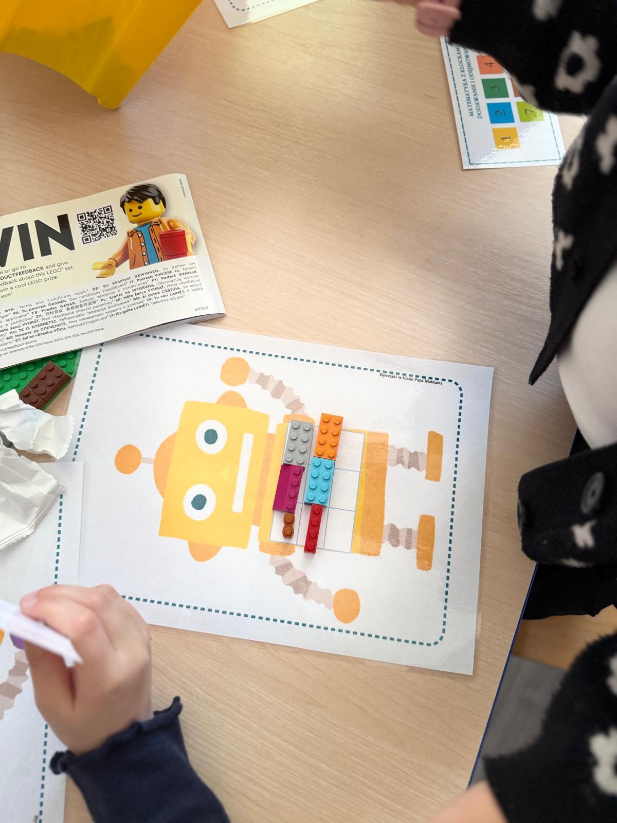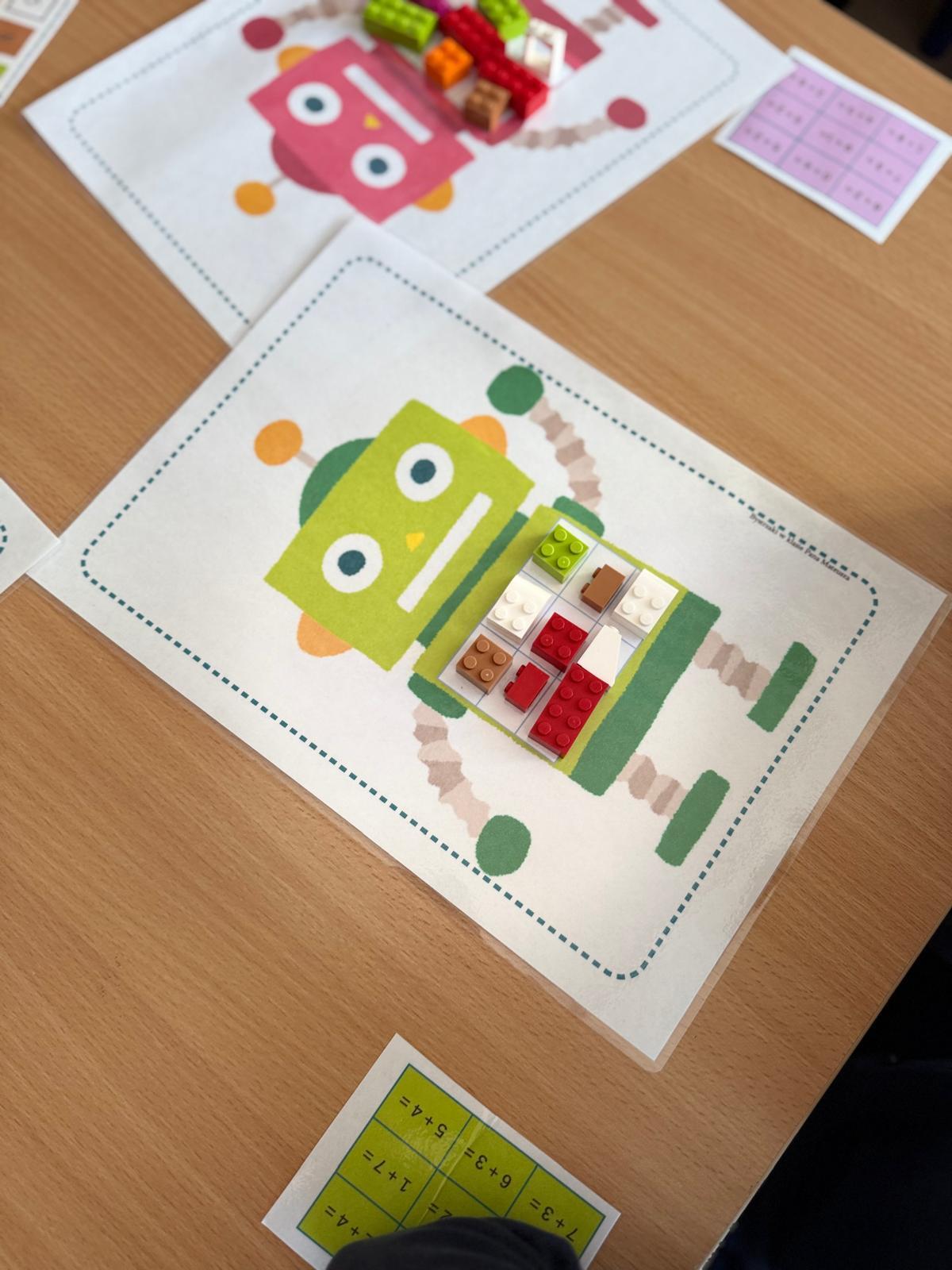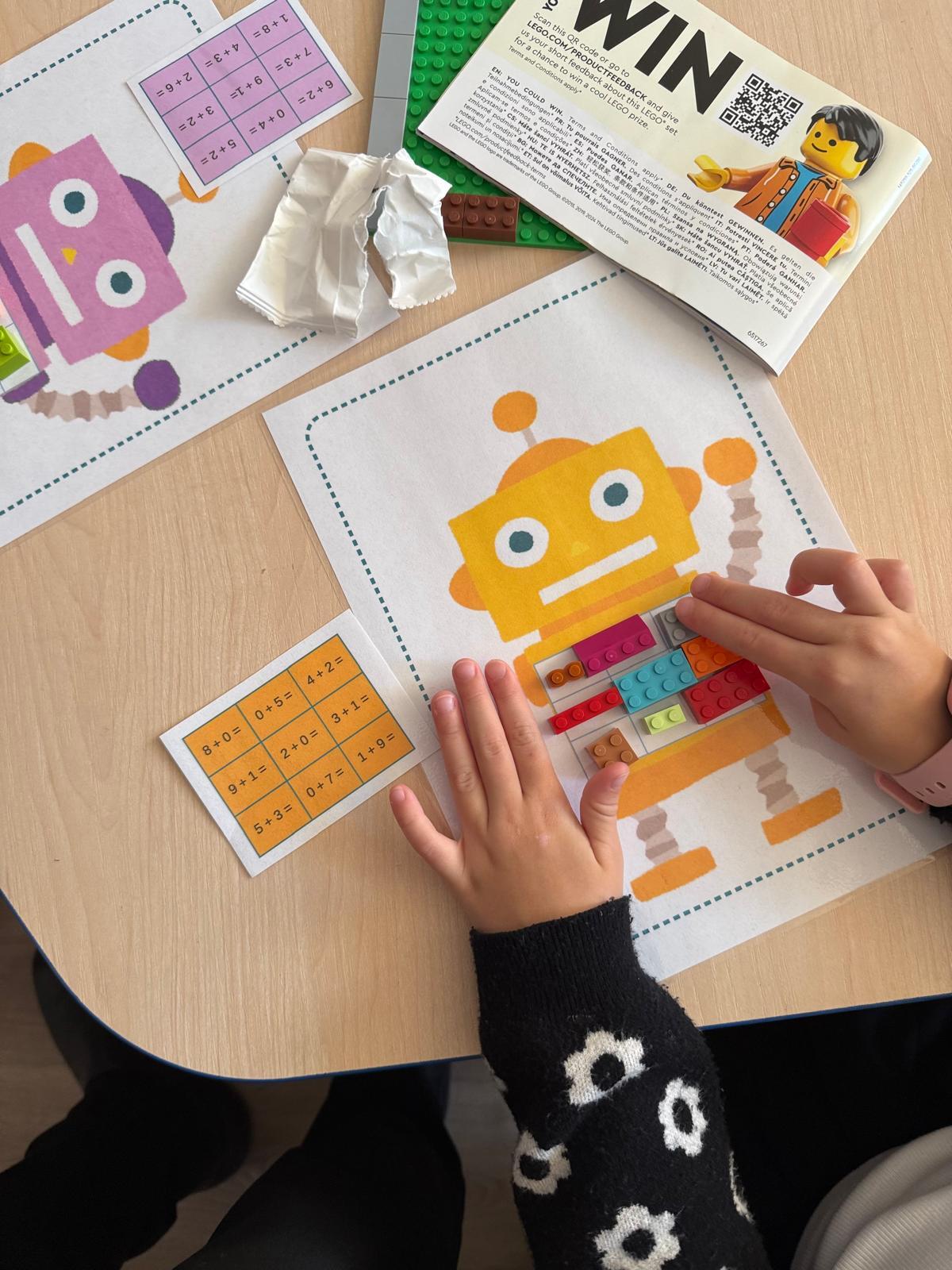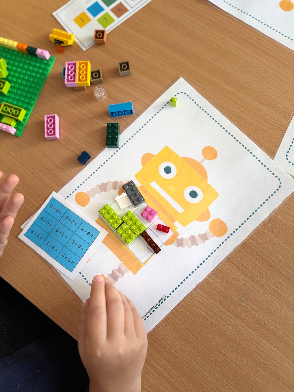 Na zajęciach matematycznych sięgnęliśmy po klocki LEGO. Dzieci rozwiązywały działania na dodawanie w zakresie 10, a każdy wynik był zakodowany odpowiednim kolorem klocka. Następnie uczniowie wyszukiwali właściwy klocek i umieszczali go w odpowiednim miejscu na robocie.