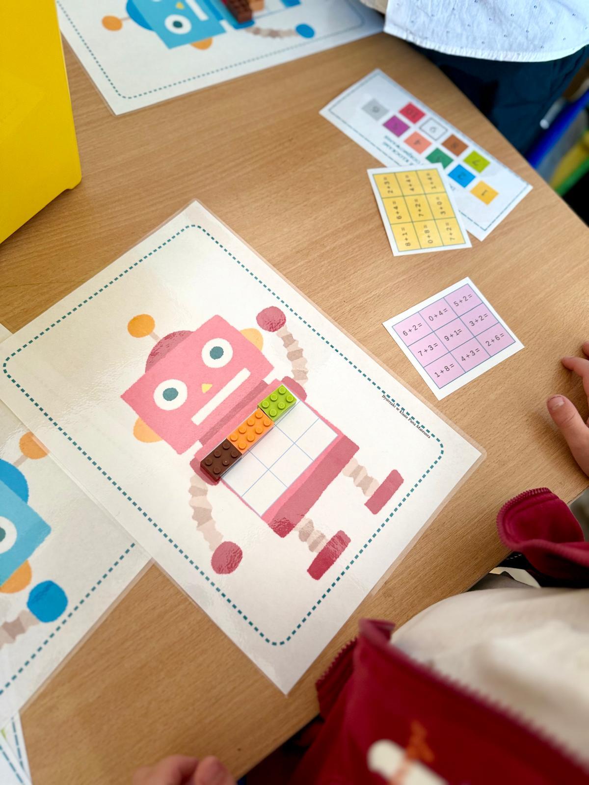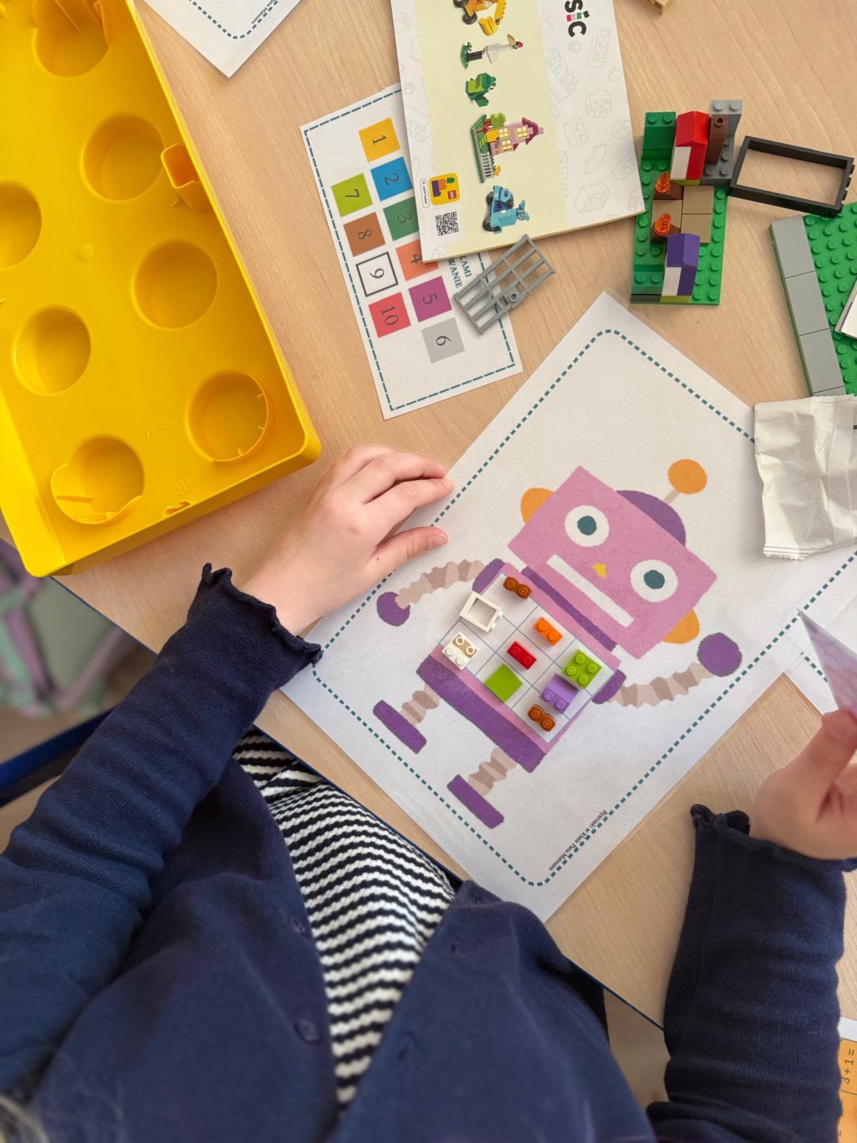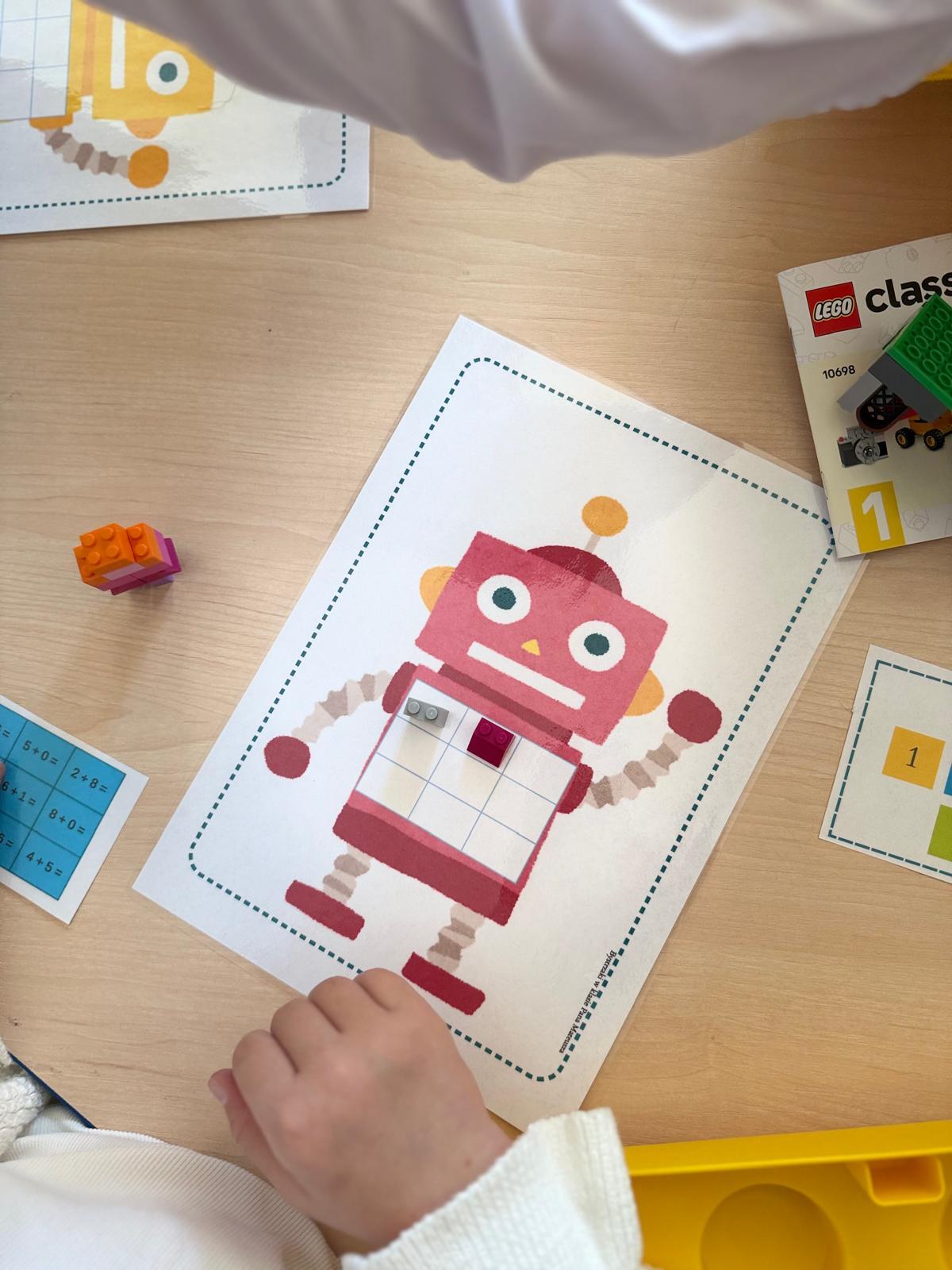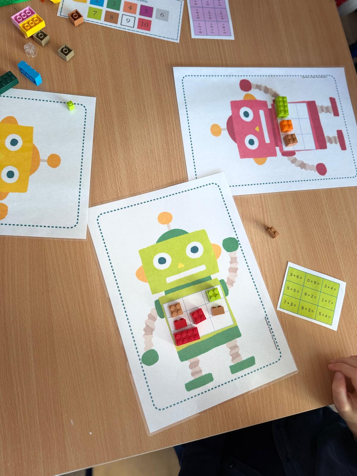 Na zajęciach matematycznych sięgnęliśmy po klocki LEGO. Dzieci rozwiązywały działania na dodawanie w zakresie 10, a każdy wynik był zakodowany odpowiednim kolorem klocka. Następnie uczniowie wyszukiwali właściwy klocek i umieszczali go w odpowiednim miejscu na robocie.