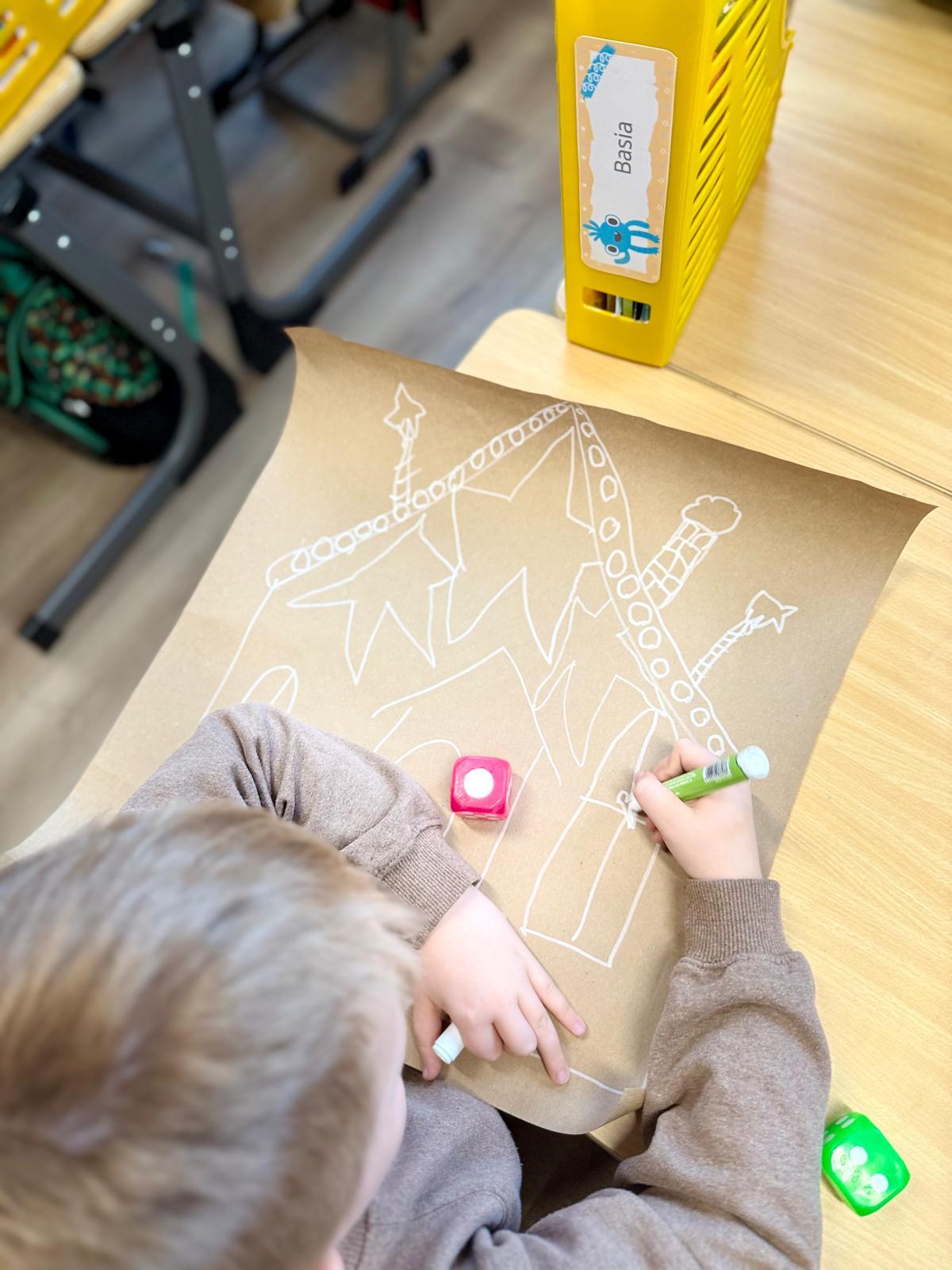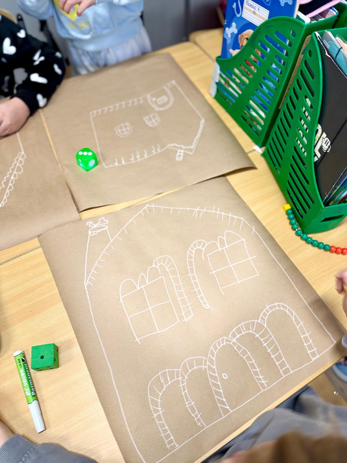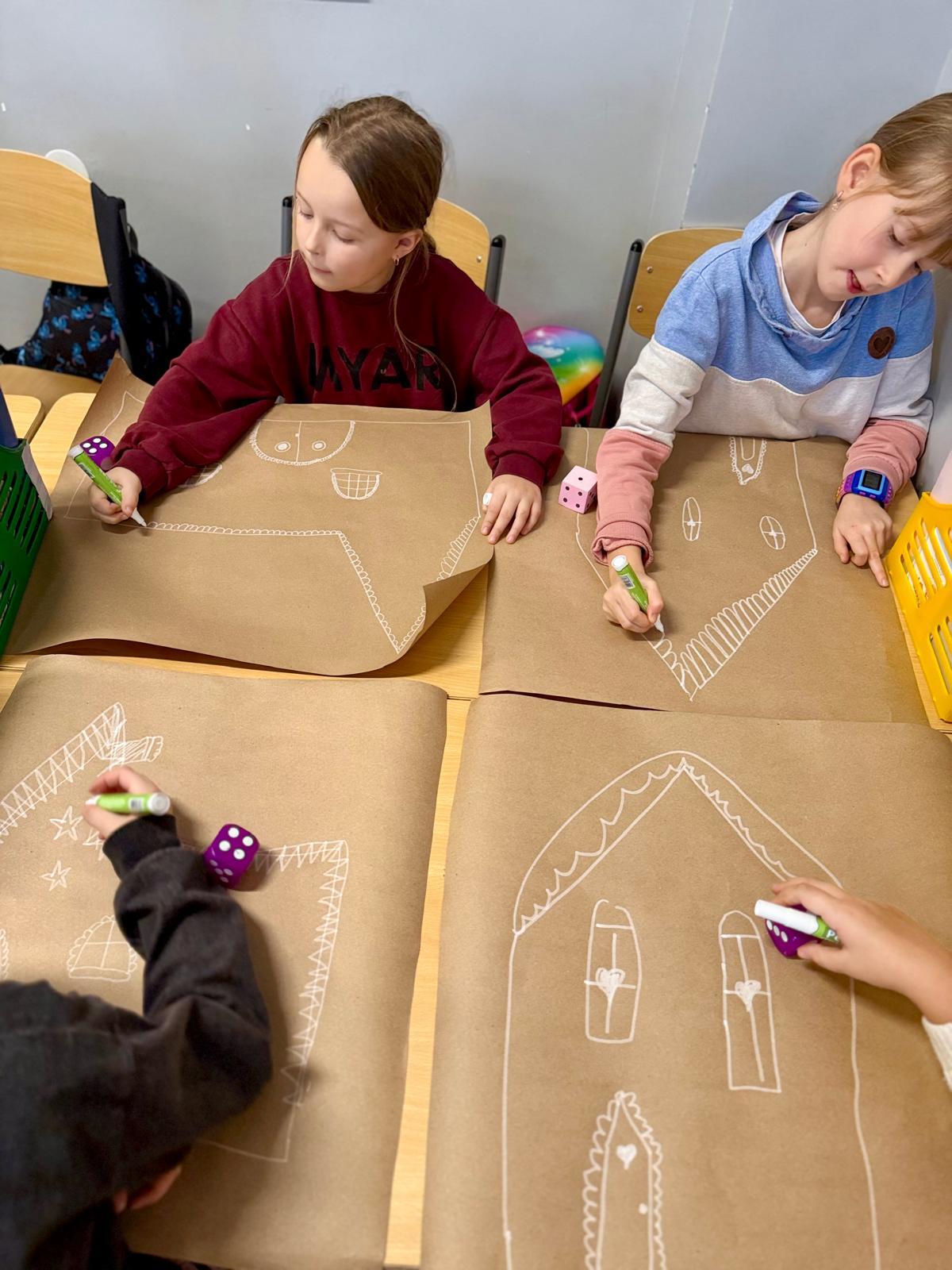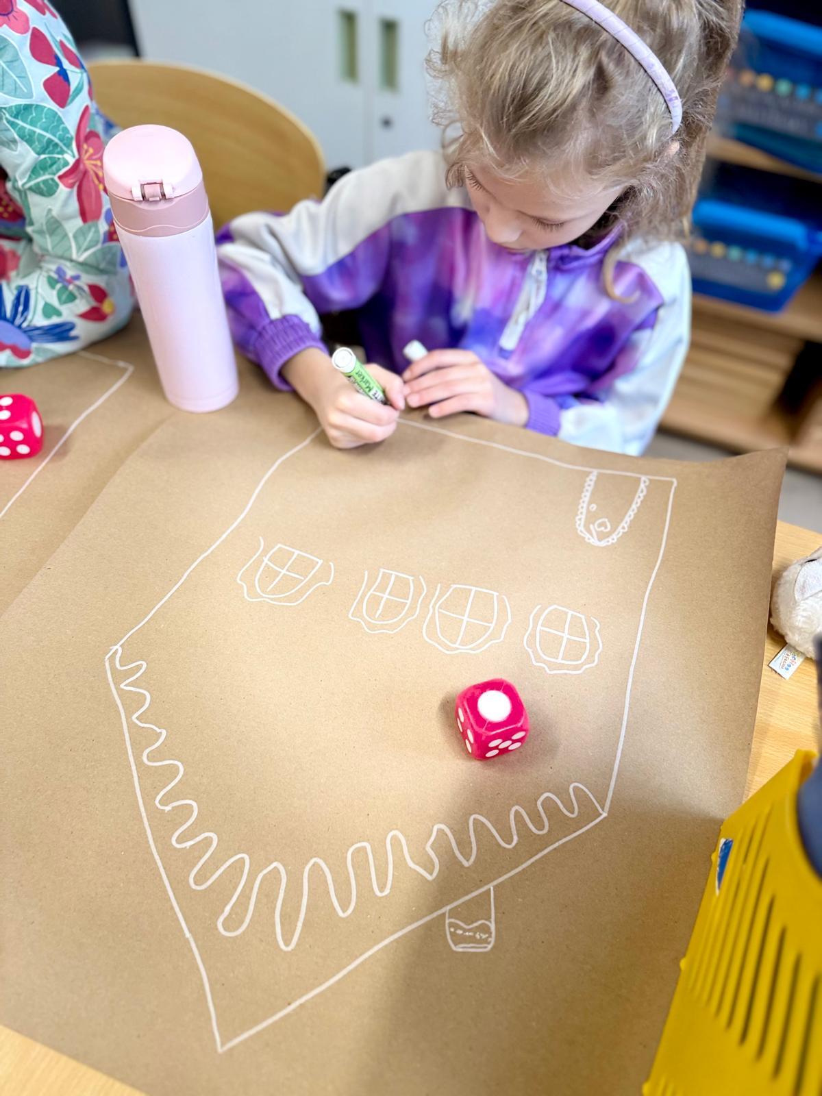 Na piątkowych zajęciach realizowaliśmy kolejne zadanie z naszego kalendarza „24 zadania na czas oczekiwania”. Tym razem dzieci miały… wyturlać swój piernikowy domek! Za pomocą kostek losowały elementy, które następnie rysowały zgodnie z instrukcją. Zamiast lukru i ciasta użyliśmy szarego papieru i białych pisaków — a efekt okazał się nie tylko piękny, ale też pełen edukacyjnych wartości.