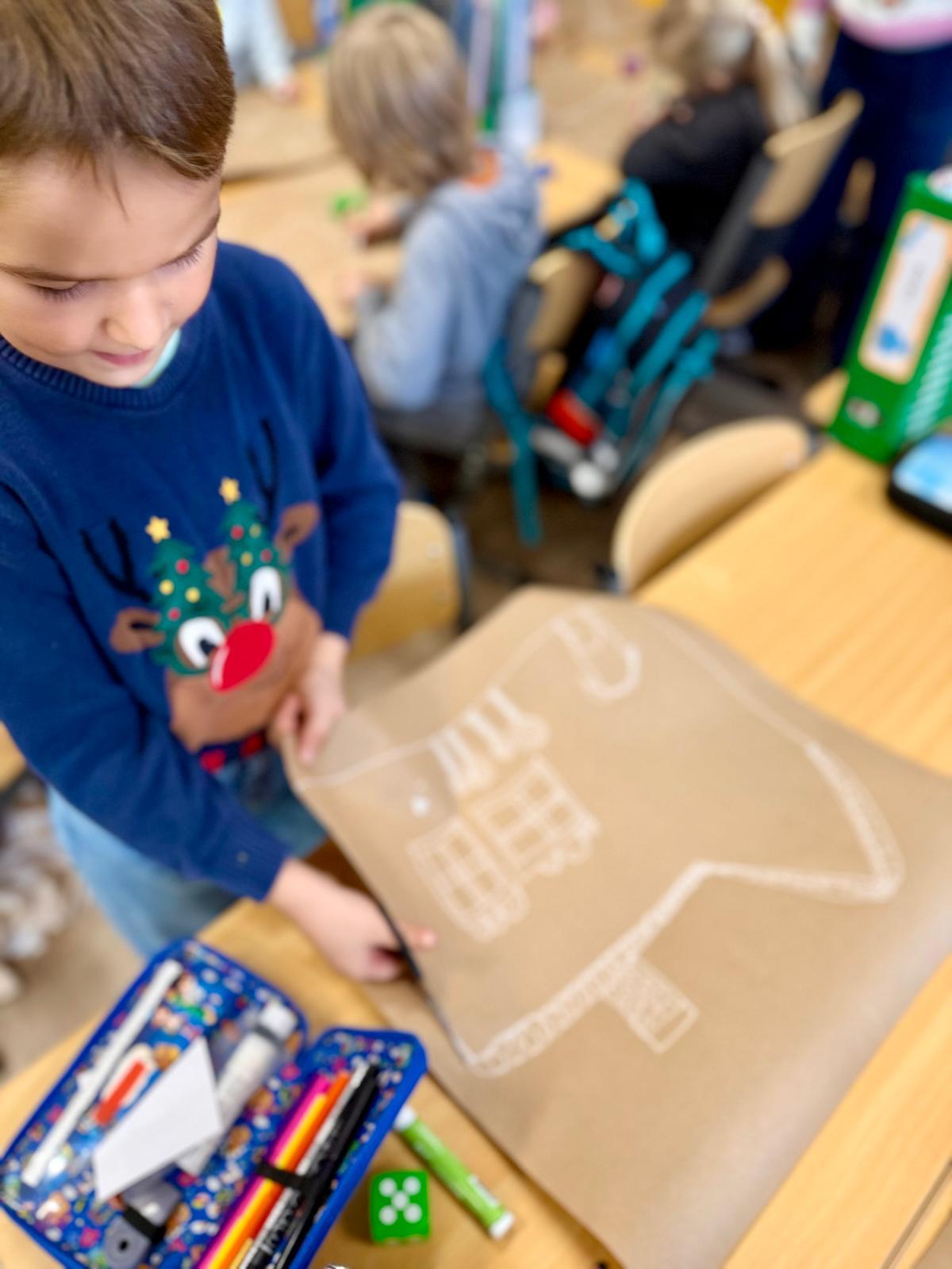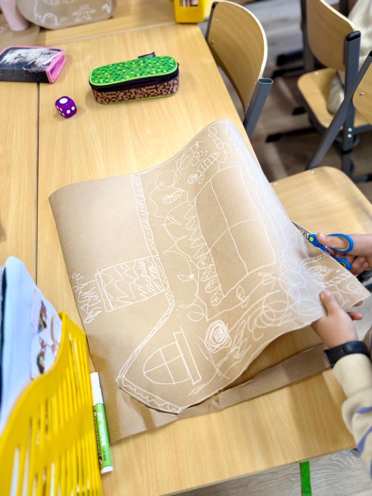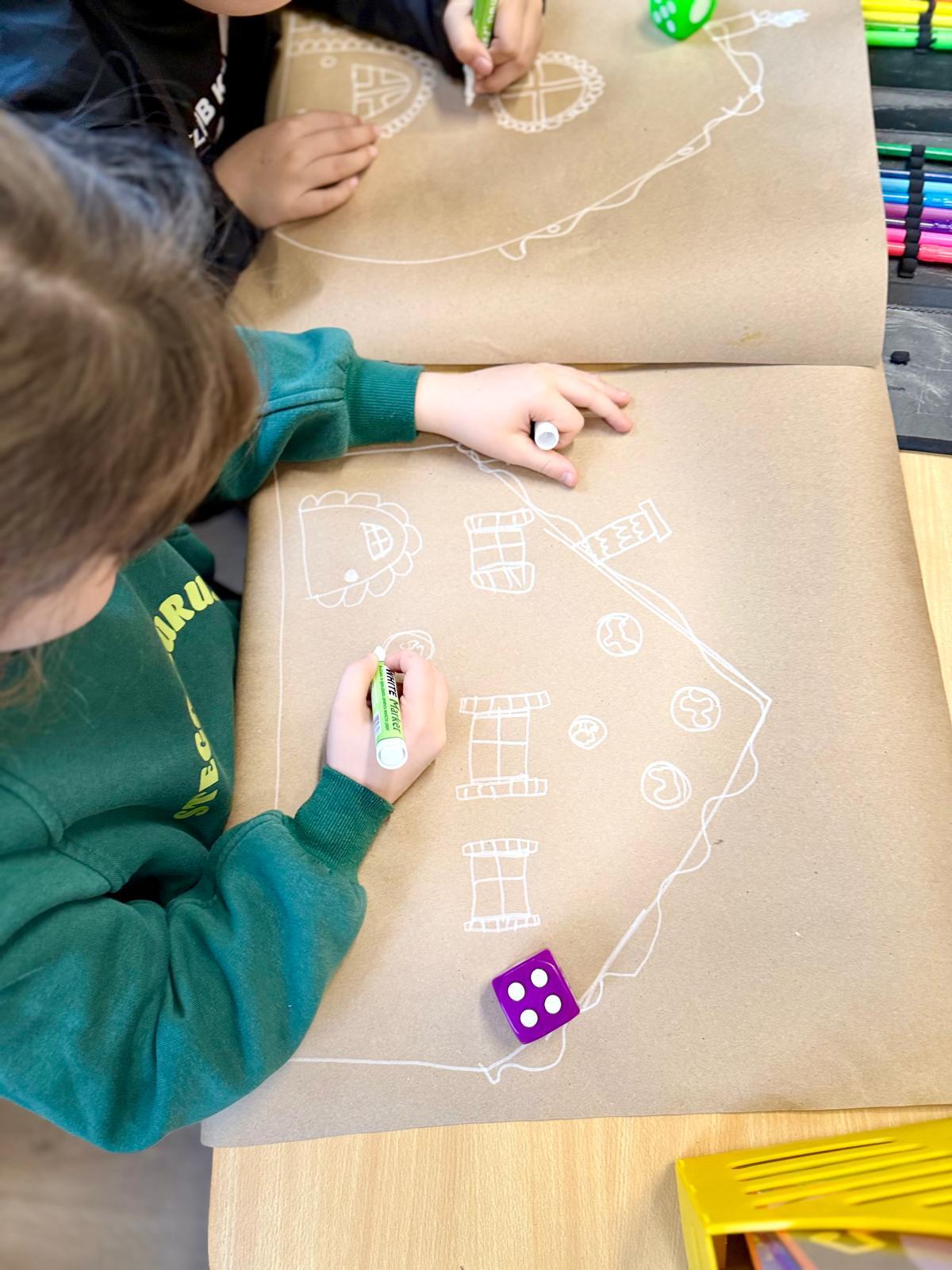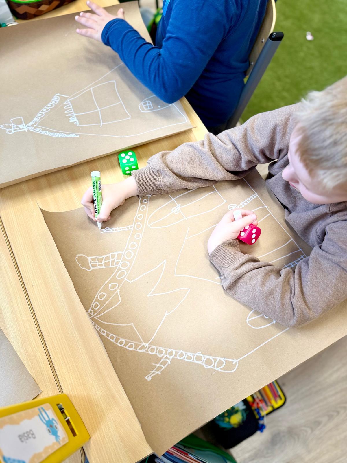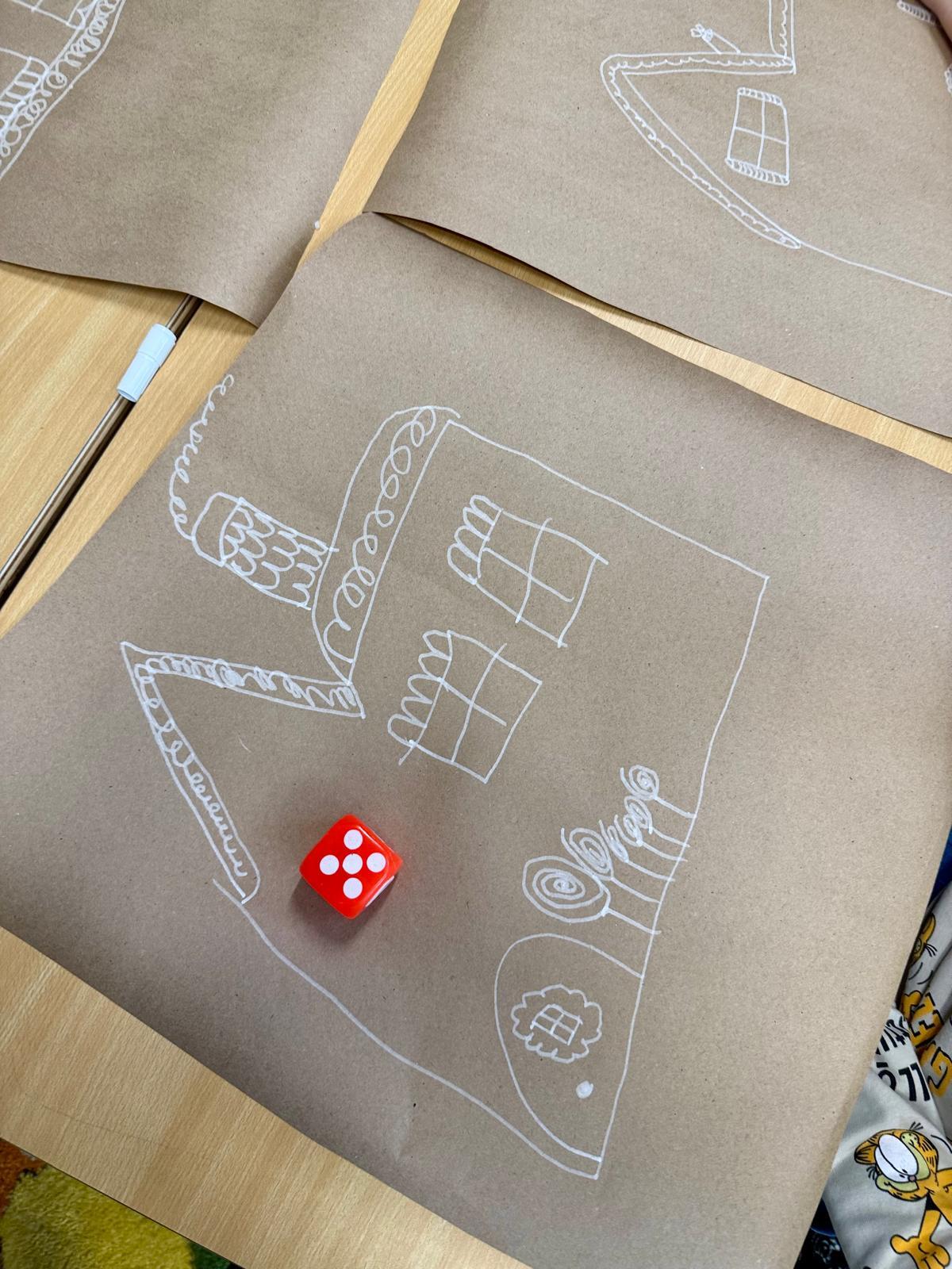 Na piątkowych zajęciach realizowaliśmy kolejne zadanie z naszego kalendarza „24 zadania na czas oczekiwania”. Tym razem dzieci miały… wyturlać swój piernikowy domek! Za pomocą kostek losowały elementy, które następnie rysowały zgodnie z instrukcją. Zamiast lukru i ciasta użyliśmy szarego papieru i białych pisaków — a efekt okazał się nie tylko piękny, ale też pełen edukacyjnych wartości.