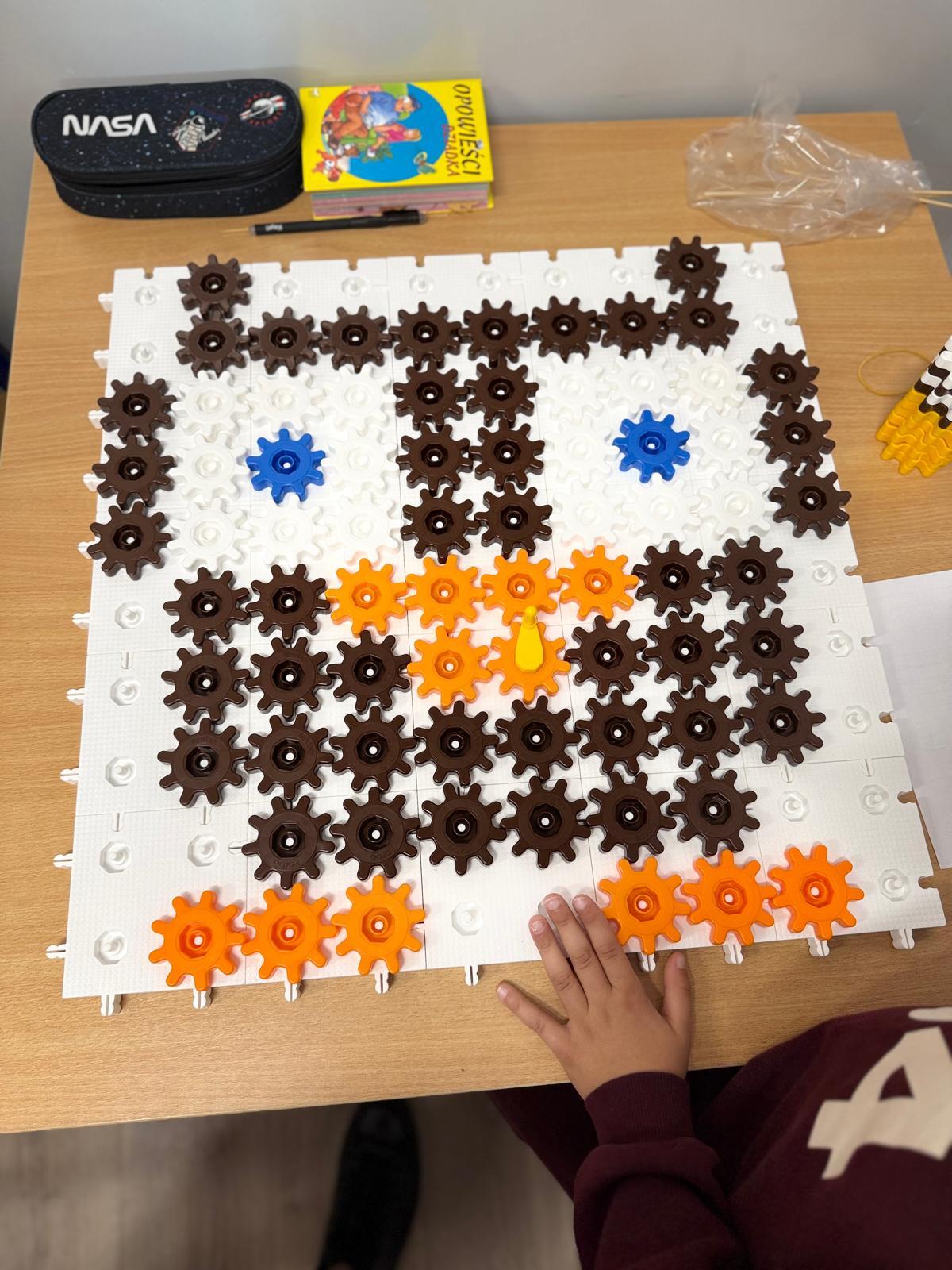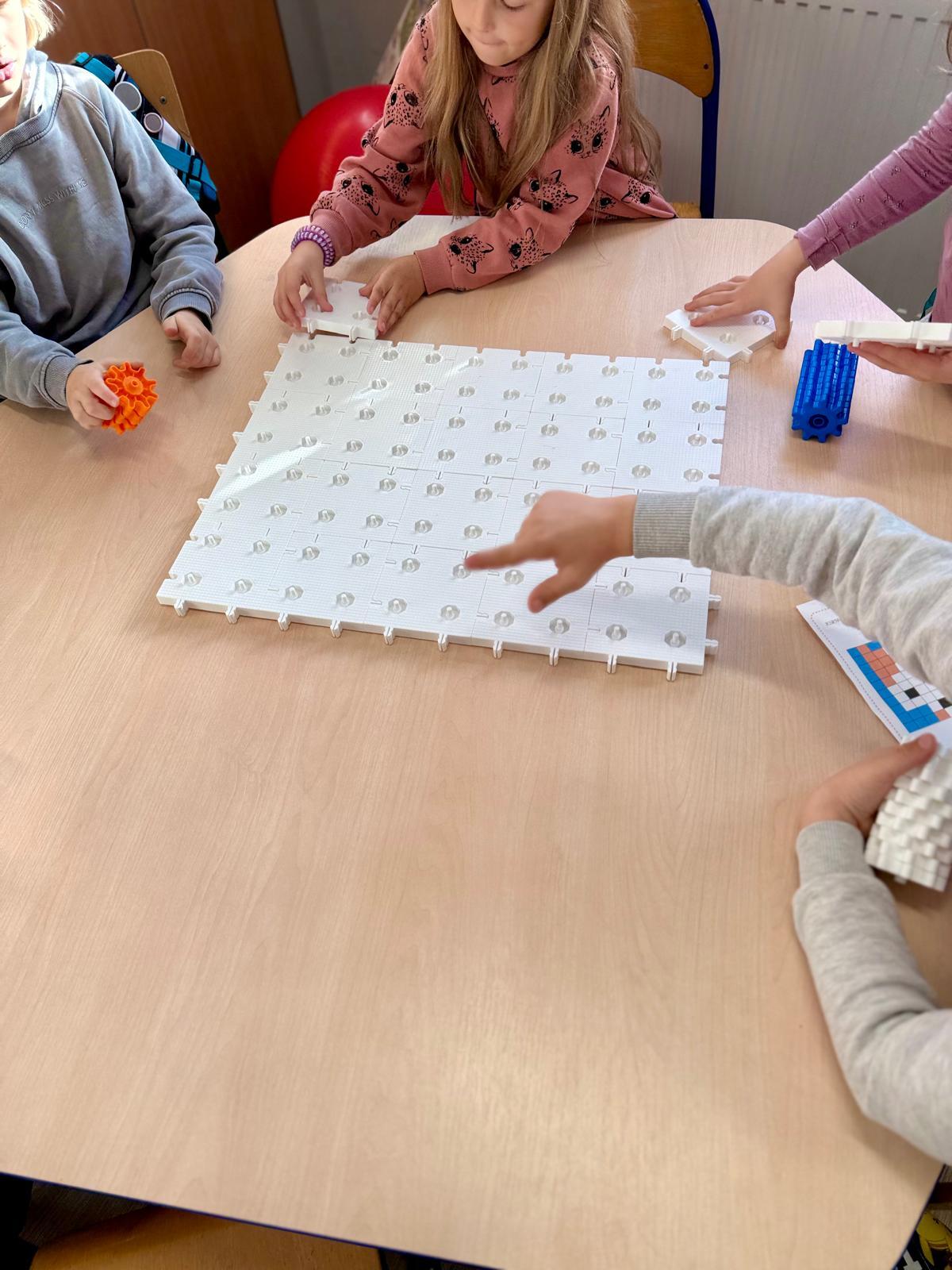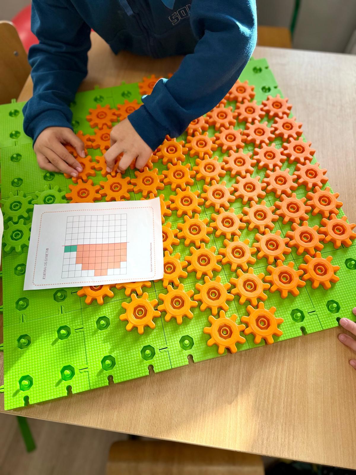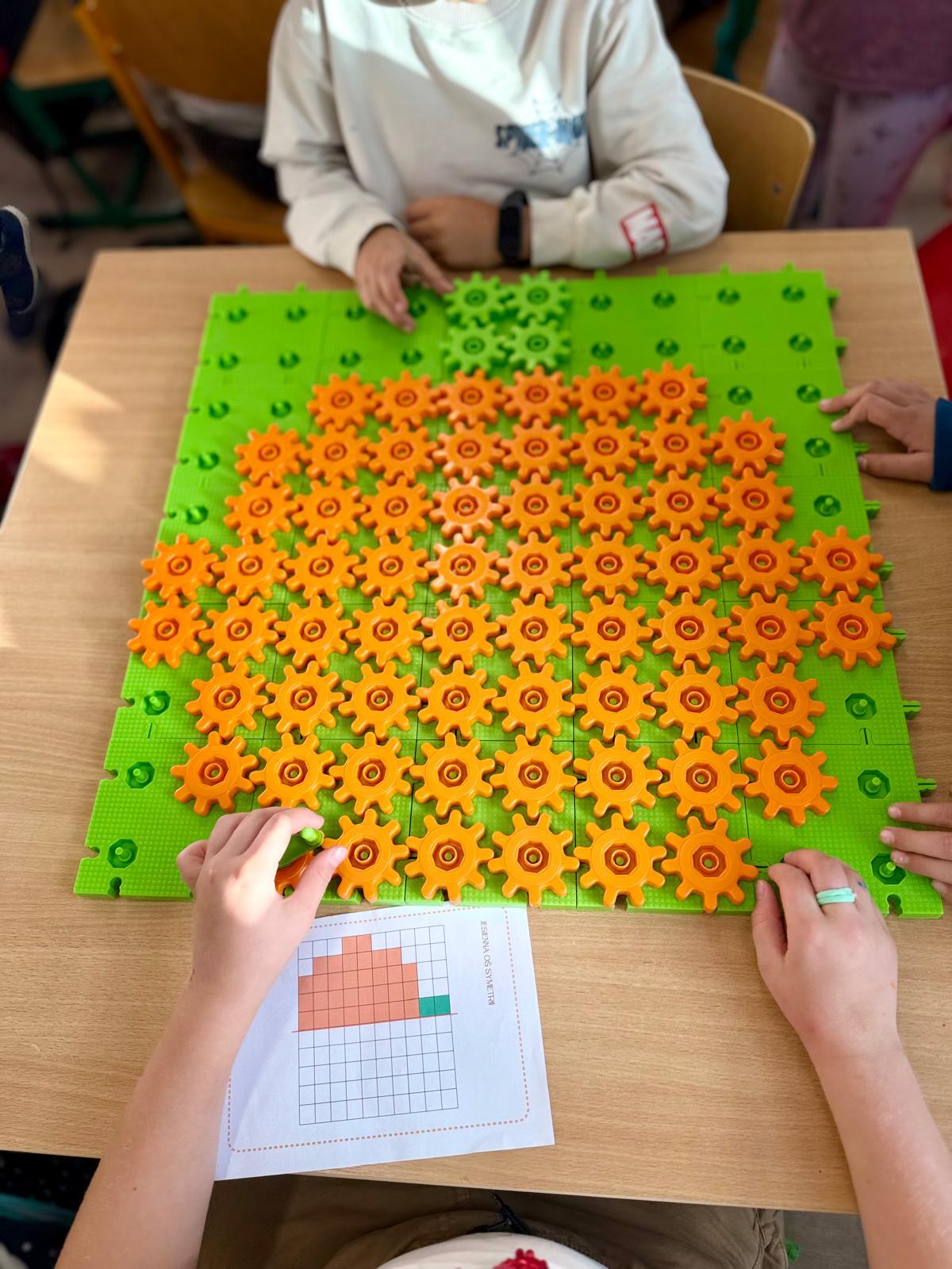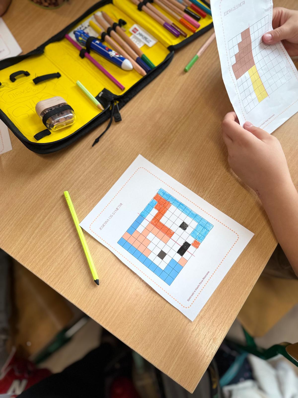 Na ostatnich zajęciach w pierwszej klasie odkrywaliśmy, czym jest oś symetrii. Nie przez definicje i regułki, ale przez… zabawę, eksperyment i działanie! Wykorzystałem do tego klocki Korbo oraz przygotowane wcześniej jesienne karty PixelArt. Na każdej karcie widniał obrazek — ale tylko w połowie! Zadaniem dzieci było zbudowanie bazy z klocków, ułożenie pierwszej części obrazka, a następnie dokończenie drugiej, symetrycznej połowy.