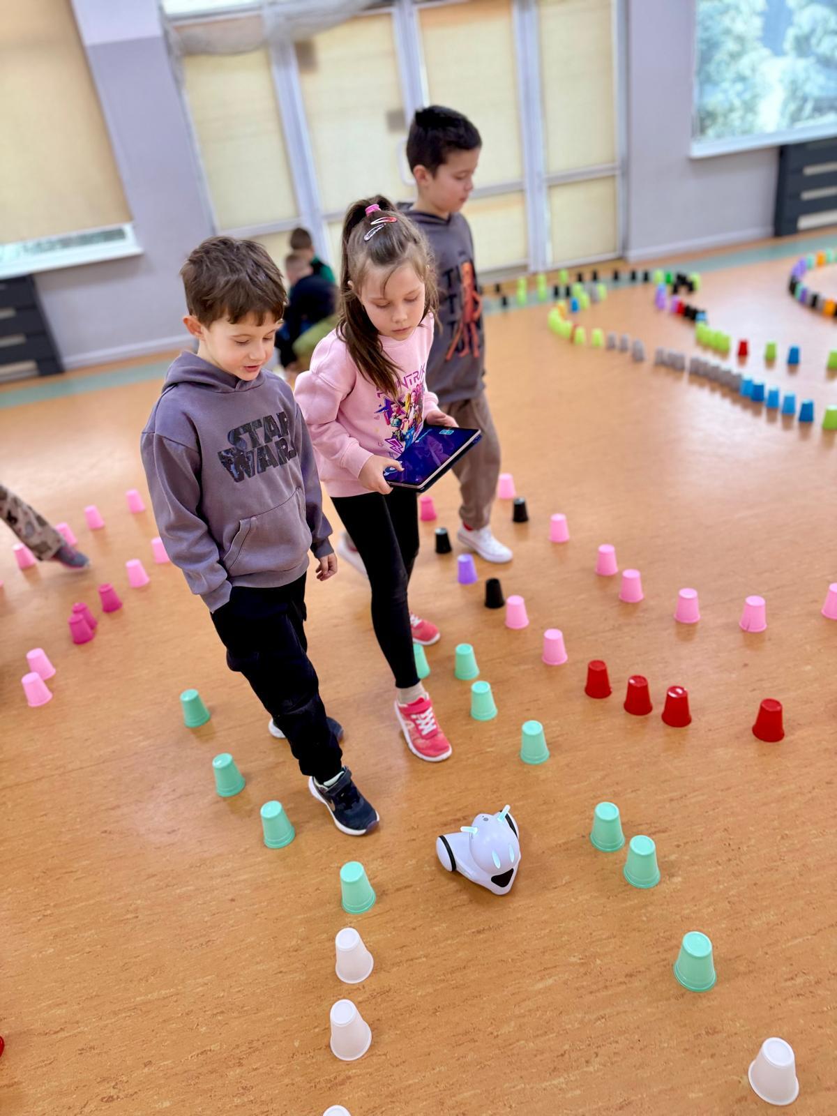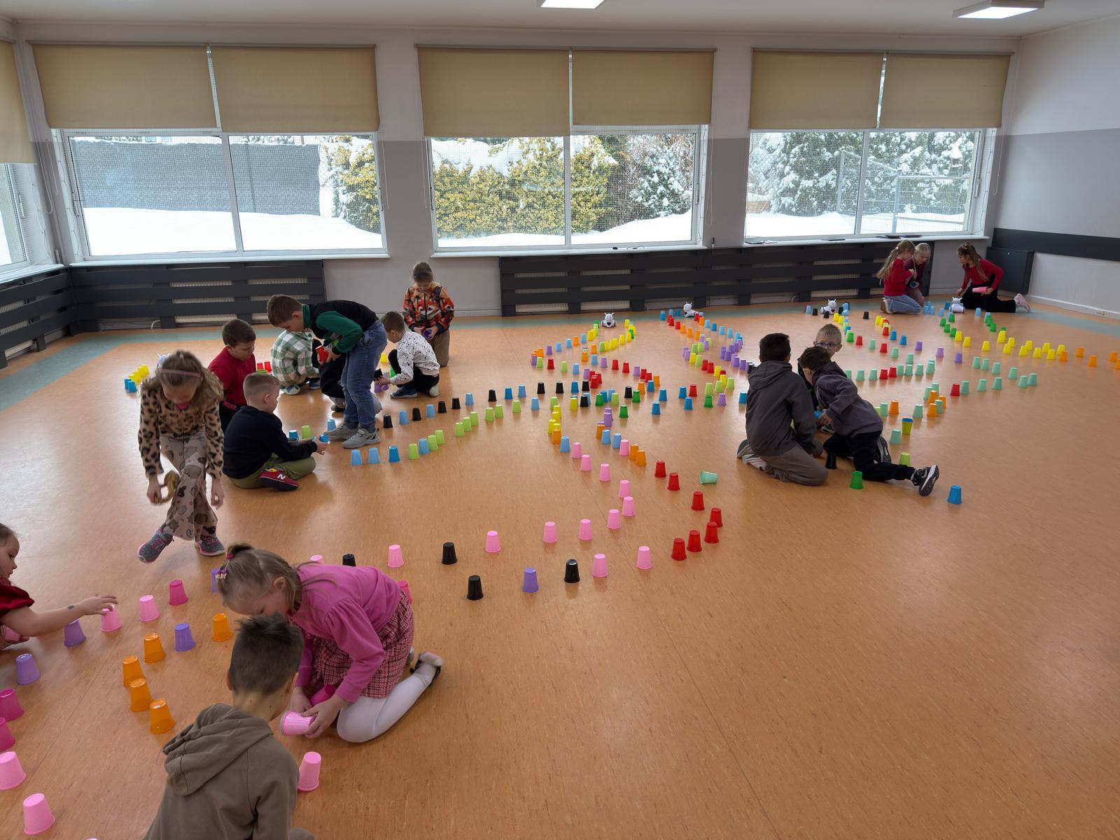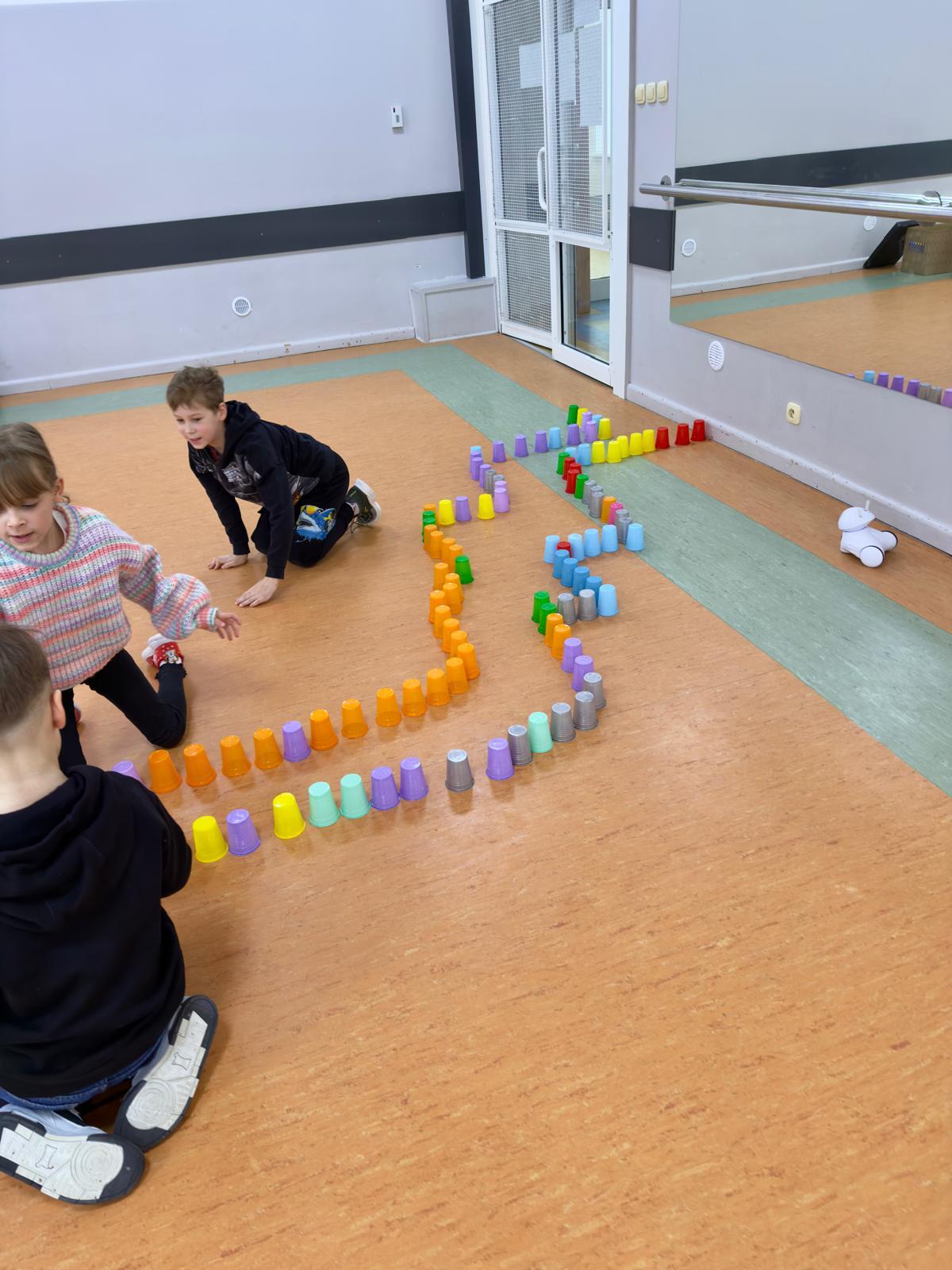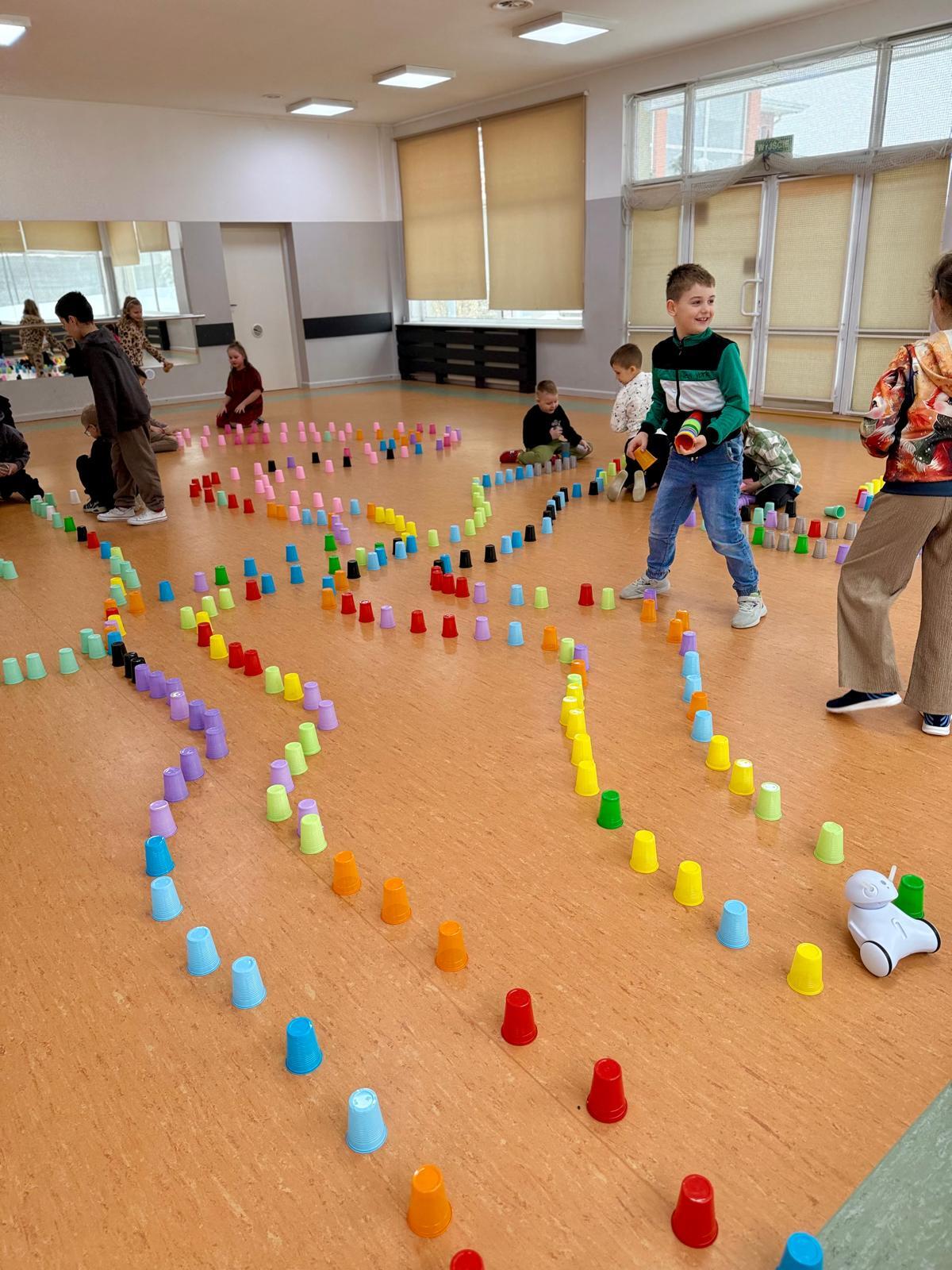 Dzieci pracowały w sześciu grupach. Na początek ich zadaniem było zbudowanie z kolorowych kubeczków drogi dla naszych robotów. Niby proste wyzwanie, a ile w nim było rozmów, negocjacji, pomysłów i śmiechu. Serce naprawdę rośnie, kiedy widzę, jak moje pierwszaki coraz lepiej potrafią się dogadywać.Jak słuchają siebie nawzajem. Jak uczą się, że wspólny cel jest ważniejszy niż „mój pomysł”. Ta współpraca z tygodnia na tydzień dojrzewa — i to jest piękne.