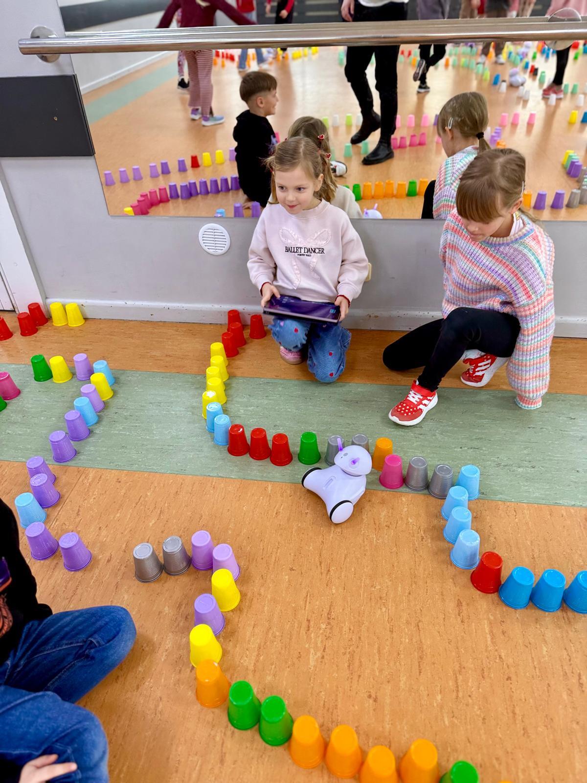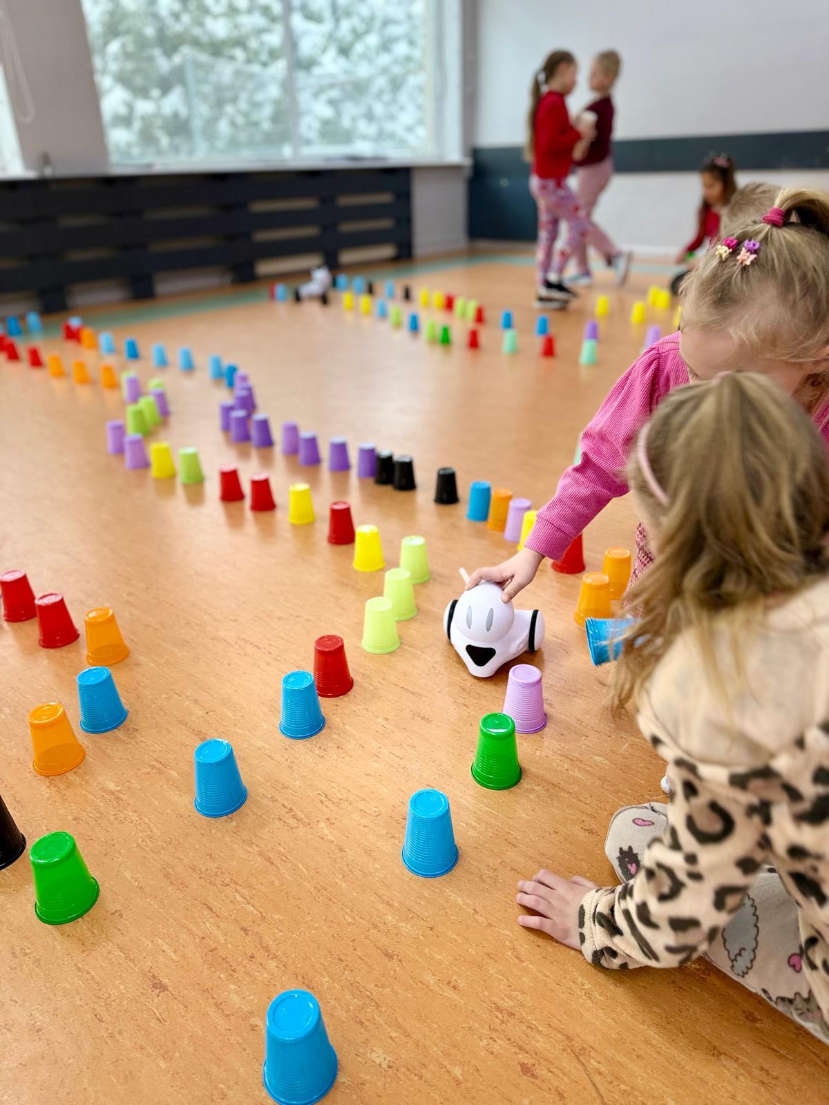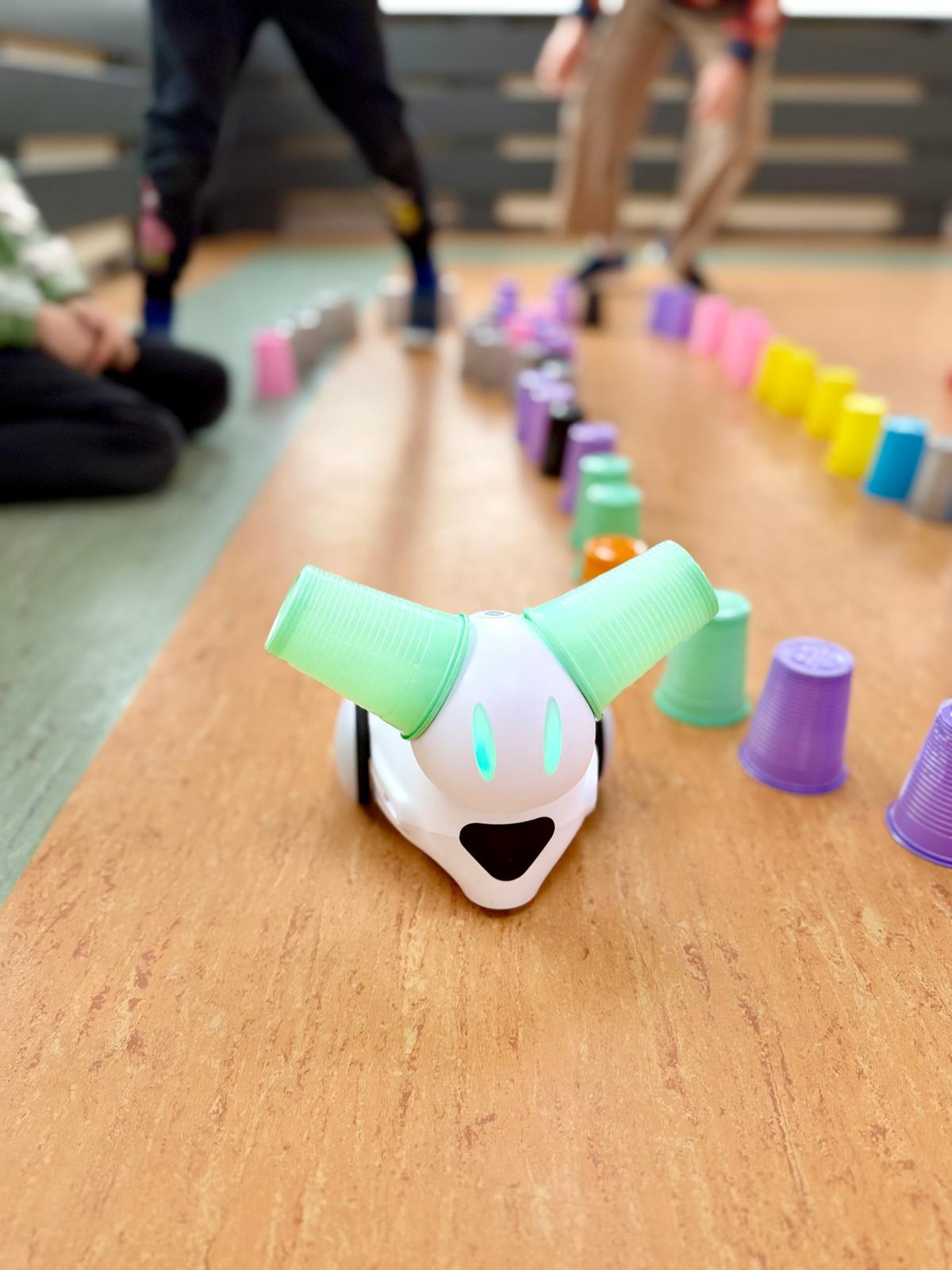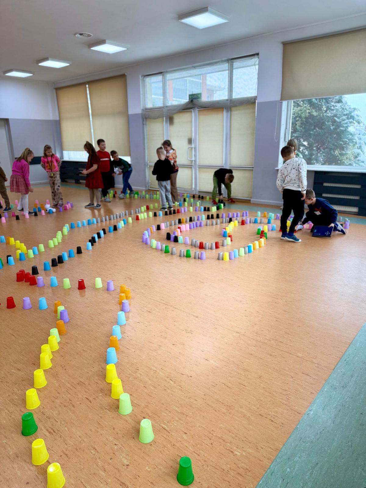 Dzieci pracowały w sześciu grupach. Na początek ich zadaniem było zbudowanie z kolorowych kubeczków drogi dla naszych robotów. Niby proste wyzwanie, a ile w nim było rozmów, negocjacji, pomysłów i śmiechu. Serce naprawdę rośnie, kiedy widzę, jak moje pierwszaki coraz lepiej potrafią się dogadywać.Jak słuchają siebie nawzajem. Jak uczą się, że wspólny cel jest ważniejszy niż „mój pomysł”. Ta współpraca z tygodnia na tydzień dojrzewa — i to jest piękne.