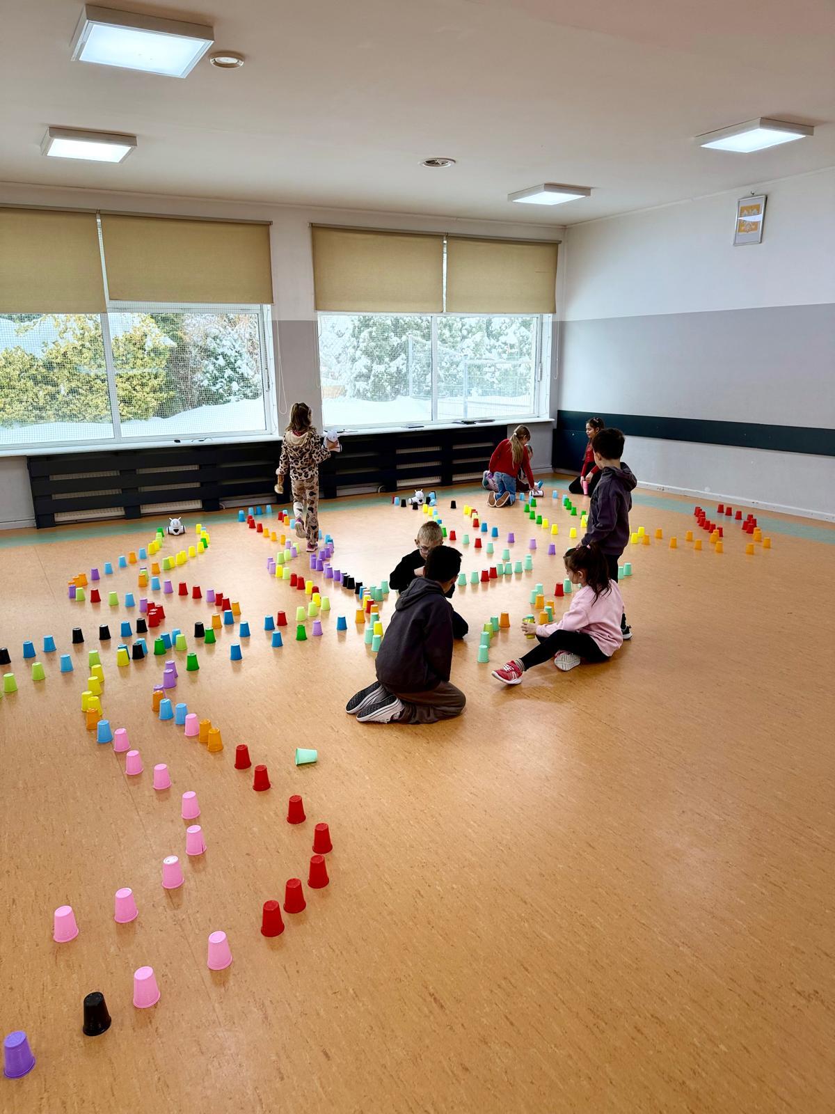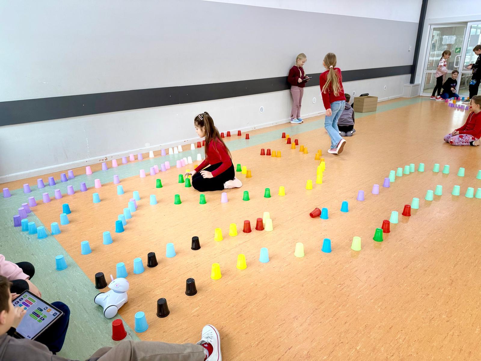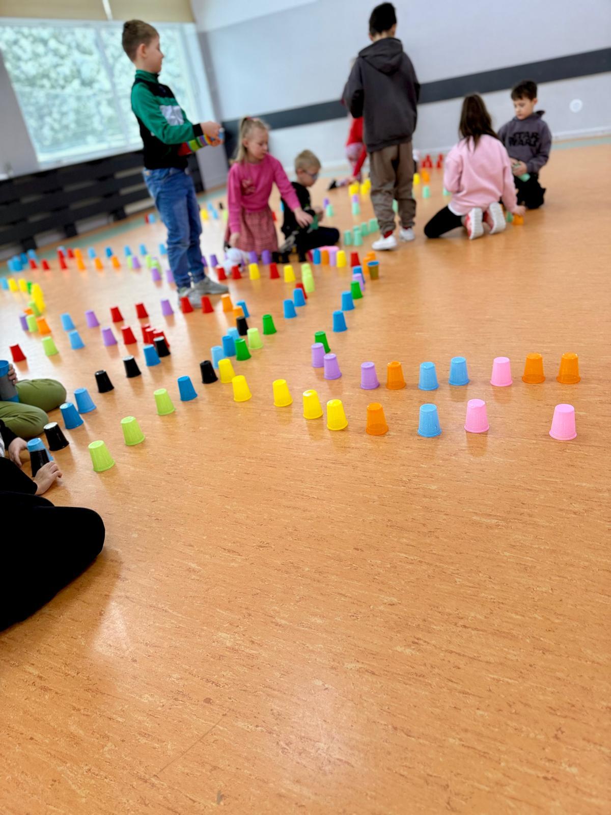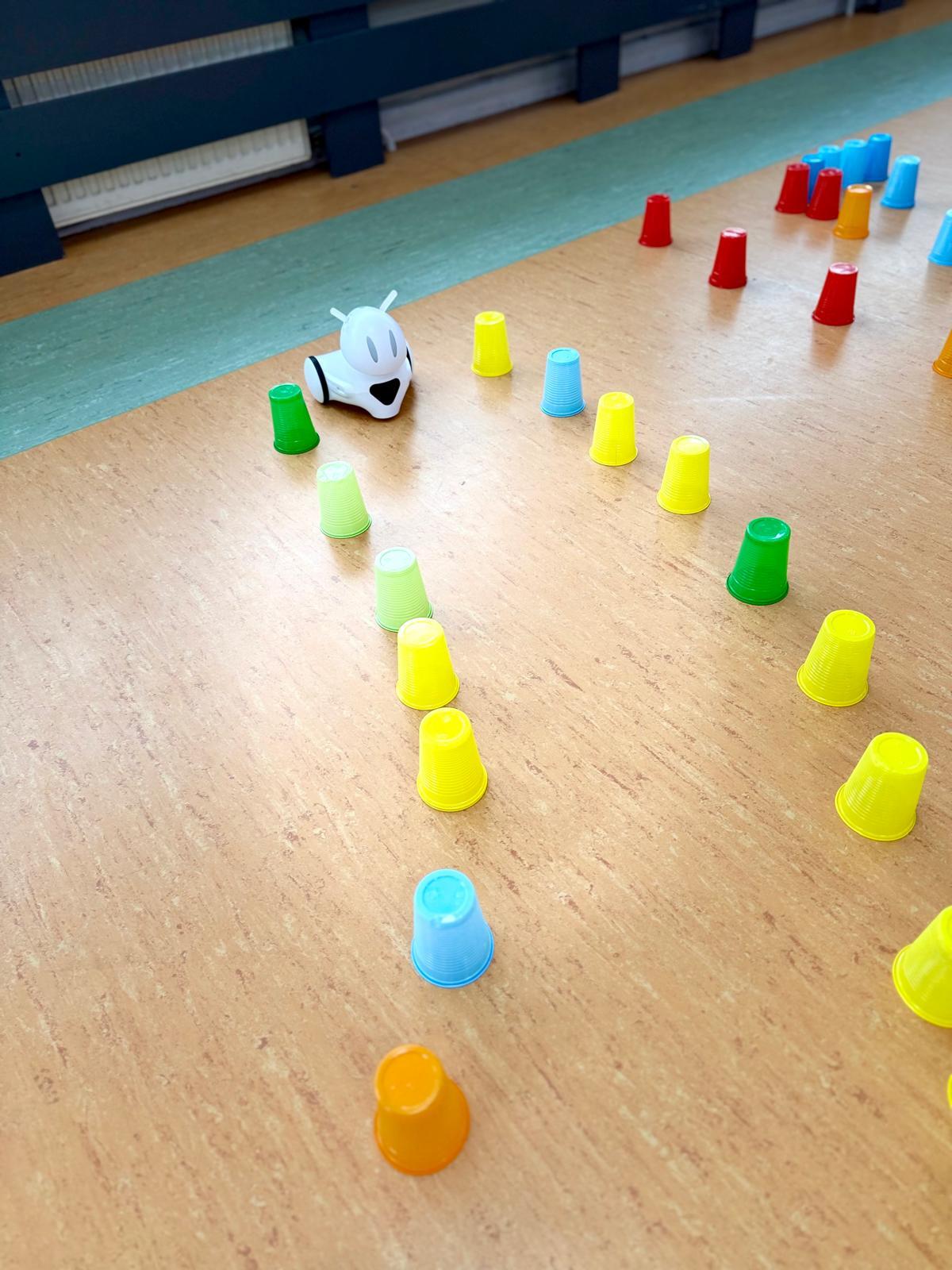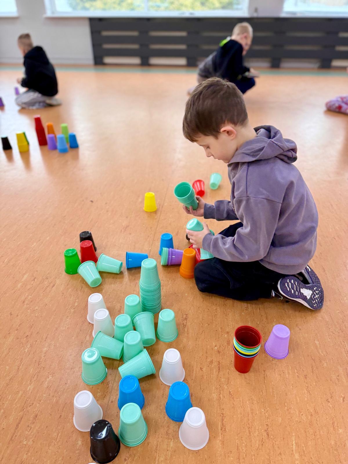 Dzieci pracowały w sześciu grupach. Na początek ich zadaniem było zbudowanie z kolorowych kubeczków drogi dla naszych robotów. Niby proste wyzwanie, a ile w nim było rozmów, negocjacji, pomysłów i śmiechu. Serce naprawdę rośnie, kiedy widzę, jak moje pierwszaki coraz lepiej potrafią się dogadywać.Jak słuchają siebie nawzajem. Jak uczą się, że wspólny cel jest ważniejszy niż „mój pomysł”. Ta współpraca z tygodnia na tydzień dojrzewa — i to jest piękne.