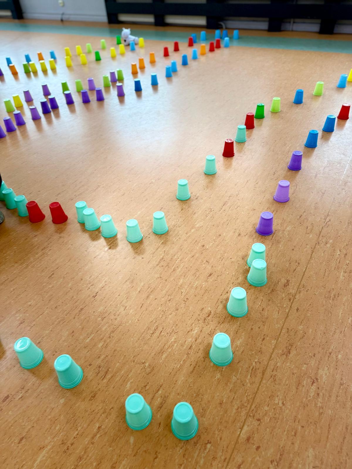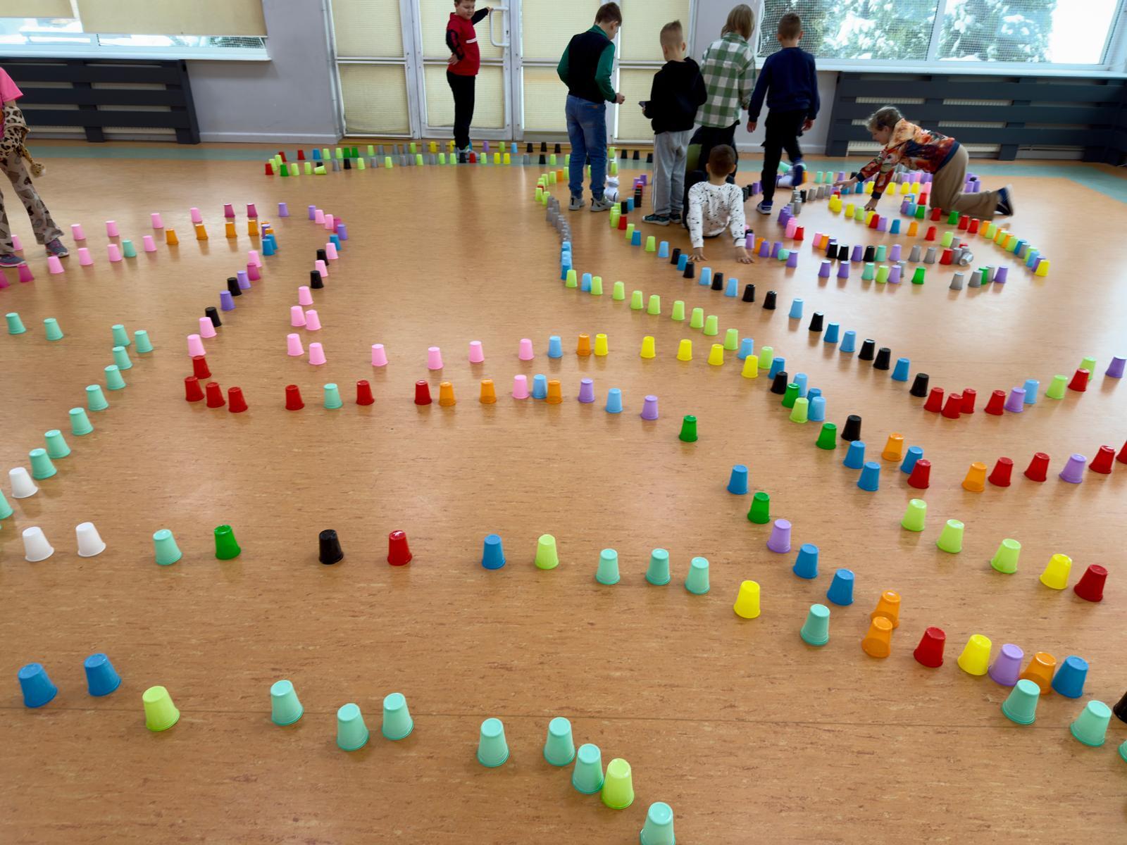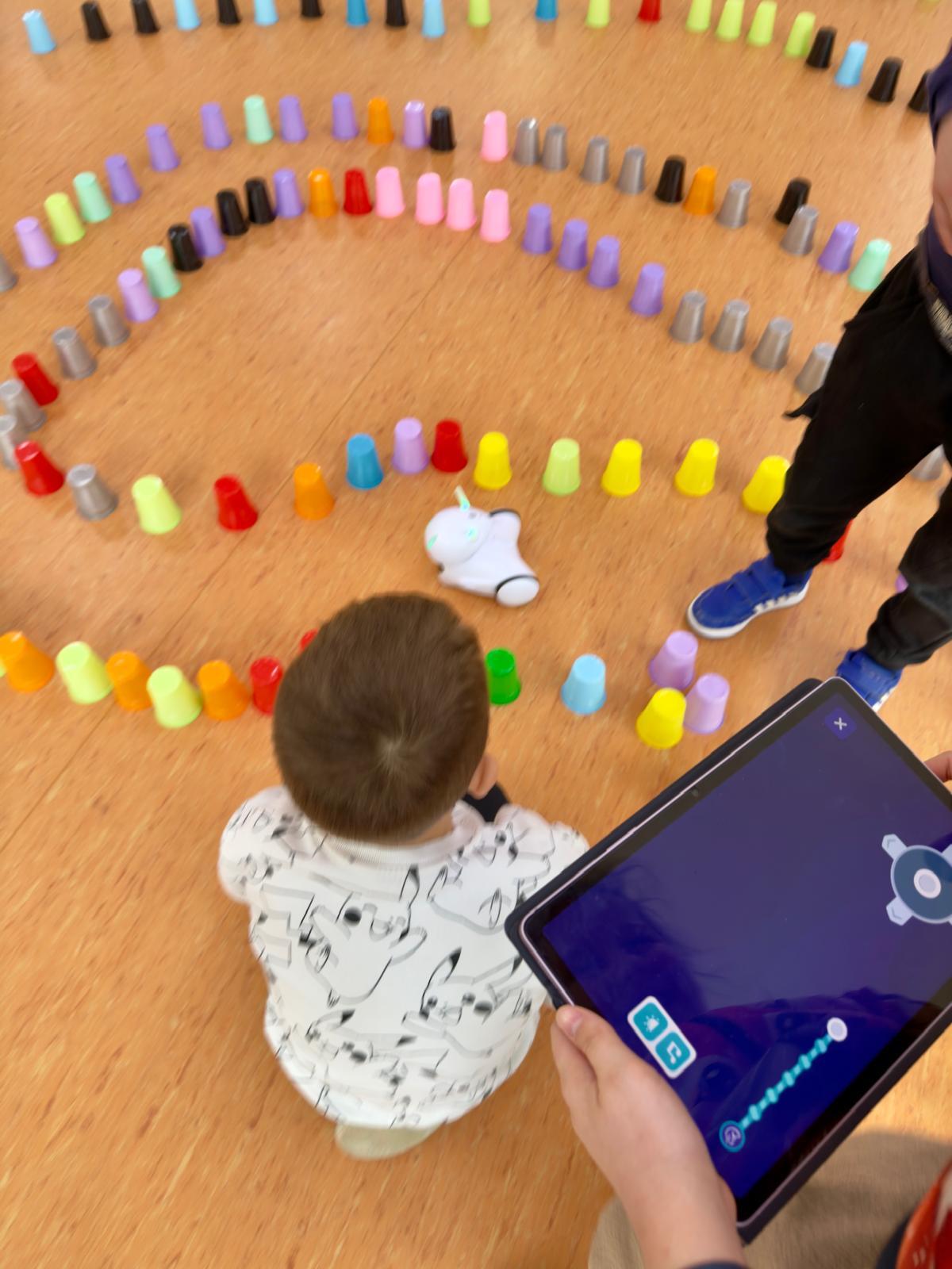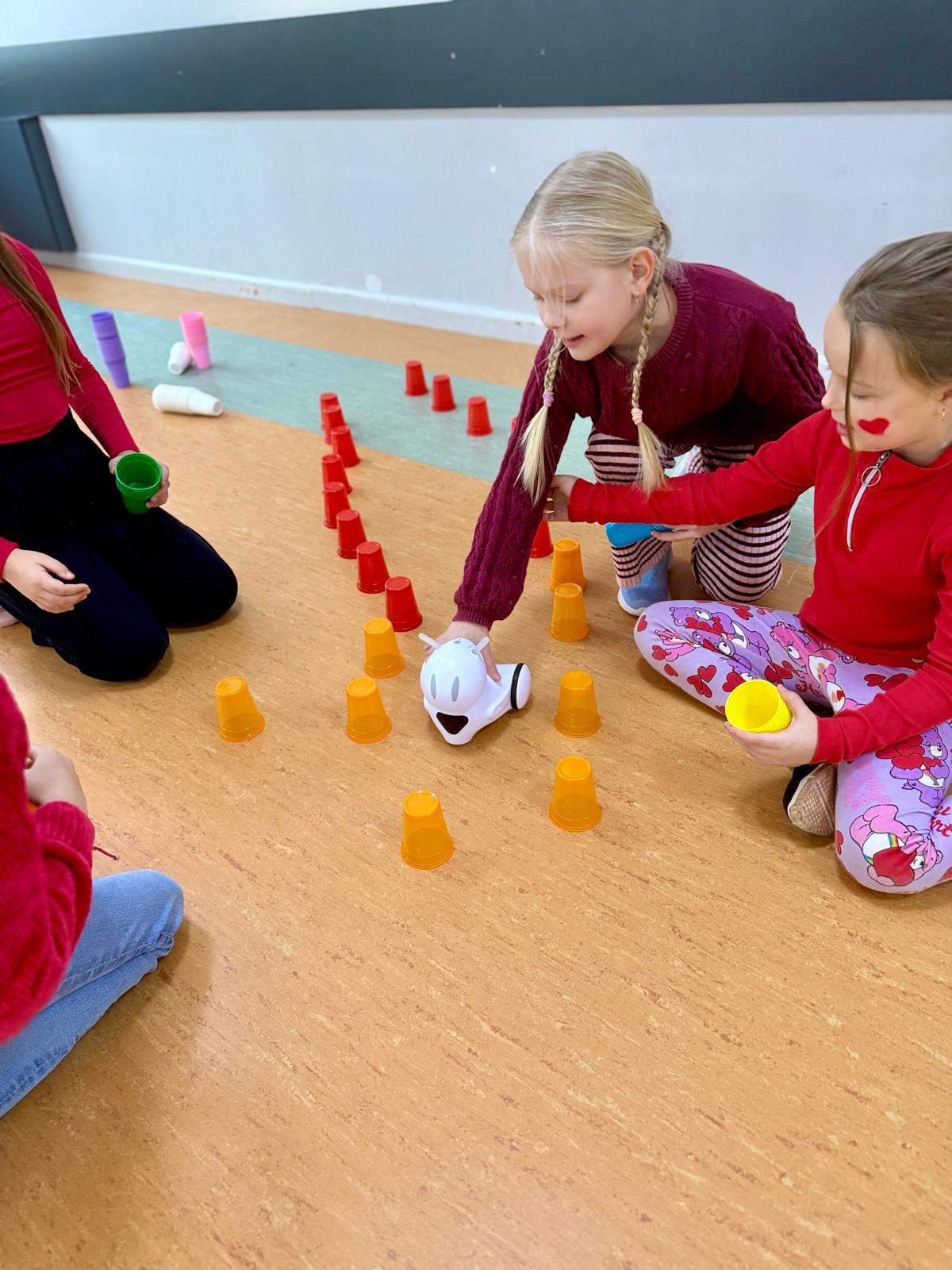 Dzieci pracowały w sześciu grupach. Na początek ich zadaniem było zbudowanie z kolorowych kubeczków drogi dla naszych robotów. Niby proste wyzwanie, a ile w nim było rozmów, negocjacji, pomysłów i śmiechu. Serce naprawdę rośnie, kiedy widzę, jak moje pierwszaki coraz lepiej potrafią się dogadywać.Jak słuchają siebie nawzajem. Jak uczą się, że wspólny cel jest ważniejszy niż „mój pomysł”. Ta współpraca z tygodnia na tydzień dojrzewa — i to jest piękne.