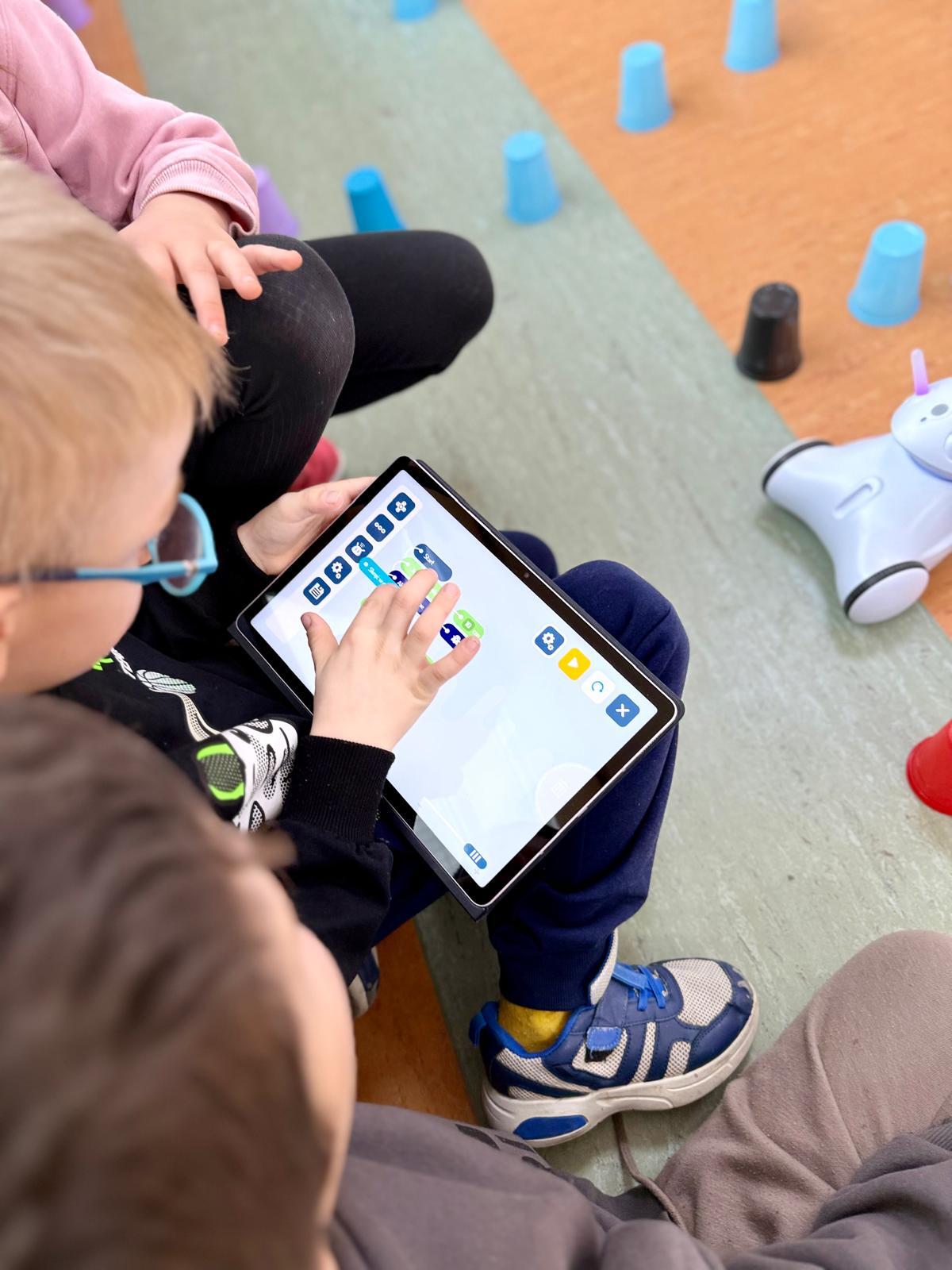 Gdy drogi były gotowe, uruchomiliśmy roboty. Najpierw dzieci sterowały nimi w aplikacji PhotonEdu, korzystając z funkcji Joystick. Było dużo emocji, prób i błędów, czasem śmiechu, czasem skupienia. Potem przeszliśmy do Photon Blocks — układaliśmy sekwencje poleceń tak, aby robot samodzielnie przejechał wyznaczoną trasę. I tu zaczęła się prawdziwa magia myślenia: planowanie, przewidywanie, poprawianie, analizowanie.