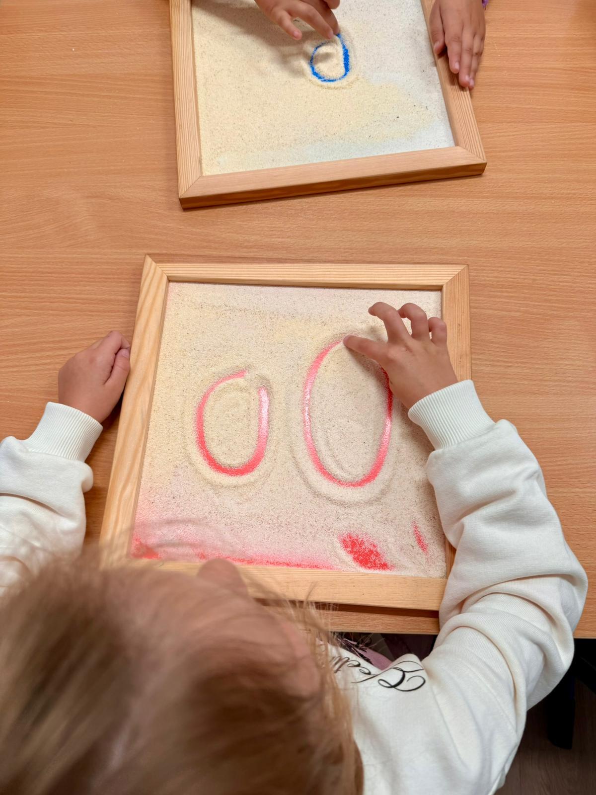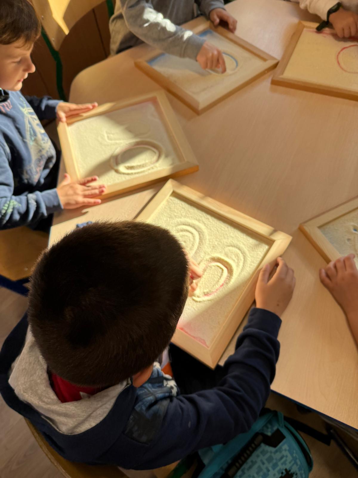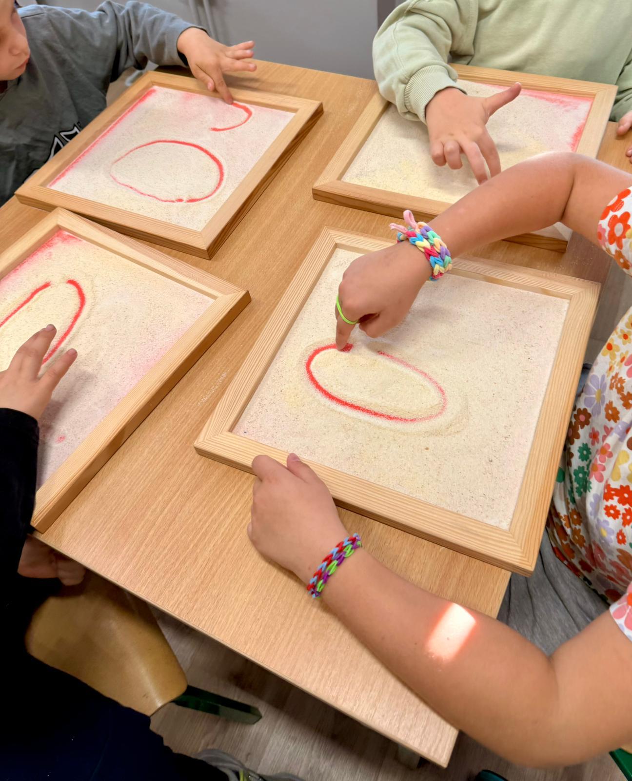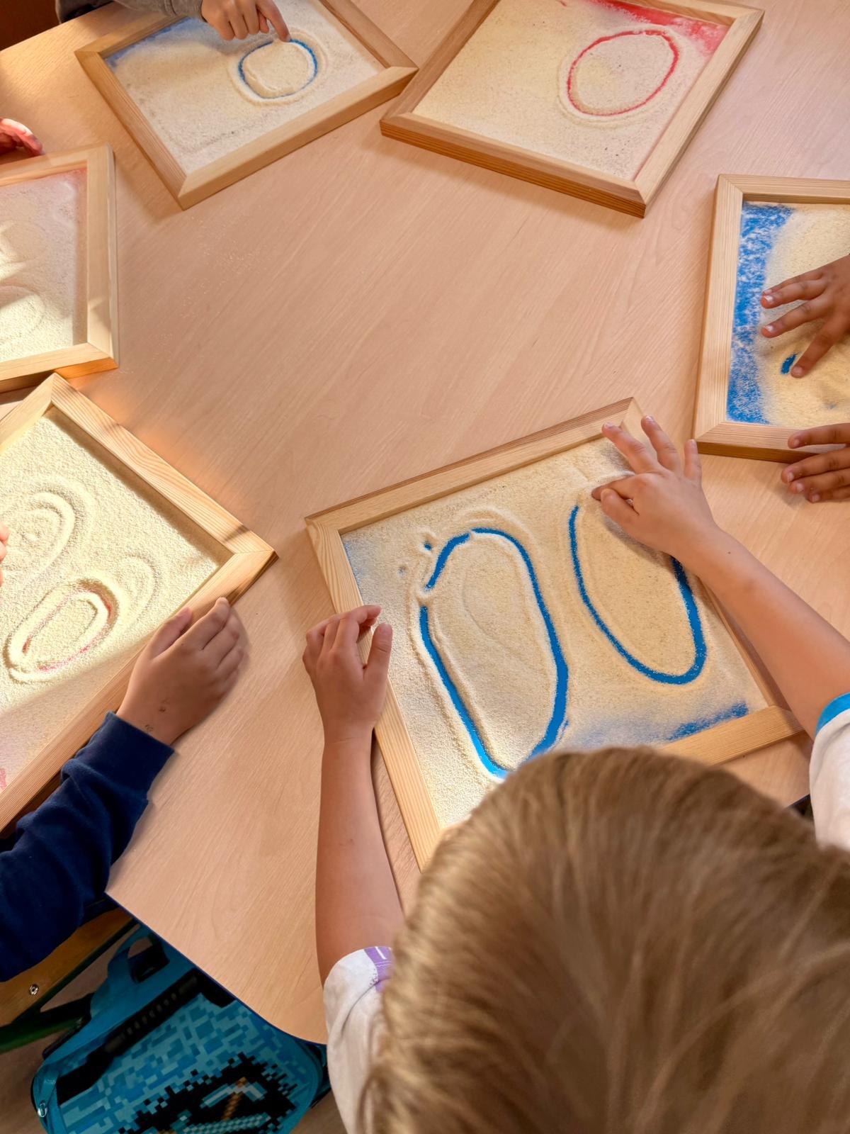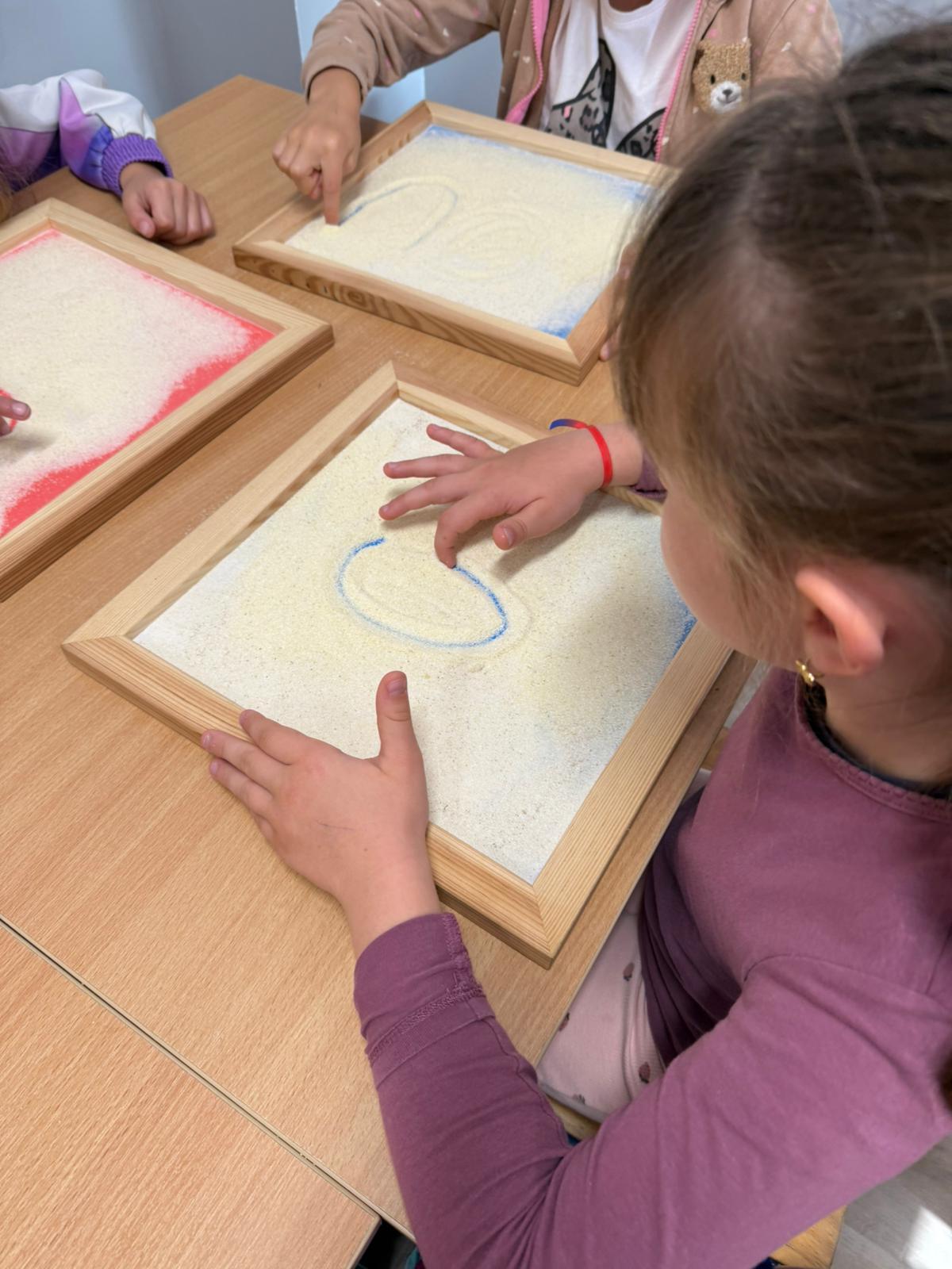 To są te małe sekrety liter, które dzieci odkrywają z zaciekawieniem. Potem bawimy się w „pisanie w powietrzu” – wielkimi ruchami ramion, całym ciałem. Zdarza się, że litery „rysujemy” na plecach kolegi, a on zgaduje, jaka to litera. Kolejnym etapem są tacki z kaszą – gdzie palcem można odtwarzać kształt, a jednocześnie czuć lekki opór pod palcami.