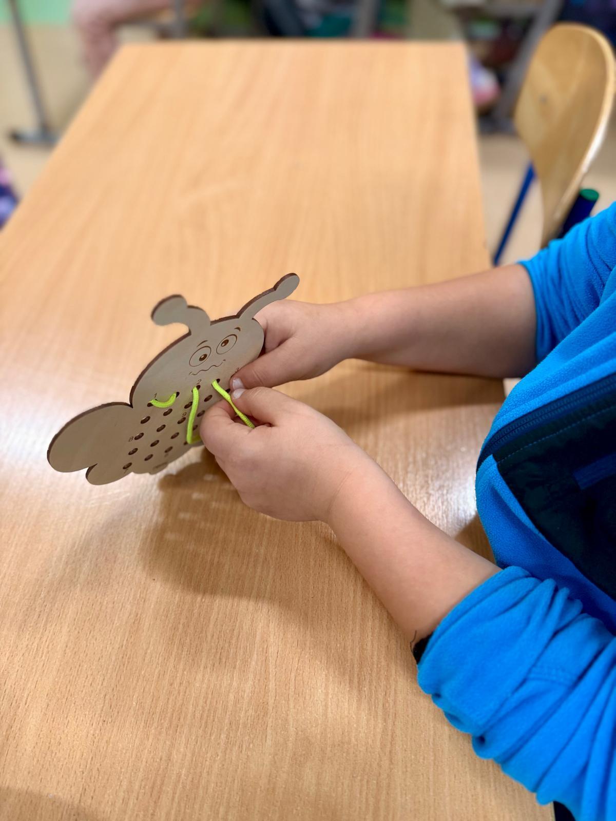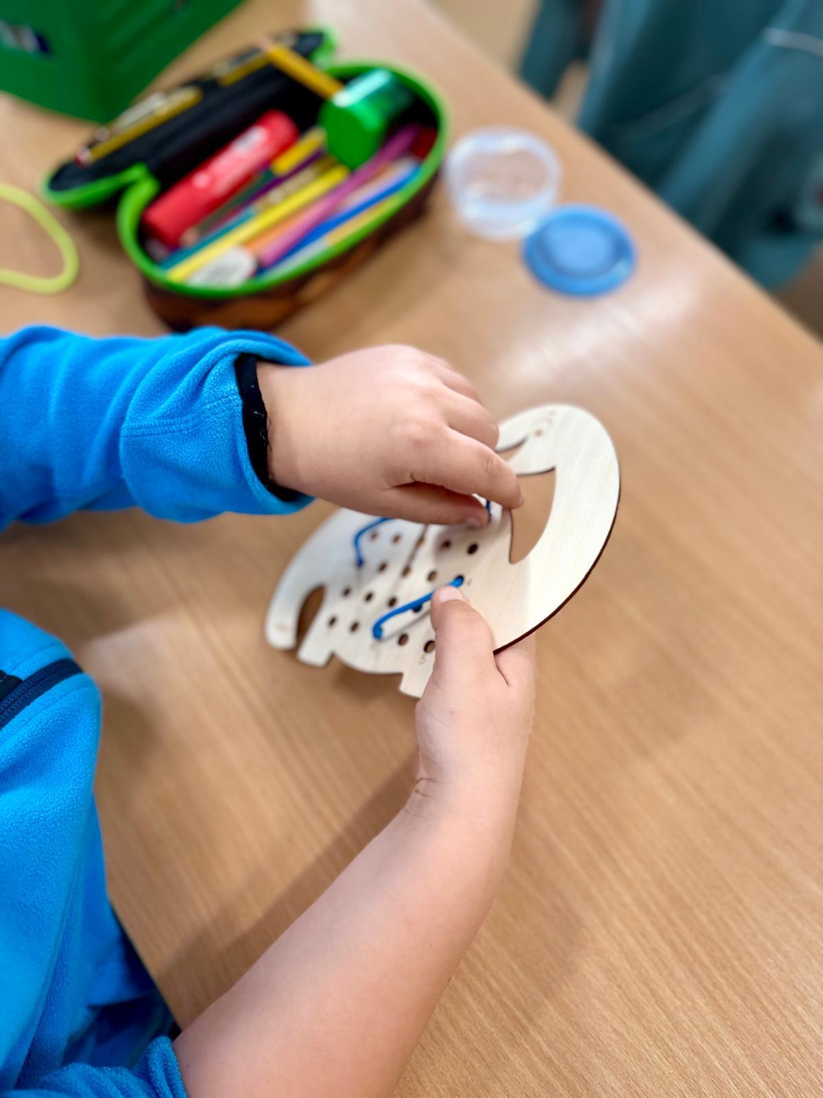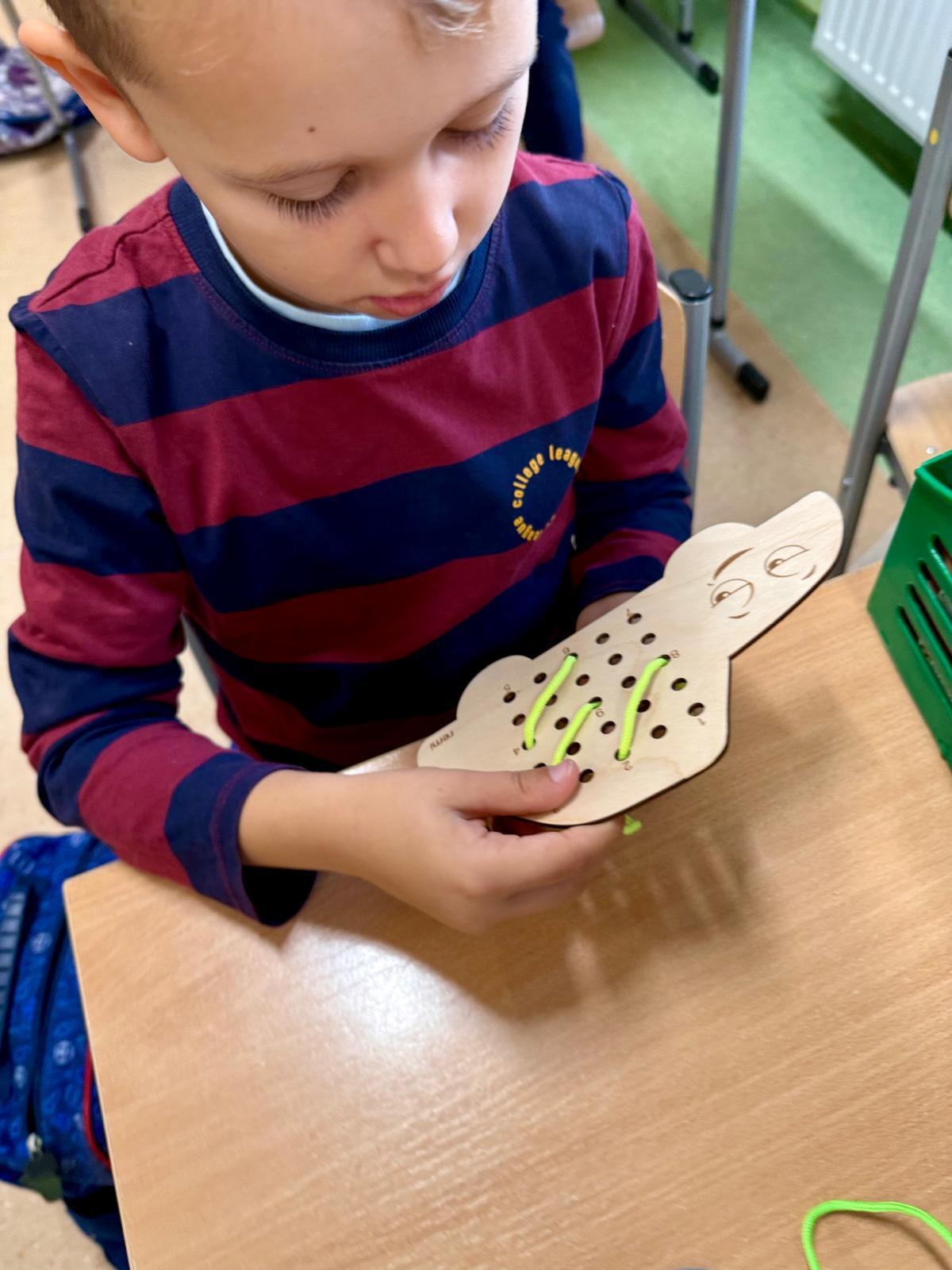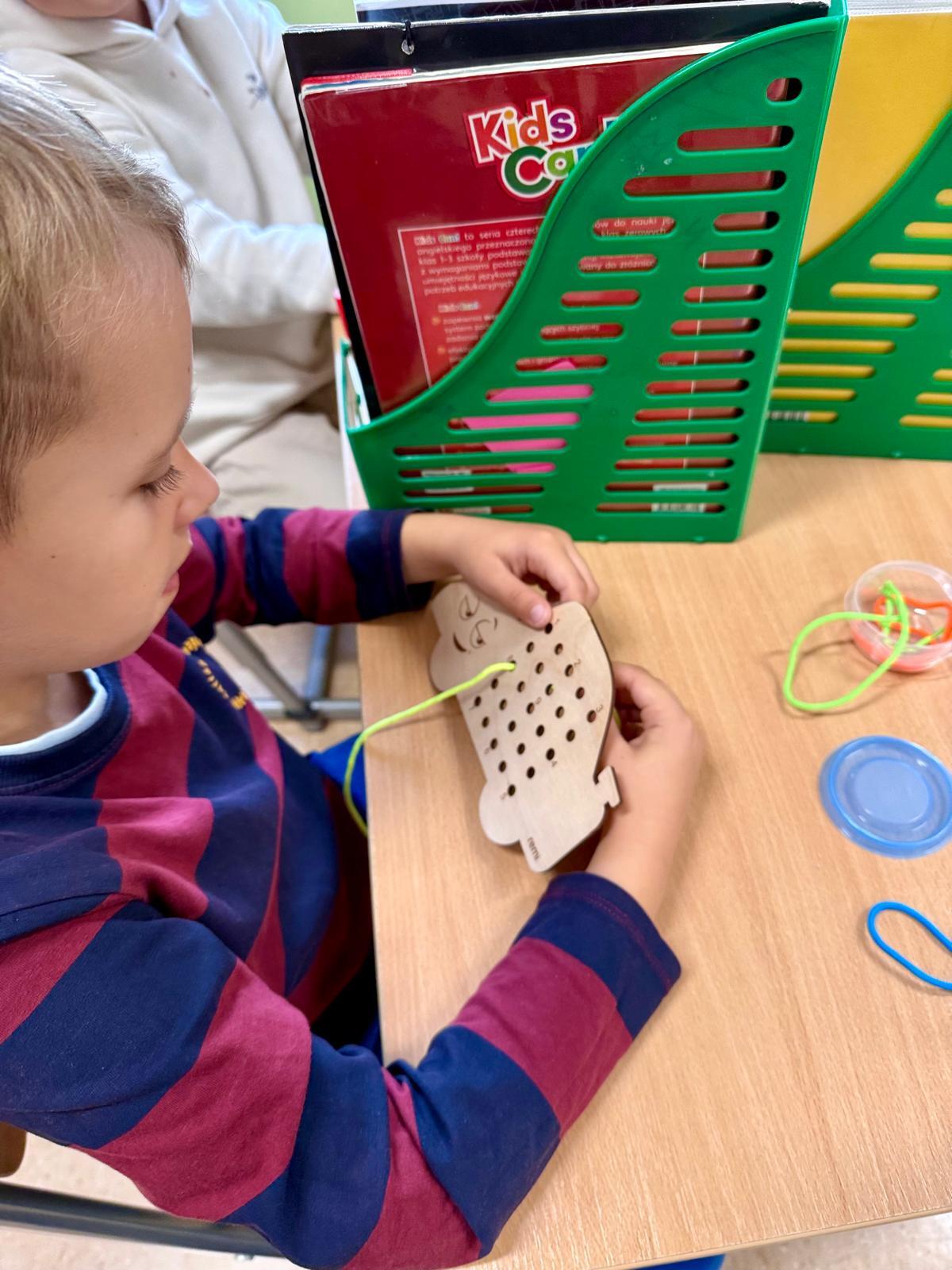 Podczas zajęć Bystrzaki słuchały słownych zadań graficznych, w których należało przewlec sznurówkę w odpowiednim miejscu, zachowując rytm, kierunek i koncentrację. Inne ćwiczenia polegały na tworzeniu wzorów na podstawie ilustracji lub według własnego pomysłu. W ten sposób dzieci ćwiczyły słuchanie ze zrozumieniem, orientację przestrzenną, sprawność manualną i – co równie ważne – cierpliwość oraz skupienie na zadaniu.
