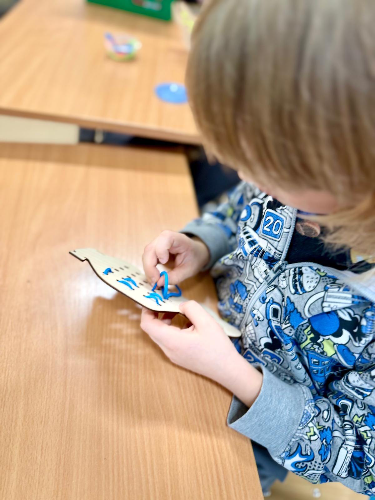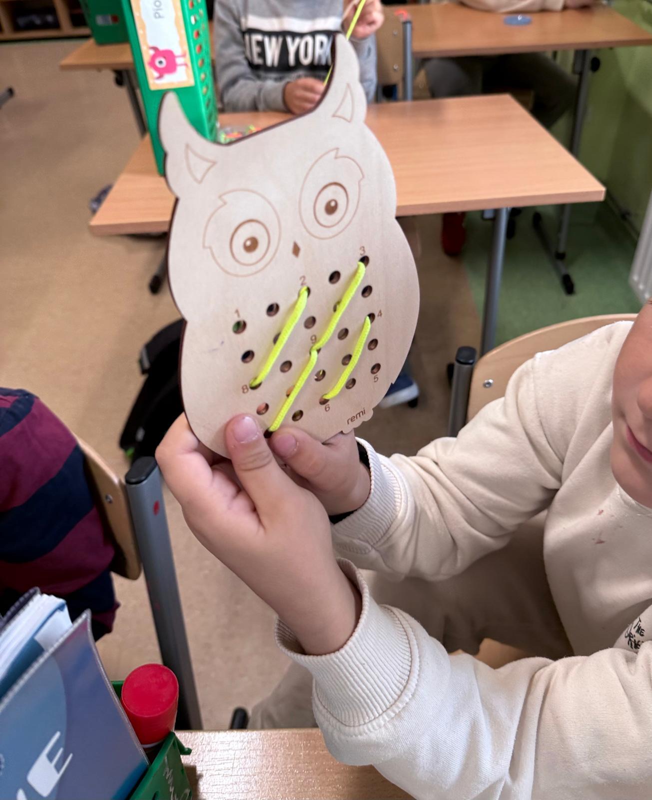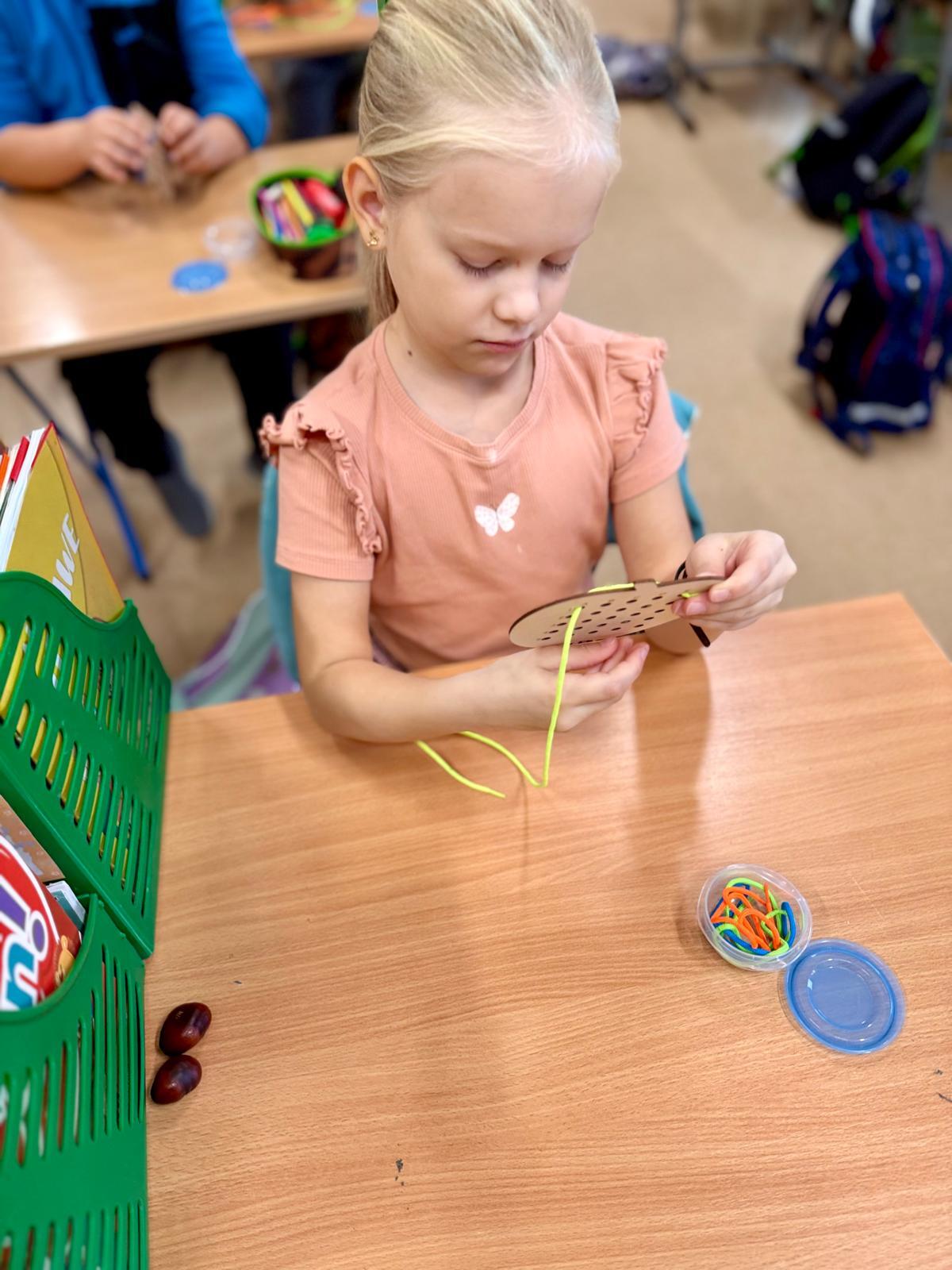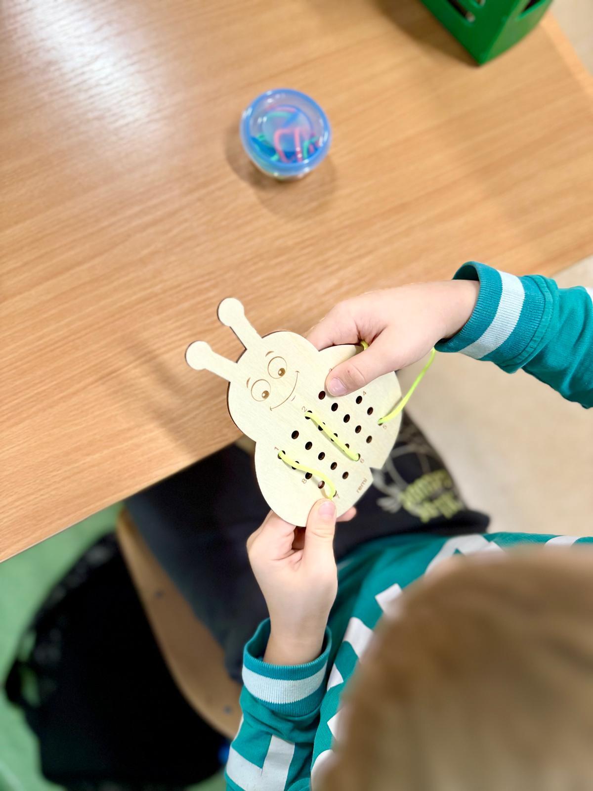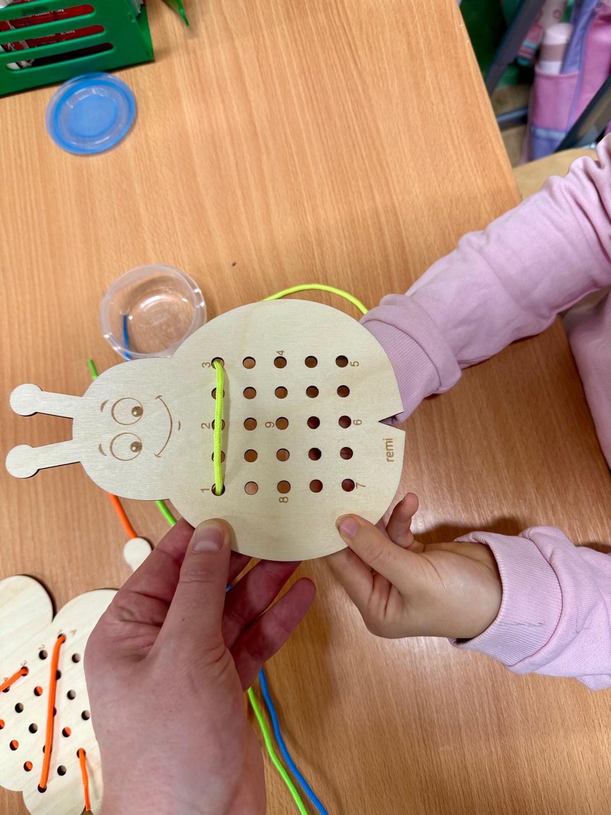 Podczas zajęć Bystrzaki słuchały słownych zadań graficznych, w których należało przewlec sznurówkę w odpowiednim miejscu, zachowując rytm, kierunek i koncentrację. Inne ćwiczenia polegały na tworzeniu wzorów na podstawie ilustracji lub według własnego pomysłu. W ten sposób dzieci ćwiczyły słuchanie ze zrozumieniem, orientację przestrzenną, sprawność manualną i – co równie ważne – cierpliwość oraz skupienie na zadaniu.