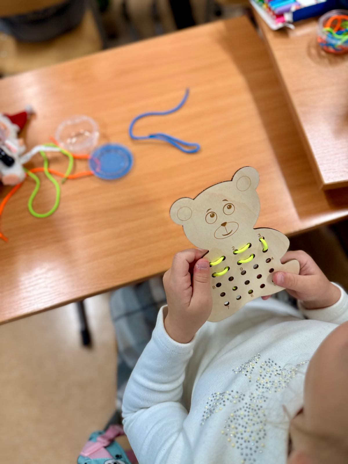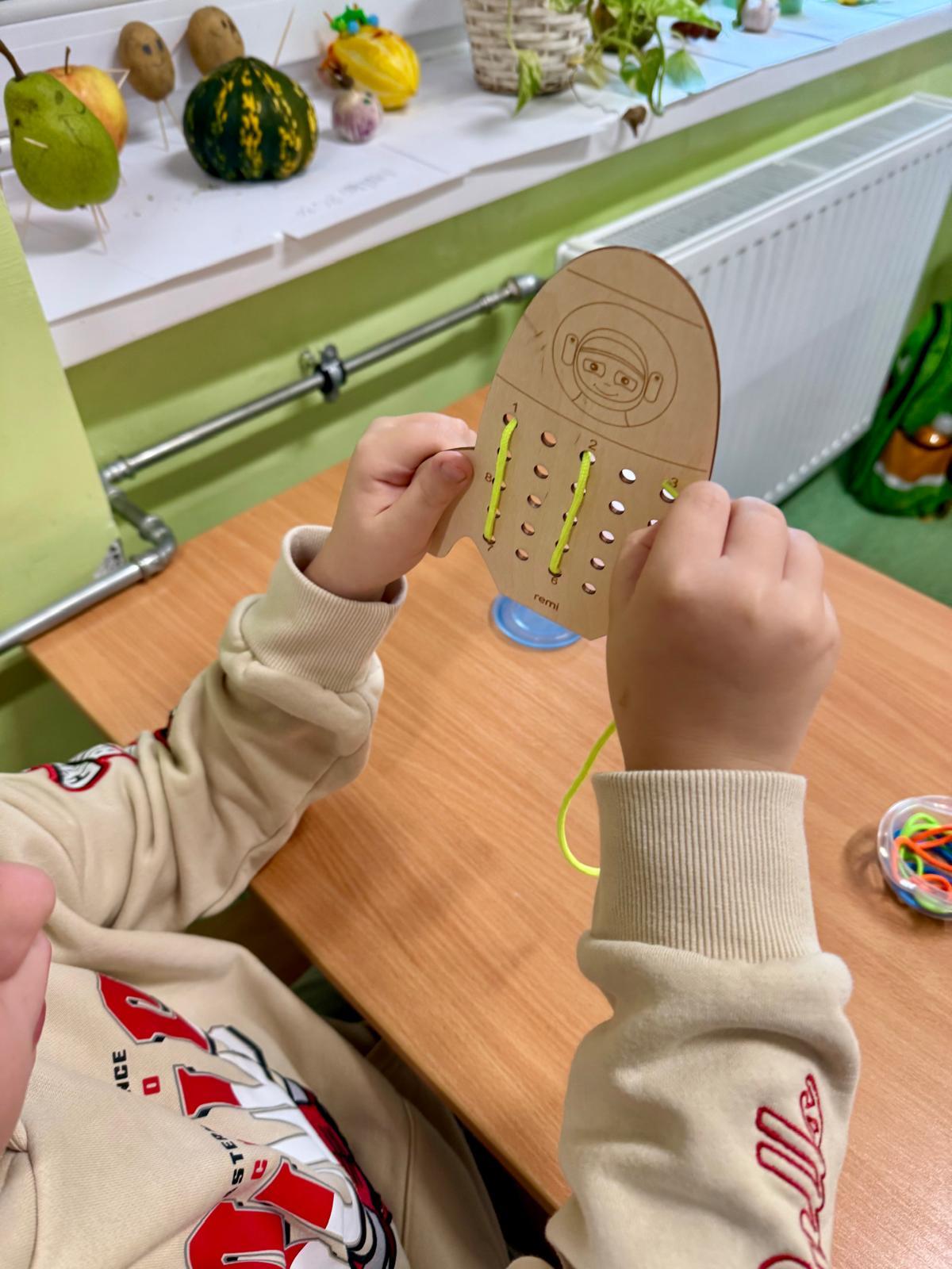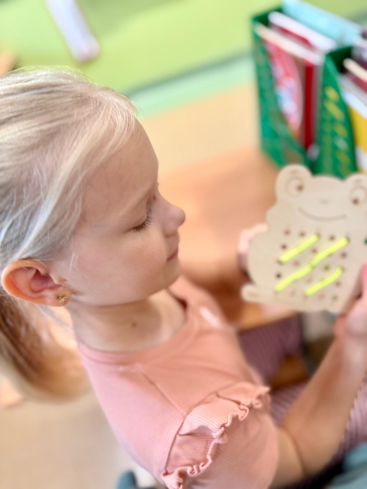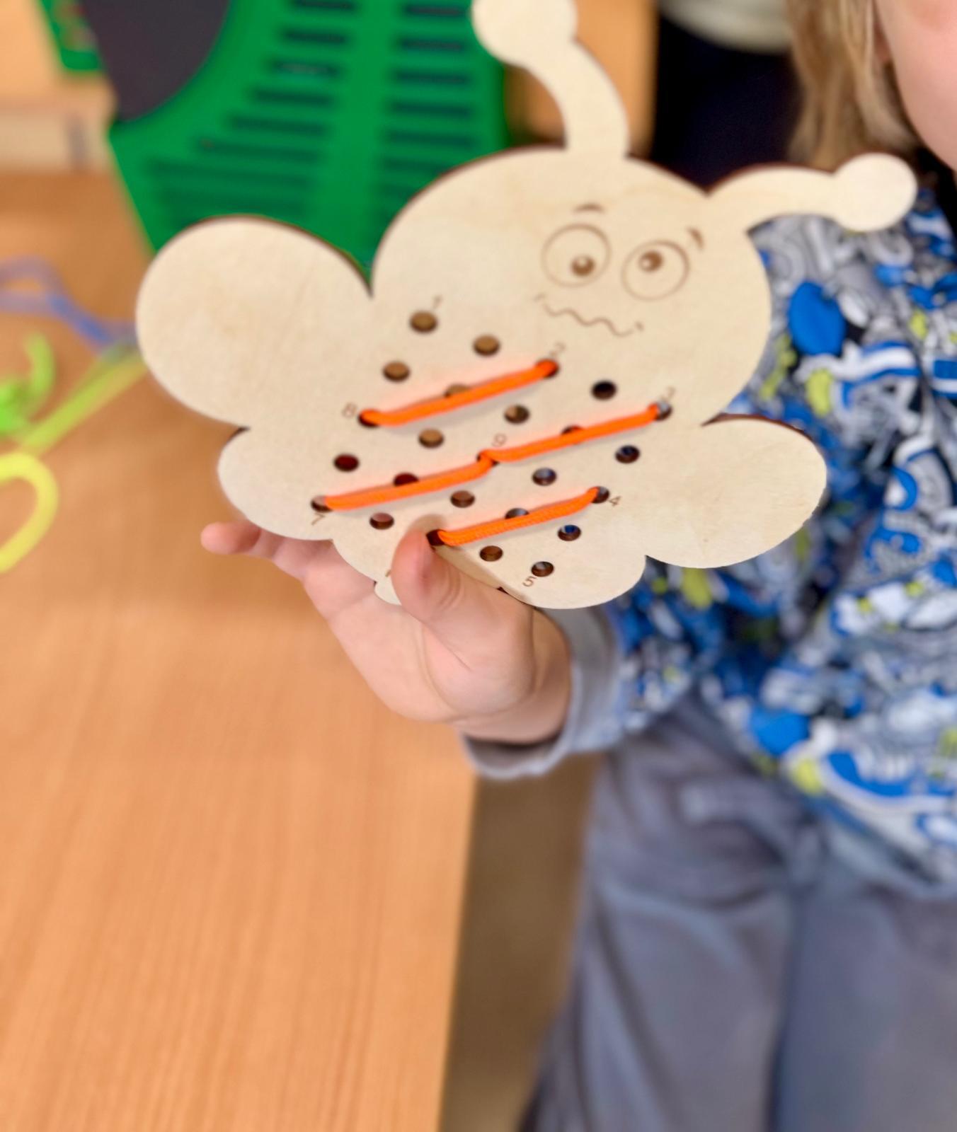 Podczas zajęć Bystrzaki słuchały słownych zadań graficznych, w których należało przewlec sznurówkę w odpowiednim miejscu, zachowując rytm, kierunek i koncentrację. Inne ćwiczenia polegały na tworzeniu wzorów na podstawie ilustracji lub według własnego pomysłu. W ten sposób dzieci ćwiczyły słuchanie ze zrozumieniem, orientację przestrzenną, sprawność manualną i – co równie ważne – cierpliwość oraz skupienie na zadaniu.