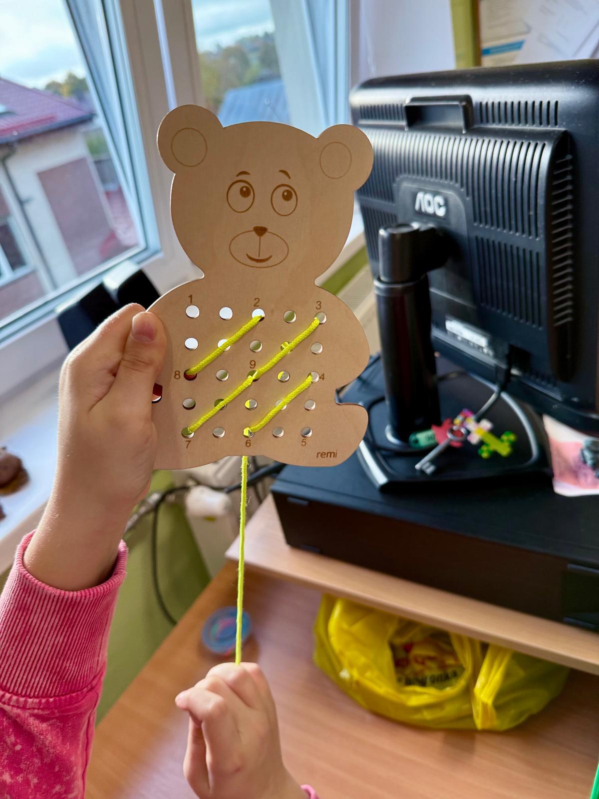TIXI to zestaw do terapii ręki i ćwiczeń manualnych, który łączy elementy edukacji, terapii i zabawy. Dzieci pracują na specjalnych tabliczkach, przez które przewlekają kolorowe sznurówki, tworząc wzory według instrukcji słownej, graficznej lub własnej wyobraźni. Każde ćwiczenie to małe wyzwanie – trzeba słuchać uważnie, planować ruchy, przewidywać i działać z precyzją.