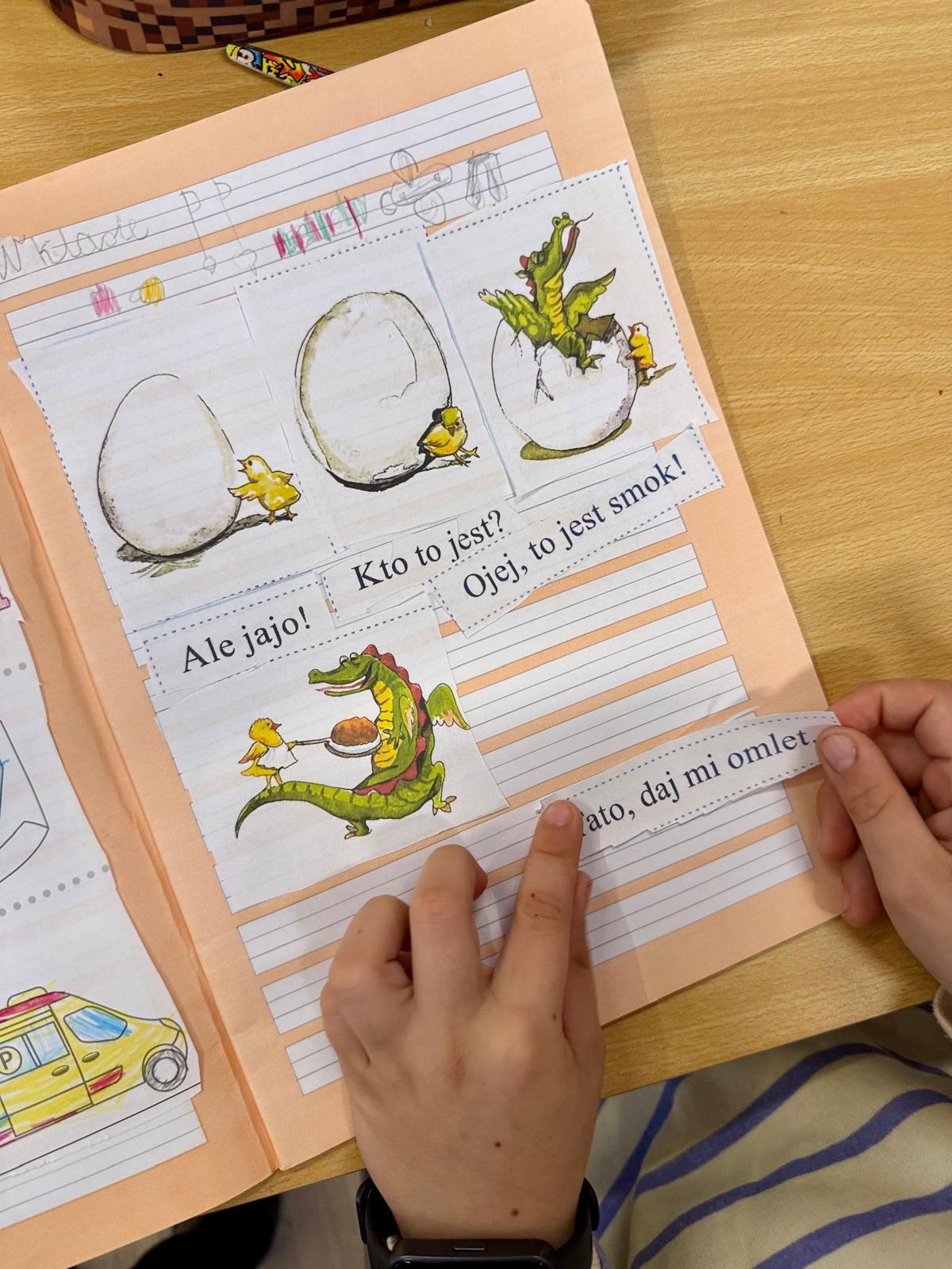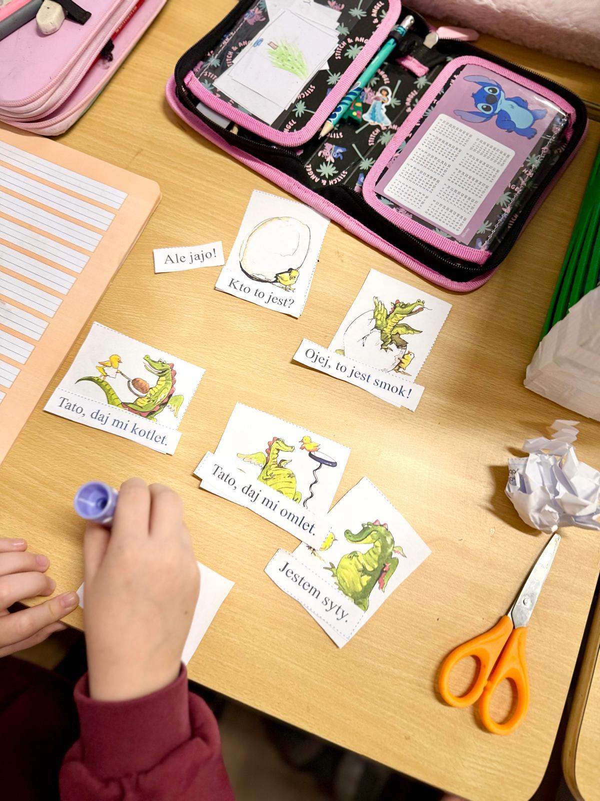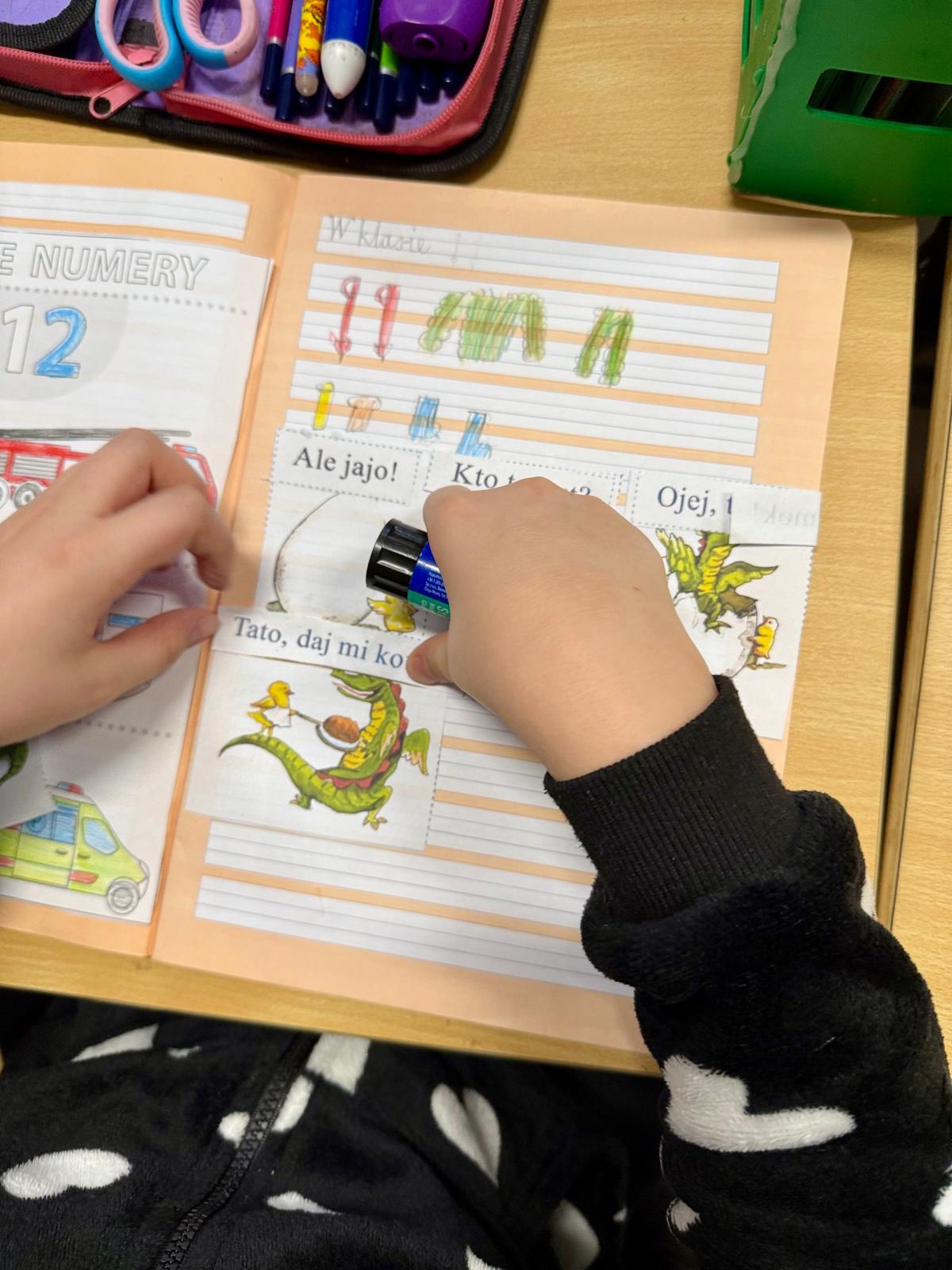 Na zdjęciach widać zeszyty pierwszoklasistów. Kilka obrazków, krótkie zdania, nożyczki, klej. Dla kogoś z zewnątrz — zwykła „układanka”. Dla mnie — jedno z ważniejszych ćwiczeń w nauce czytania. Dzieci miały za zadanie ułożyć historyjkę w odpowiedniej kolejności i dopasować zdania do obrazków. Brzmi prosto? Tylko pozornie. Bo to zadanie nie sprawdzało, czy dziecko potrafi czytać. Sprawdzało, czy rozumie to, co czyta.
