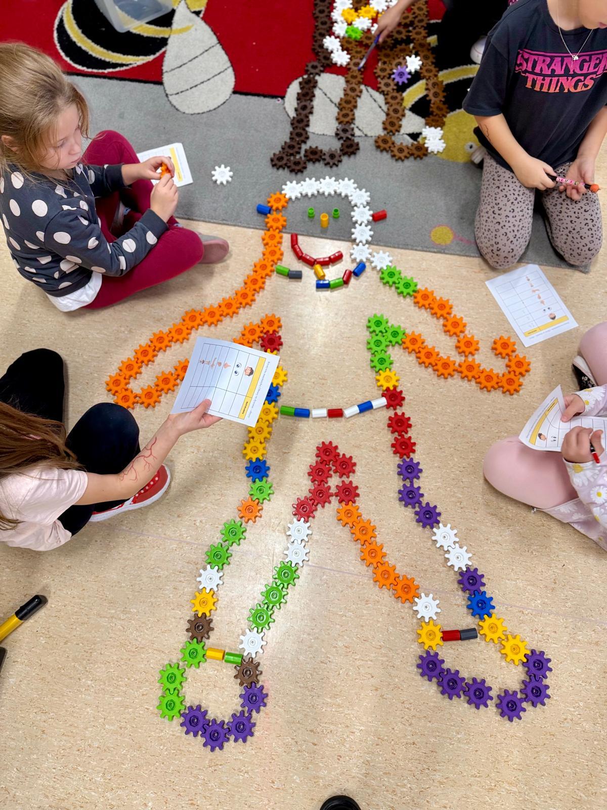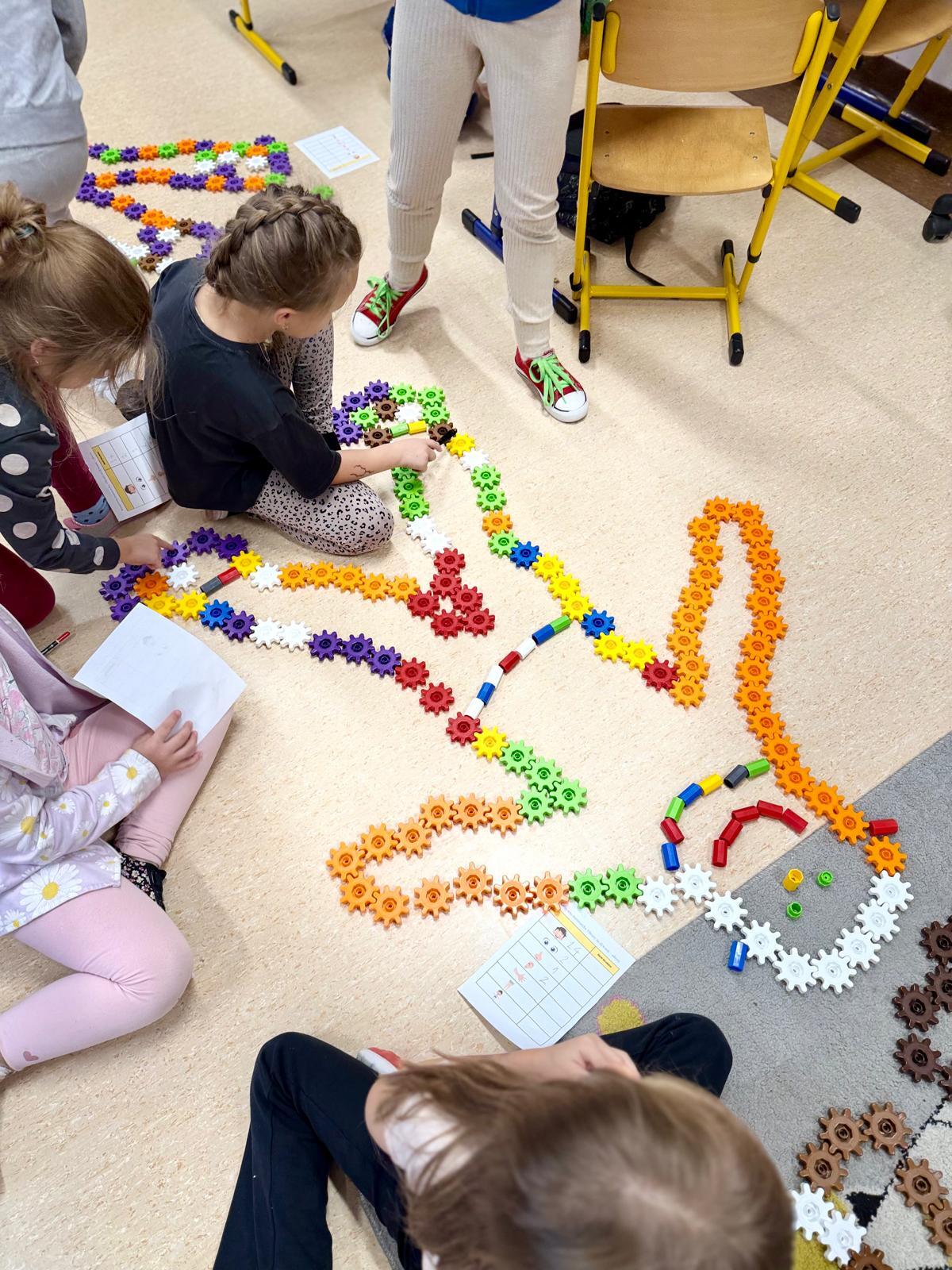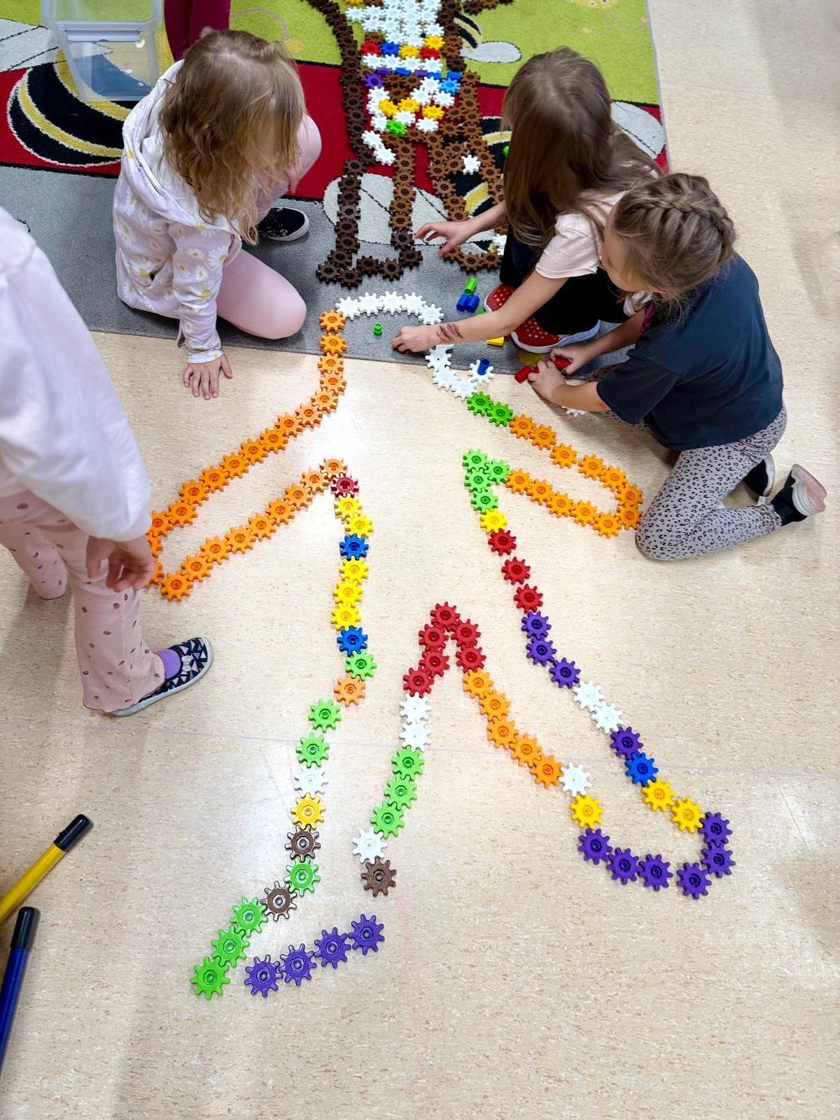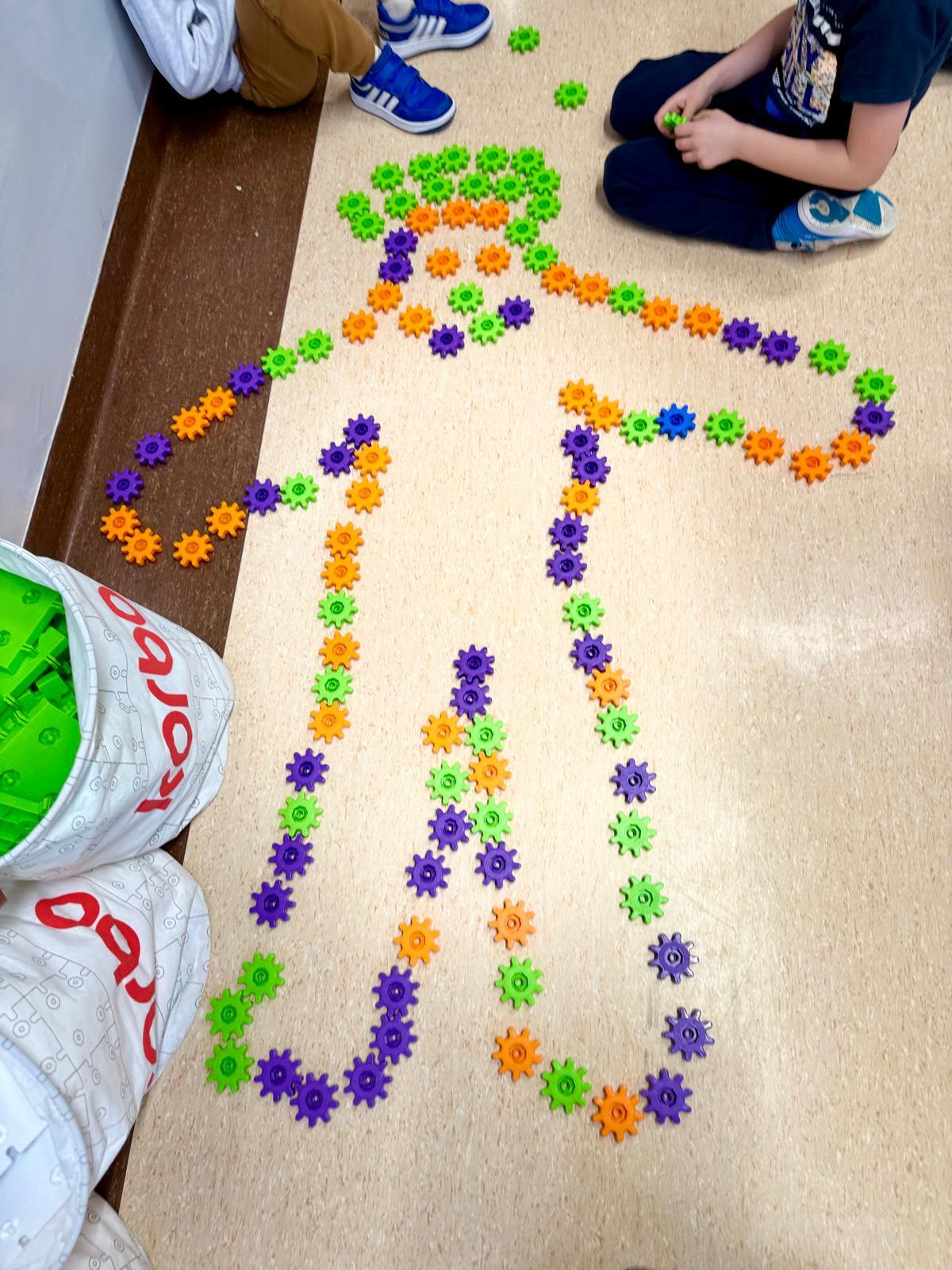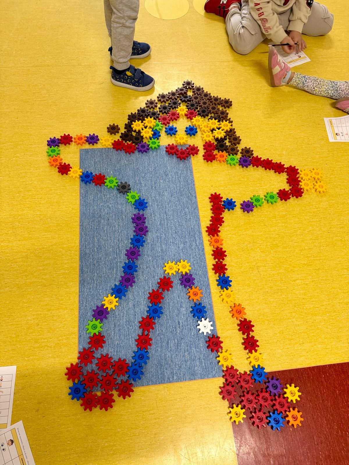 Na ostatnich zajęciach dzieci tworzyły obrysy swojego ciała z klocków Korbo. Zostali podzieleni na zespoły – w każdym wybrano jedną osobę, która położyła się na dywanie. Pozostali z zapałem układali z kółeczek obrys jej sylwetki. Ile tam było śmiechu, ile współpracy, ile pomysłów!