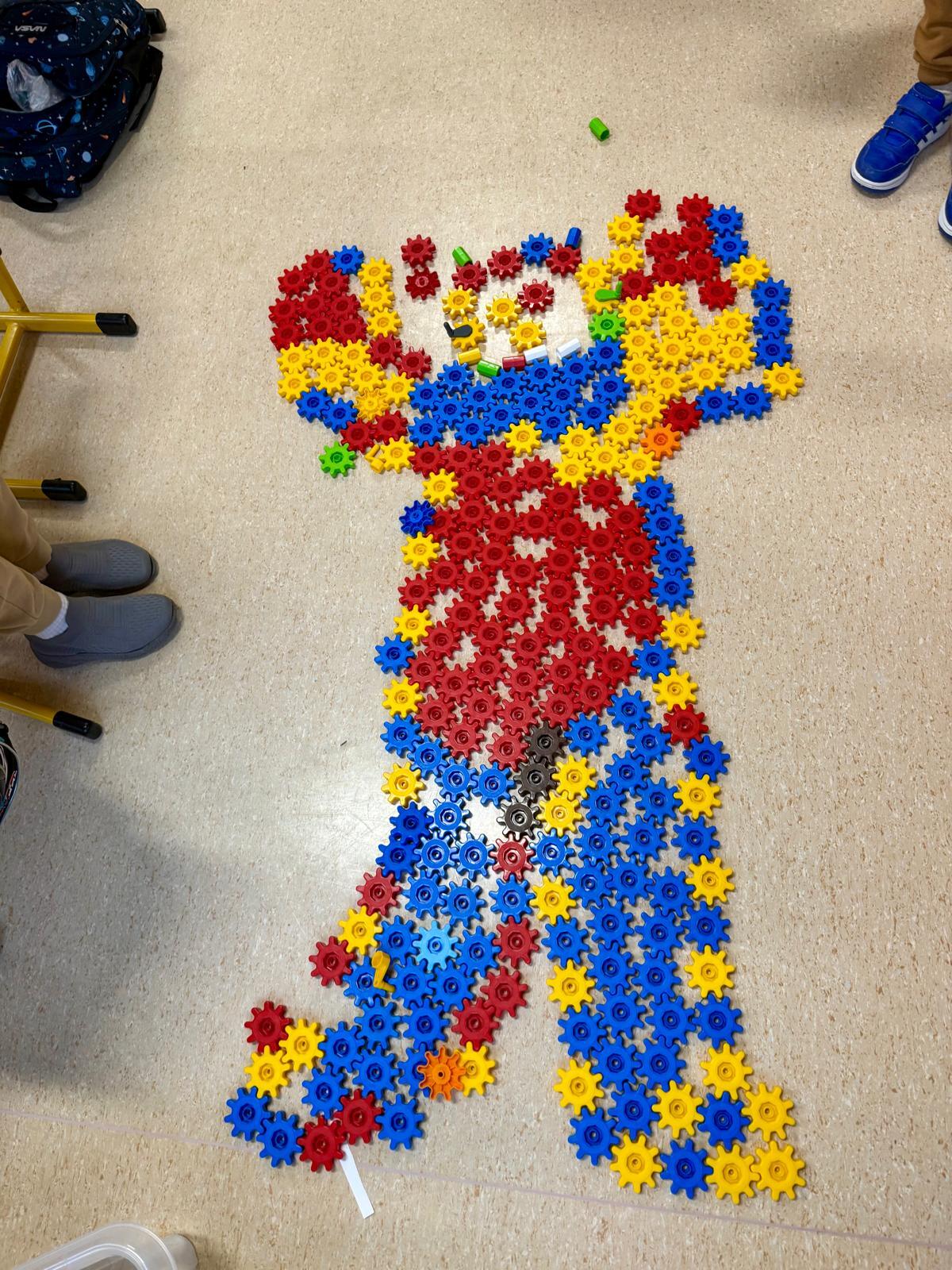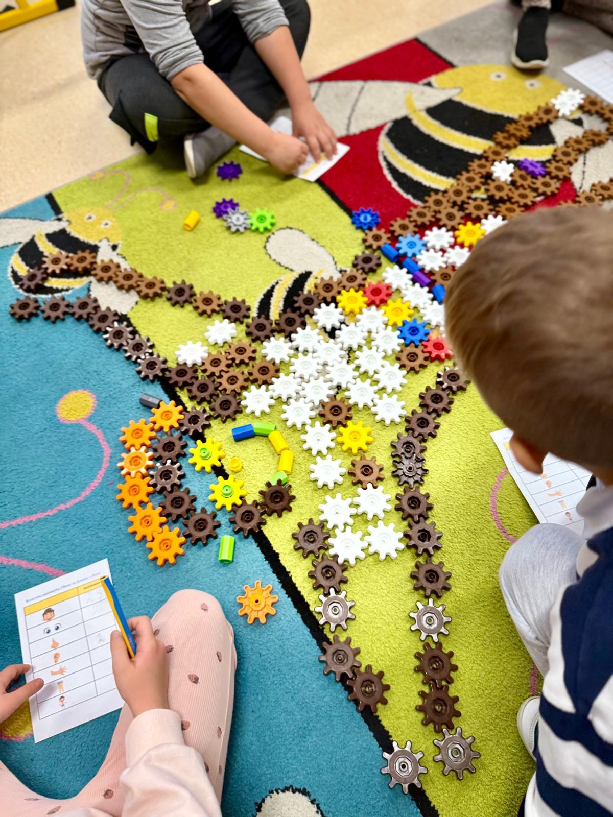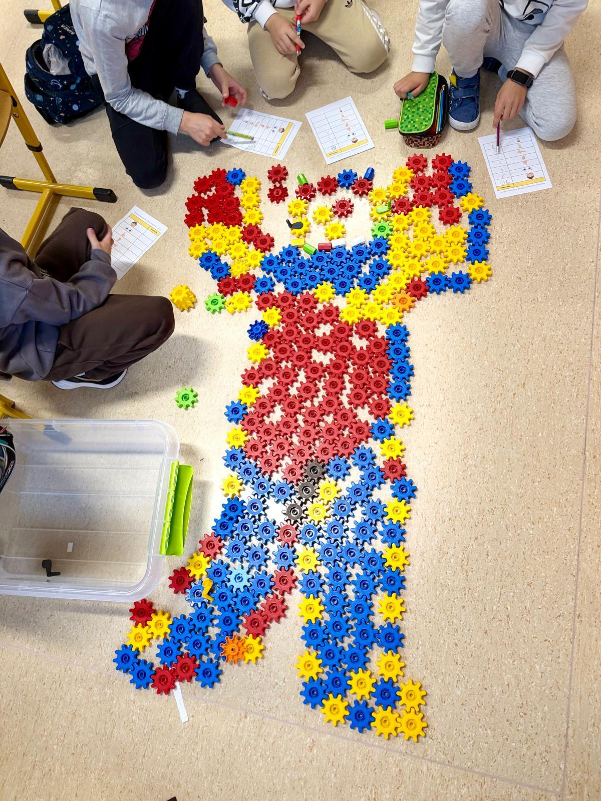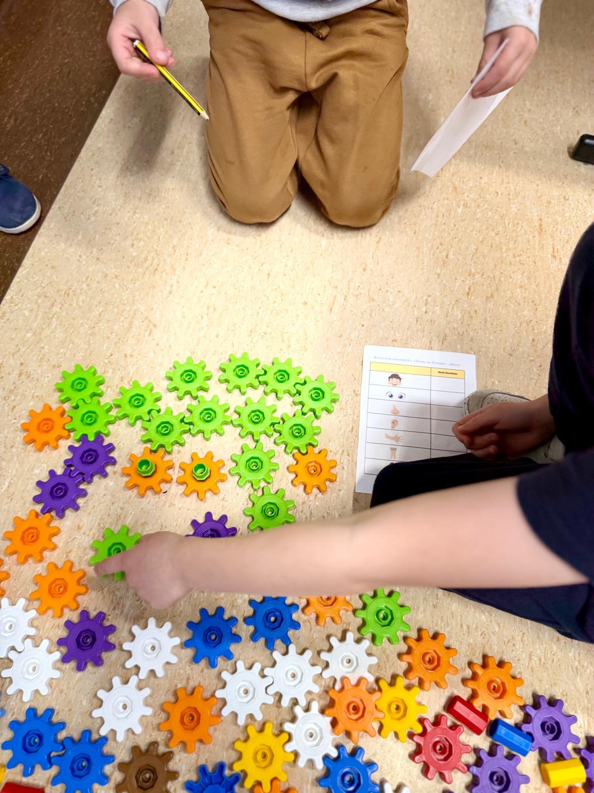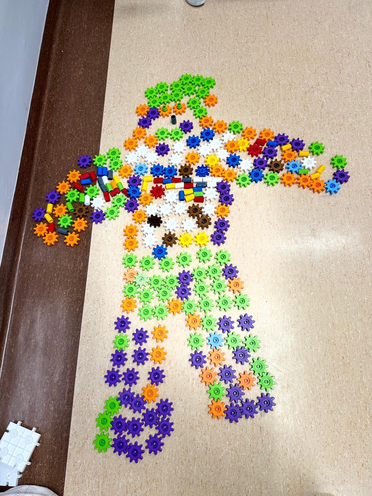 Na ostatnich zajęciach dzieci tworzyły obrysy swojego ciała z klocków Korbo. Zostali podzieleni na zespoły – w każdym wybrano jedną osobę, która położyła się na dywanie. Pozostali z zapałem układali z kółeczek obrys jej sylwetki. Ile tam było śmiechu, ile współpracy, ile pomysłów!