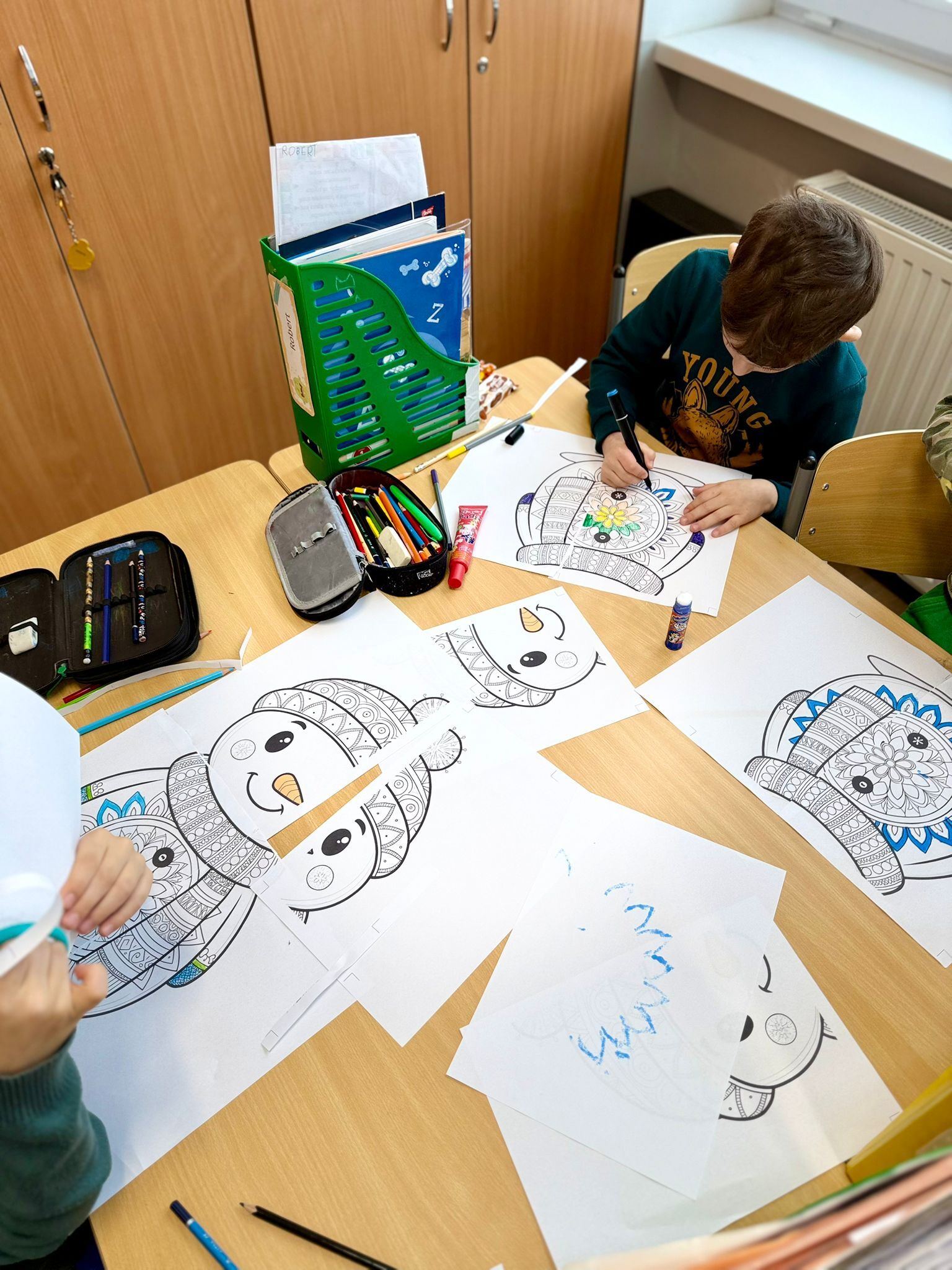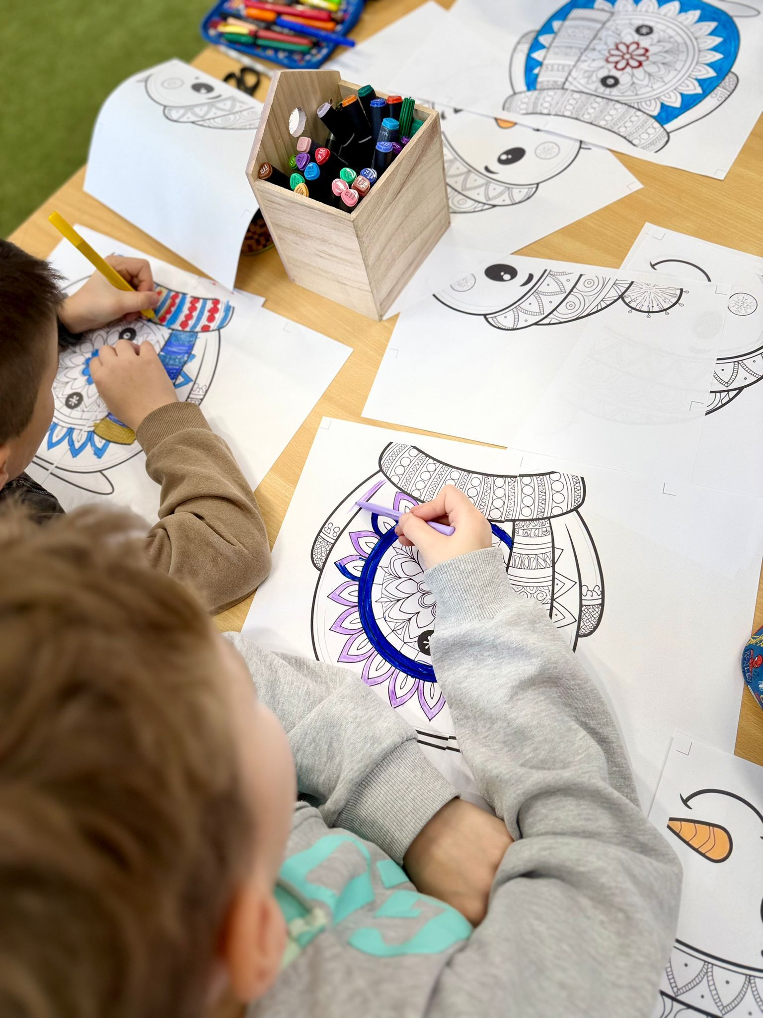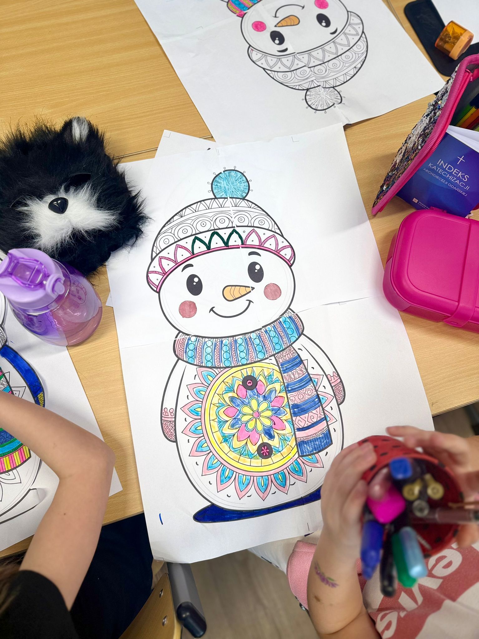 Kolorowanie elementów mandali wewnątrz sylwetki bałwanka stało się momentem wyciszenia. Rytmiczne wzory, powtarzalność linii i możliwość samodzielnego wyboru kolorów sprzyjały koncentracji i dłuższemu utrzymaniu uwagi. Dla wielu dzieci był to pierwszy etap pracy, w którym naprawdę zwolniły.