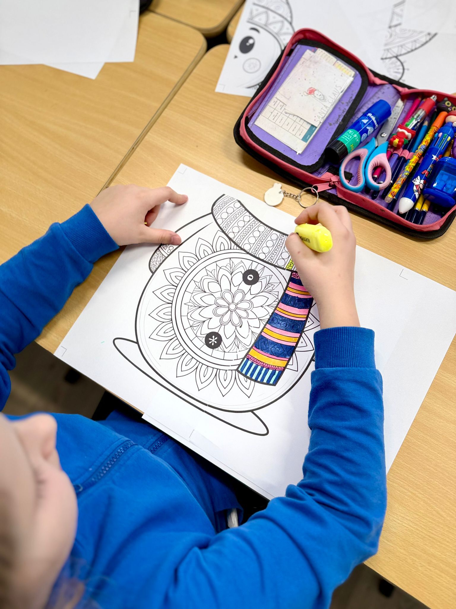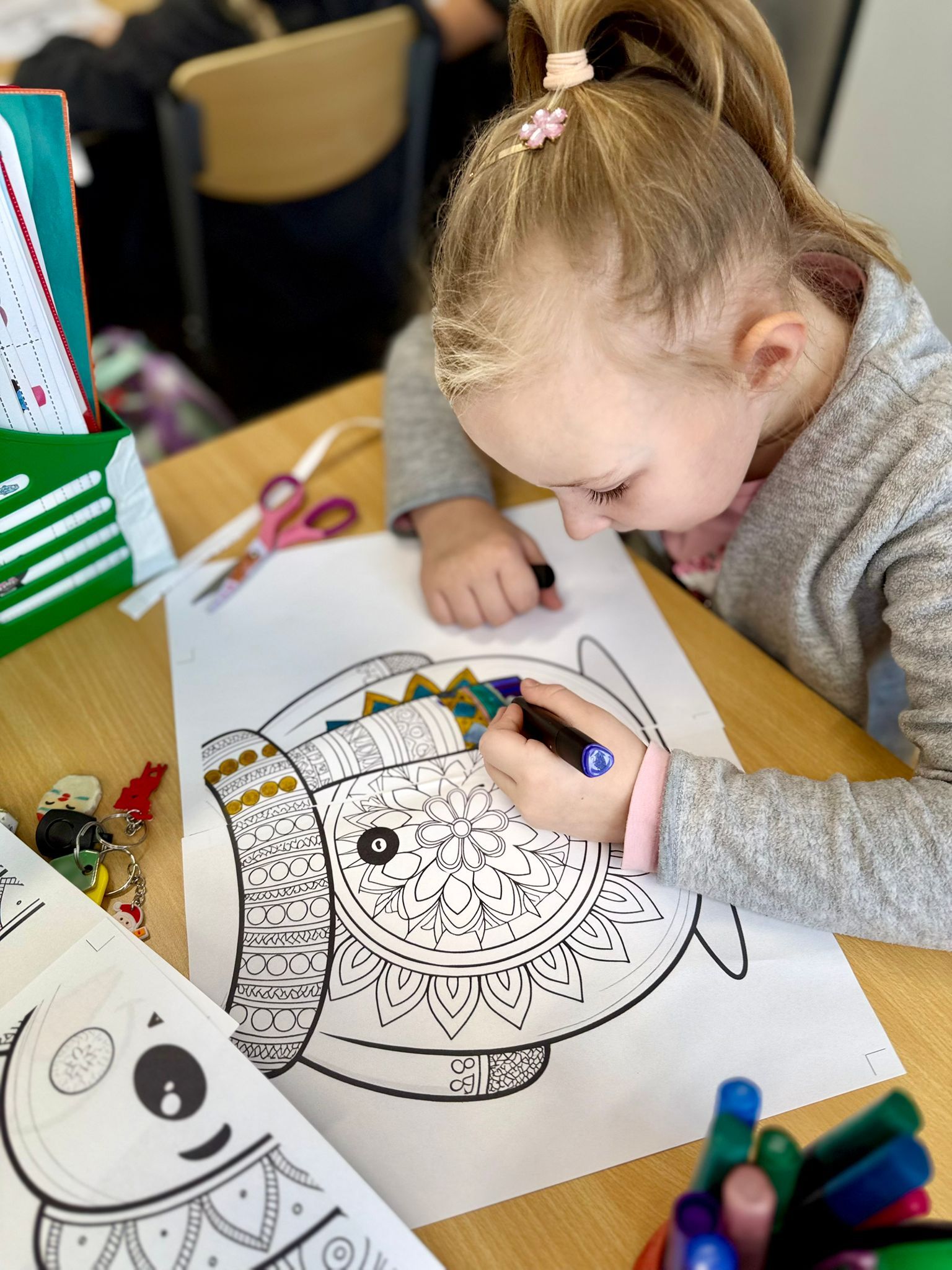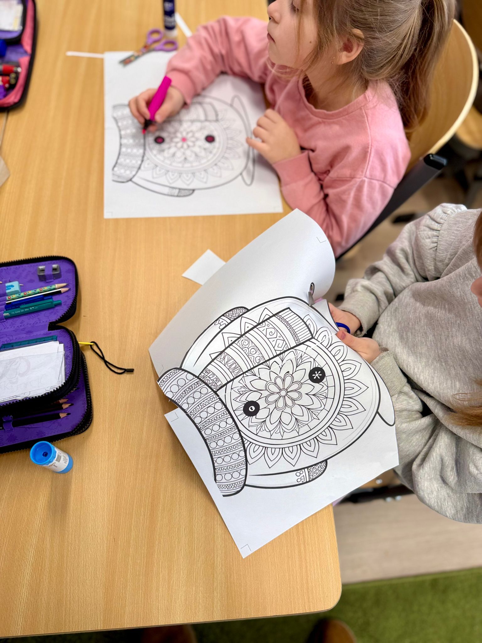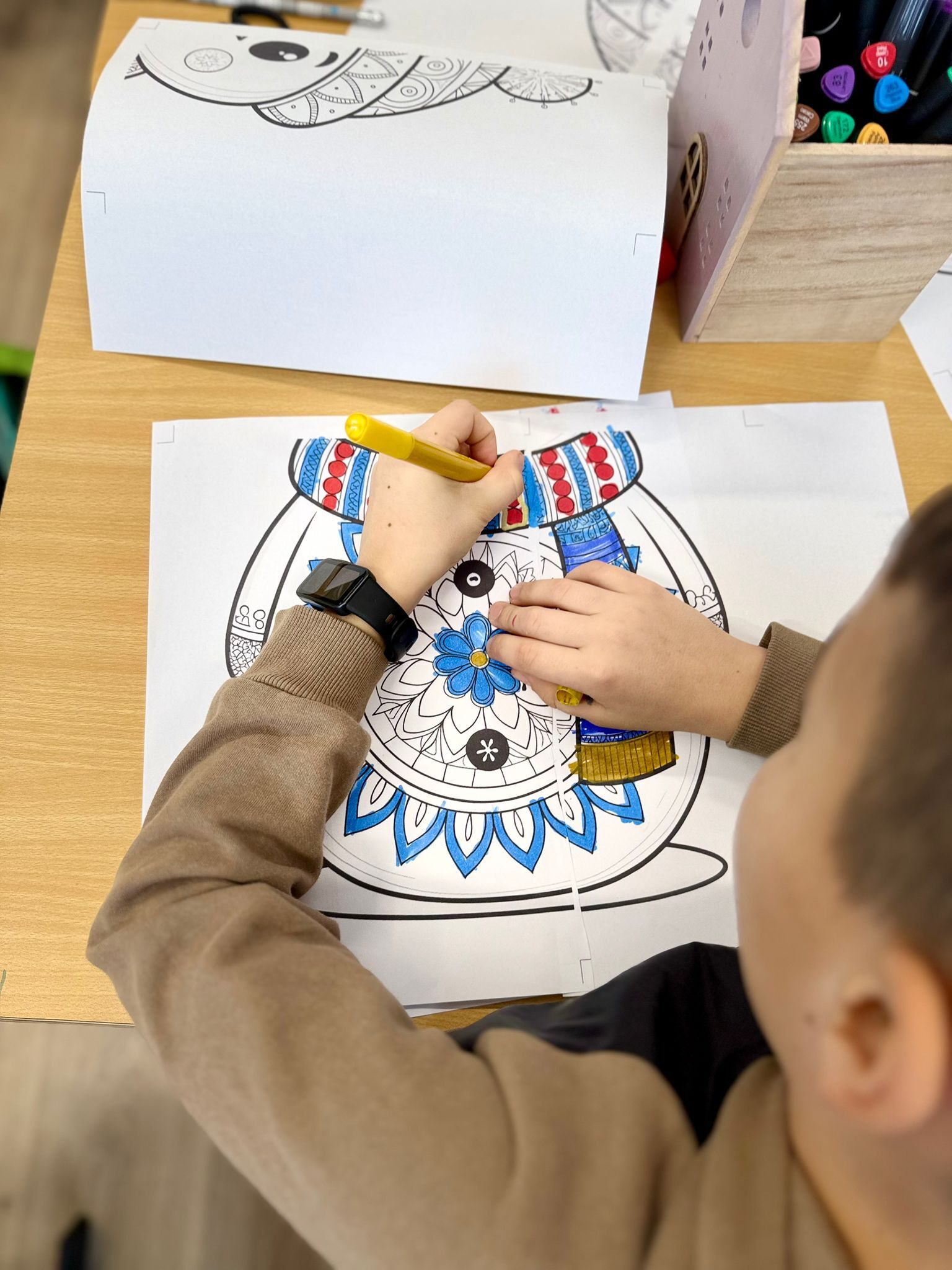 Kolorowanie elementów mandali wewnątrz sylwetki bałwanka stało się momentem wyciszenia. Rytmiczne wzory, powtarzalność linii i możliwość samodzielnego wyboru kolorów sprzyjały koncentracji i dłuższemu utrzymaniu uwagi. Dla wielu dzieci był to pierwszy etap pracy, w którym naprawdę zwolniły.