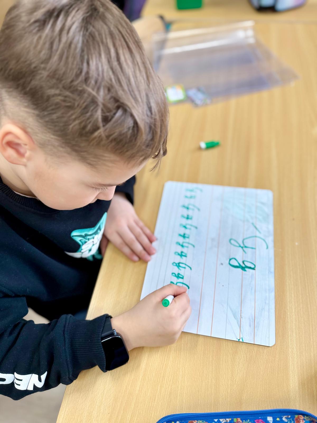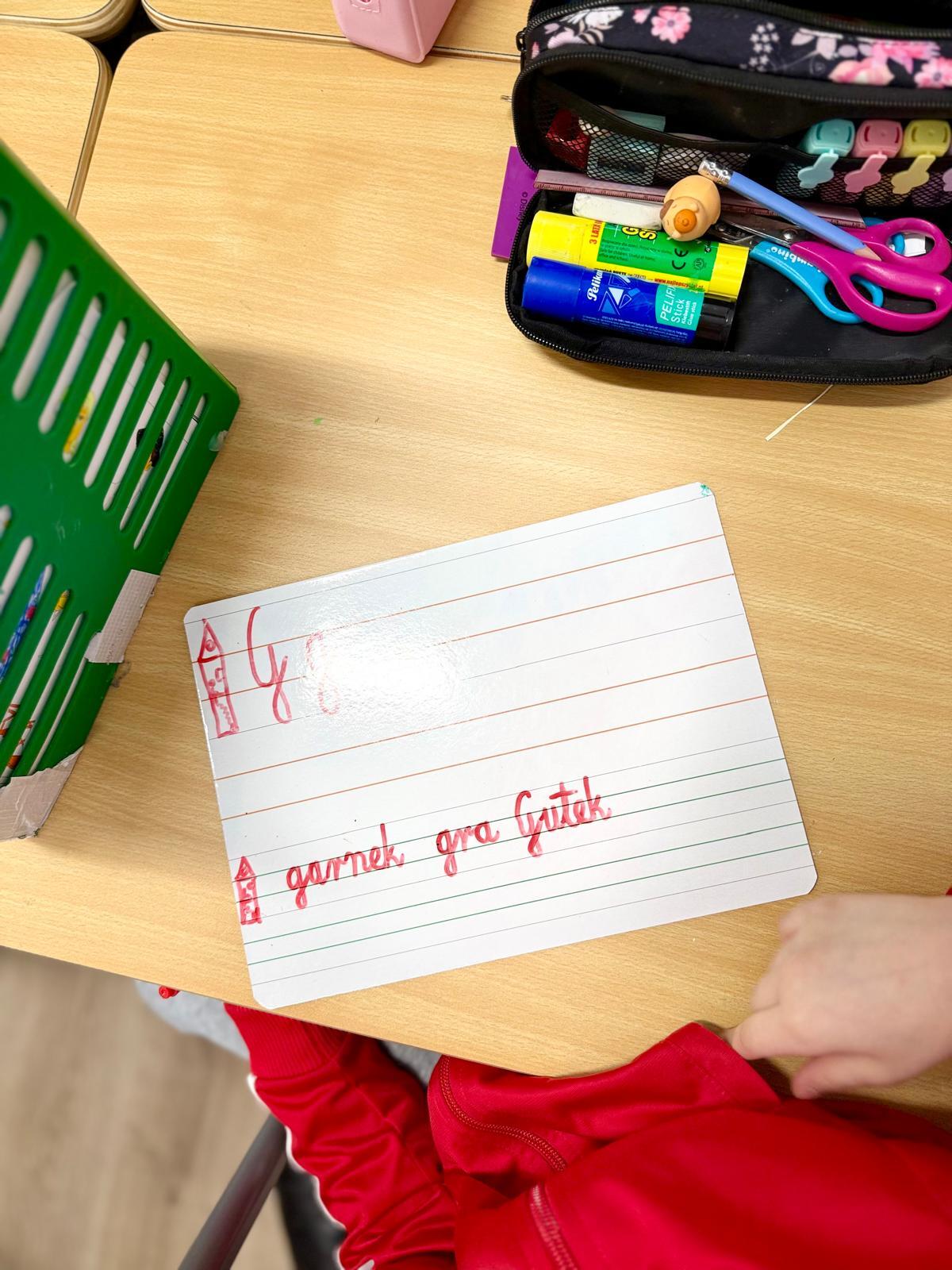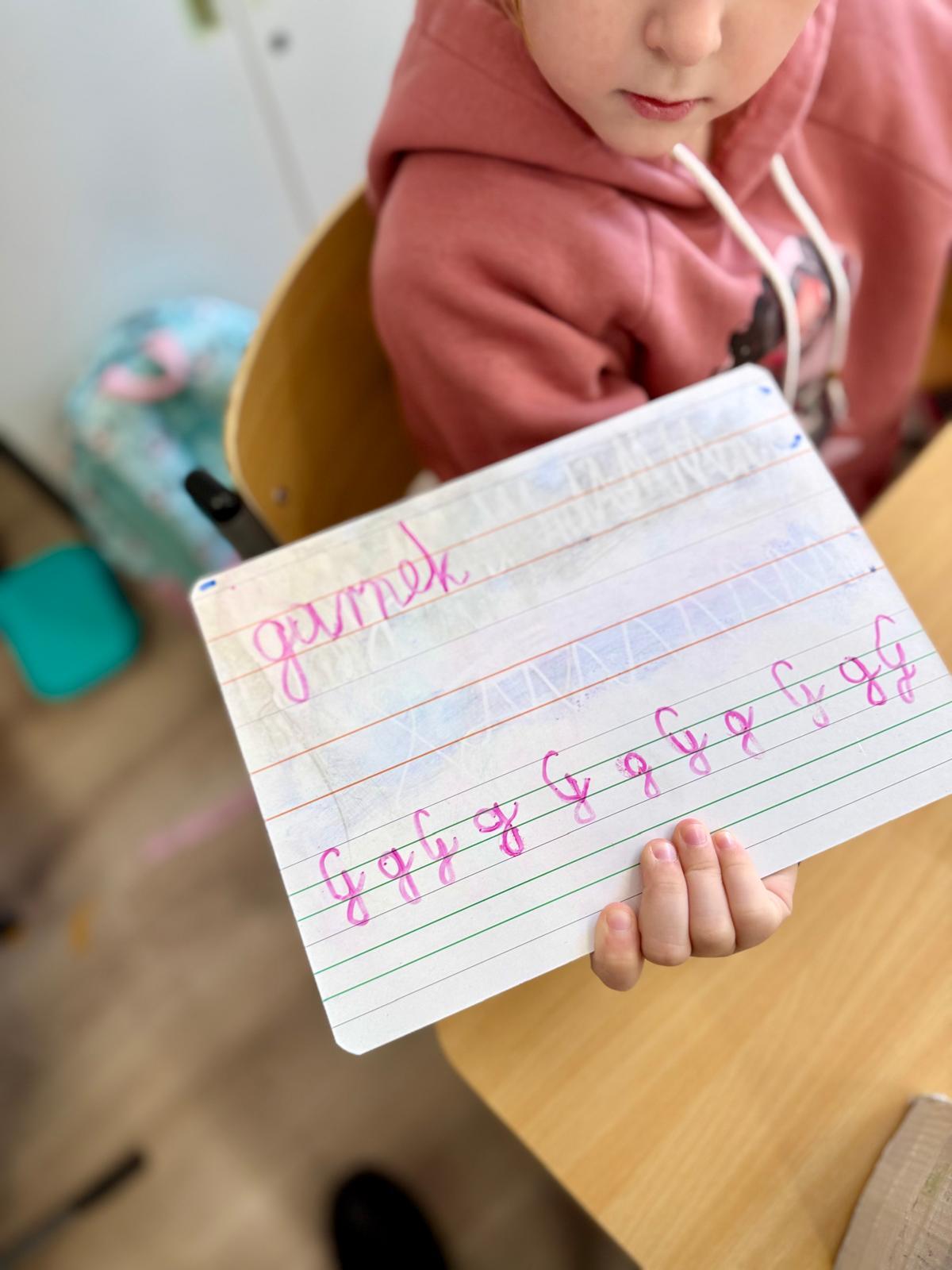 Zależy mi na tym, aby dzieci najpierw zrozumiały ruch, a dopiero potem utrwalały go w zeszycie. Tablica daje im przestrzeń do próbowania, poprawiania i szukania właściwego kierunku. Błąd można zetrzeć jednym ruchem, więc nie wywołuje napięcia ani zniechęcenia.