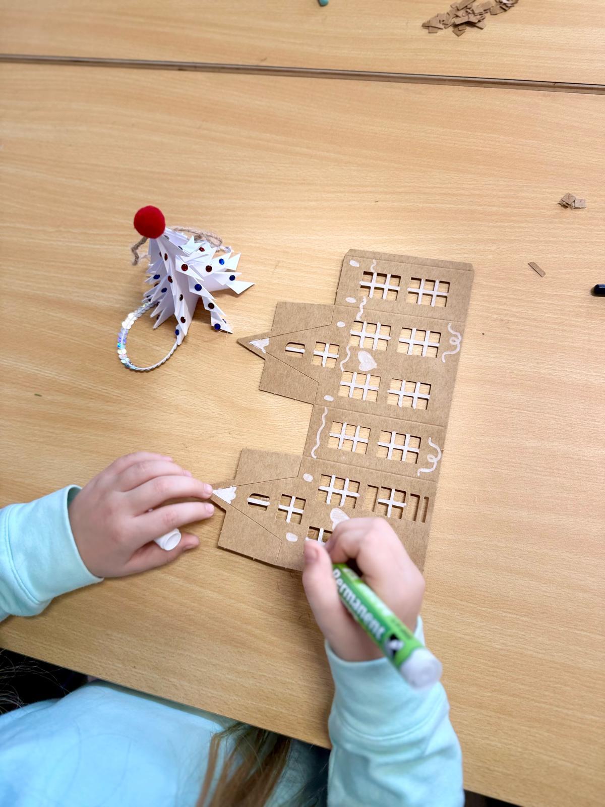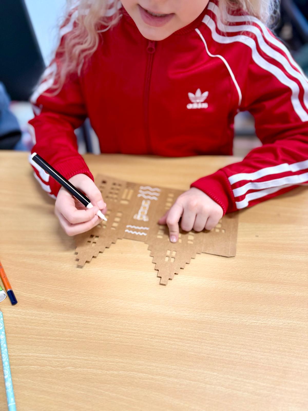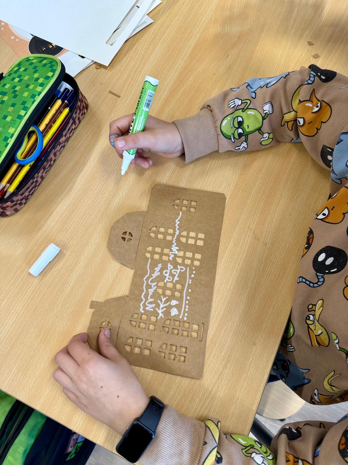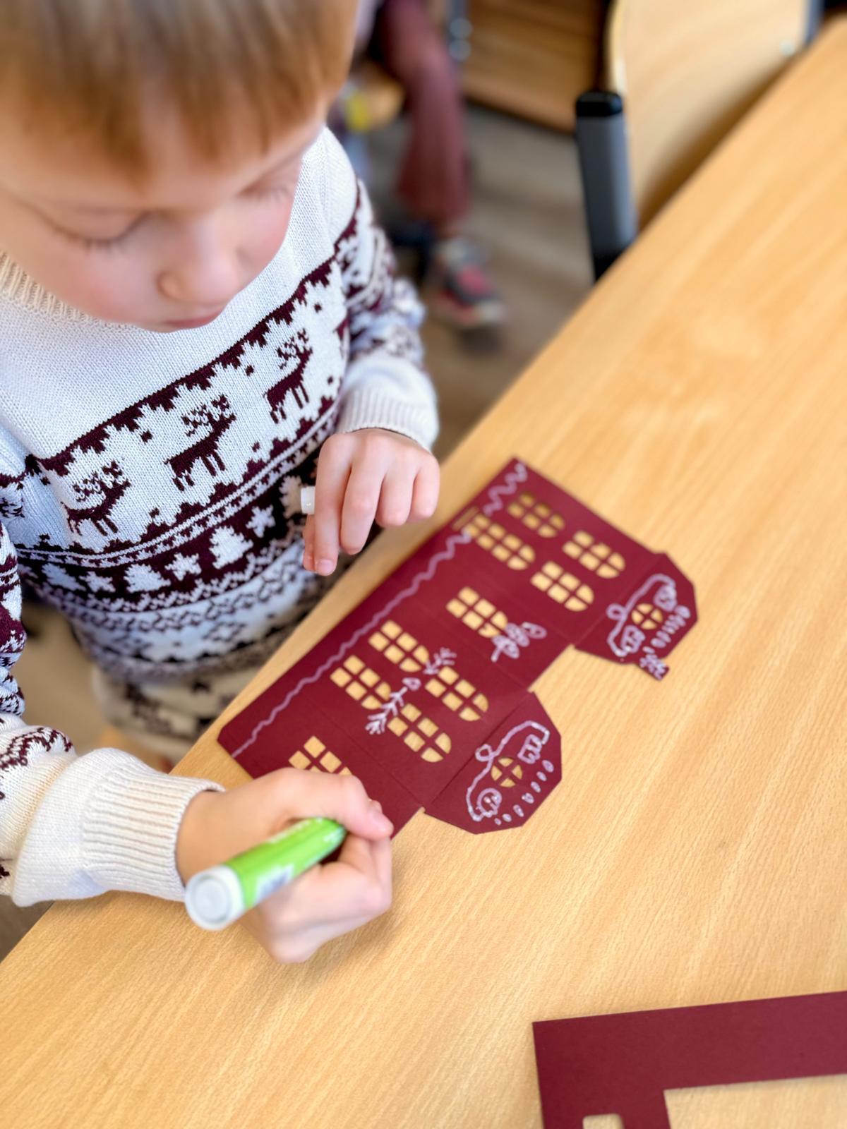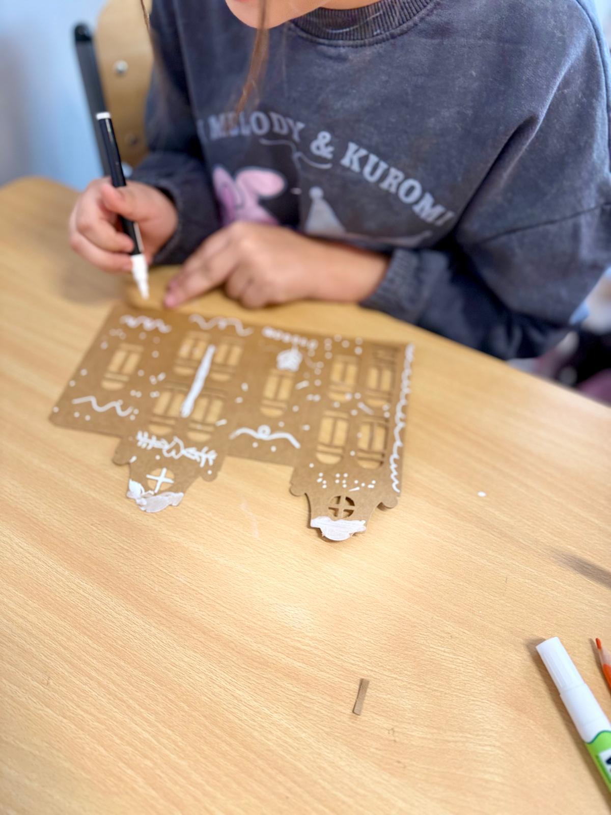 Zestawy kamieniczek są niepozorne, ale kiedy dzieci zaczynają nad nimi pracować, dzieje się coś pięknego. Najpierw cierpliwie wypychają wszystkie okna, drzwi i drobne elementy. To moment, w którym każdy z nich odkrywa, że precyzja naprawdę ma znaczenie. Potem przychodzi czas na dekorowanie – białe pisaki w ruch i nagle zwykłe kartonowe domki zamieniają się w zimowe miasteczko pełne śnieżnych wzorów, gwiazdek, zawijasów i dziecięcej wyobraźni.