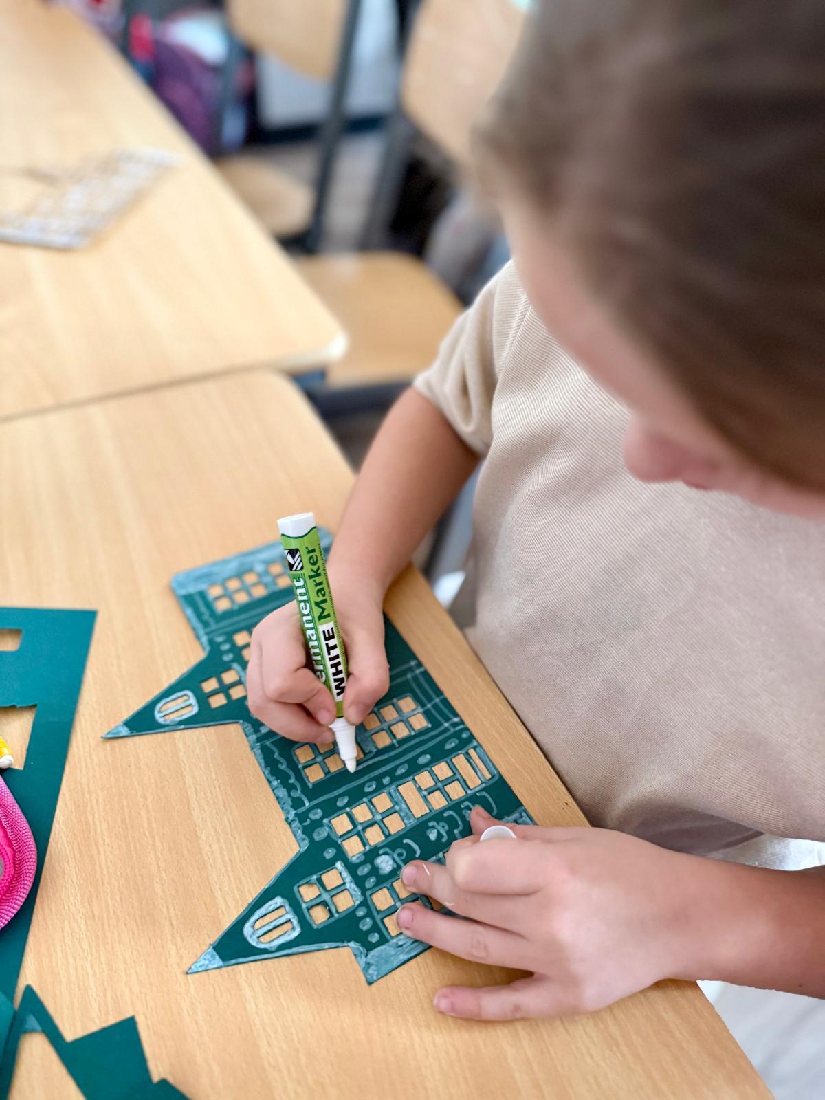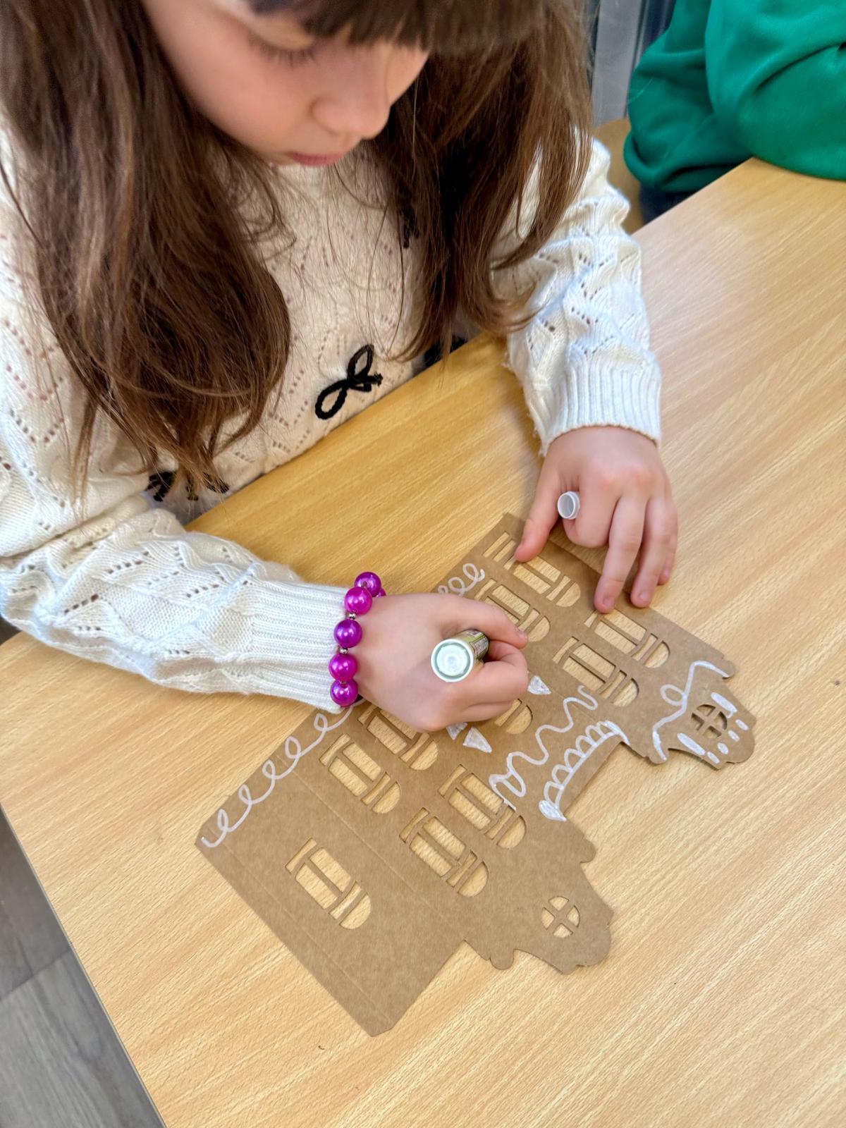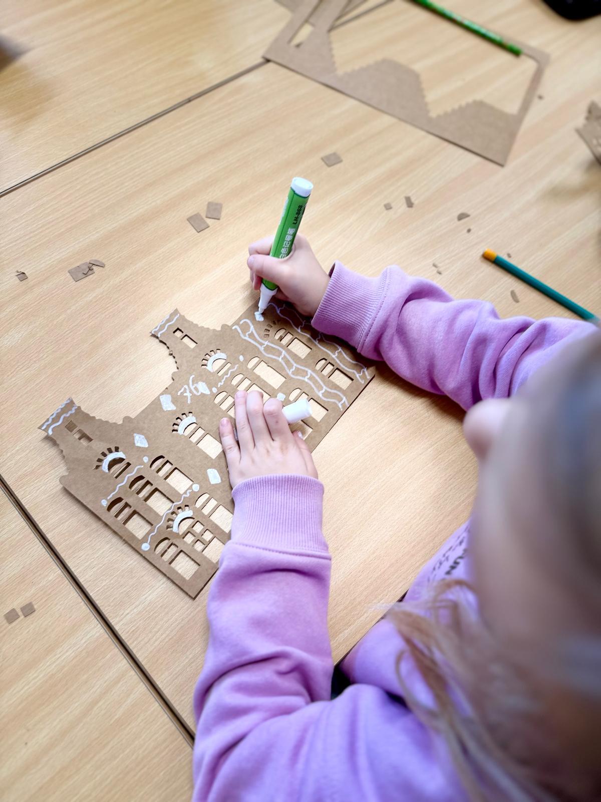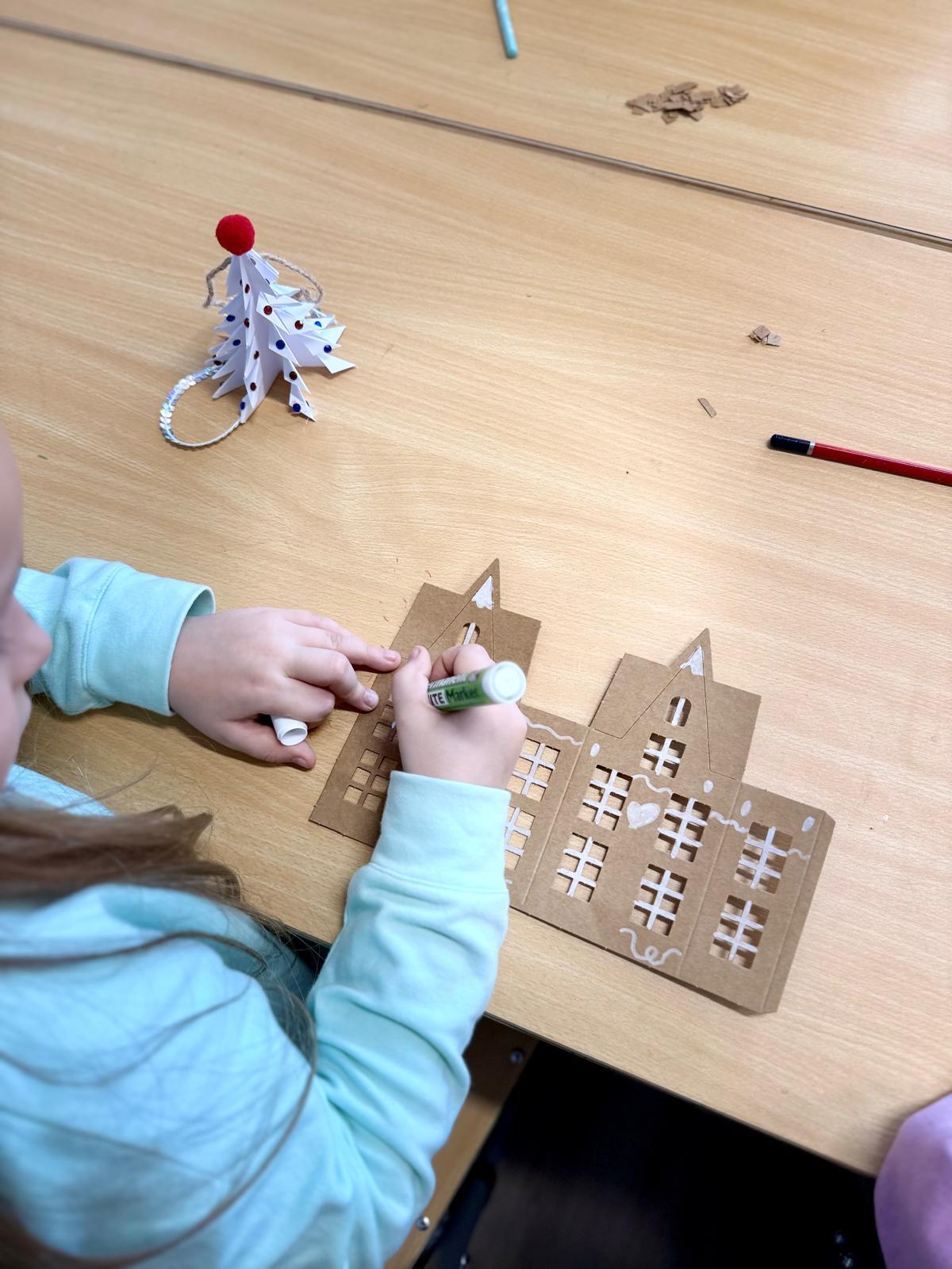 Zestawy kamieniczek są niepozorne, ale kiedy dzieci zaczynają nad nimi pracować, dzieje się coś pięknego. Najpierw cierpliwie wypychają wszystkie okna, drzwi i drobne elementy. To moment, w którym każdy z nich odkrywa, że precyzja naprawdę ma znaczenie. Potem przychodzi czas na dekorowanie – białe pisaki w ruch i nagle zwykłe kartonowe domki zamieniają się w zimowe miasteczko pełne śnieżnych wzorów, gwiazdek, zawijasów i dziecięcej wyobraźni.